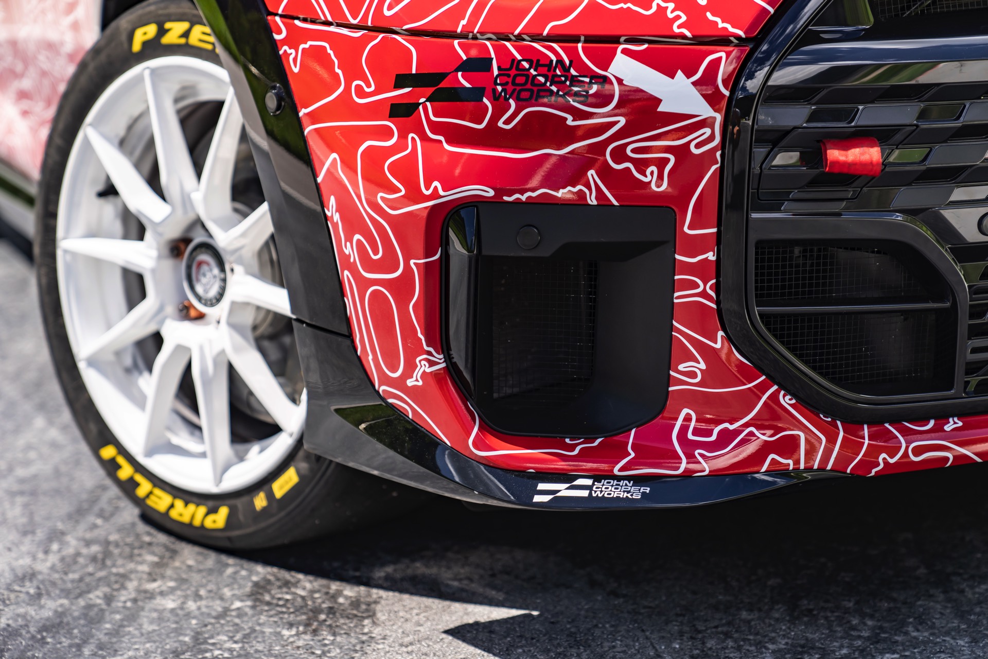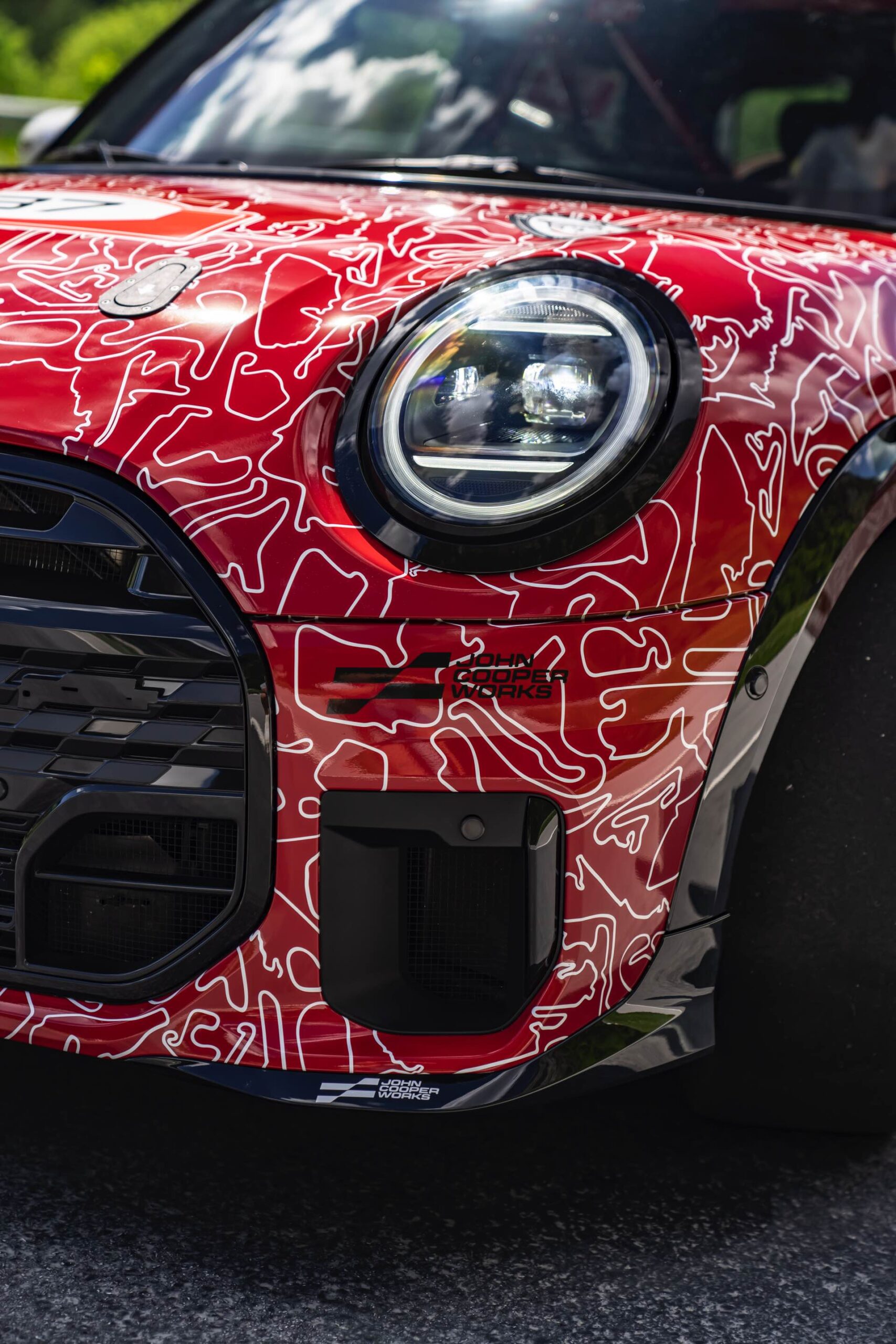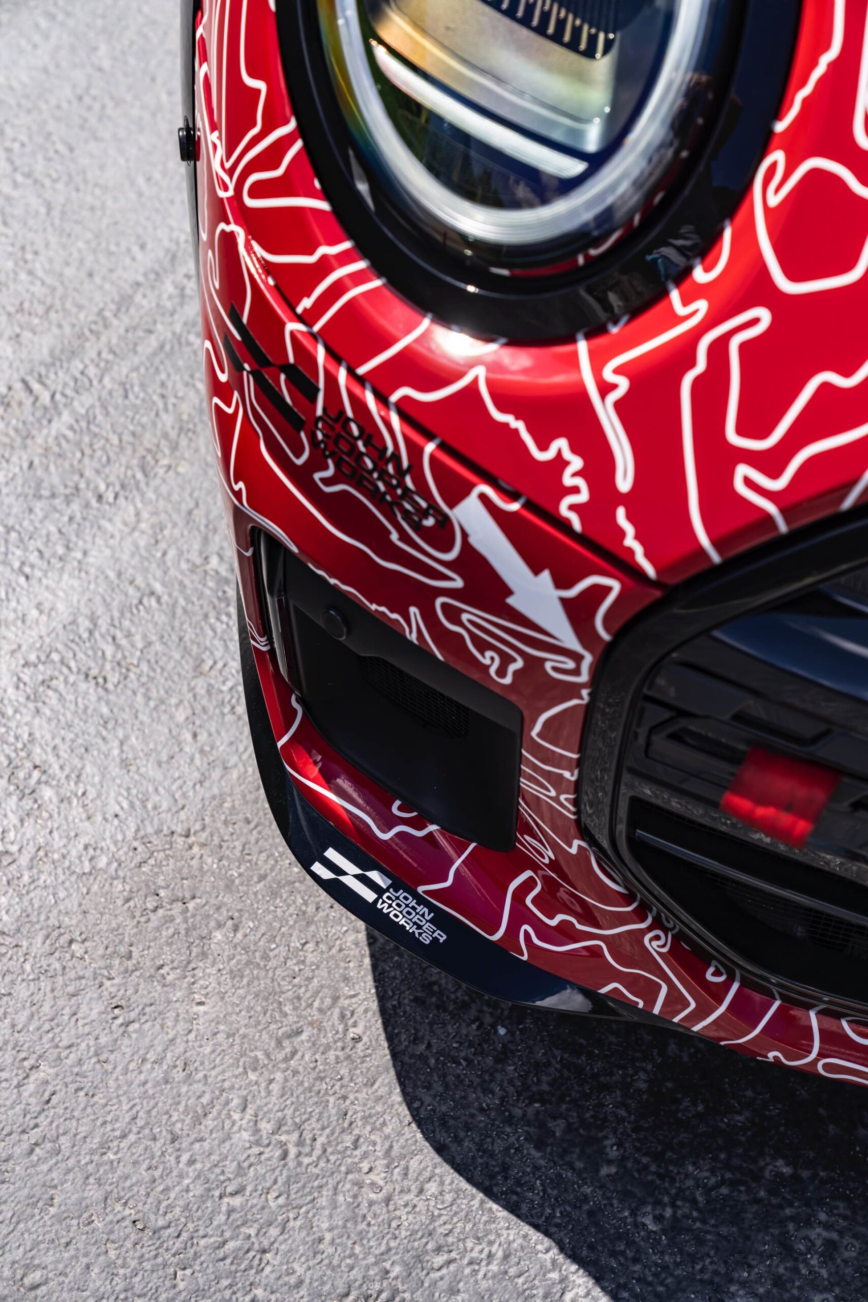 Während die Farbgebung einerseits an die Farbschemata klassischer Mini-Rennwagen der 1960er erinnern soll, soll sie andererseits natürlich auch von den darunter verborgenen Formen ablenken. Dennoch ist für aufmerksame Beobachter gut erkennbar, wohin die Reise gehen wird: Die Front wird wie bei den schwächeren Varianten des neuen MINI Cooper (F66) von einem riesigen Kühlergrill dominiert, der im Fall des John Cooper Works aufgrund überwiegend-dunkler Farbgebung und Verzicht auf Elemente in Wagenfarbe noch wesentlich markanter in Erscheinung tritt. "