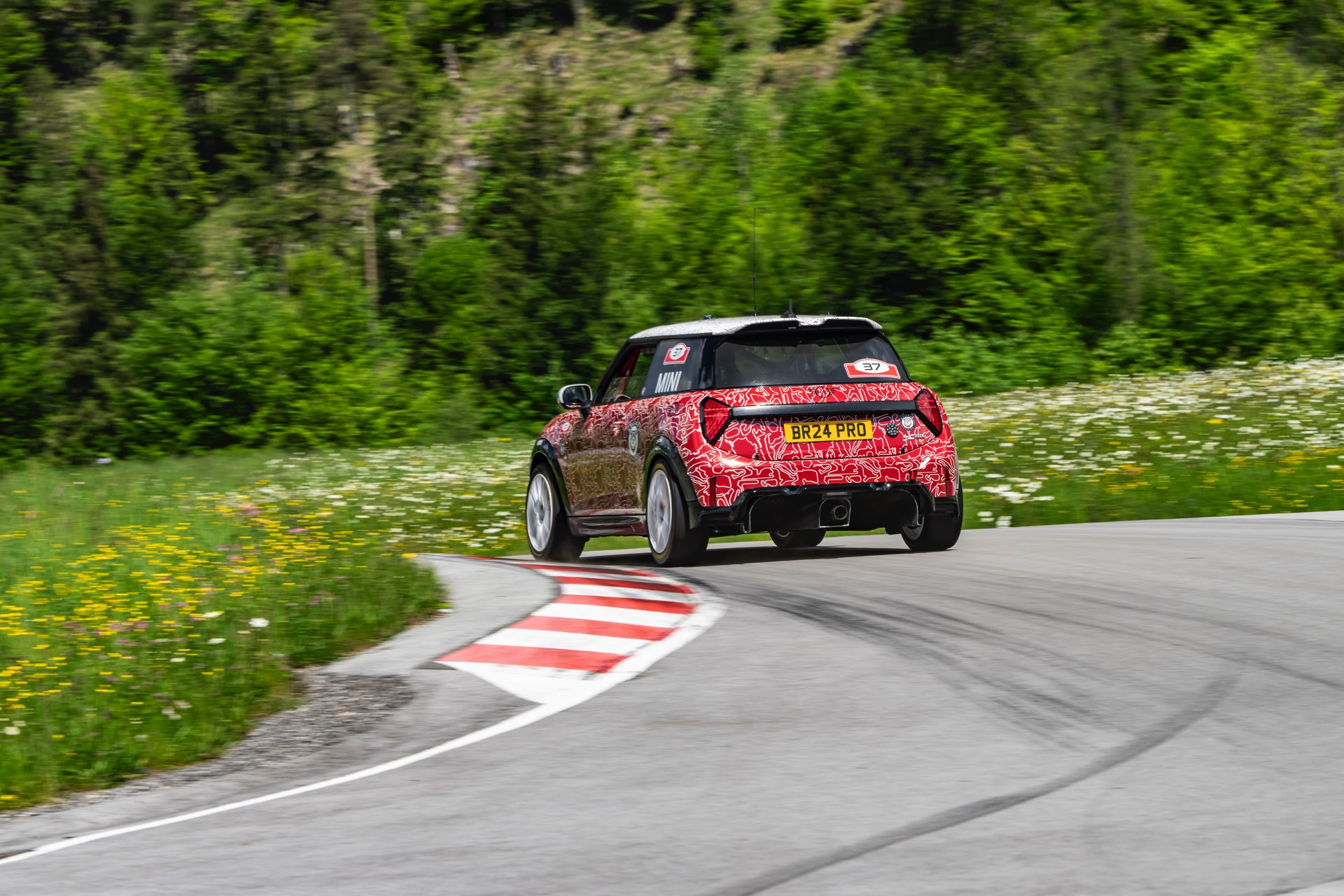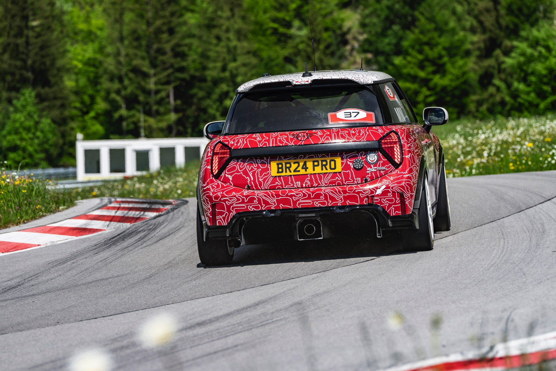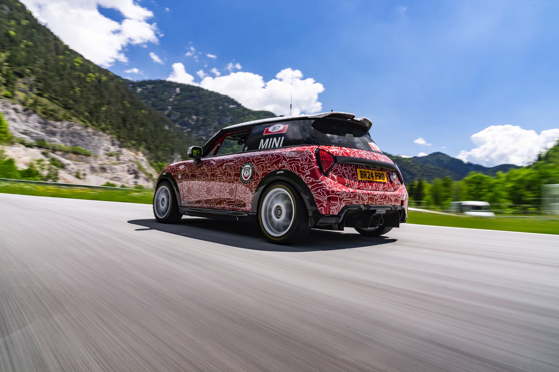 Mindestens so spannend wie die Front ist der Blick aufs Heck, denn auch hier darf der neue MINI John Cooper Works 2024 offenbar aufs Ganze gehen: Ein extrem wuchtig ausgeführter Diffusor fast ein einziges dickes Endrohr ein, das in der Serie sicher noch eine gewisse Verkleidung erhalten wird. Auch der Dachkanten-Heckspoiler ist noch markanter als beim regulären MINI Cooper gestaltet und betont den sportlichen Anspruch des Kleinwagens.
