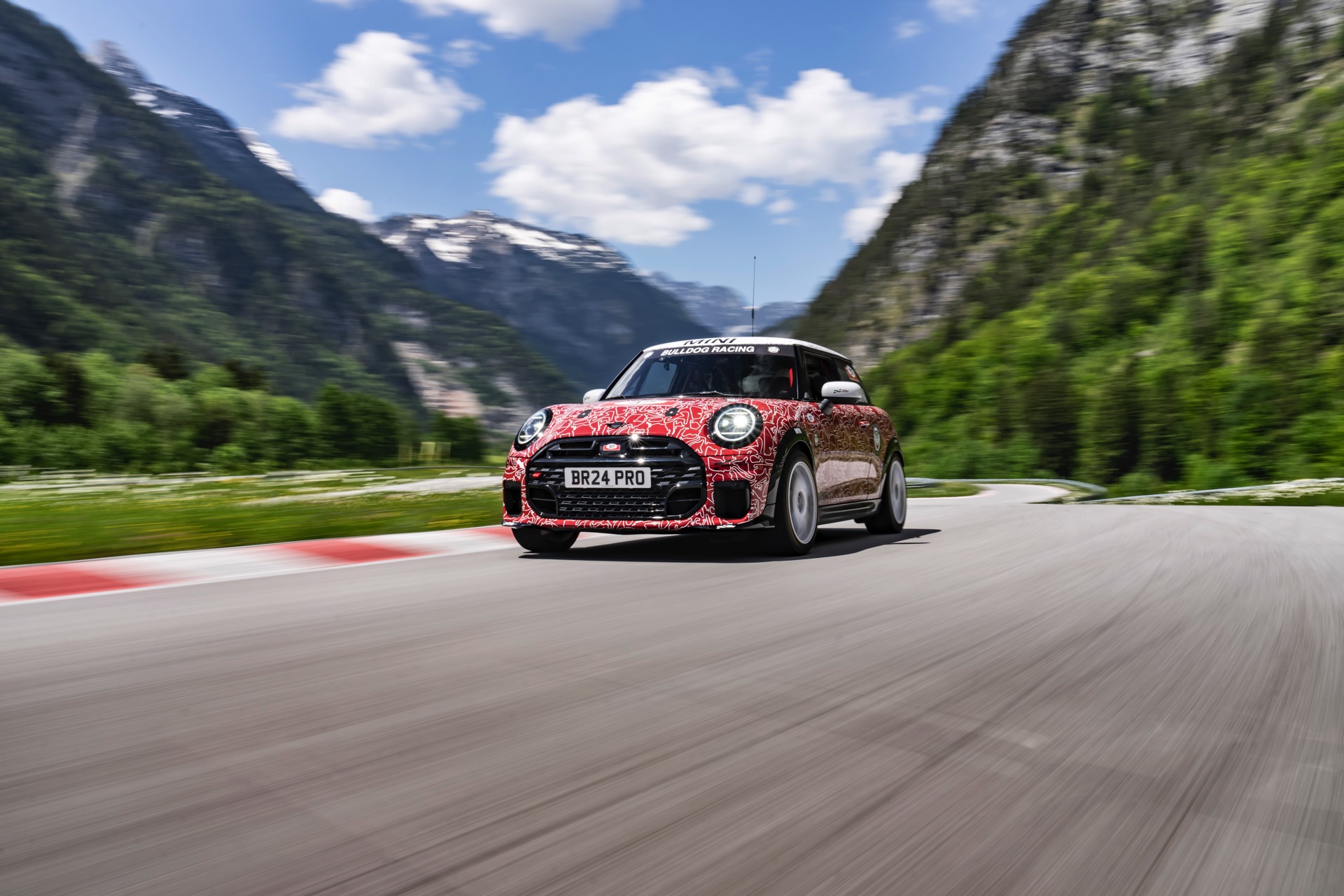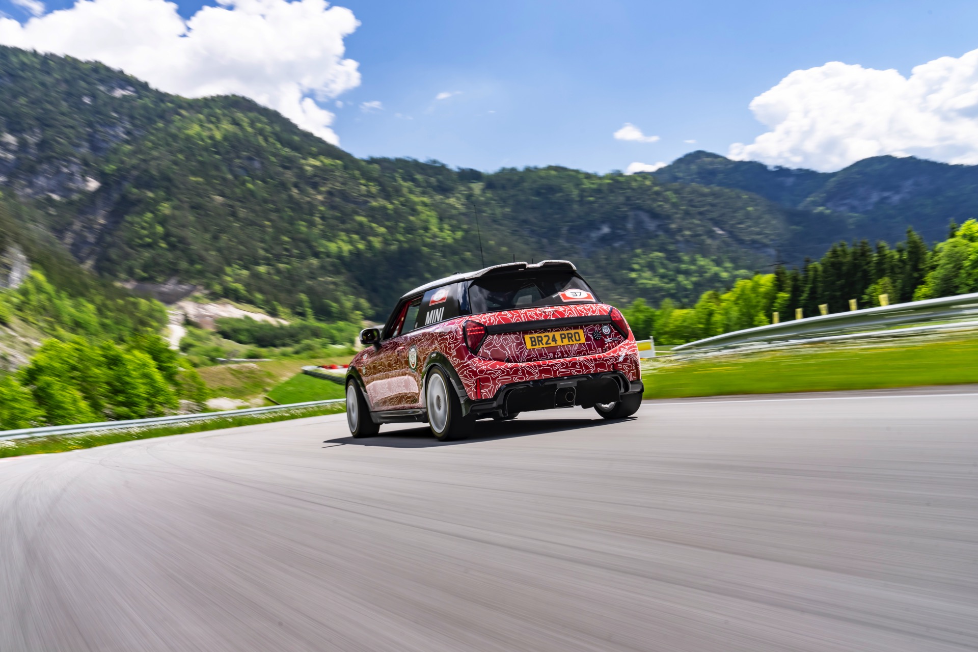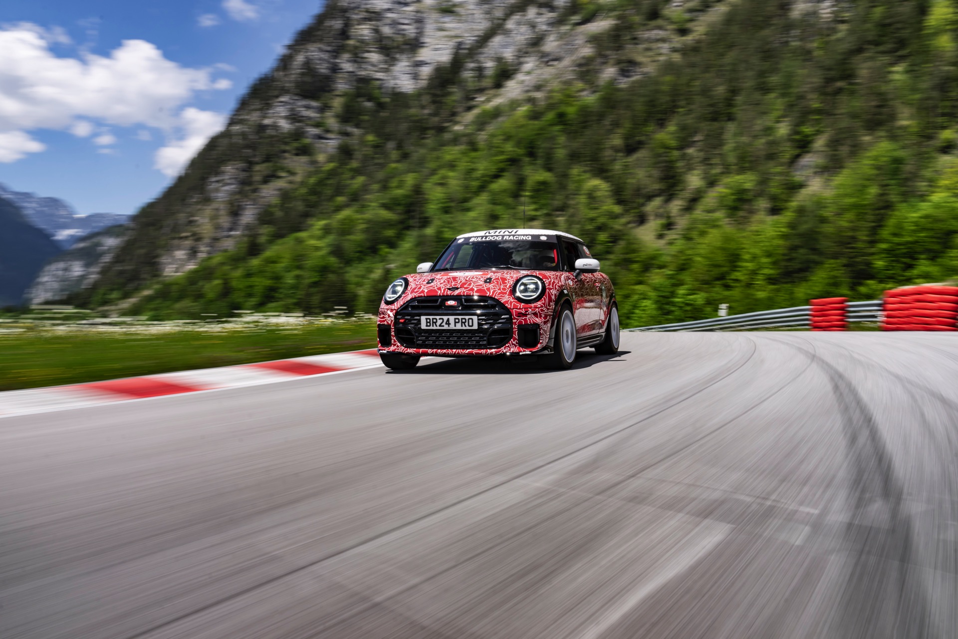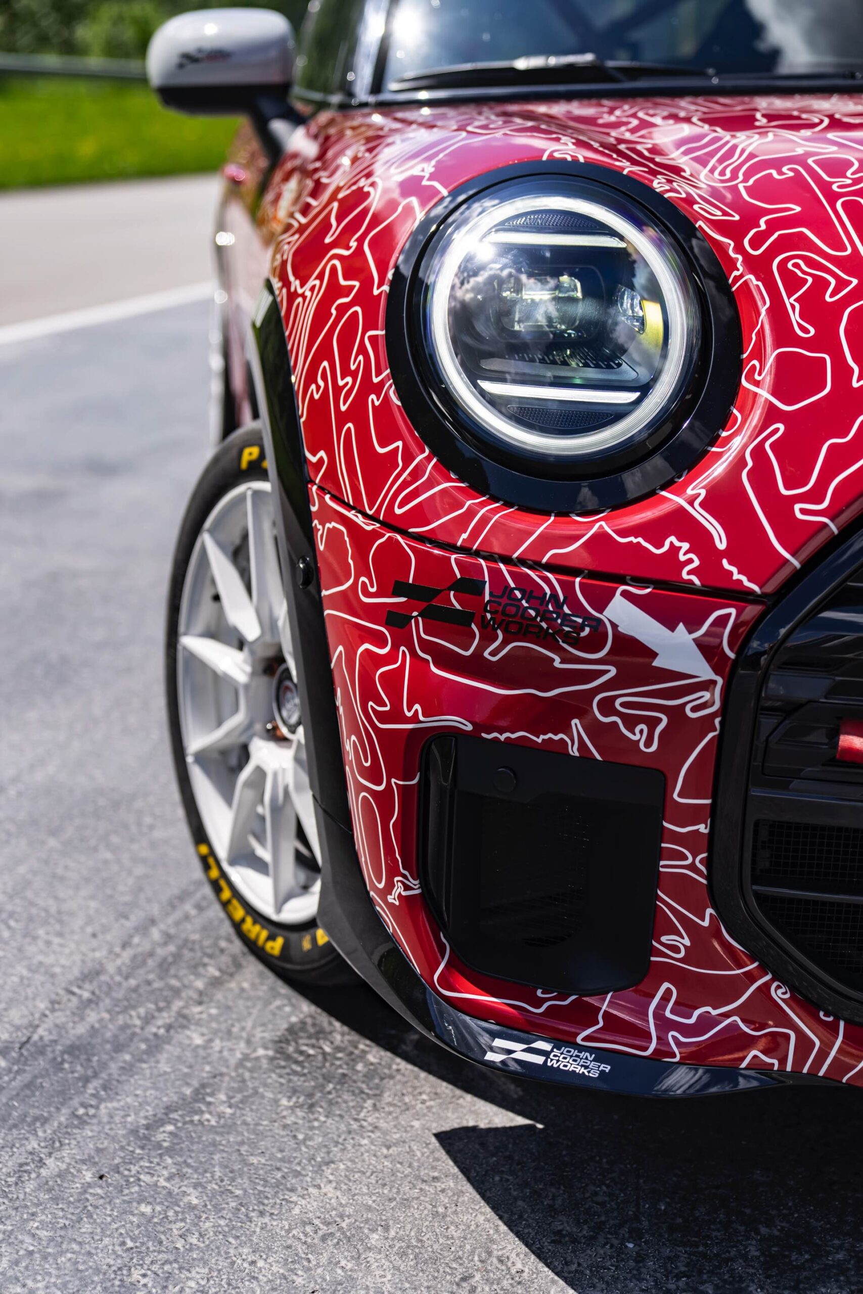 Eine ganz besondere Form der Vorab-Premiere wird sich der neue MINI John Cooper Works (F66) gönnen: Der Power-Kleinwagen wird in leicht getarnter Form am 24 Stunden-Rennen auf der Nürburgring Nordschleife teilnehmen und sich dabei noch vor dem Marktstart im Herbst 2024 einem der intensivsten Langstrecken-Rennen der Welt stellen. Passend zur ungewöhnlichen Terminschiene wird der MINI JCW 2024 in einer Art Erlkönig-Beklebung unterwegs sein, wobei die Konturen berühmter Rennstrecken weiße Akzente zum roten Untergrund setzen.