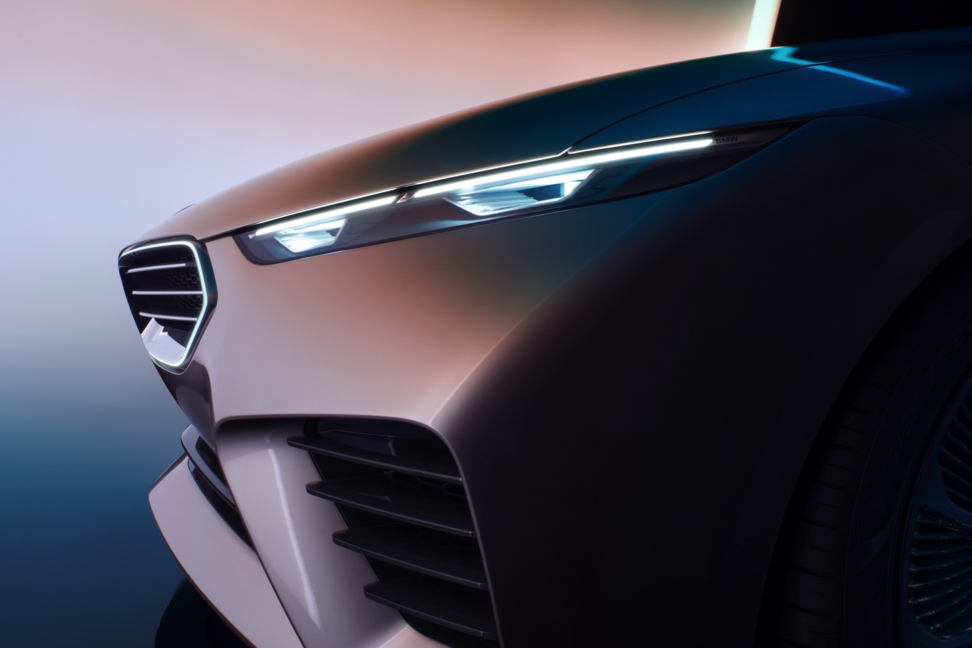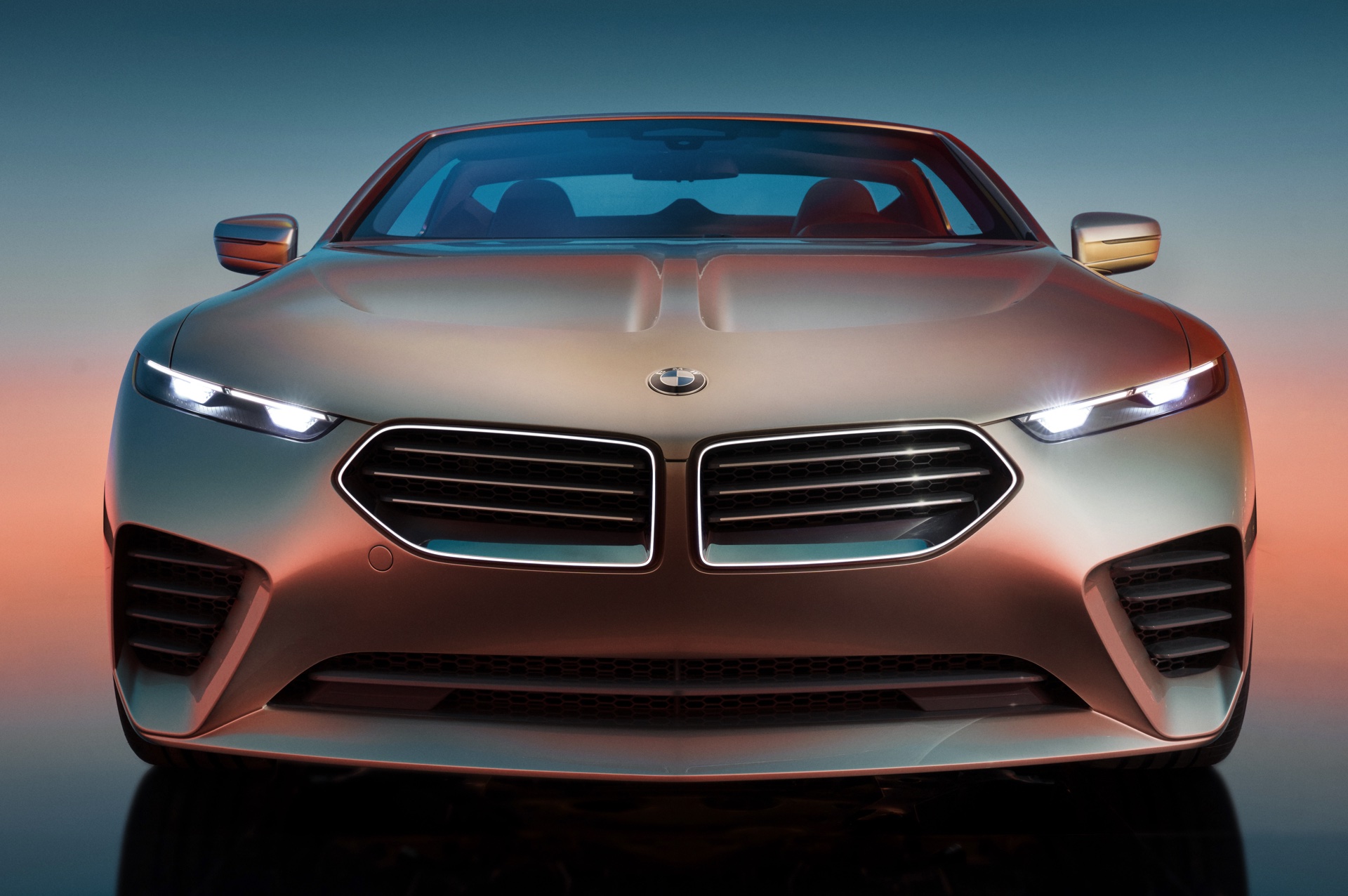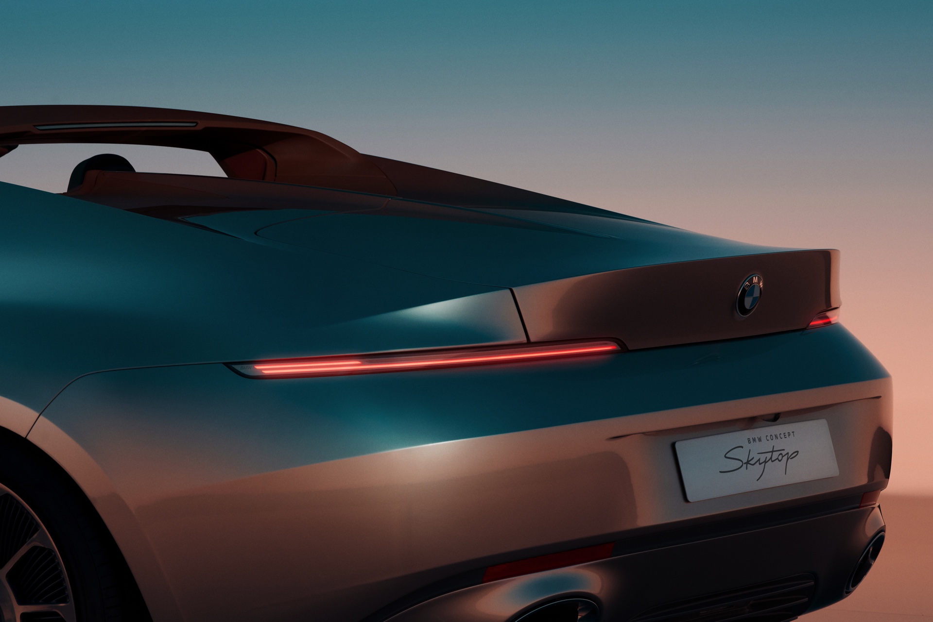 Die neu interpretierte Niere, natürlich mit dezent beleuchteter Iconic Glow-Einfassung, ist genau wie die im unteren Teil der Frontschürze platzierten Lufteinlässe von horizontalen Streben geprägt, wie wir sie seit kurzem an allen neuen BMW M-Modellen sehen. Erst in der Seitenansicht und beim Blick von oben fällt auf, dass die Front als Sharknose mit starker Pfeilung ausgeführt ist und damit eine unter anderem vom klassischen 6er Coupé (E24) bekannte Idee aufgreift. Extrem flach gezeichnete Scheinwerfer erinnern auf den ersten Blick an die Split Headlights anderer aktueller Modelle, allerdings ist im Fall des BMW Skytop wirklich die komplett Lichttechnik auf wenigen Zentimetern Höhe untergebracht und somit kein unteres Scheinwerfer-Element erforderlich. "