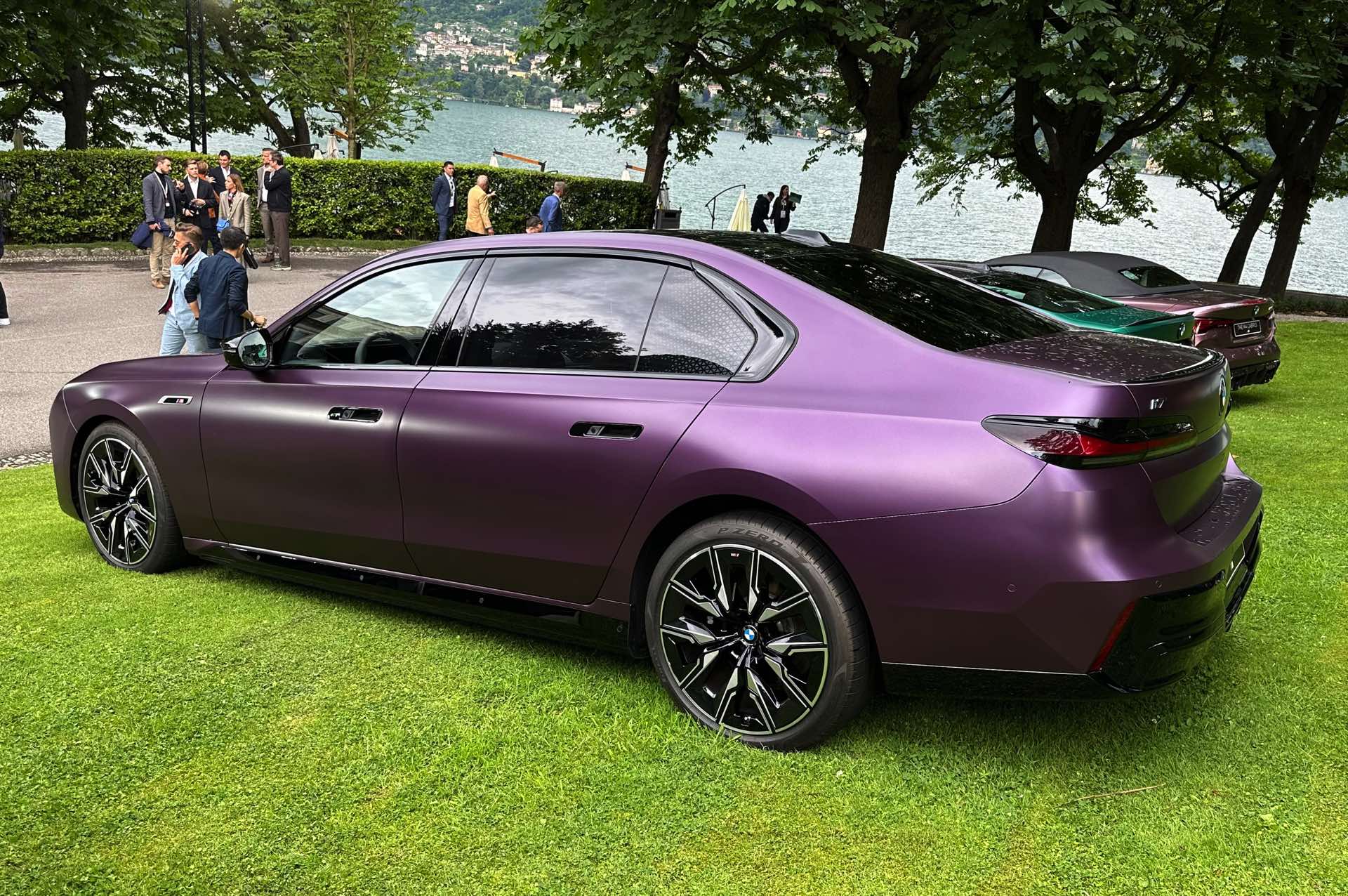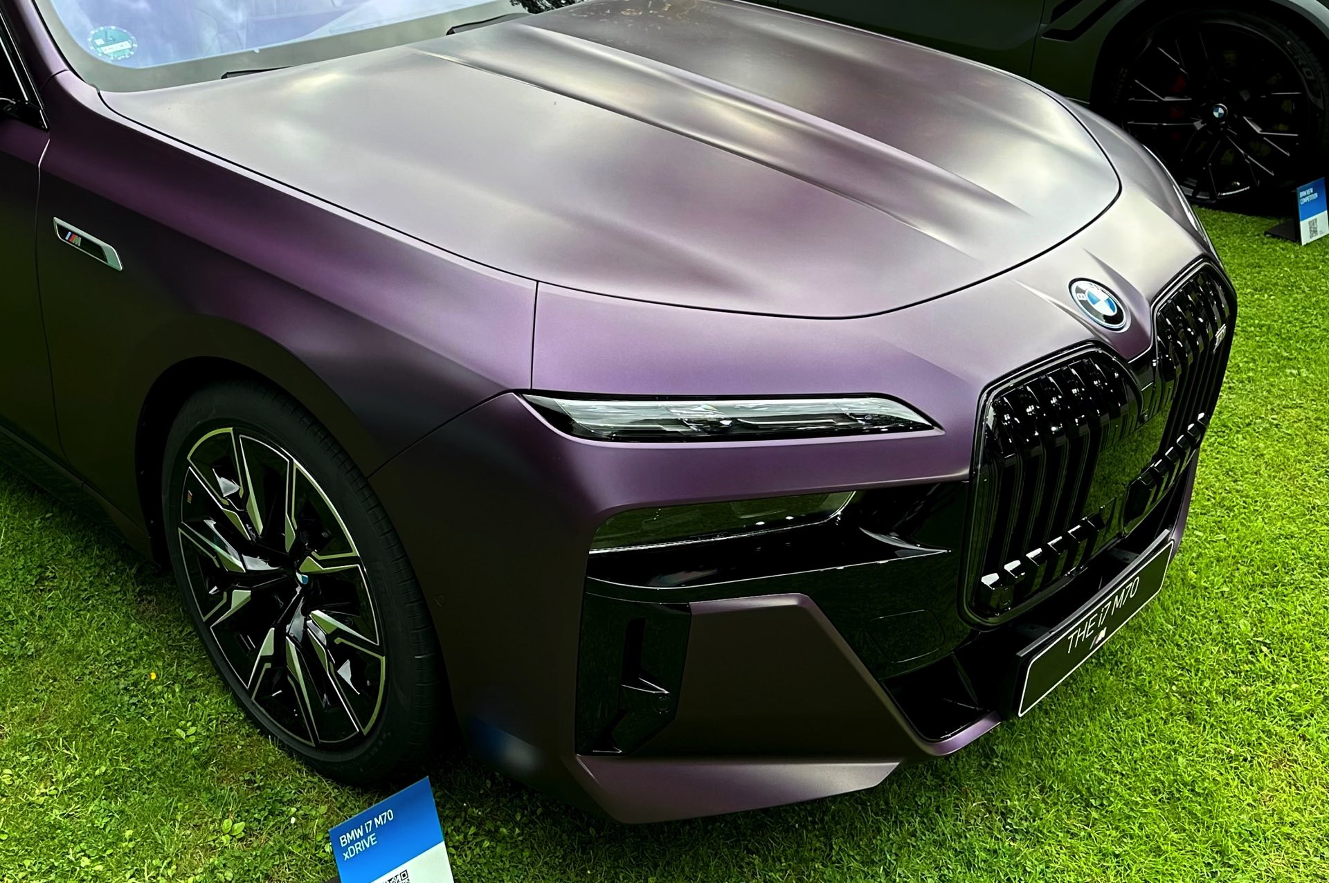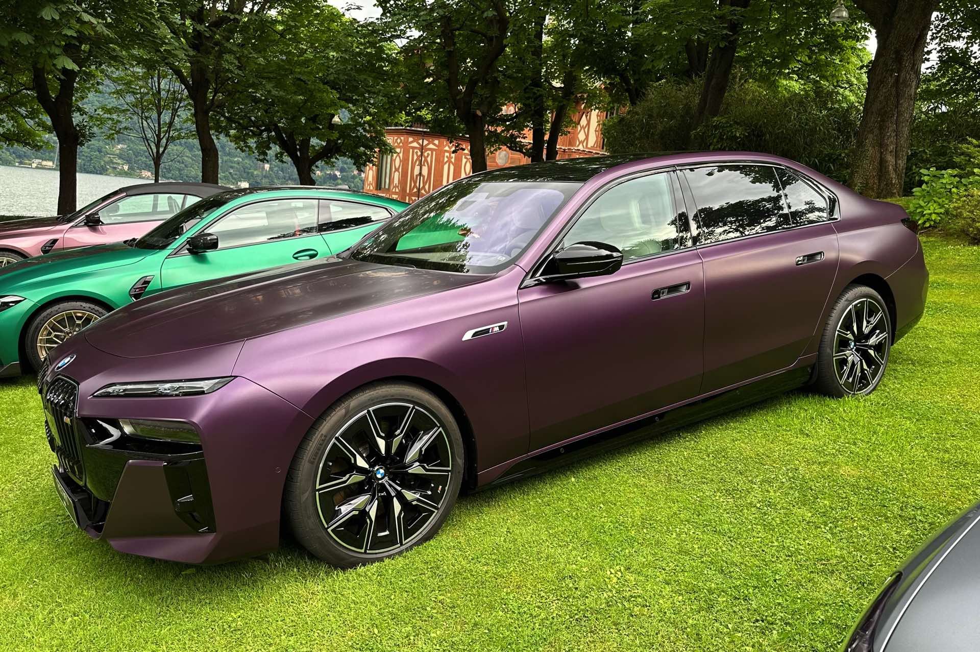Individualität wird beim Concorso d’Eleganza Villa d’Este schon immer besonders gefeiert, gewöhnliche Automobile gibt es schließlich mehr als genug. So überrascht es auch nicht, dass die M GmbH einige Beispiele ihrer matten Lackierungen am Comer See präsentiert, darunter ein BMW i7 M70 im spektakulären Farbton Frozen Purple Metallic (Farbcode P9A). Das intensive Violett mit mattem Finish gehört mit Sicherheit zu den speziellsten Lackierungen, mit denen sich ein BMW 7er (G70) lackieren lässt – und das ganz ohne die 12.000 Euro teure Two-Tone-Option, mit deren Hilfe sich der obere Teil der Luxuslimousine in einer Kontrastfarbe absetzen ließe.