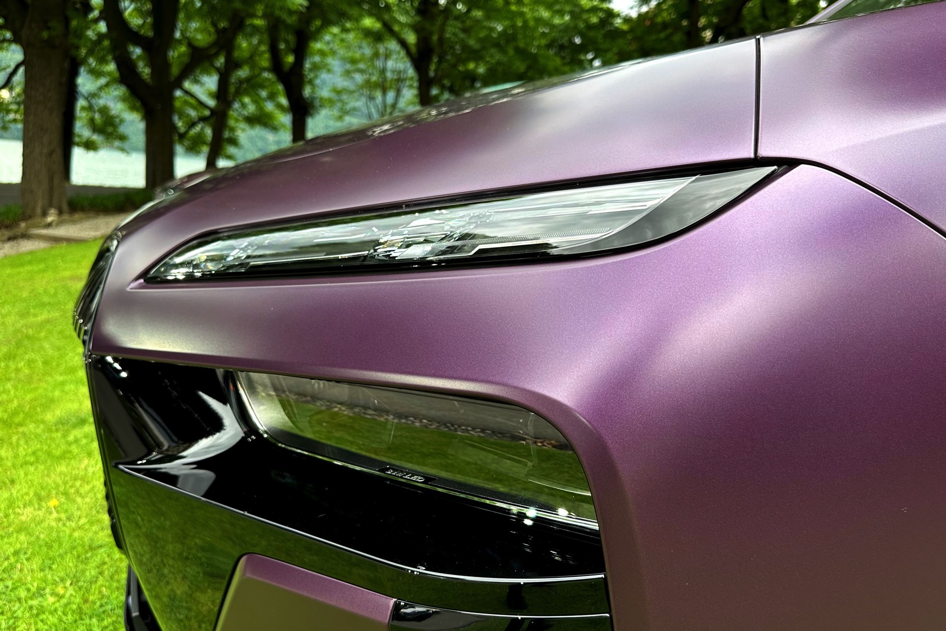 Auf der fast 5,40 Meter langen Elektro-Limousine entfaltet Frozen Purple eine ganz spezielle Wirkung und garantiert in jedem Umfeld enorme Aufmerksamkeit. Das gezeigte Fahrzeug kombiniert die exklusive Lackierung mit den 21 Zoll großen Aerodynamikrädern 909 M Multicolor 3D-Glanzschliff, die geringen Luftwiderstand mit einer eleganten Optik vereinen.
