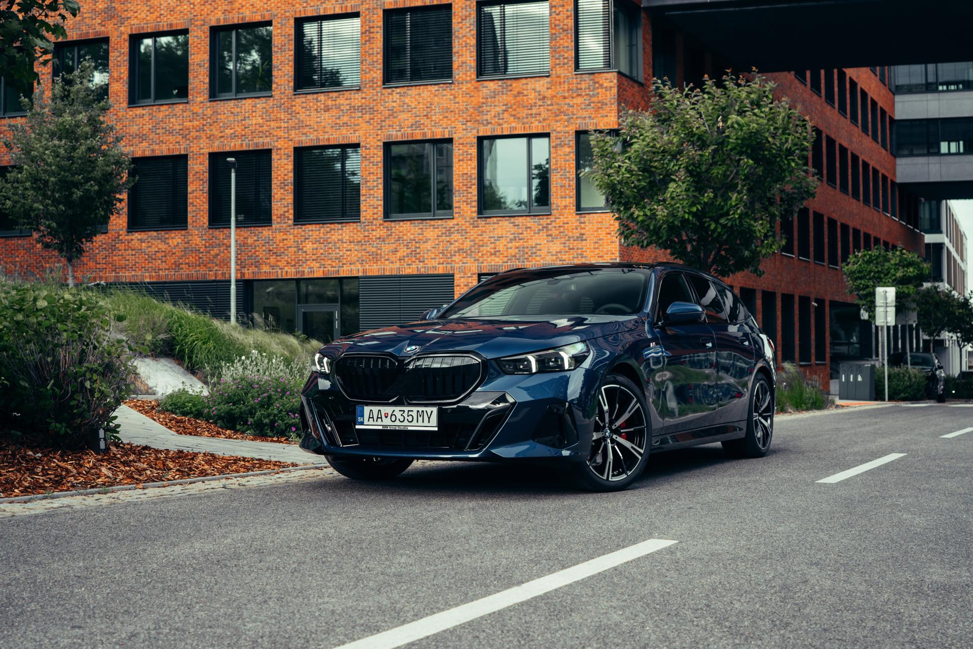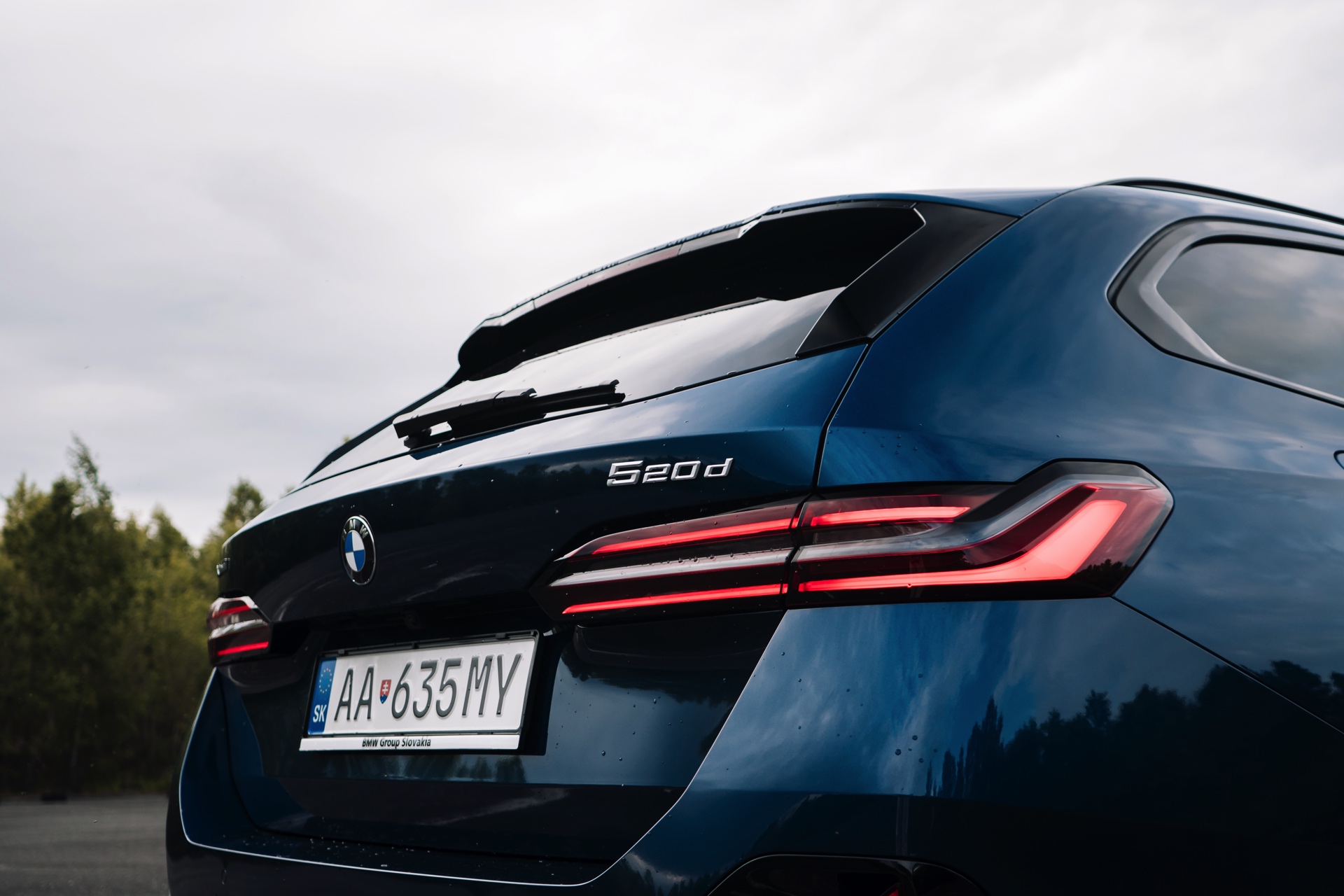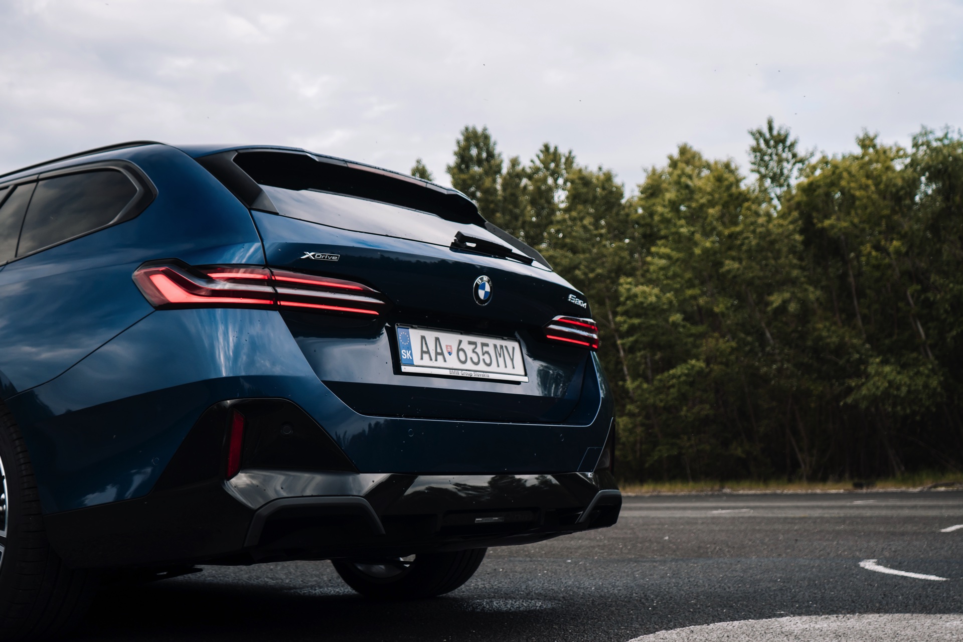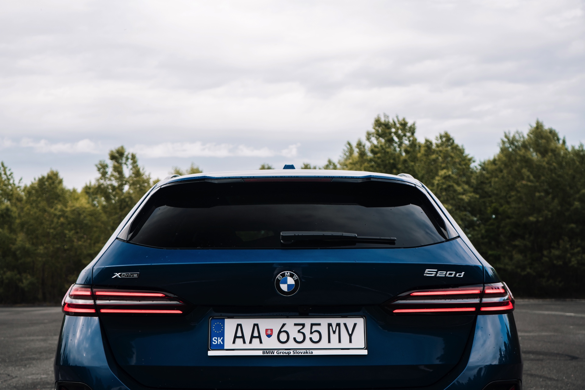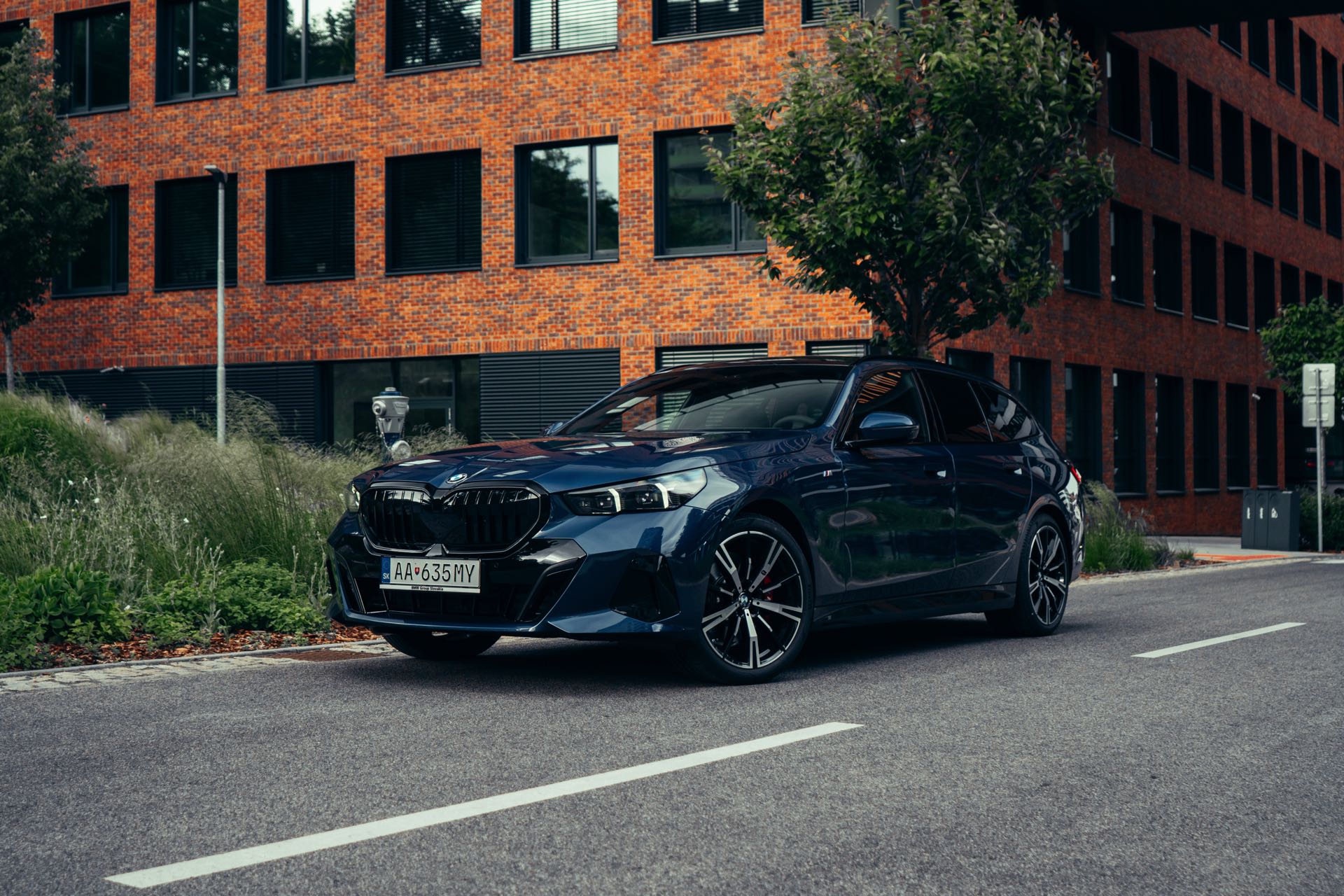 Auf den Fotos aus der Slowakei sehen wir den neuen BMW 5er Touring vorwiegend ohne Sonne auf dem Lack, weshalb sich auch Phytonic Blue eher von seiner dunklen Seite zeigt. Passend dazu präsentiert sich der Edel-Kombi mit dem M Sport Pro-Paket samt Shadow Line mit erweiterten Umfängen, weshalb er unter anderem die schwarz lackierte Variante der beleuchteten Iconic Glow-Niere tragen darf. Was er im Gegensatz dazu nicht tragen darf, sind sichtbare Endrohre: Genau wie alle übrigen bisher vorgestellten 5er der neuen Generation G6x verzichtet auch der BMW 520d xDrive auf jeden sichtbaren Hinweis auf den Verbrennungsmotor an Bord.