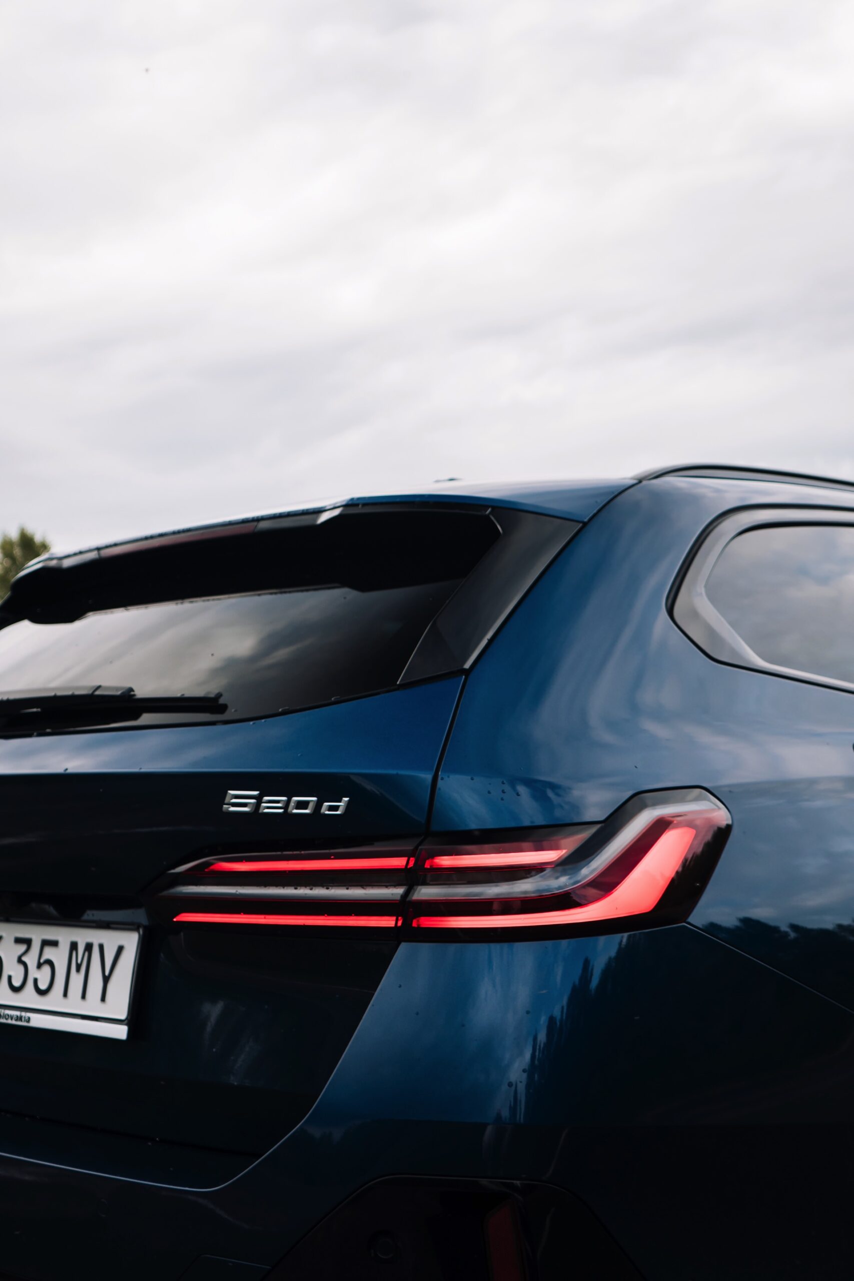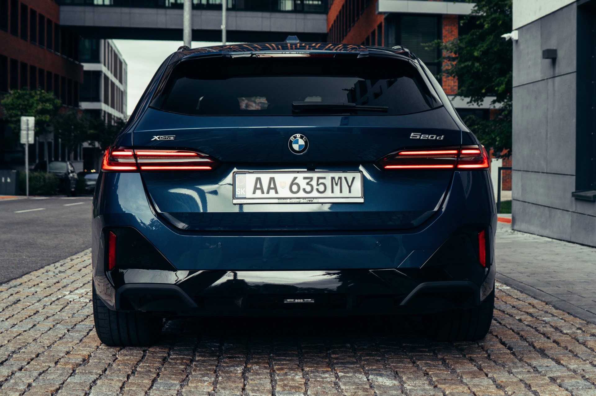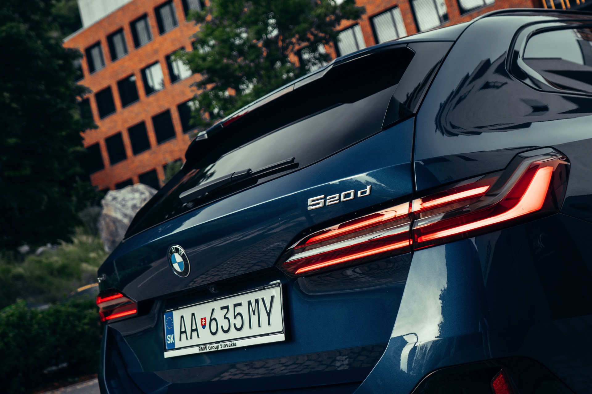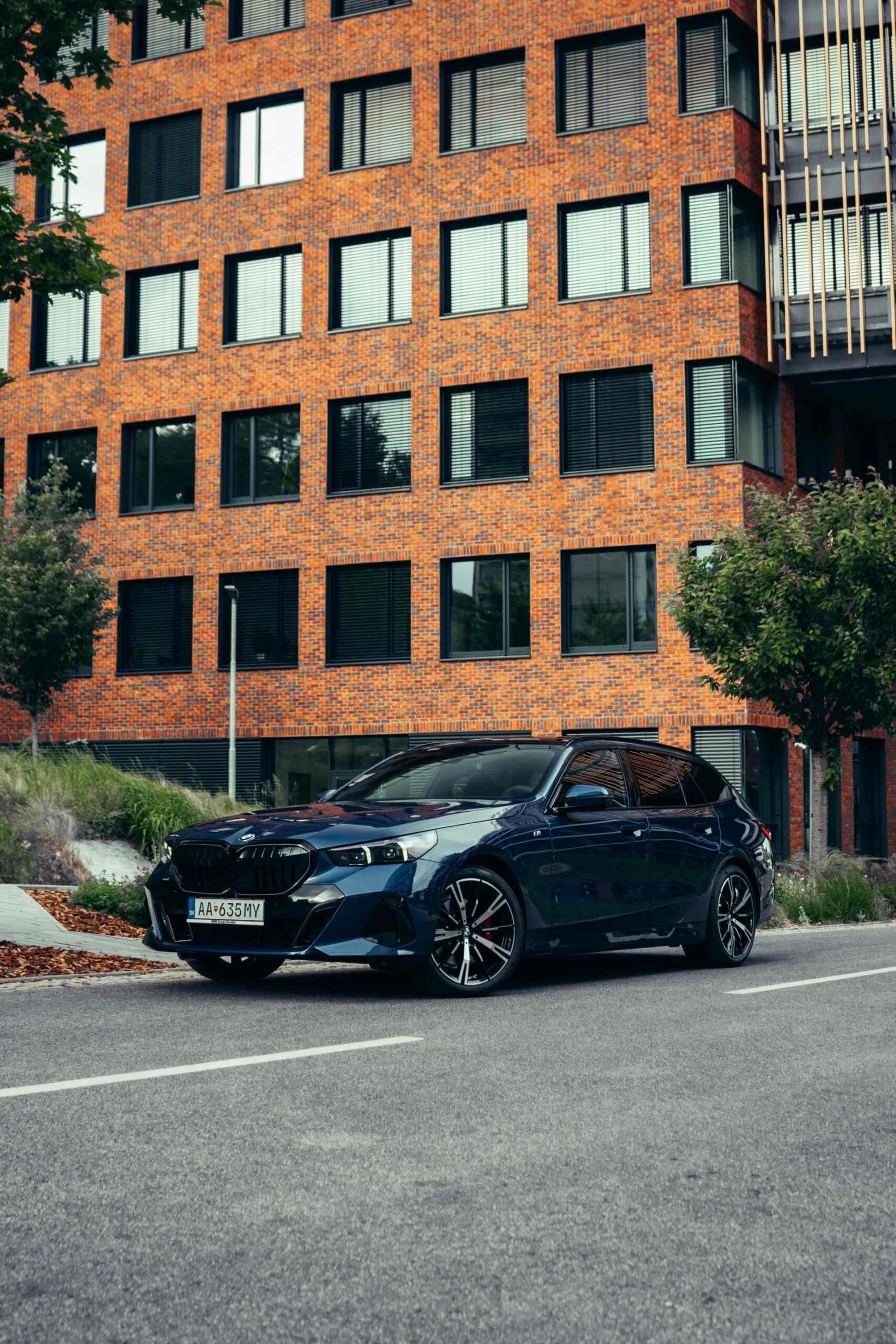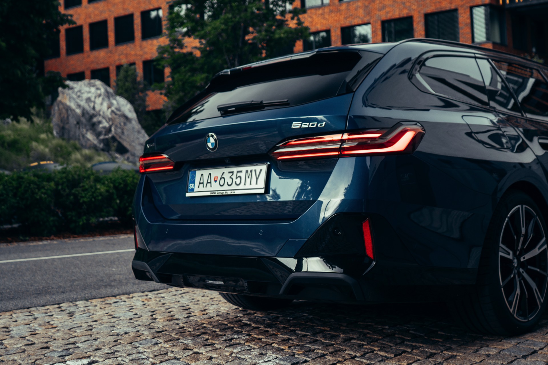 Auf den Fotos aus der Slowakei sehen wir den neuen BMW 5er Touring vorwiegend ohne Sonne auf dem Lack, weshalb sich auch Phytonic Blue eher von seiner dunklen Seite zeigt. Passend dazu präsentiert sich der Edel-Kombi mit dem M Sport Pro-Paket samt Shadow Line mit erweiterten Umfängen, weshalb er unter anderem die schwarz lackierte Variante der beleuchteten Iconic Glow-Niere tragen darf. Was er im Gegensatz dazu nicht tragen darf, sind sichtbare Endrohre: Genau wie alle übrigen bisher vorgestellten 5er der neuen Generation G6x verzichtet auch der BMW 520d xDrive auf jeden sichtbaren Hinweis auf den Verbrennungsmotor an Bord.
