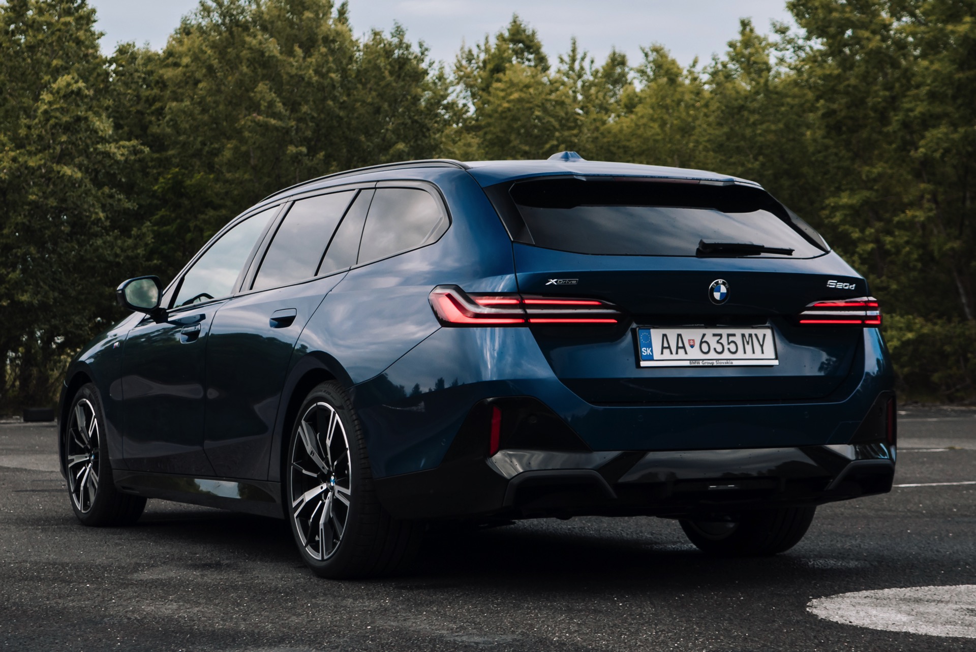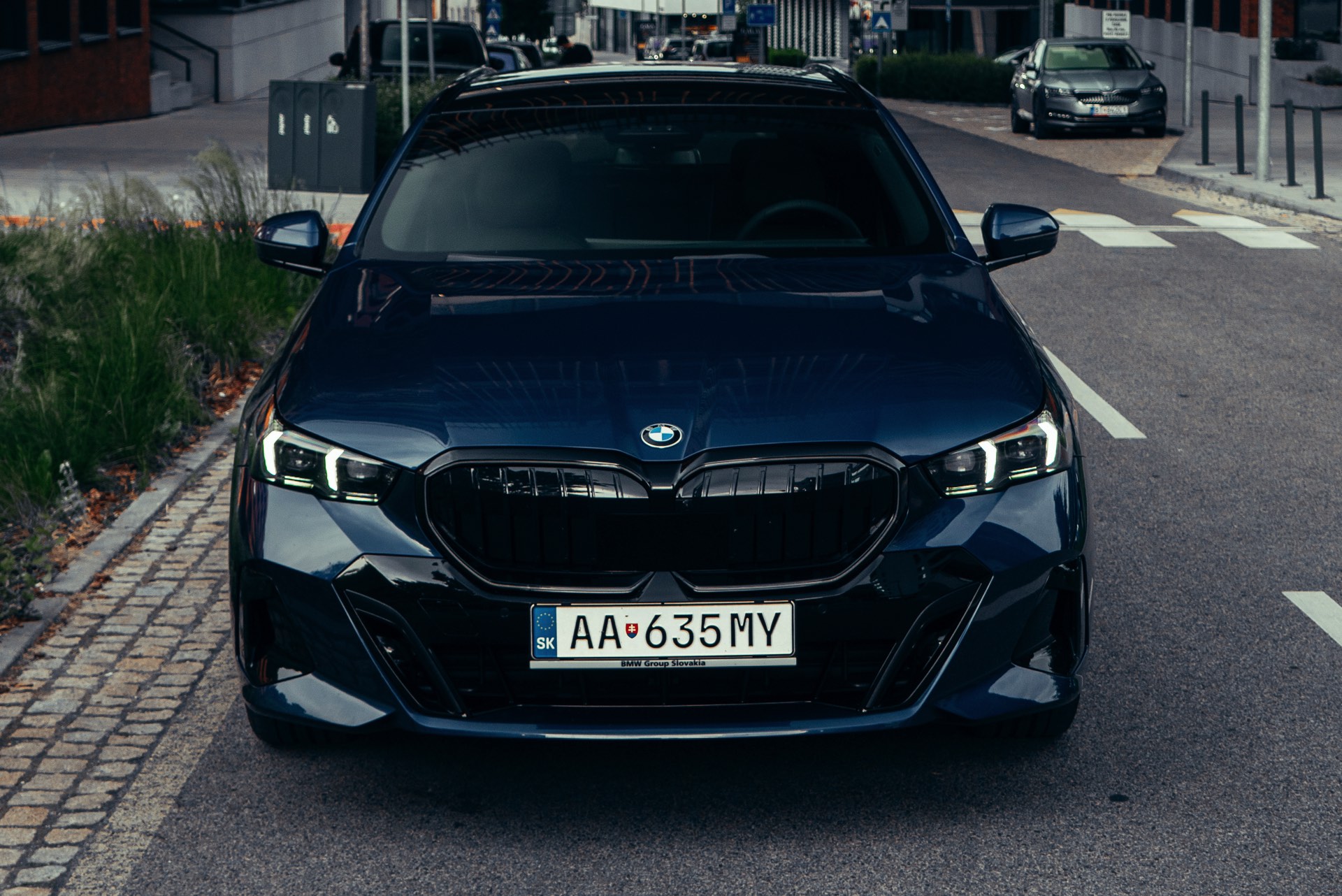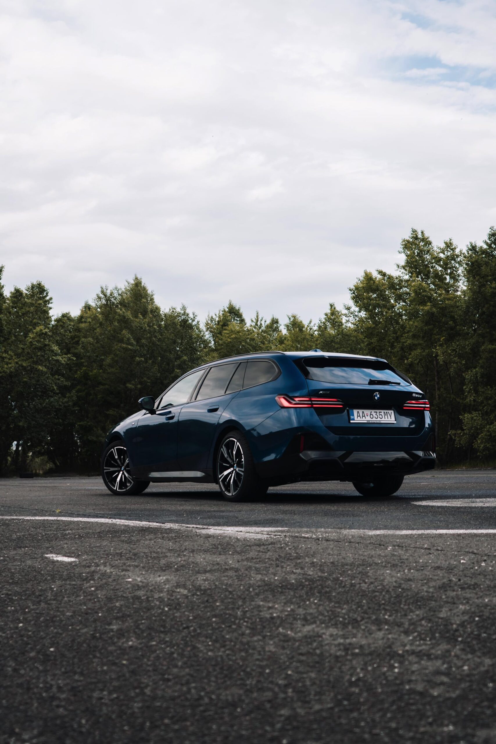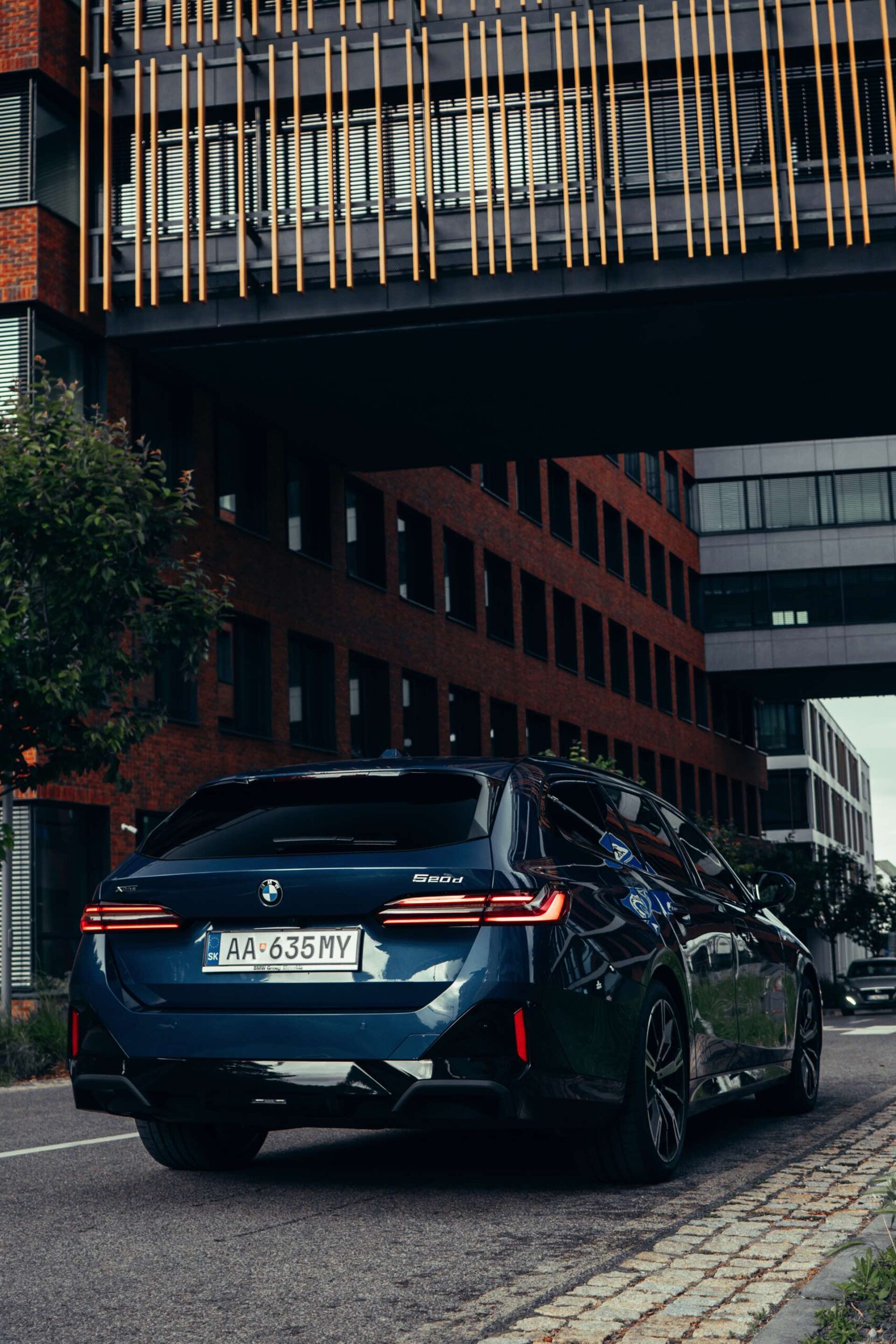 Auf den Fotos aus der Slowakei sehen wir den neuen BMW 5er Touring vorwiegend ohne Sonne auf dem Lack, weshalb sich auch Phytonic Blue eher von seiner dunklen Seite zeigt. Passend dazu präsentiert sich der Edel-Kombi mit dem M Sport Pro-Paket samt Shadow Line mit erweiterten Umfängen, weshalb er unter anderem die schwarz lackierte Variante der beleuchteten Iconic Glow-Niere tragen darf. Was er im Gegensatz dazu nicht tragen darf, sind sichtbare Endrohre: Genau wie alle übrigen bisher vorgestellten 5er der neuen Generation G6x verzichtet auch der BMW 520d xDrive auf jeden sichtbaren Hinweis auf den Verbrennungsmotor an Bord.