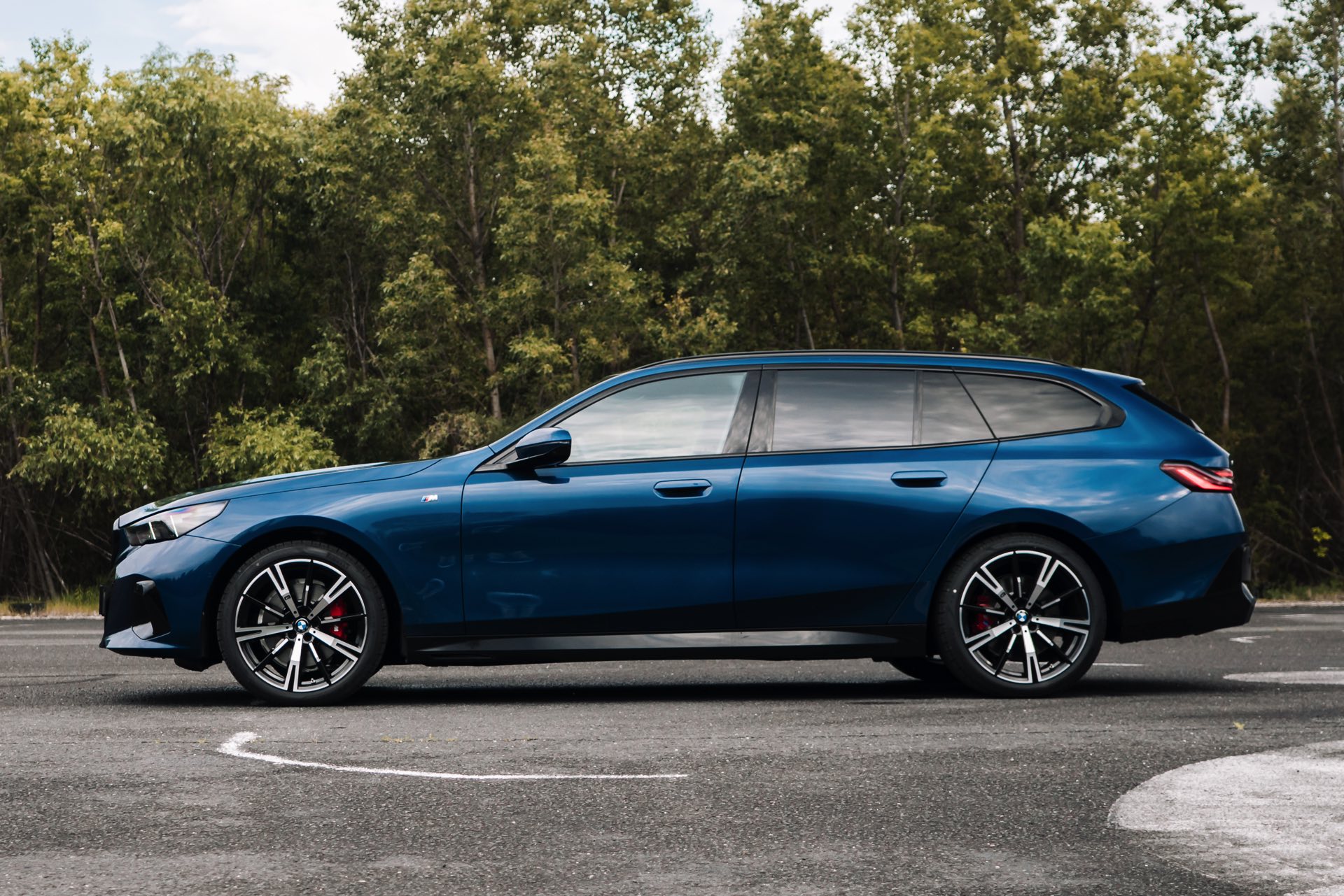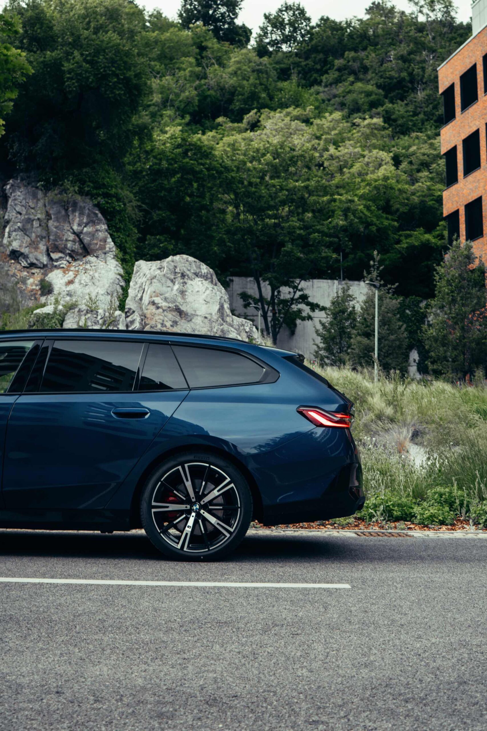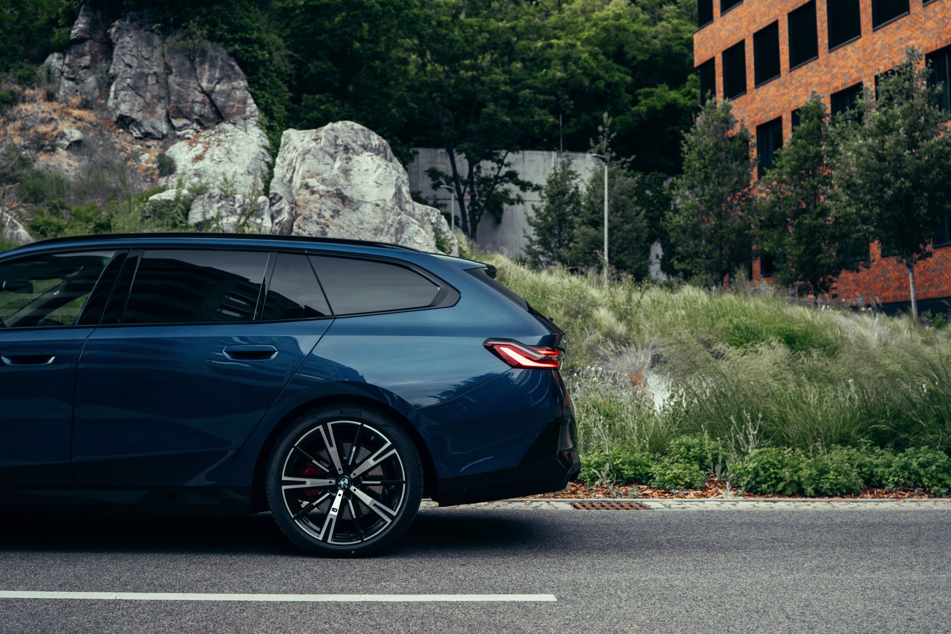 In der Seitenansicht punktet der gezeigte BMW 520d Touring mit den 20 Zoll großen Leichtmetallrädern Sternspeiche 938 M Bicolor Jetblack, deren filigrane Speichen die M Sportbremse mit ihren roten Bremssätteln kaum verdecken.