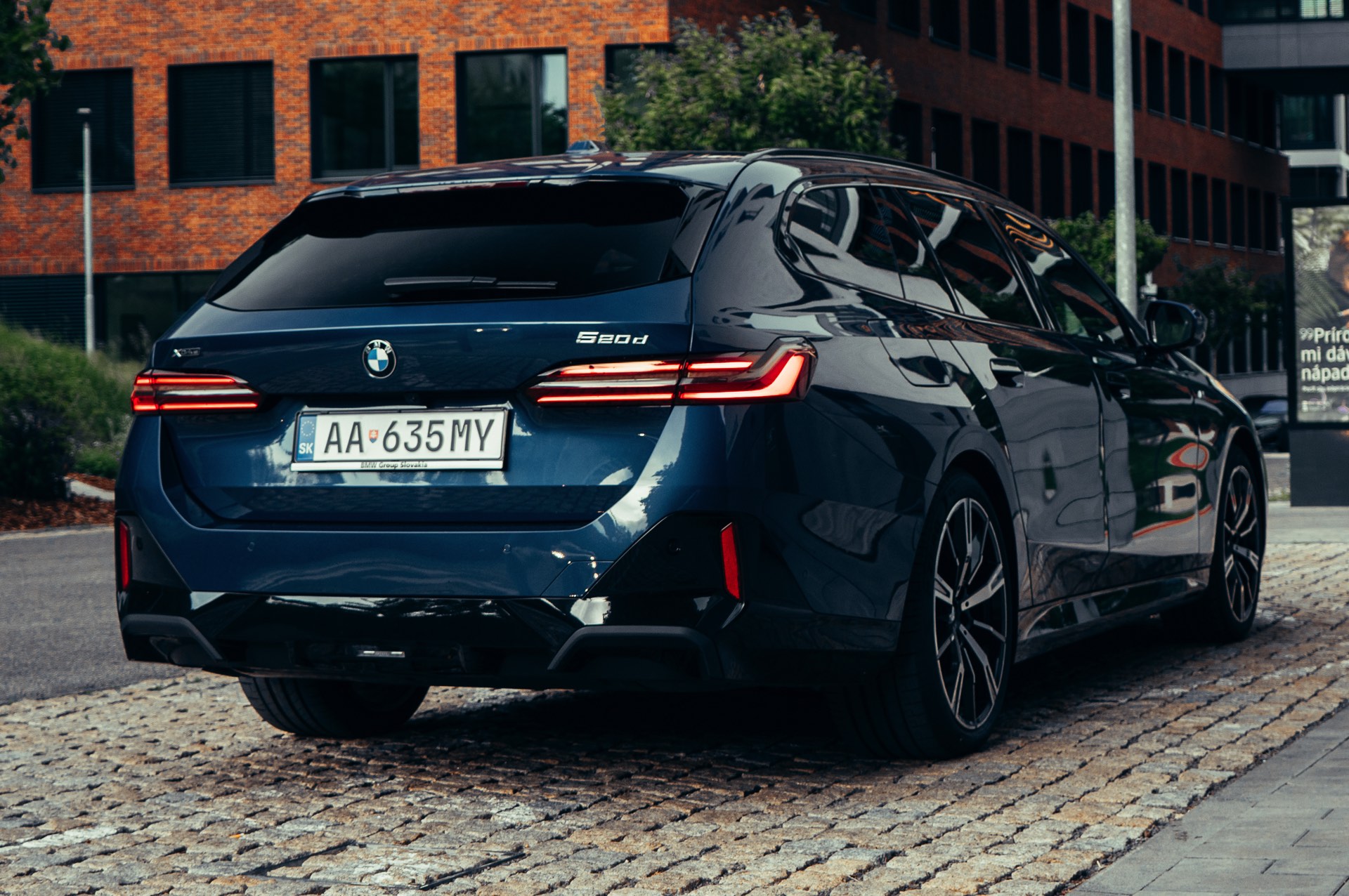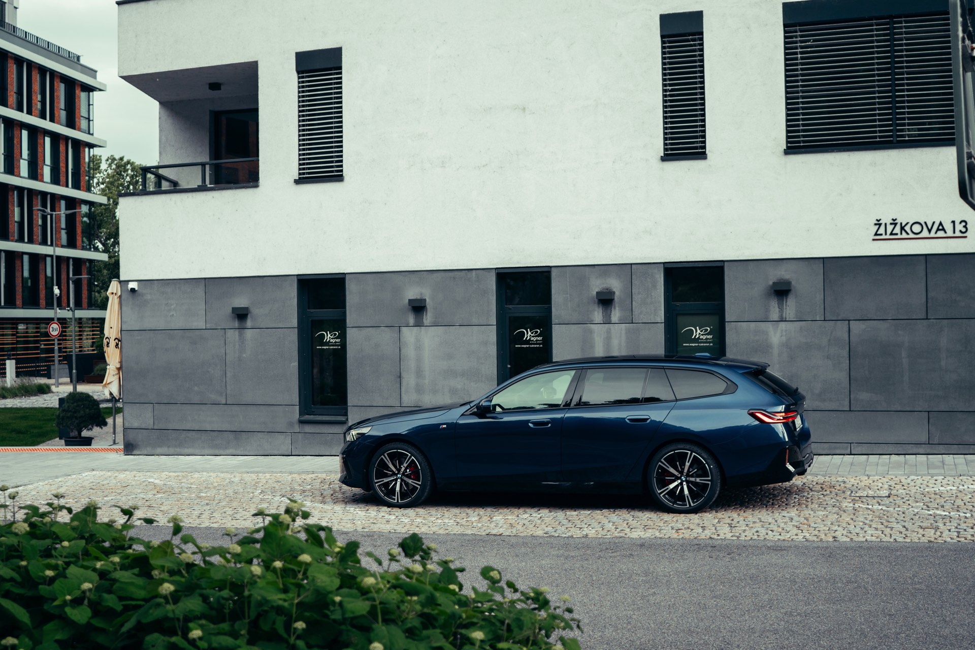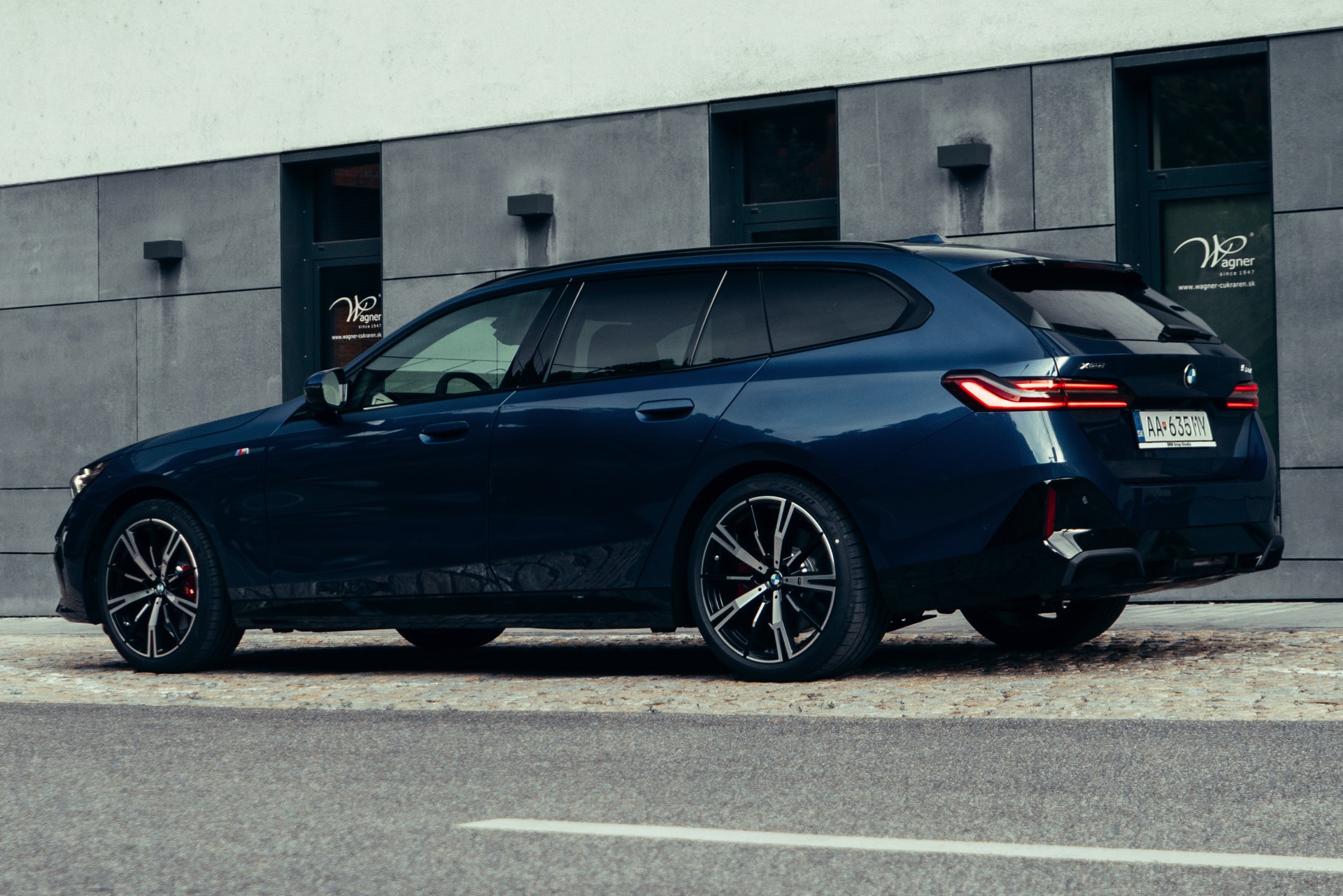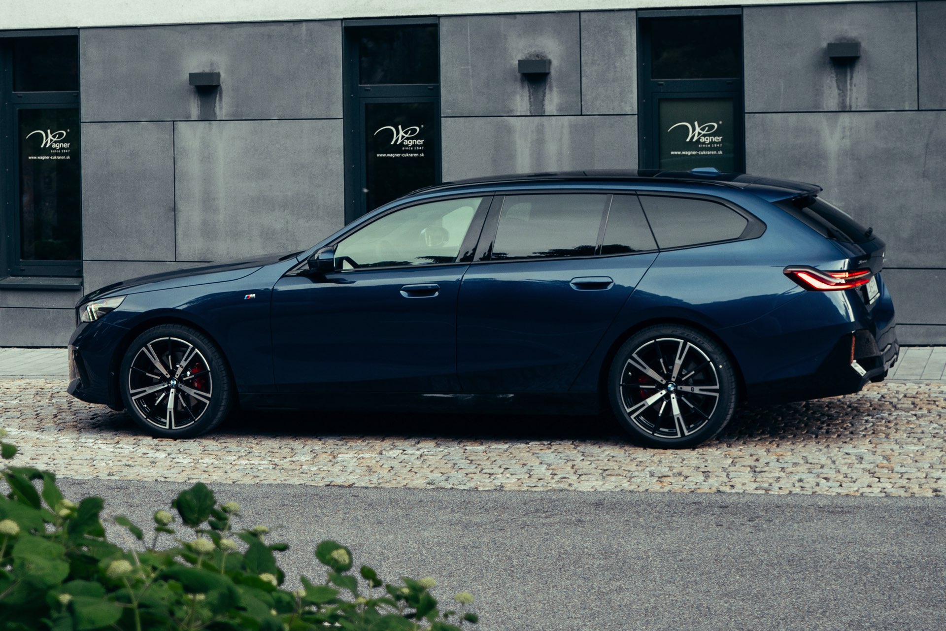 In der Seitenansicht punktet der gezeigte BMW 520d Touring mit den 20 Zoll großen Leichtmetallrädern Sternspeiche 938 M Bicolor Jetblack, deren filigrane Speichen die M Sportbremse mit ihren roten Bremssätteln kaum verdecken.