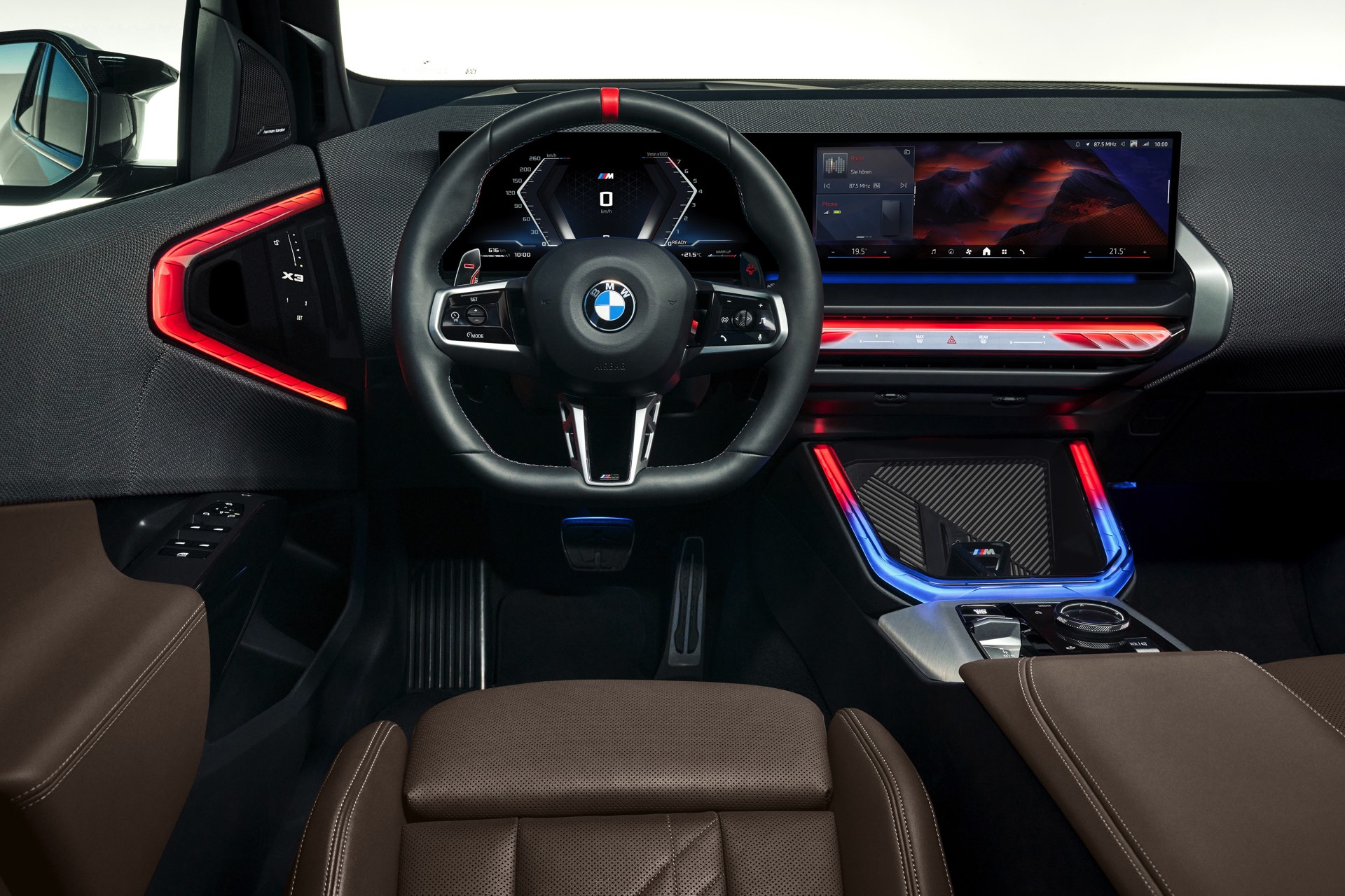 Bereits im Grundpreis aller neuen BMW X3 enthalten sind unter anderem der Allradantrieb xDrive, die Achtgang-Automatik mit Schaltwippen am Lenkrad, das große Curved-Display samt iDrive 9 und cloudbasiertem Navigationssystem, die farbig durchleuchtete Interaction Bar, eine 3-Zonen-Klimaautomatik, eine Alarmanlage sowie mehrere Komfort- und Assistenzsysteme: Angefangen von der Park-Distance-Control (PDC) mit Parking Assistant über die Spurverlassenswarnung mit aktiver Rückführung, die Geschwindigkeitsregelung bis hin zur Heck- und Querverkehrs- und Frontkollisionswarnung bringt der X3 eine Vielzahl von Features mit, die den Fahrer im Alltag entlasten können.