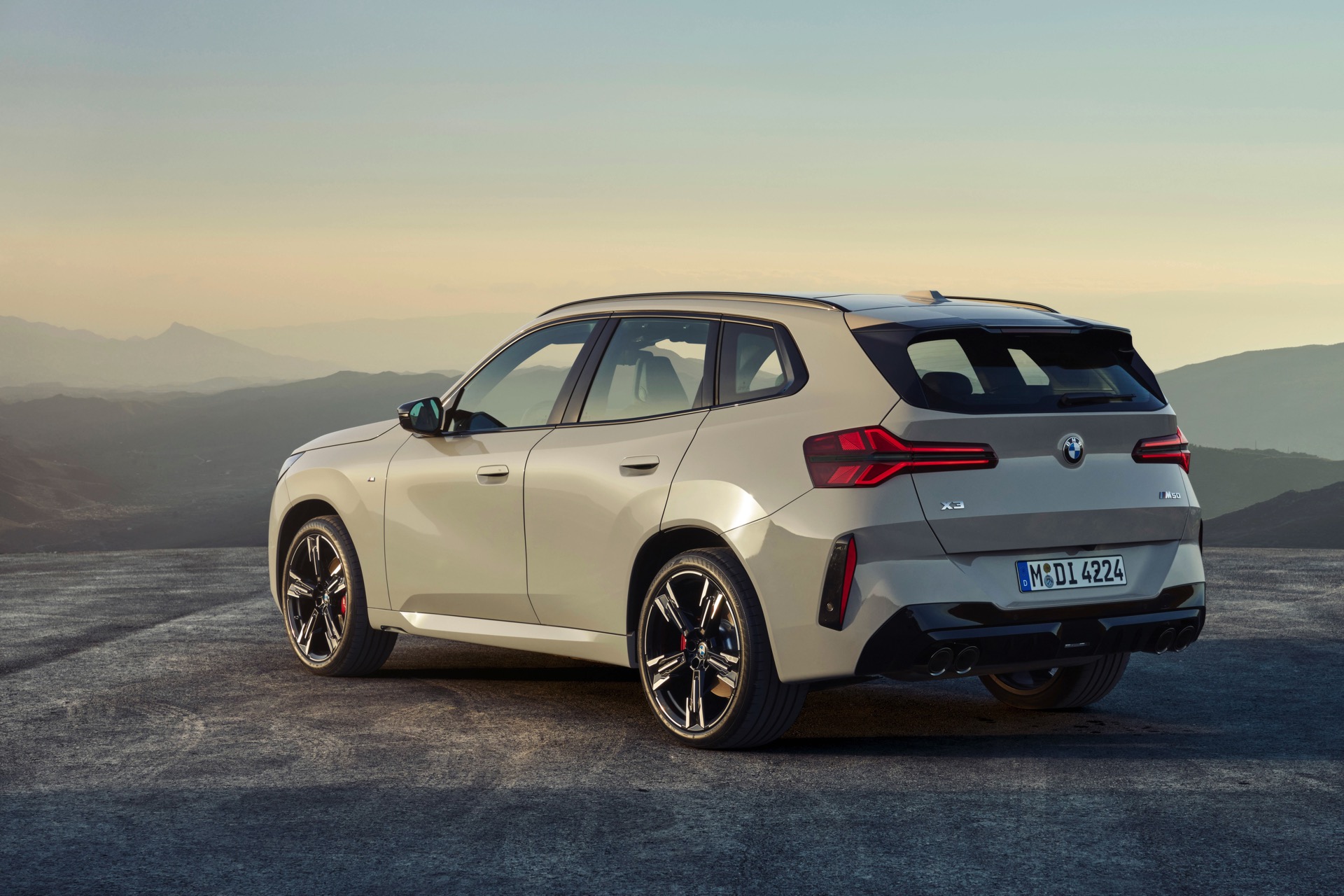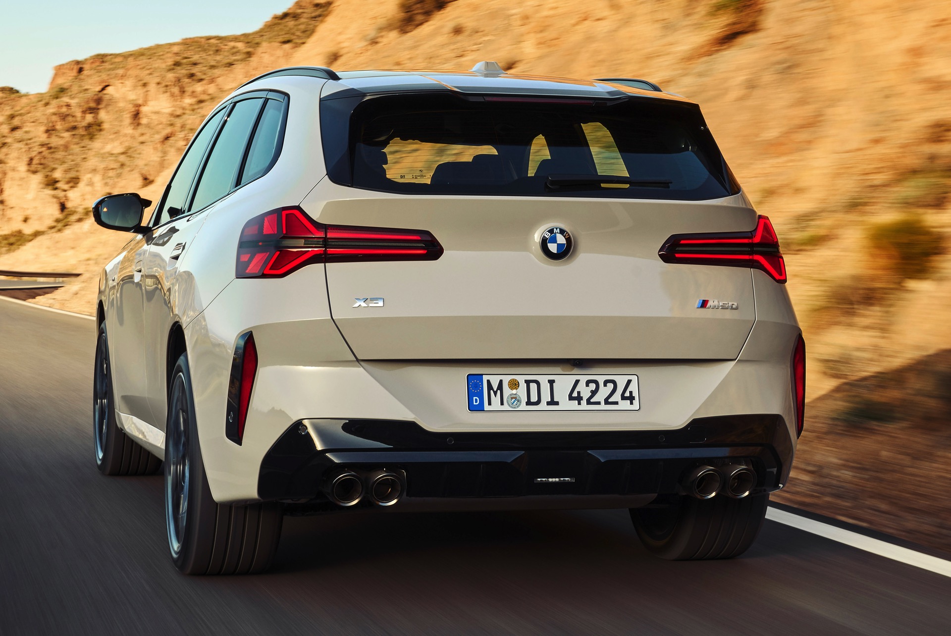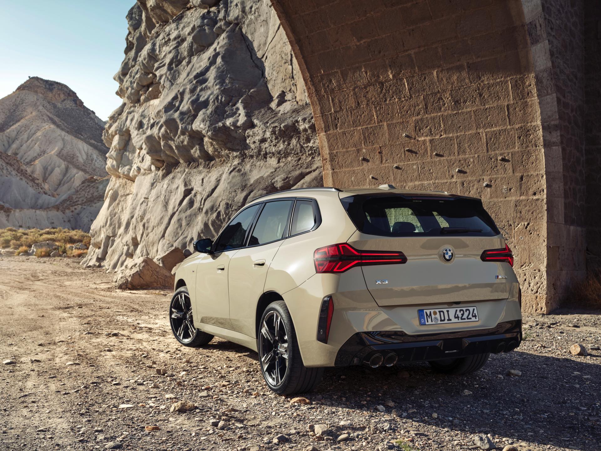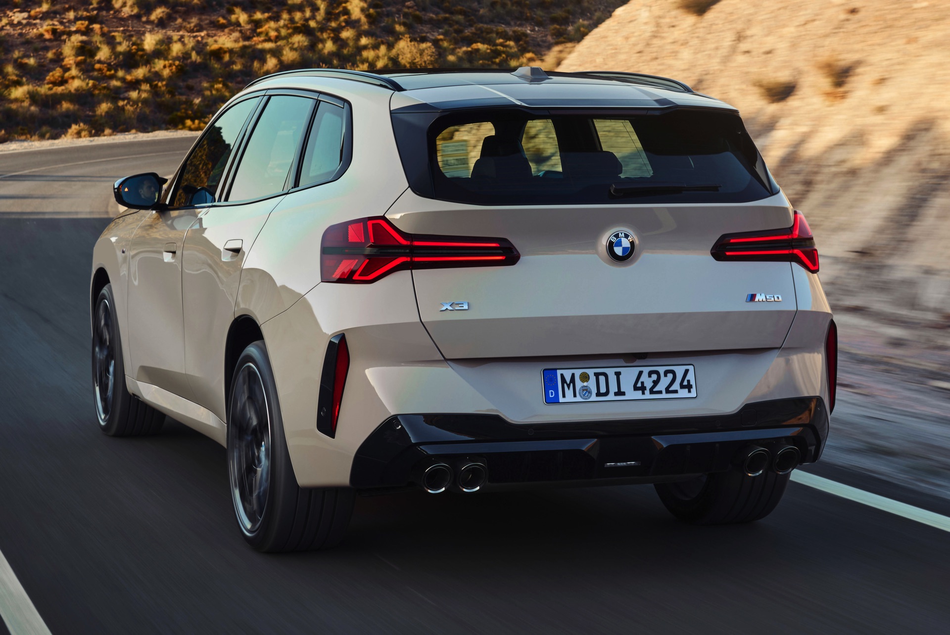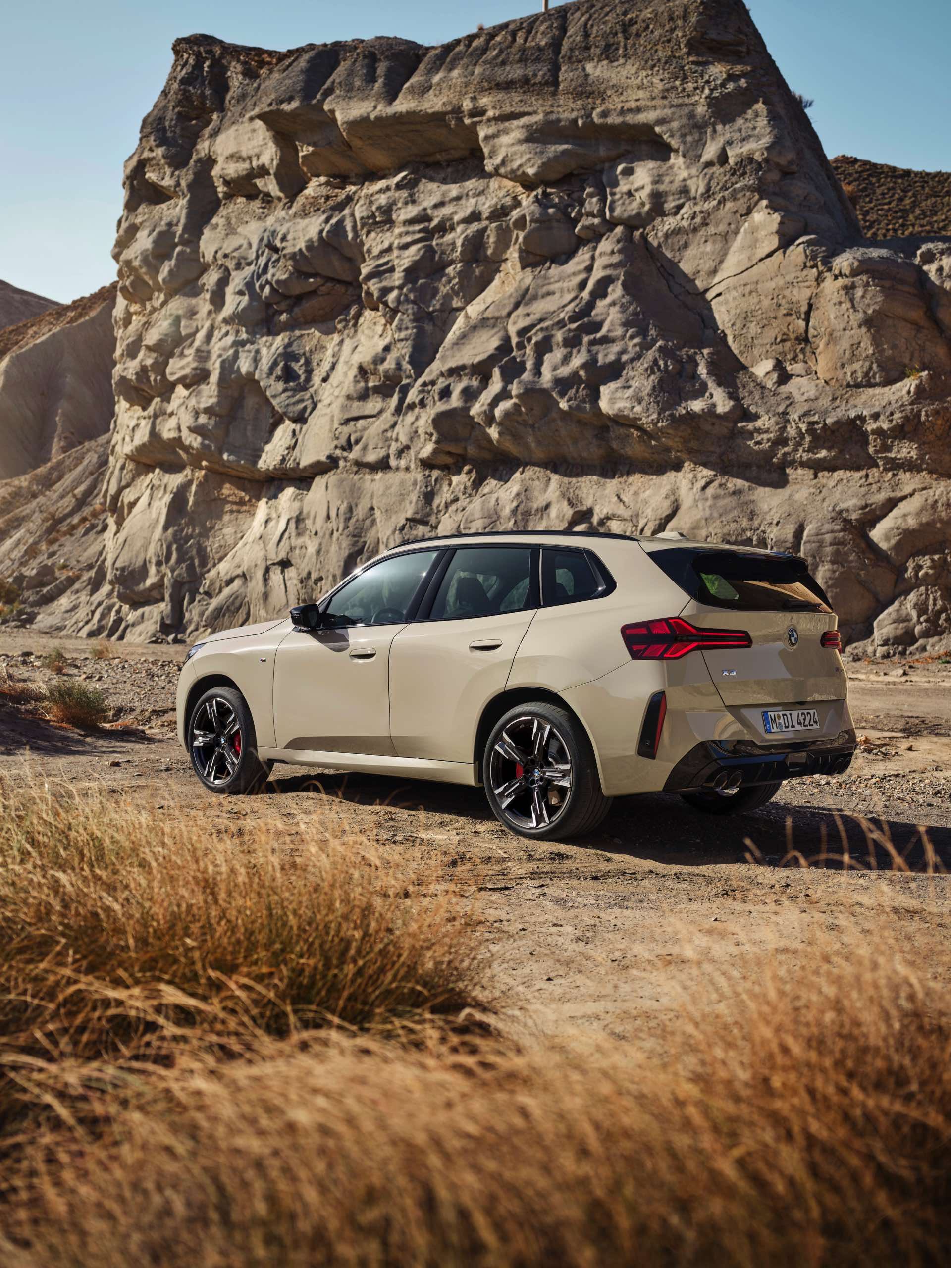 Auf den ersten Fotos sehen wir den neuen BMW X3 M50 in der neuen Farbe Dune Grey Metallic, deren sanfter Gelbton an Sandwüsten und Dünen erinnert. Zur Abgrenzung von den schwächeren Varianten des neuen X3 trägt der M50 eine exklusive Niere mit horizontalen Streben, M Außenspiegel und eine Abgasanlage mit vier Endrohren. In den Radhäusern des X3 M50 kommen serienmäßig 20 Zoll-Felgen zum Einsatz, auf Wunsch stehen auch 21-Zöller zur Wahl.
