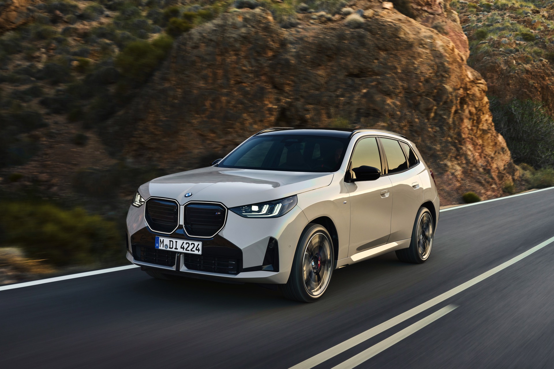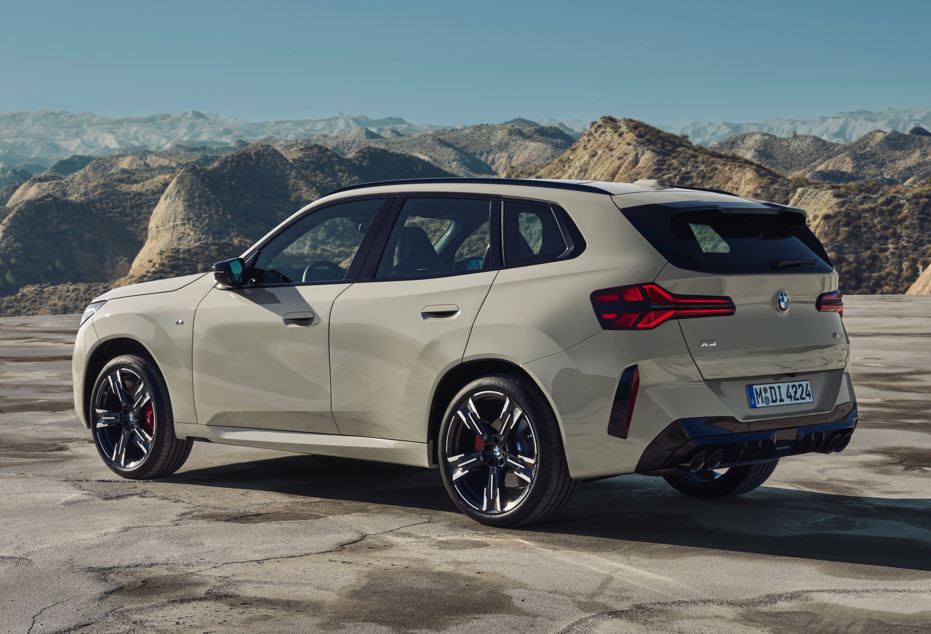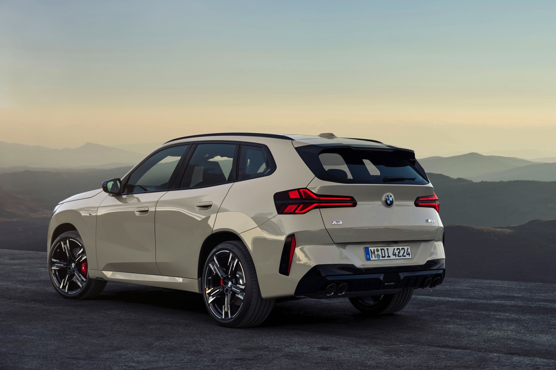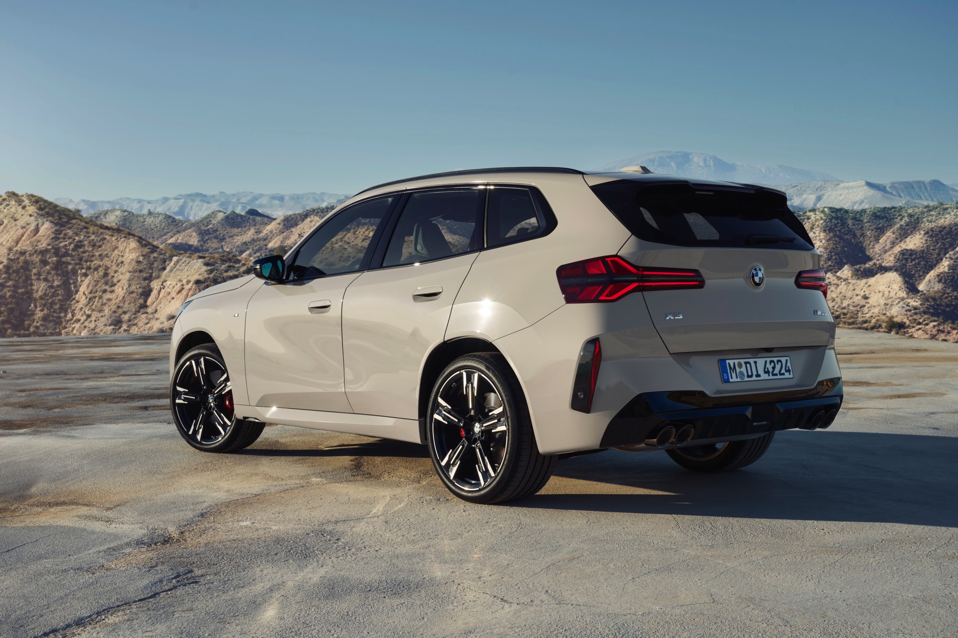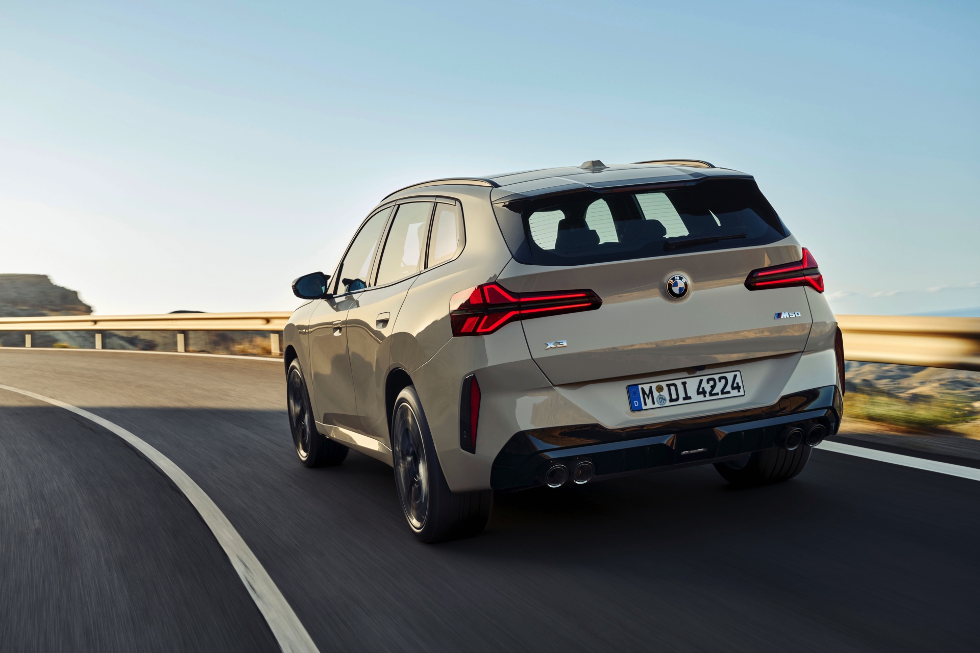 Auf den ersten Fotos sehen wir den neuen BMW X3 M50 in der neuen Farbe Dune Grey Metallic, deren sanfter Gelbton an Sandwüsten und Dünen erinnert. Zur Abgrenzung von den schwächeren Varianten des neuen X3 trägt der M50 eine exklusive Niere mit horizontalen Streben, M Außenspiegel und eine Abgasanlage mit vier Endrohren. In den Radhäusern des X3 M50 kommen serienmäßig 20 Zoll-Felgen zum Einsatz, auf Wunsch stehen auch 21-Zöller zur Wahl.