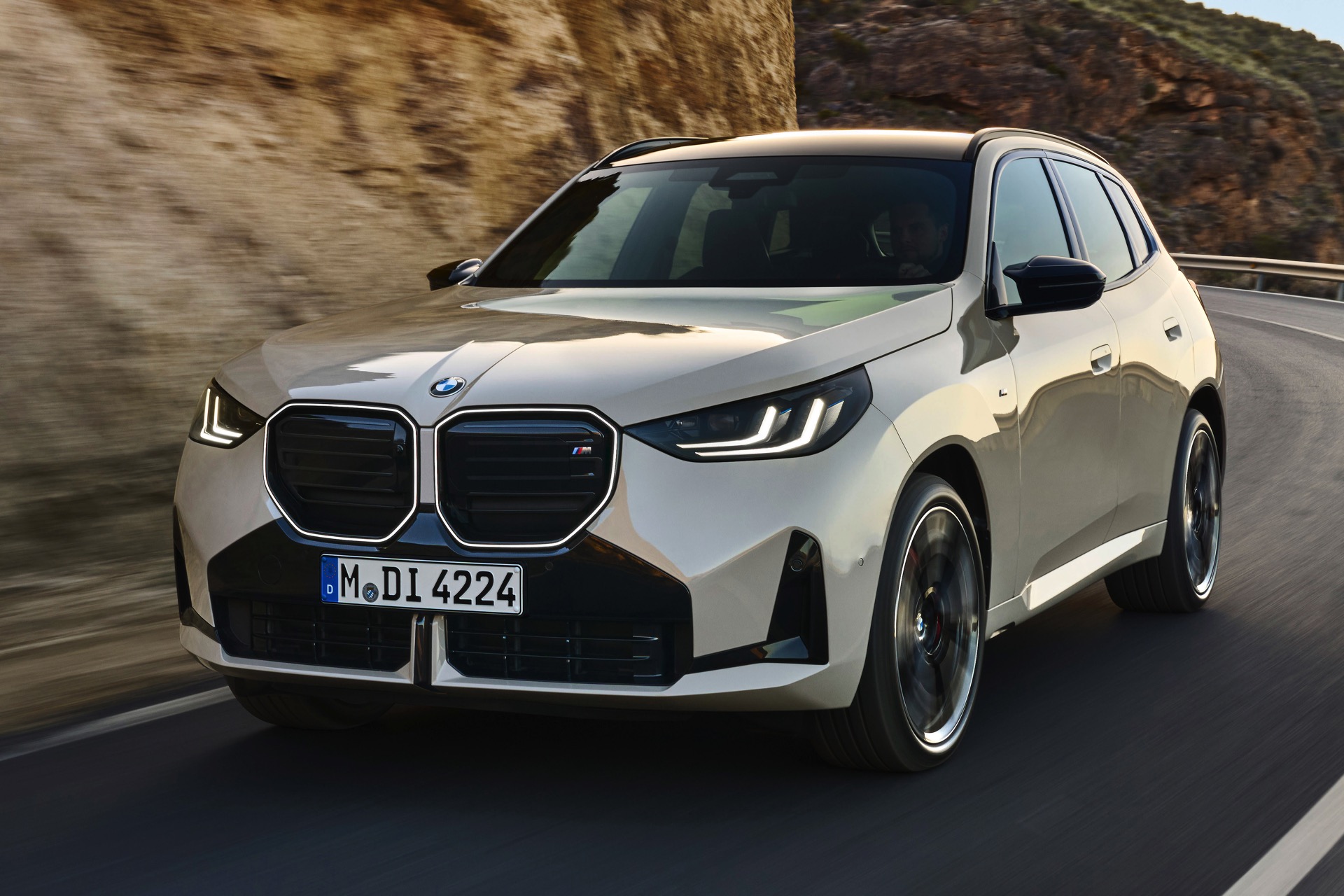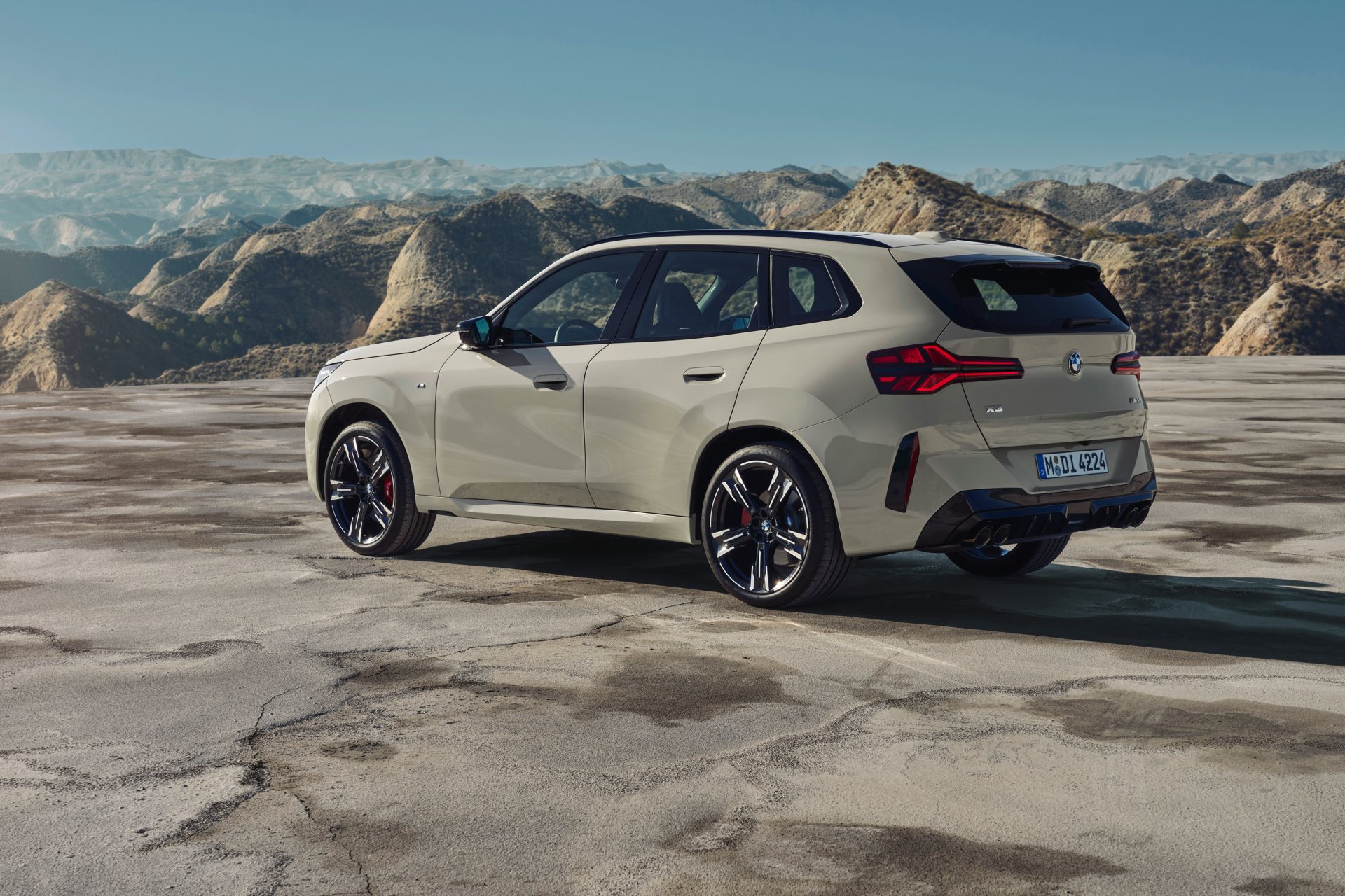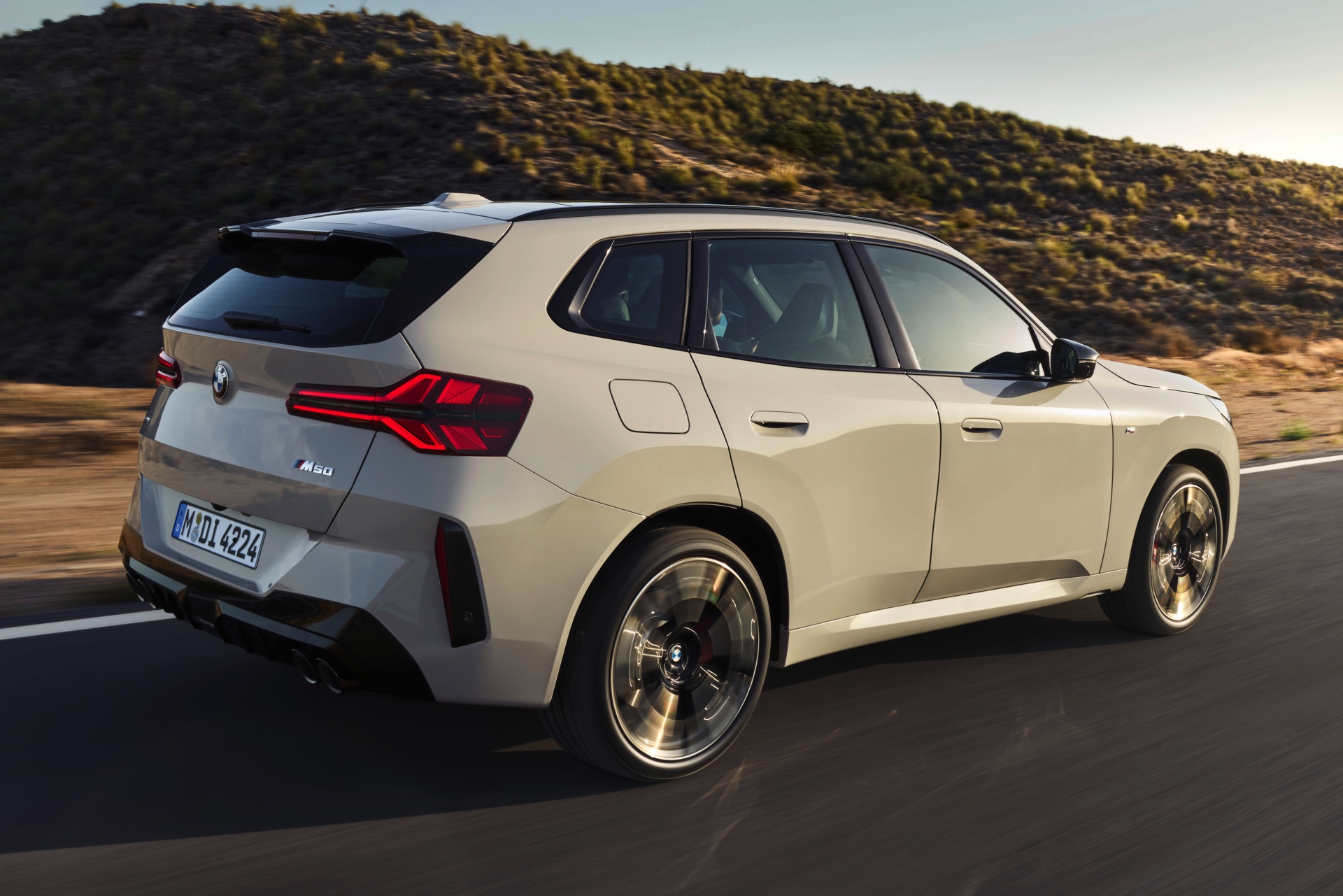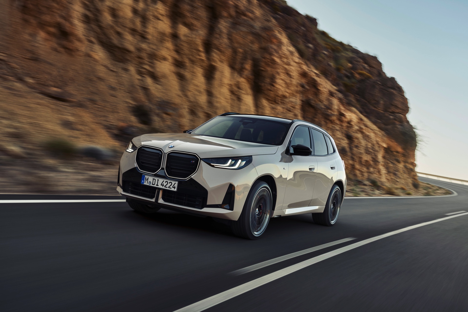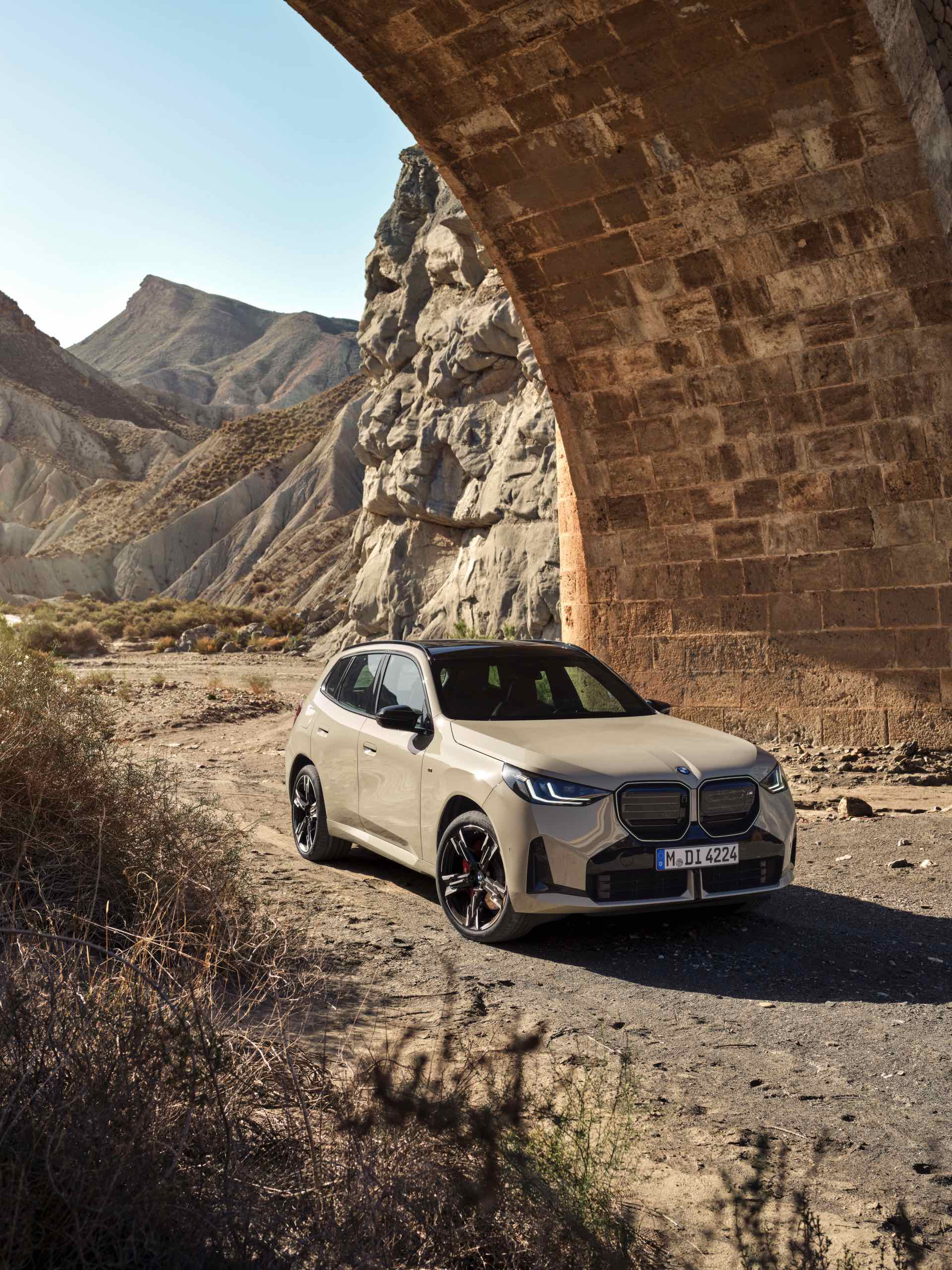 Auf den ersten Fotos sehen wir den neuen BMW X3 M50 in der neuen Farbe Dune Grey Metallic, deren sanfter Gelbton an Sandwüsten und Dünen erinnert. Zur Abgrenzung von den schwächeren Varianten des neuen X3 trägt der M50 eine exklusive Niere mit horizontalen Streben, M Außenspiegel und eine Abgasanlage mit vier Endrohren. In den Radhäusern des X3 M50 kommen serienmäßig 20 Zoll-Felgen zum Einsatz, auf Wunsch stehen auch 21-Zöller zur Wahl.