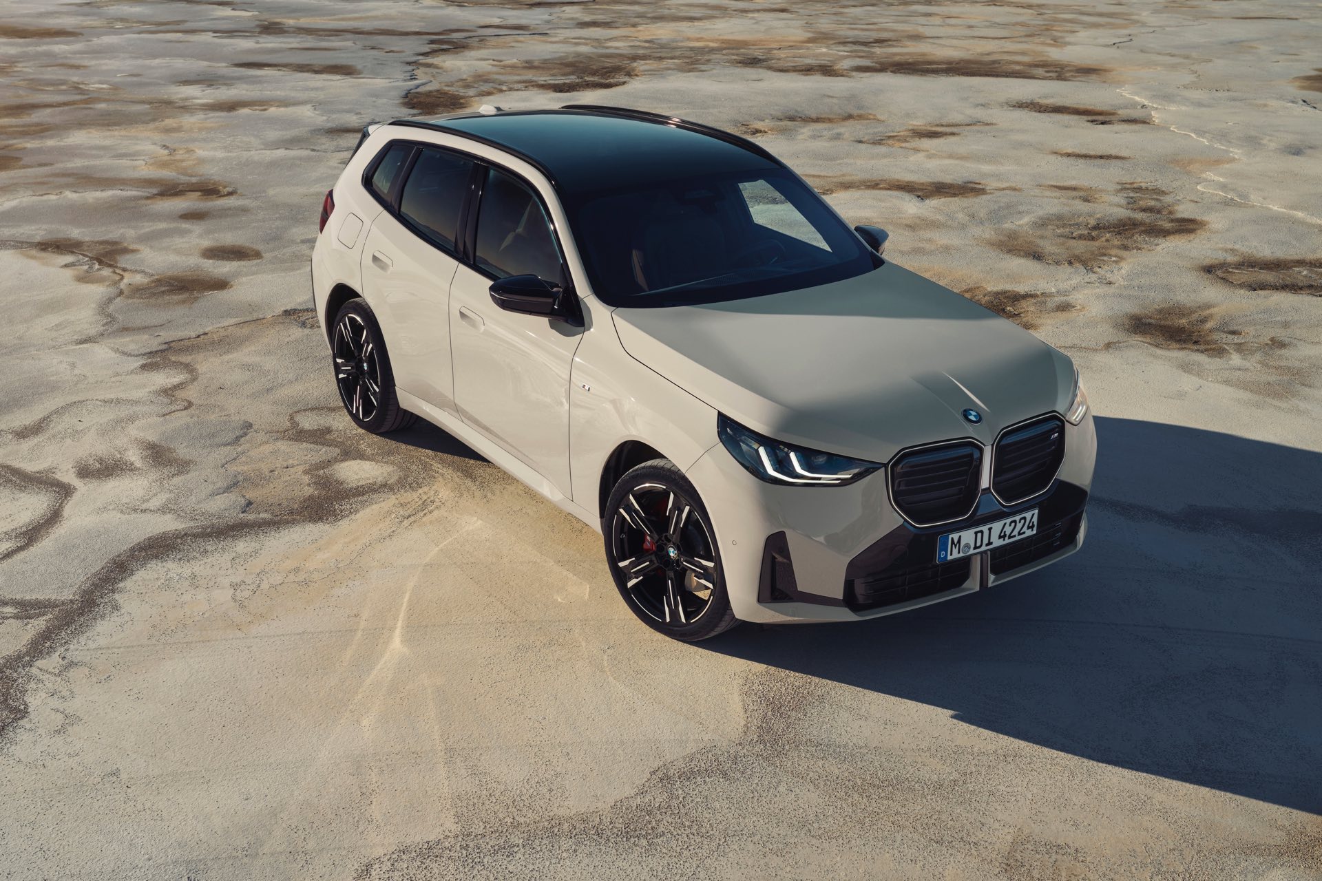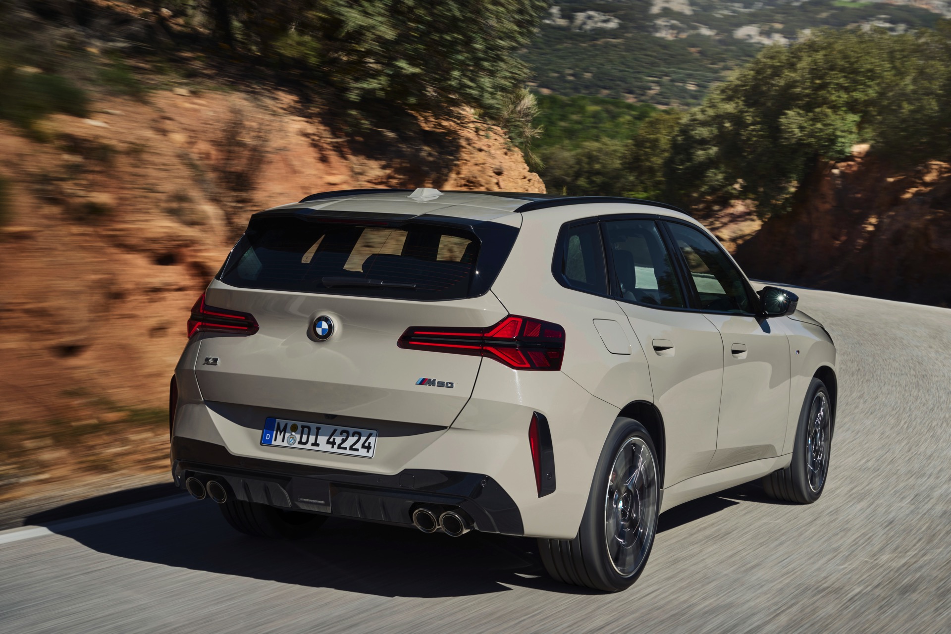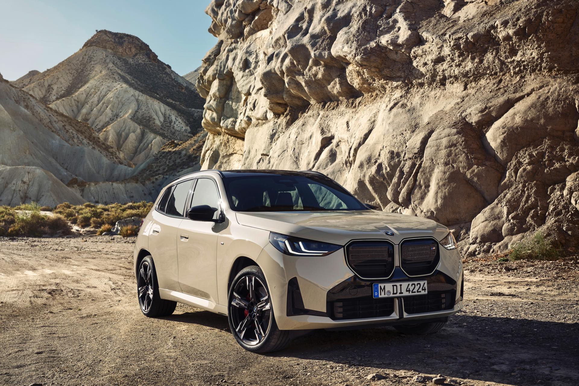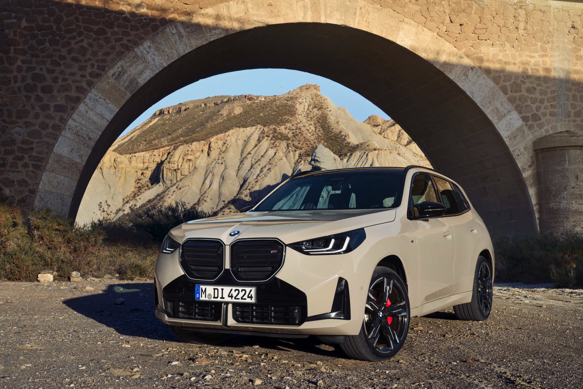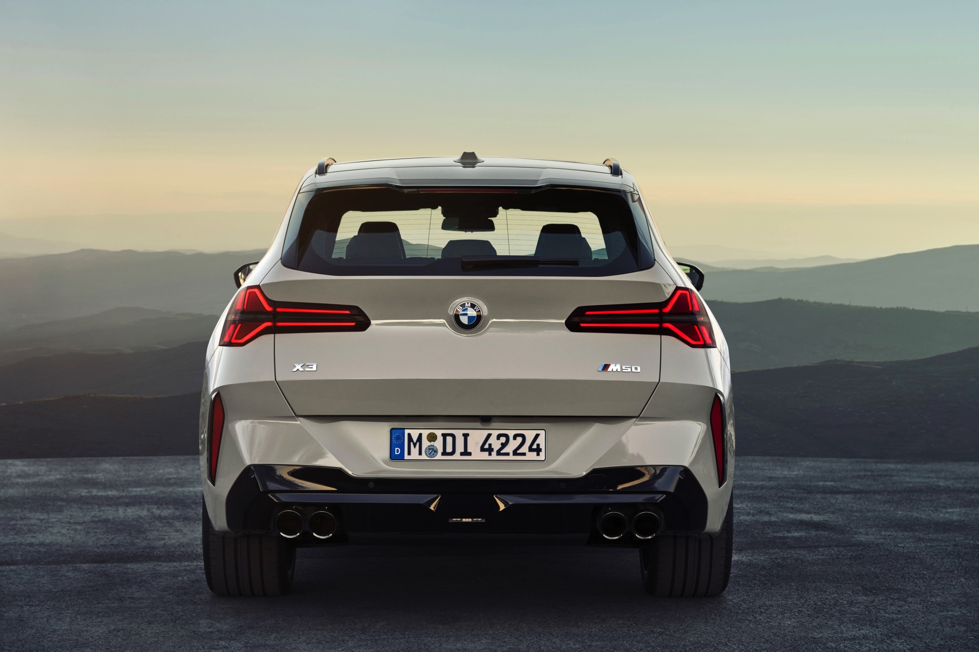Auf den ersten Fotos sehen wir den neuen BMW X3 M50 in der neuen Farbe Dune Grey Metallic, deren sanfter Gelbton an Sandwüsten und Dünen erinnert. Zur Abgrenzung von den schwächeren Varianten des neuen X3 trägt der M50 eine exklusive Niere mit horizontalen Streben, M Außenspiegel und eine Abgasanlage mit vier Endrohren. In den Radhäusern des X3 M50 kommen serienmäßig 20 Zoll-Felgen zum Einsatz, auf Wunsch stehen auch 21-Zöller zur Wahl.