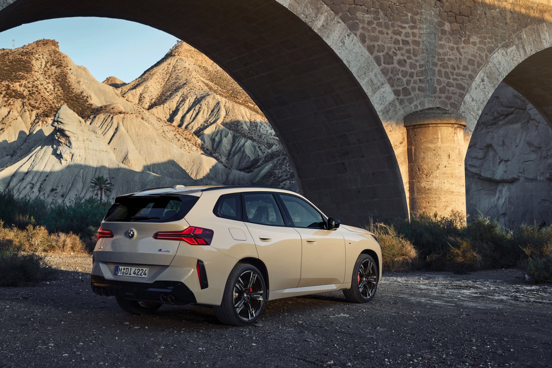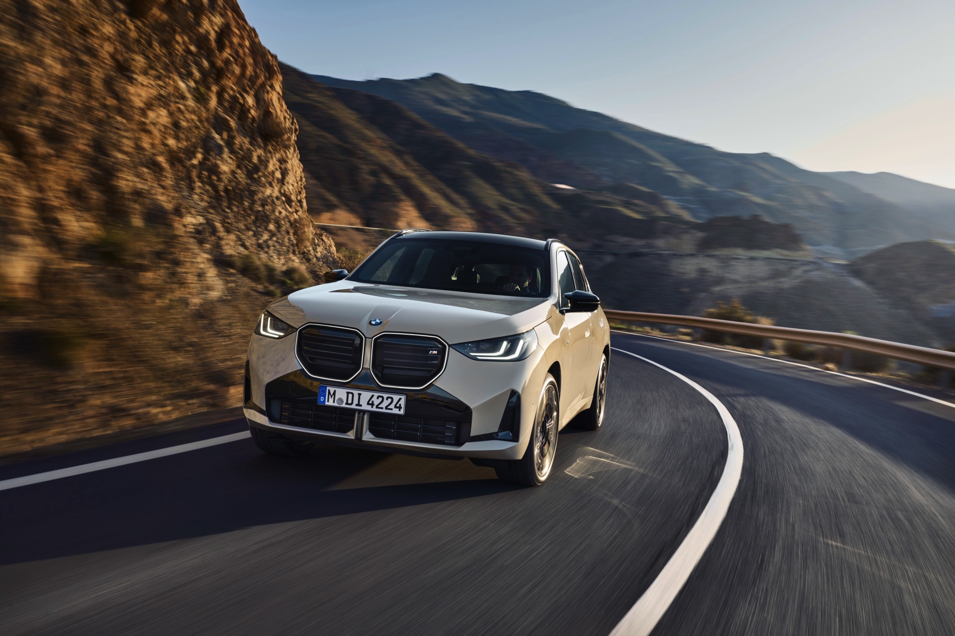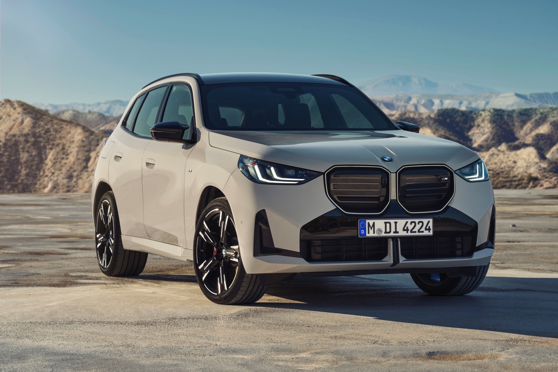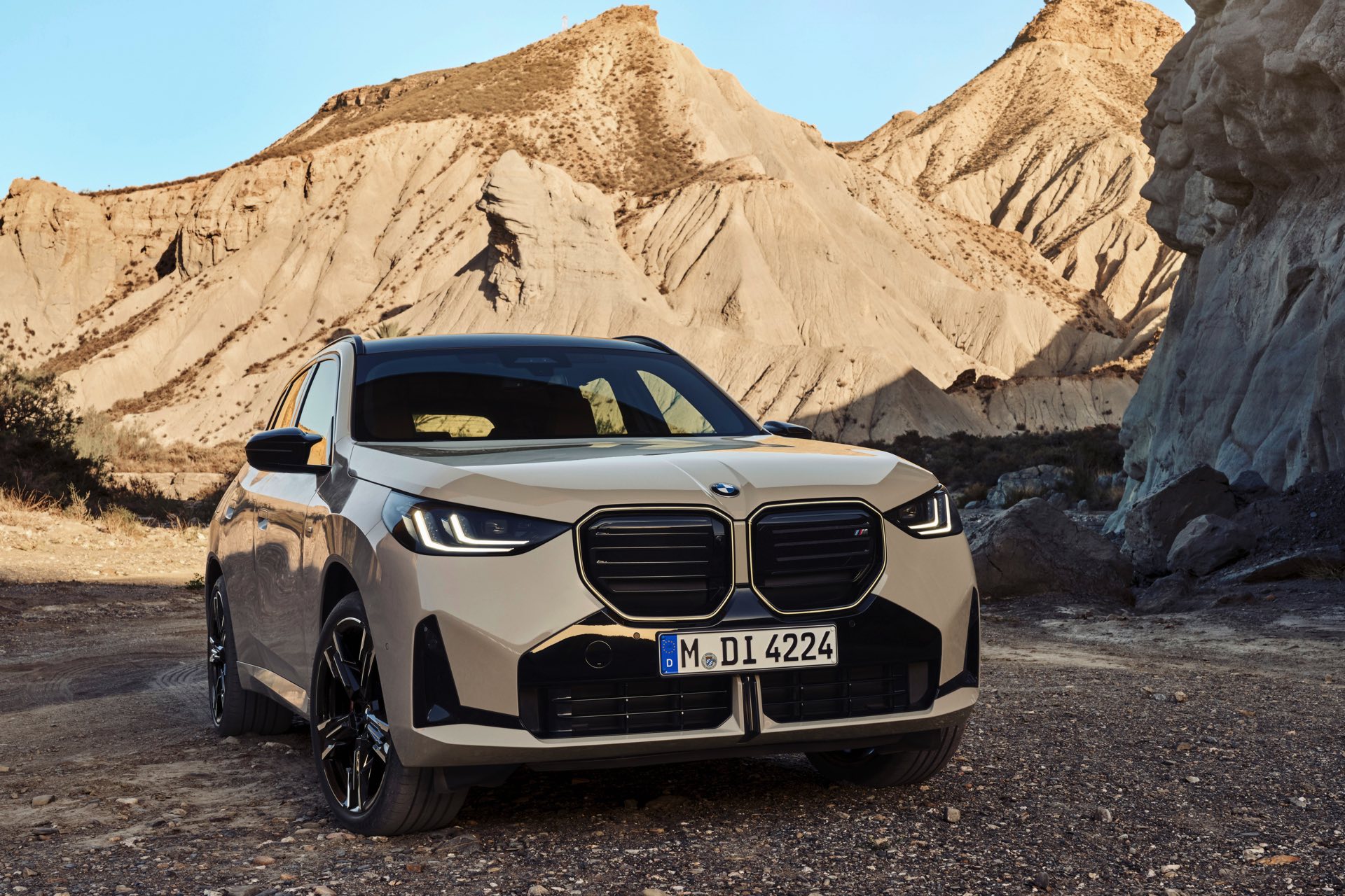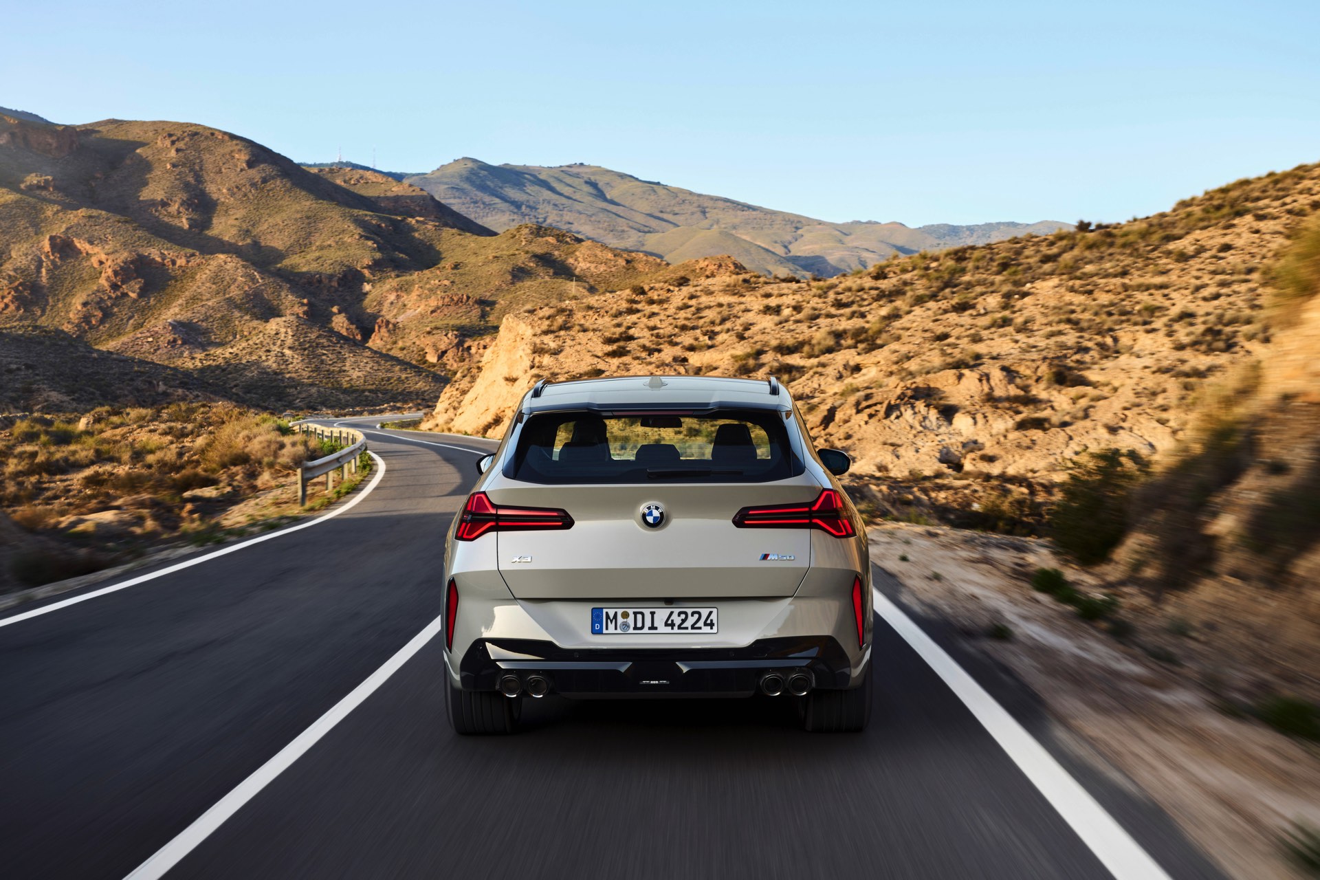 Auf den ersten Fotos sehen wir den neuen BMW X3 M50 in der neuen Farbe Dune Grey Metallic, deren sanfter Gelbton an Sandwüsten und Dünen erinnert. Zur Abgrenzung von den schwächeren Varianten des neuen X3 trägt der M50 eine exklusive Niere mit horizontalen Streben, M Außenspiegel und eine Abgasanlage mit vier Endrohren. In den Radhäusern des X3 M50 kommen serienmäßig 20 Zoll-Felgen zum Einsatz, auf Wunsch stehen auch 21-Zöller zur Wahl.
