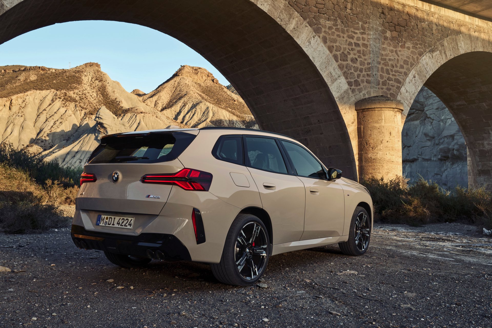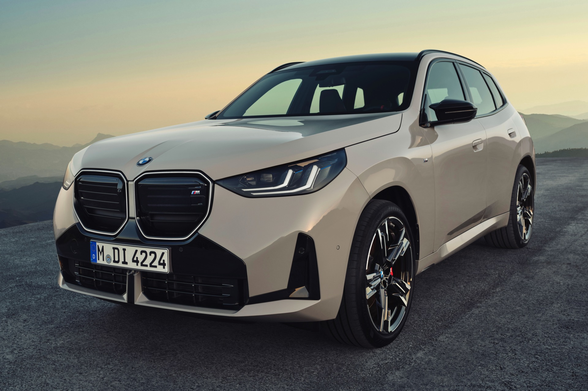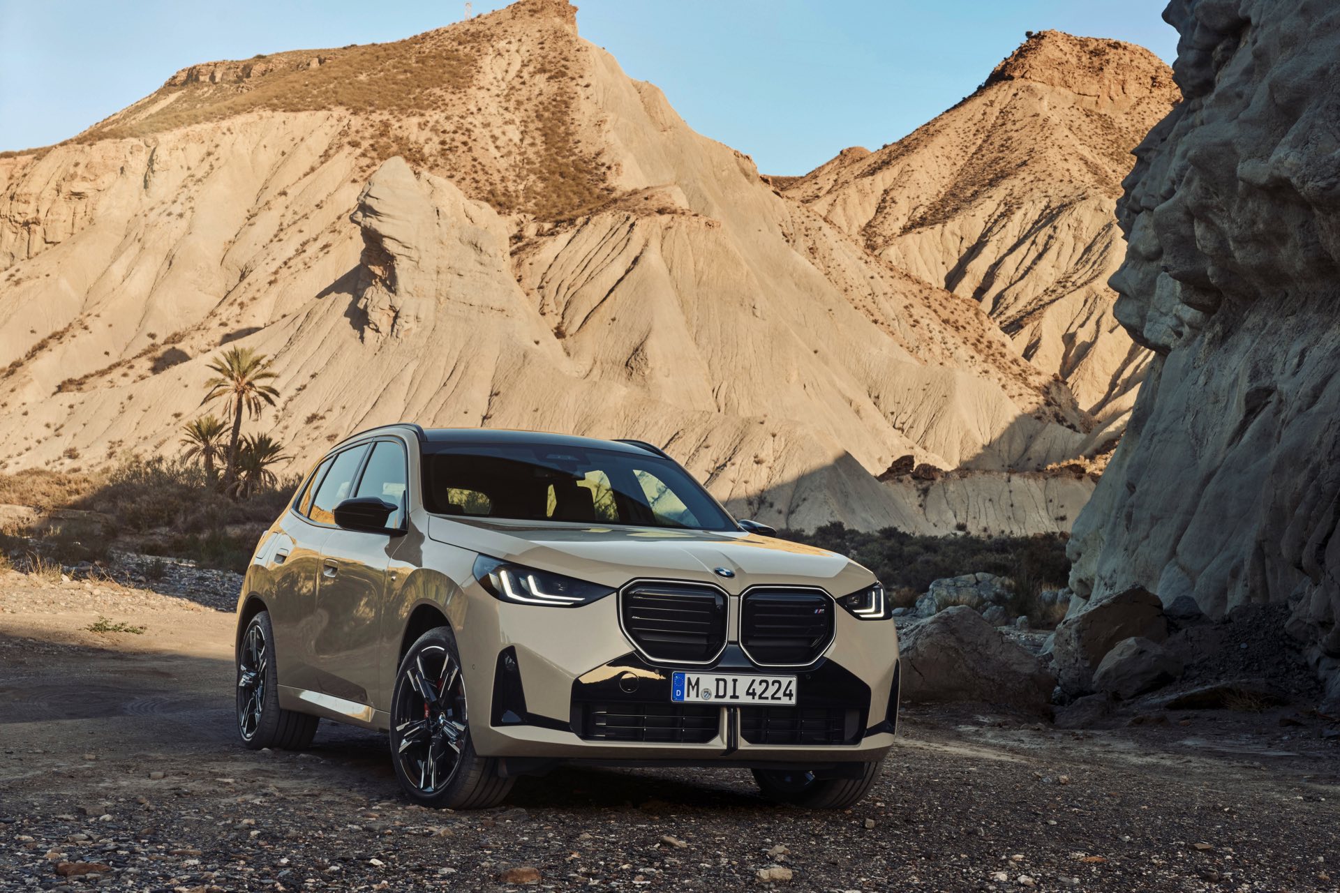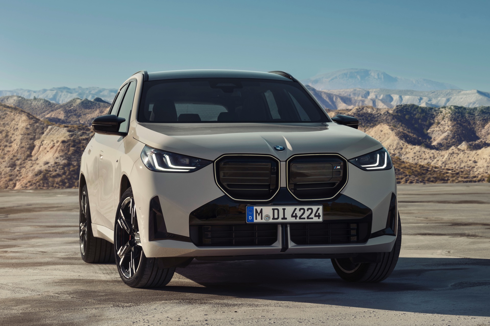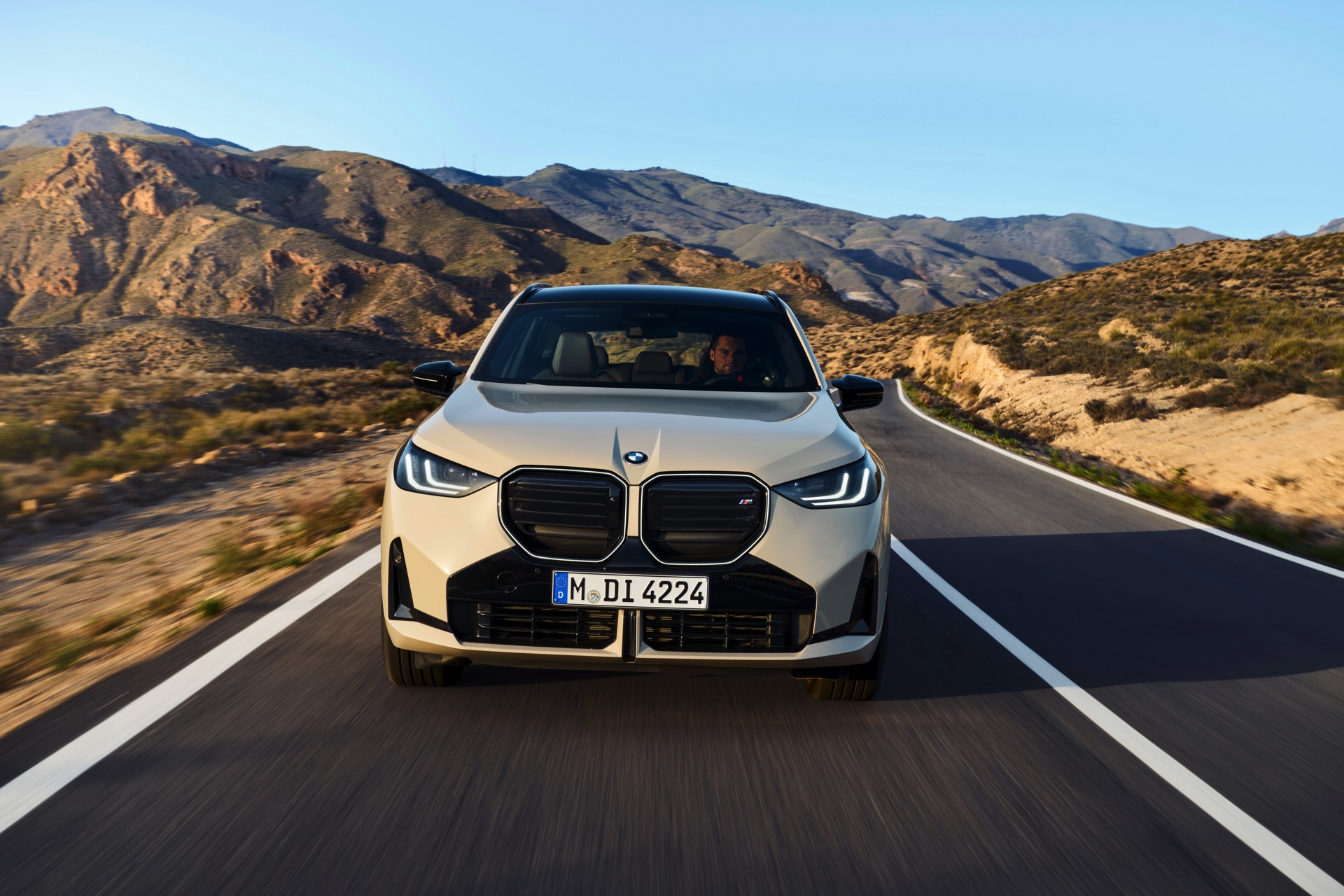 Auf den ersten Fotos sehen wir den neuen BMW X3 M50 in der neuen Farbe Dune Grey Metallic, deren sanfter Gelbton an Sandwüsten und Dünen erinnert. Zur Abgrenzung von den schwächeren Varianten des neuen X3 trägt der M50 eine exklusive Niere mit horizontalen Streben, M Außenspiegel und eine Abgasanlage mit vier Endrohren. In den Radhäusern des X3 M50 kommen serienmäßig 20 Zoll-Felgen zum Einsatz, auf Wunsch stehen auch 21-Zöller zur Wahl.