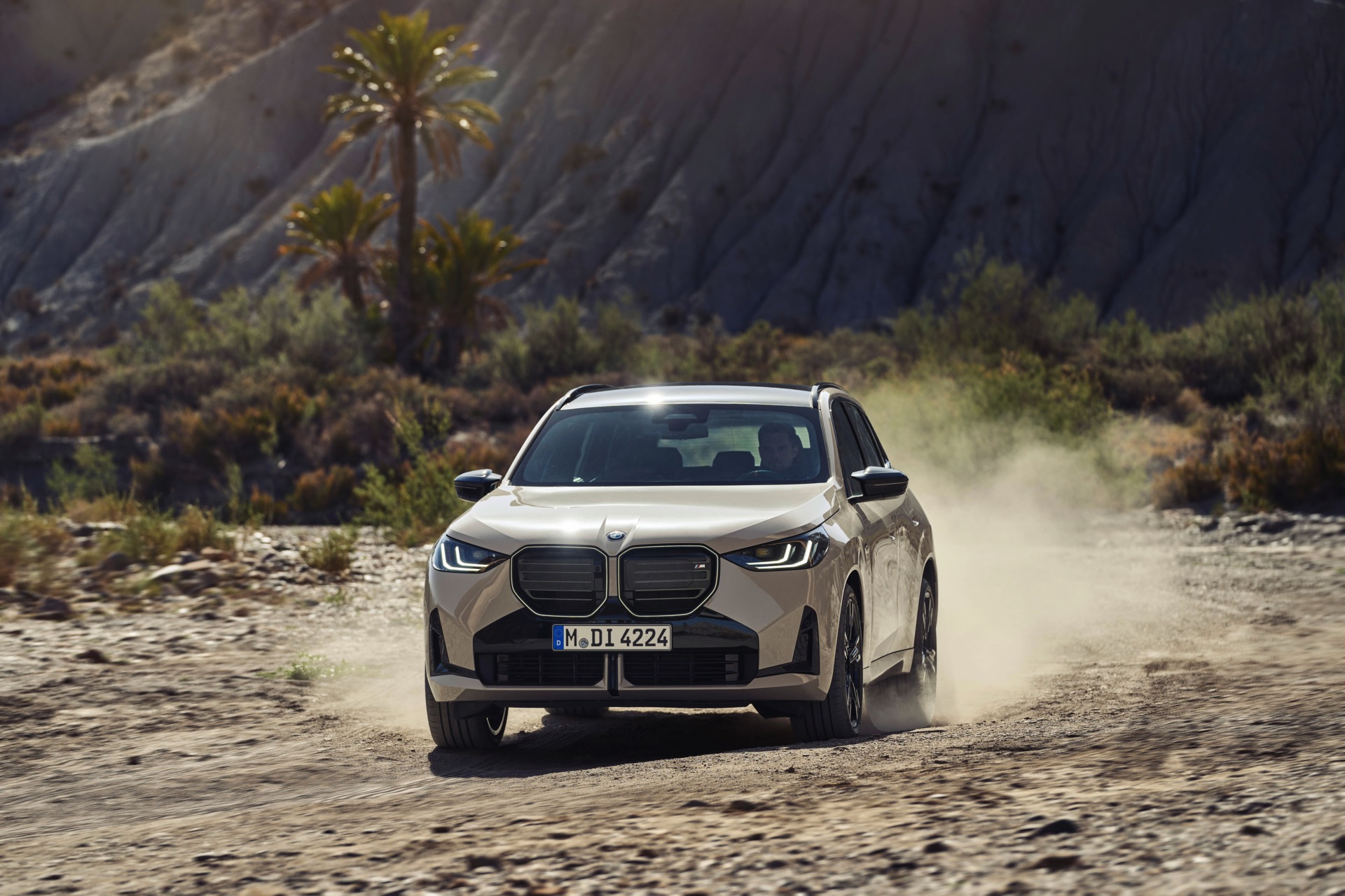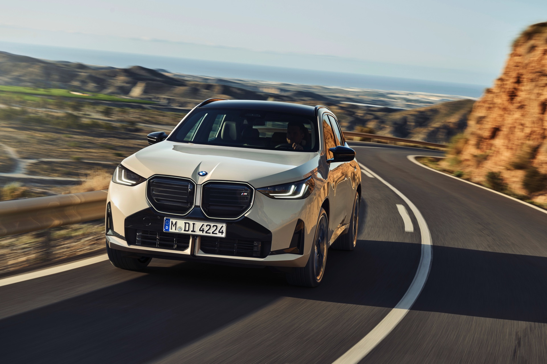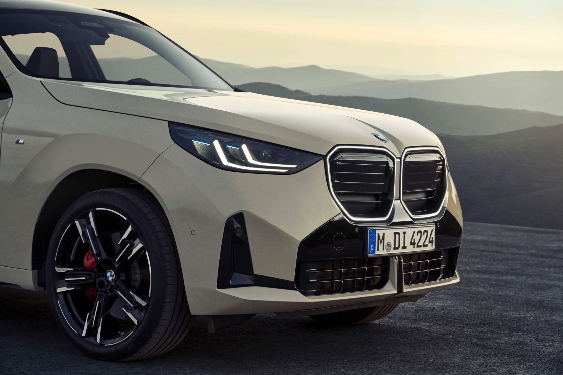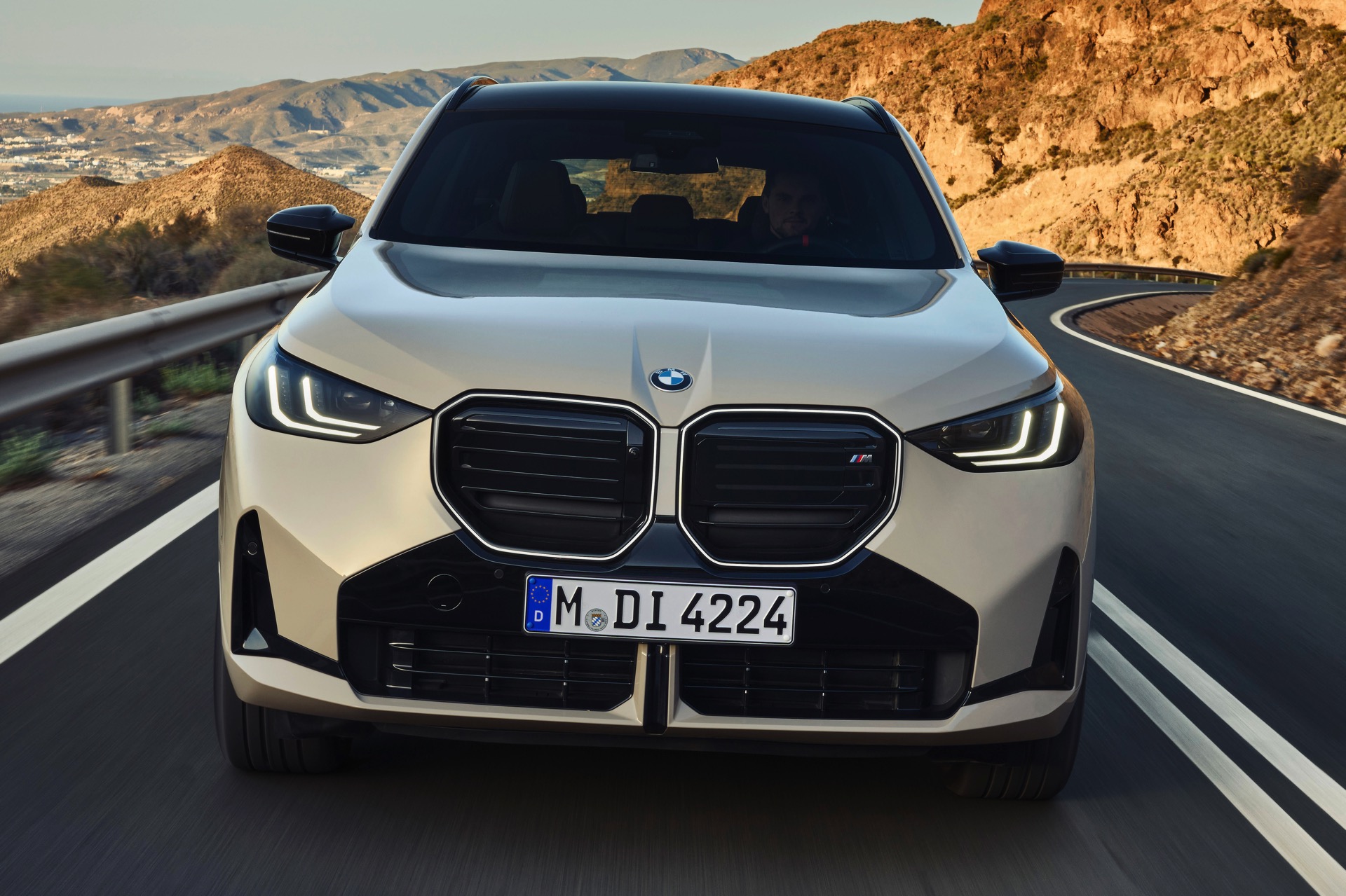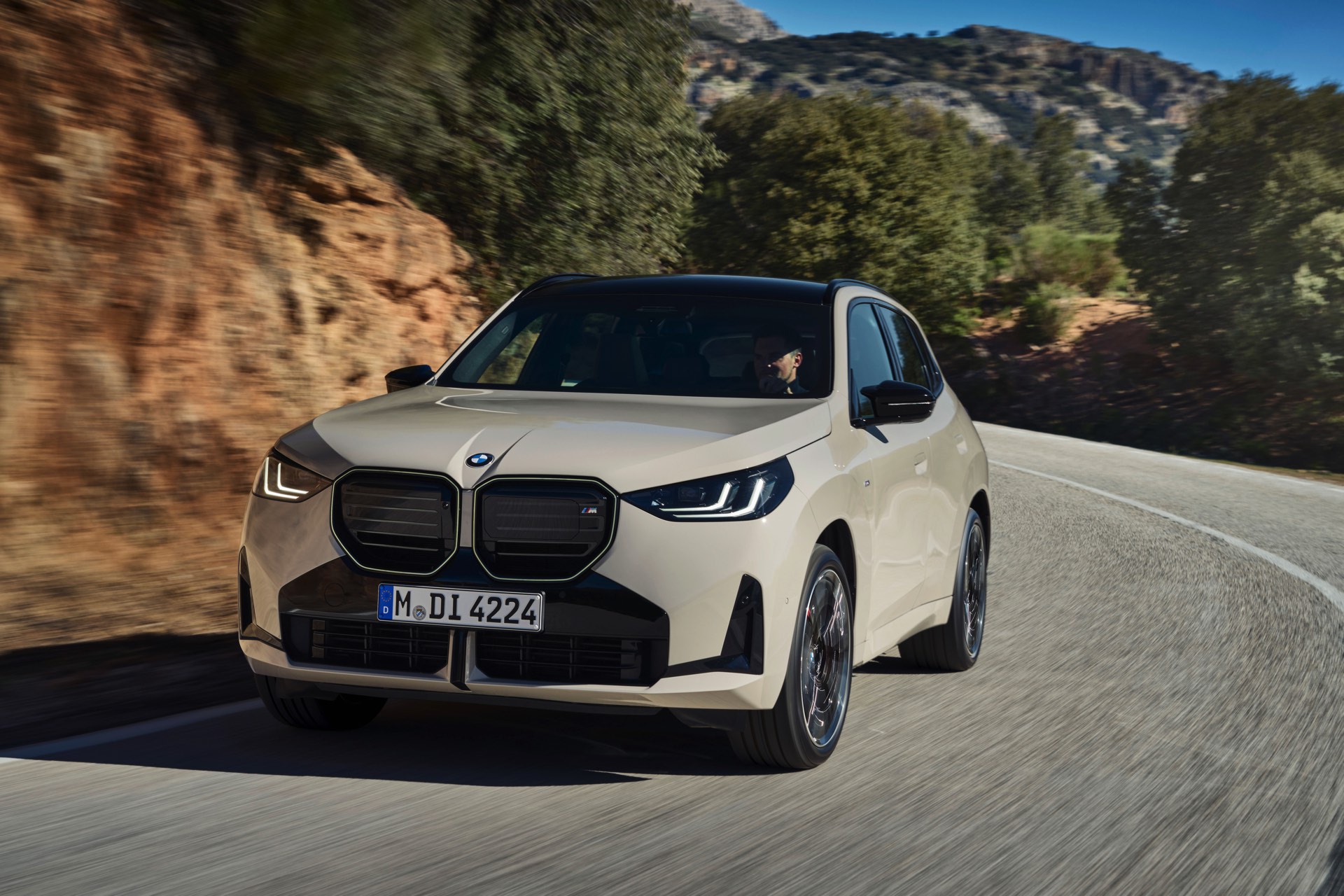 Auf den ersten Fotos sehen wir den neuen BMW X3 M50 in der neuen Farbe Dune Grey Metallic, deren sanfter Gelbton an Sandwüsten und Dünen erinnert. Zur Abgrenzung von den schwächeren Varianten des neuen X3 trägt der M50 eine exklusive Niere mit horizontalen Streben, M Außenspiegel und eine Abgasanlage mit vier Endrohren. In den Radhäusern des X3 M50 kommen serienmäßig 20 Zoll-Felgen zum Einsatz, auf Wunsch stehen auch 21-Zöller zur Wahl.