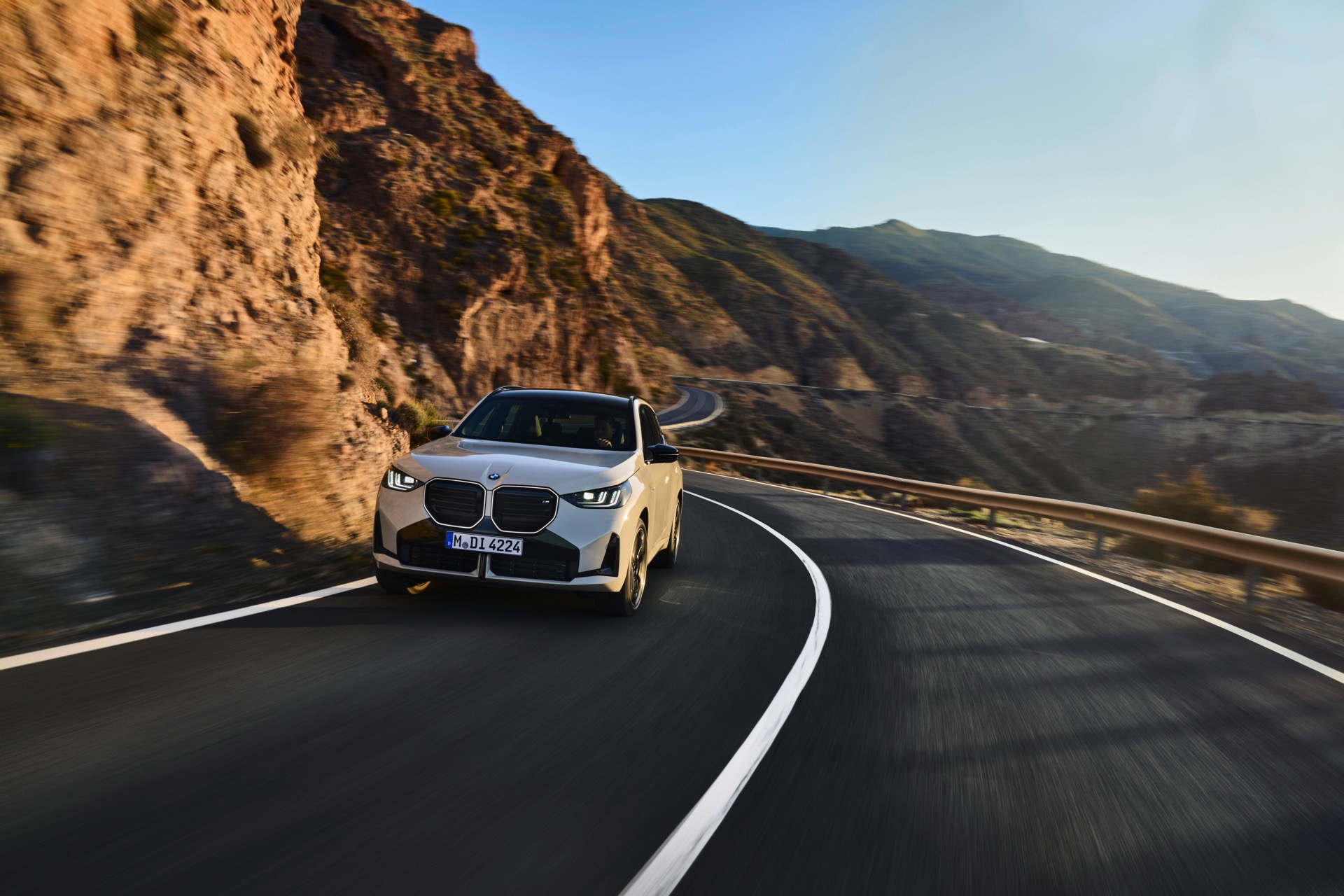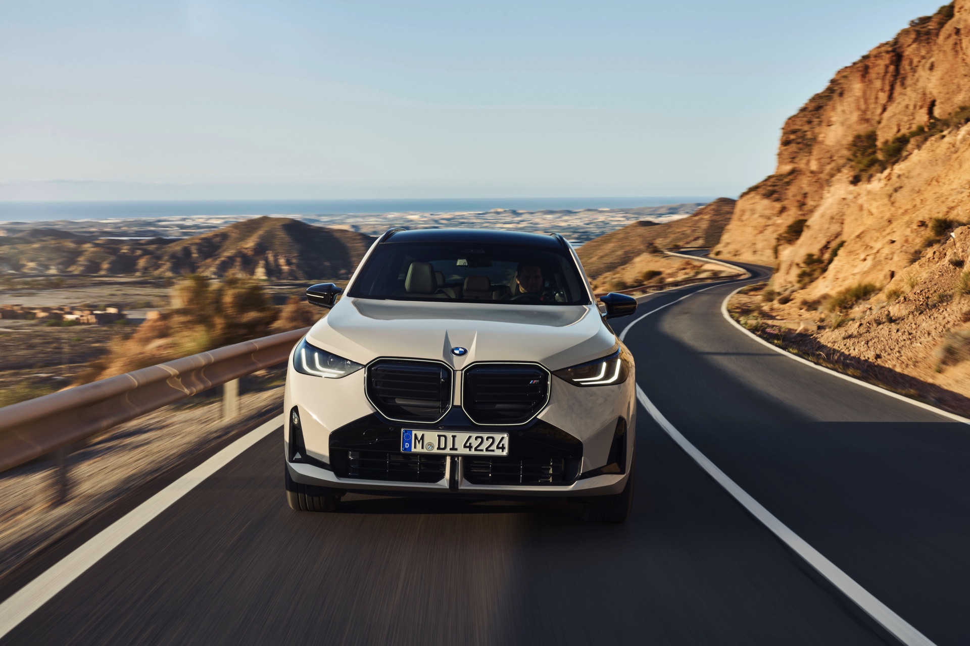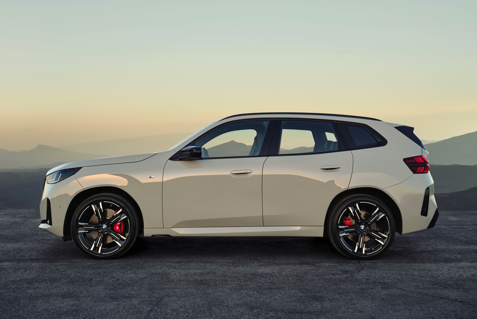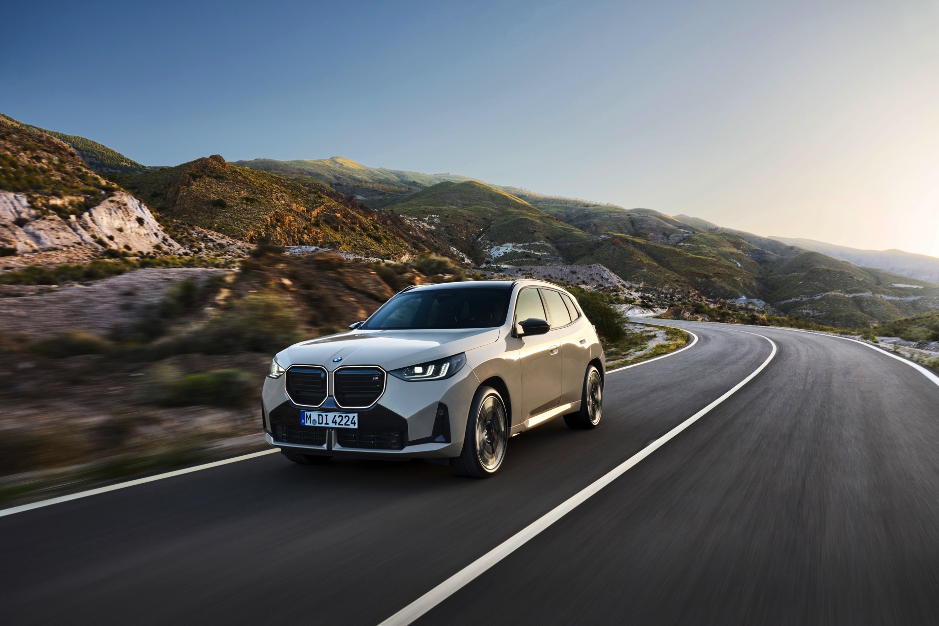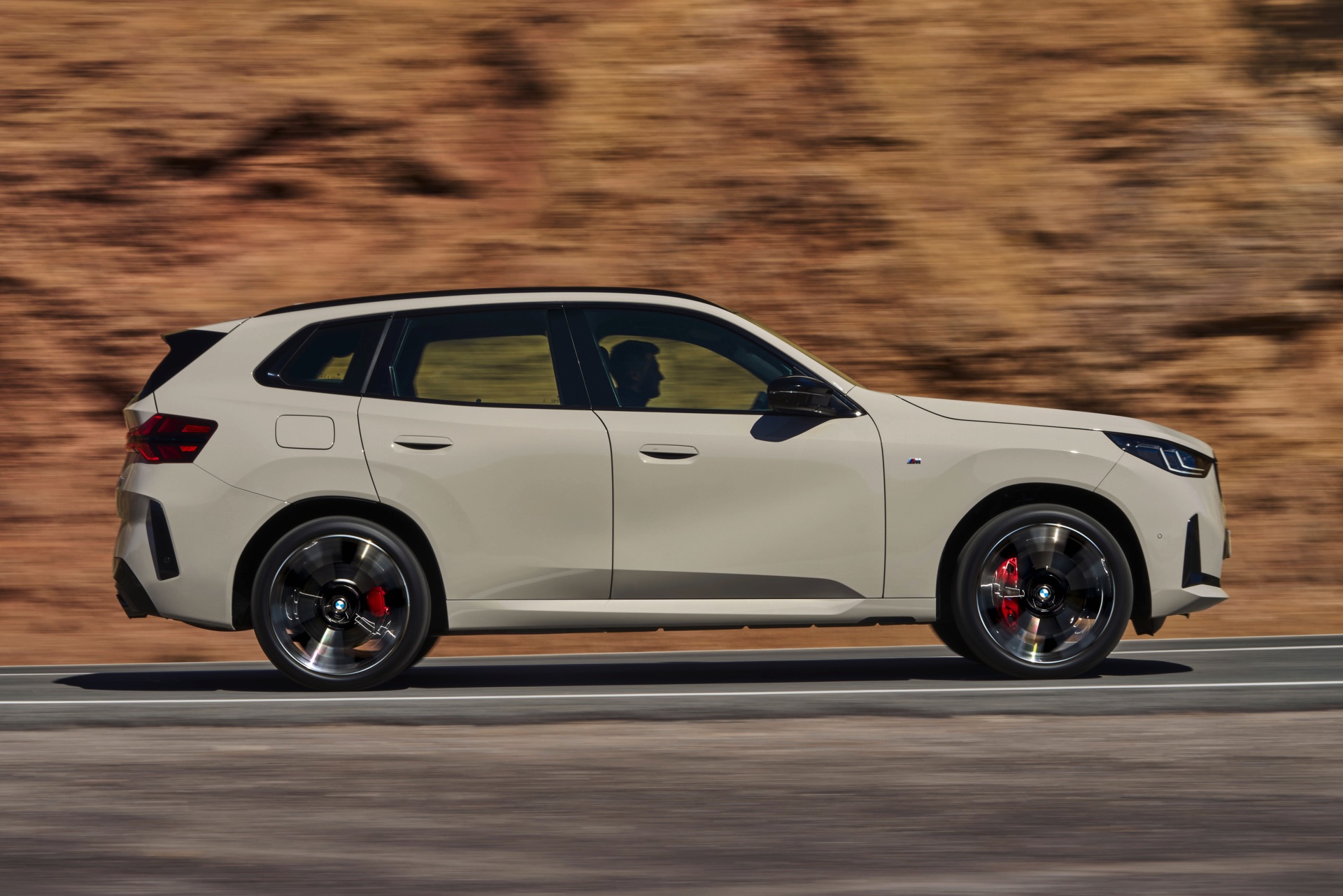 Auf den ersten Fotos sehen wir den neuen BMW X3 M50 in der neuen Farbe Dune Grey Metallic, deren sanfter Gelbton an Sandwüsten und Dünen erinnert. Zur Abgrenzung von den schwächeren Varianten des neuen X3 trägt der M50 eine exklusive Niere mit horizontalen Streben, M Außenspiegel und eine Abgasanlage mit vier Endrohren. In den Radhäusern des X3 M50 kommen serienmäßig 20 Zoll-Felgen zum Einsatz, auf Wunsch stehen auch 21-Zöller zur Wahl.
