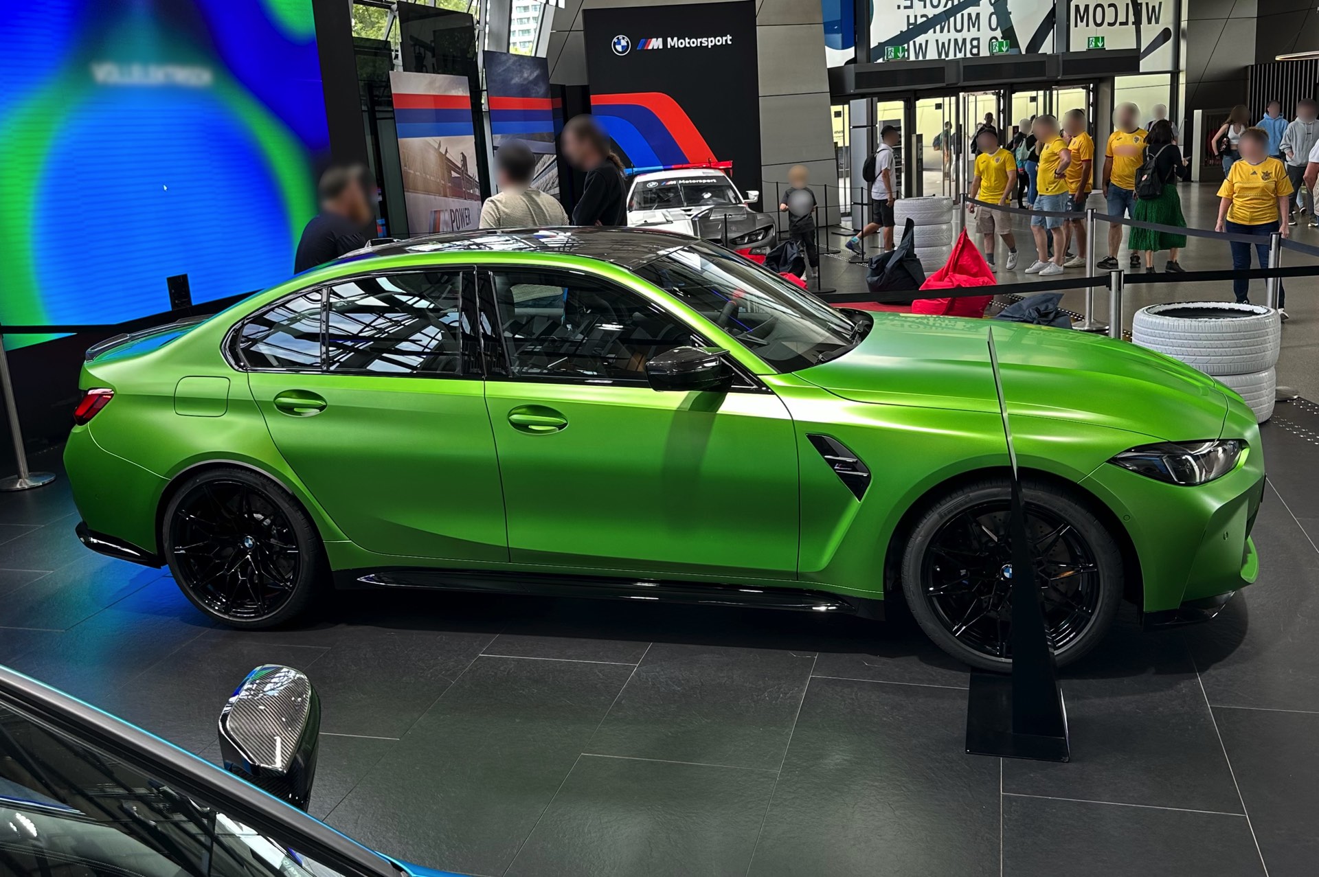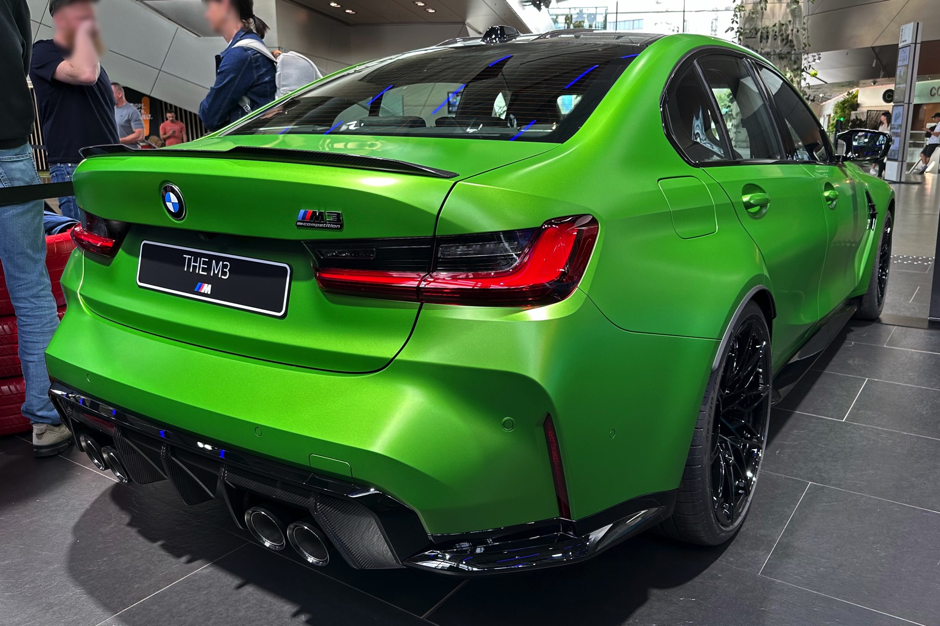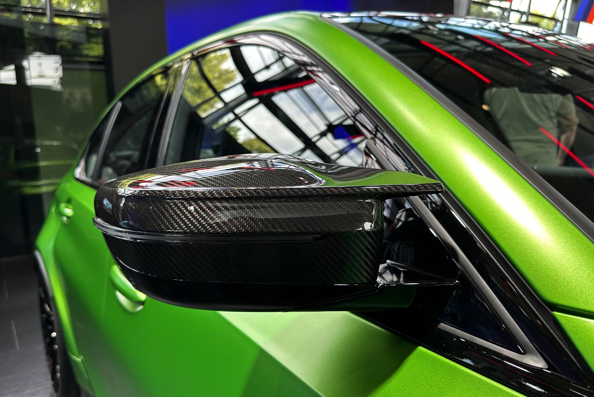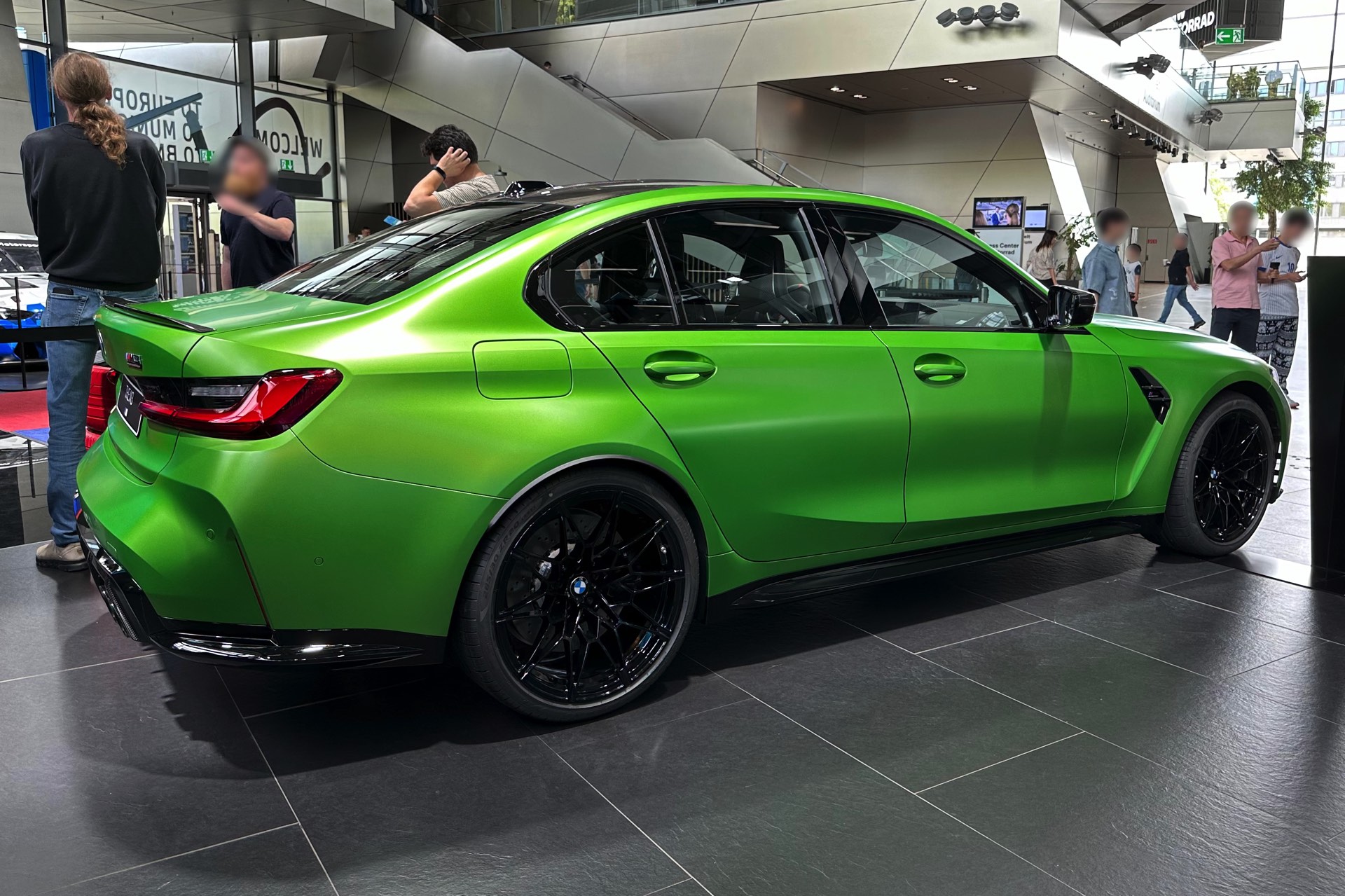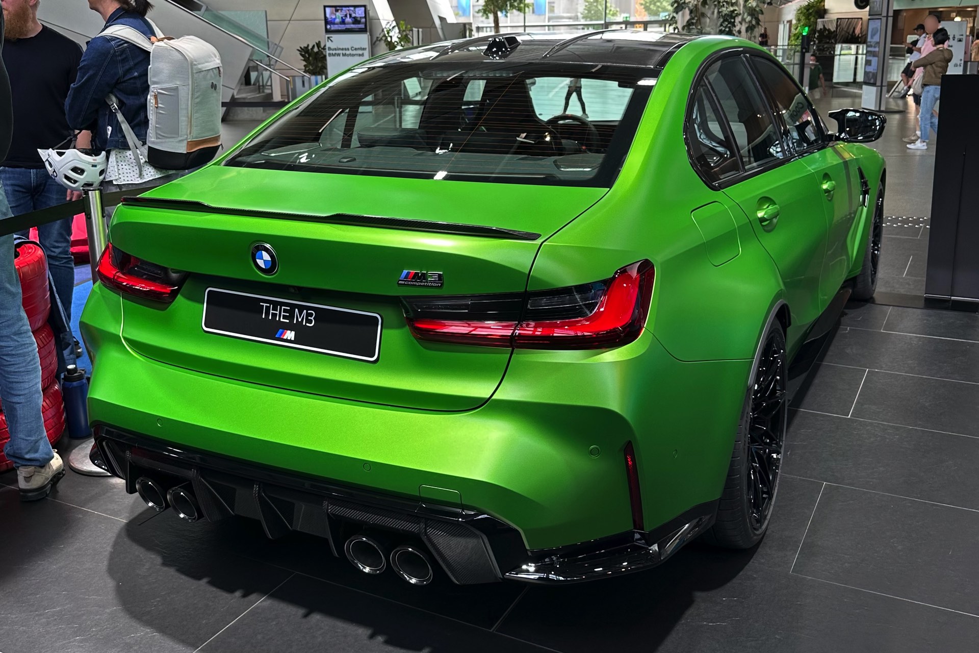 Aktuelle Live-Fotos aus der BMW Welt München zeigen uns den gerade aufgefrischten BMW M3 (G80 LCI) im giftigen Grün und mit einer Konfiguration, die sich auch sonst sehen lassen kann. Für einen scharfen Kontrast zur leuchtenden Individual-Lackierung sorgen dabei zahlreiche dunkle Elemente, die zu großen Teilen aus Sicht-Carbon bestehen: Neben dem serienmäßigen Carbon-Dach zählen hierzu auch die Bestandteile des Carbon-Exterieurpakets, angefangen von den Blenden für die Lufteinlässe unterhalb der Scheinwerfer über die Außenspiegel bis hin zu Heckspoiler-Lippe und Diffusor-Einsatz. Passend dazu sind auch die vorne 19 und hinten 20 Zoll großen Schmiederäder Doppelspeiche 826 M in Schwarz lackiert.