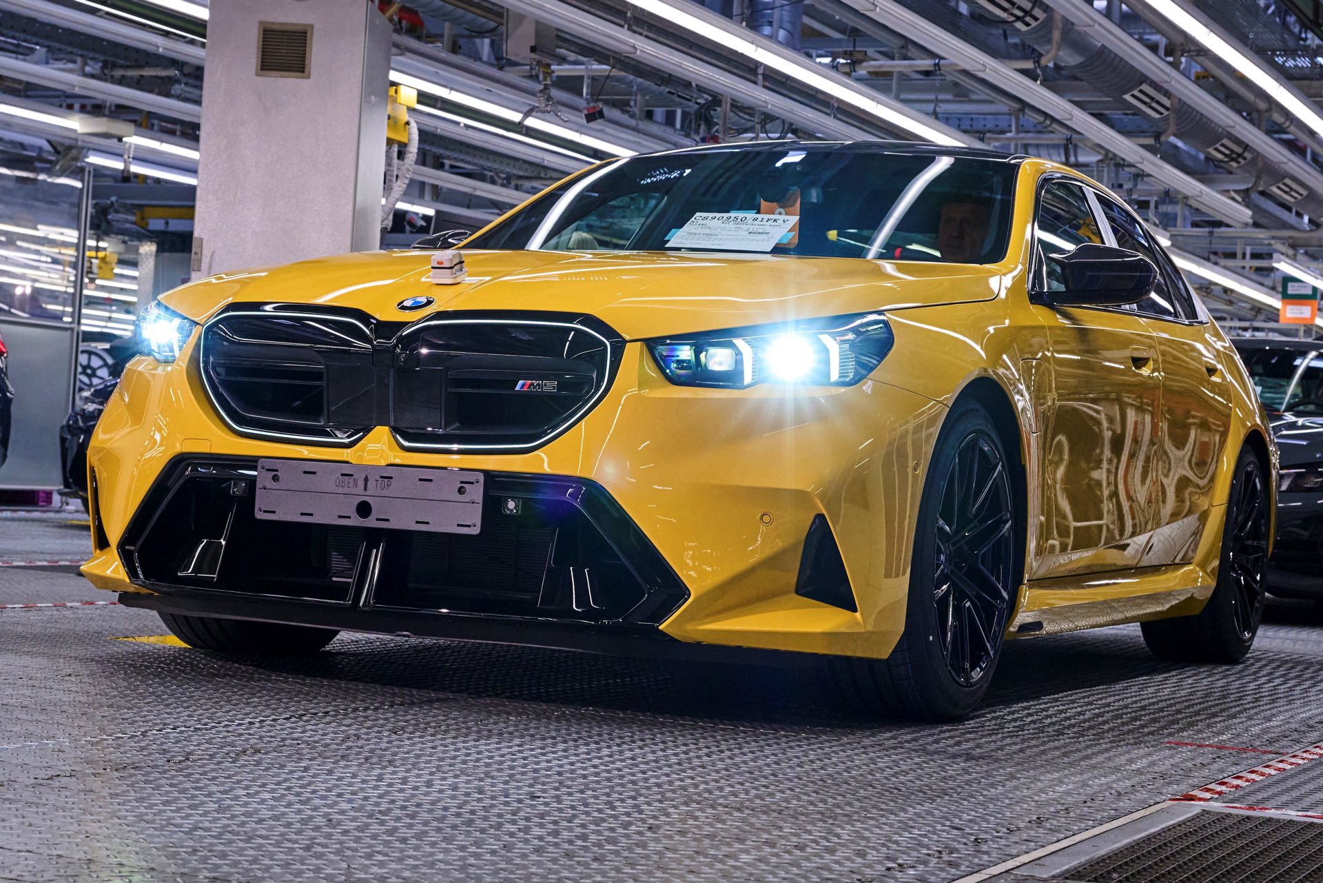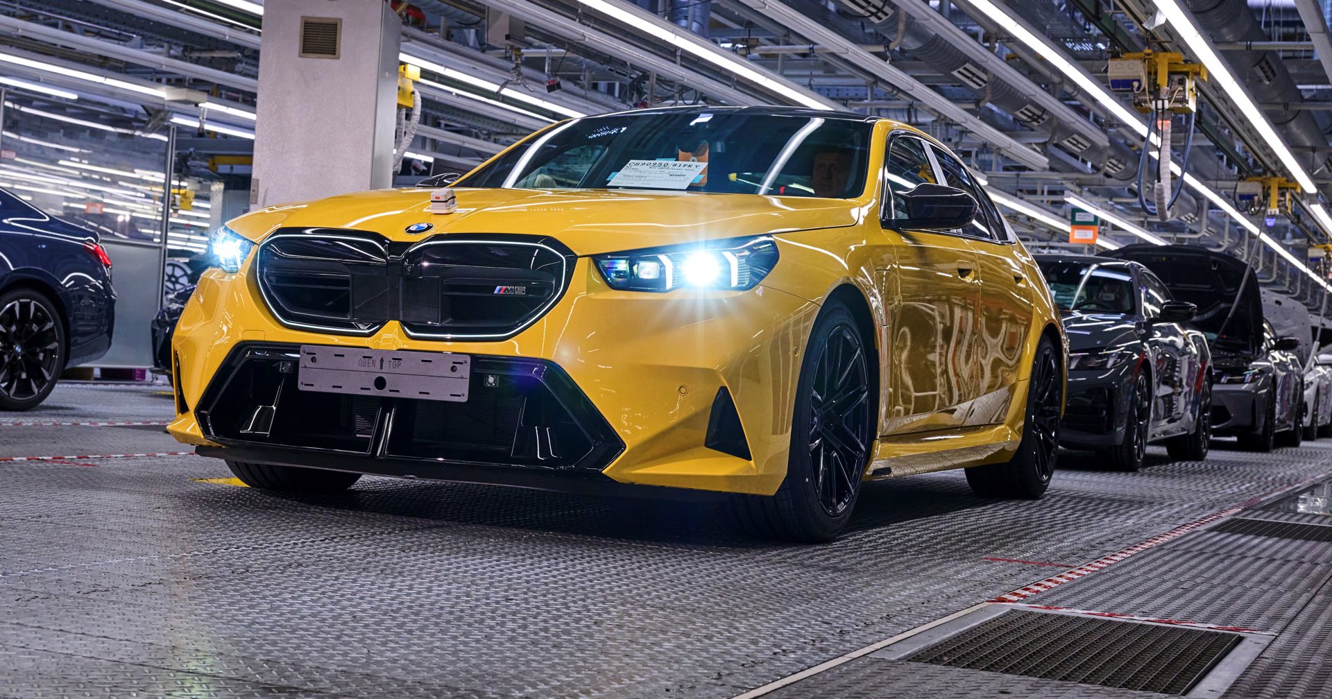Nur wenige Tage nach den ersten Fotos und Infos zum neuen BMW M5 (G90) hat die Produktion der Serien-Fahrzeuge begonnen. Im BMW Werk Dingolfing markiert der 1. Juli den planmäßigen Startpunkt für den neuen Power-Hybrid aus Garching, der mit Unterstützung von BMW Individual von Anfang an auch mit Sonderwunsch-Lackierungen bestellt werden kann. Gleich auf den ersten Fotos sehen wir ein farbenfrohes Beispiel dafür, denn einer der ersten G90 glänzt im auffälligen Speed Gelb uni, das über den Individual-Farbcode U96 zur Wahl steht. Insgesamt können sich die Kunden des neuen zwischen rund 150 Farben entscheiden, sodass wirklich jeder eine zu seinem Geschmack passende Variante finden sollte.
