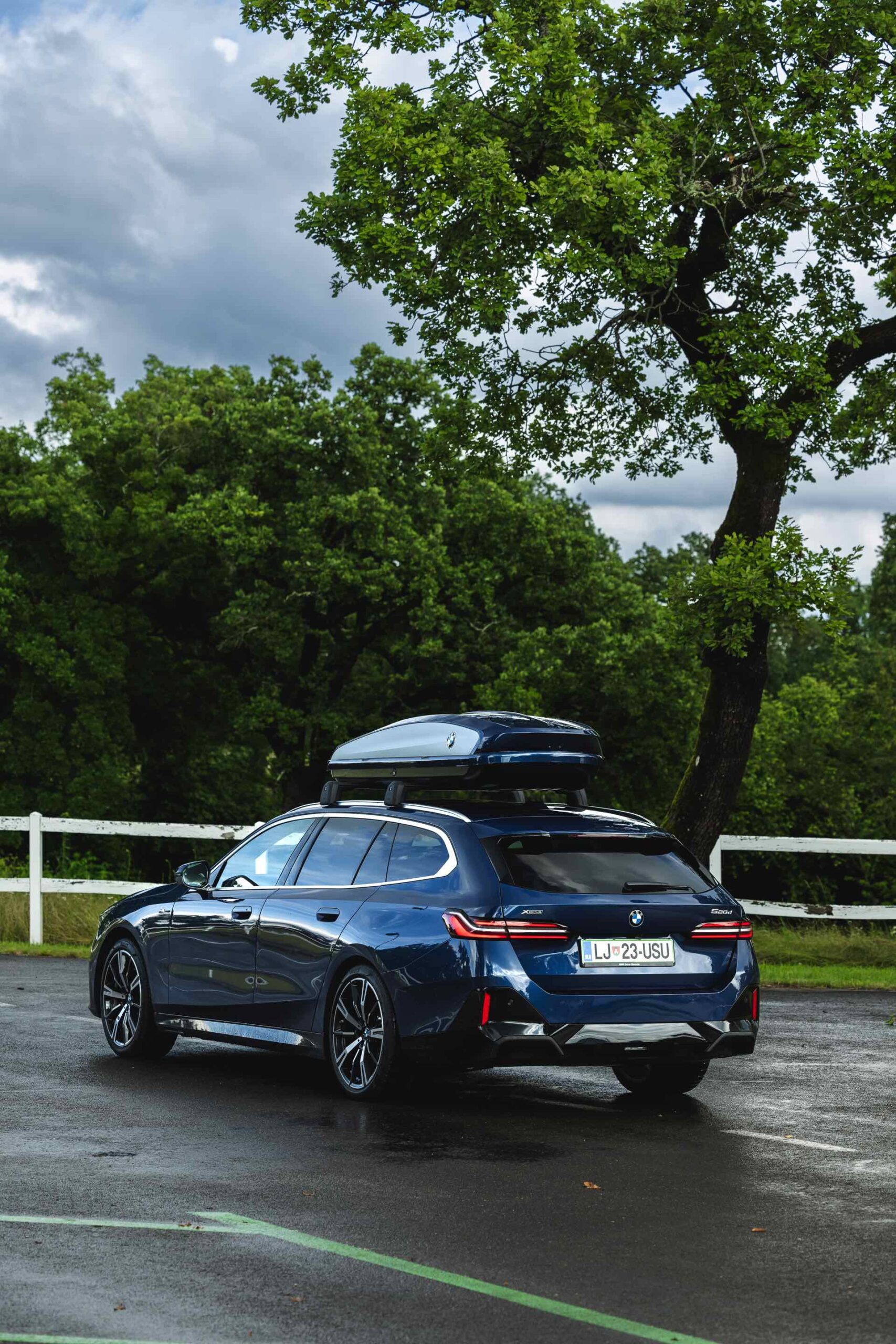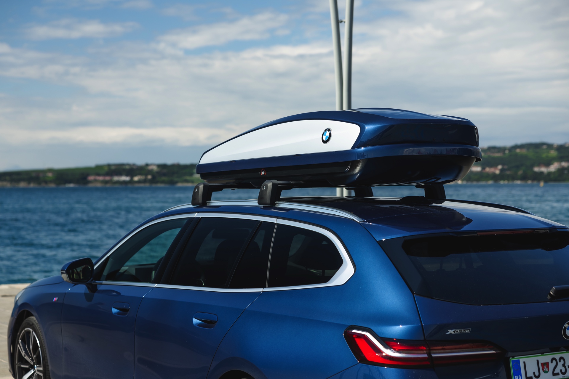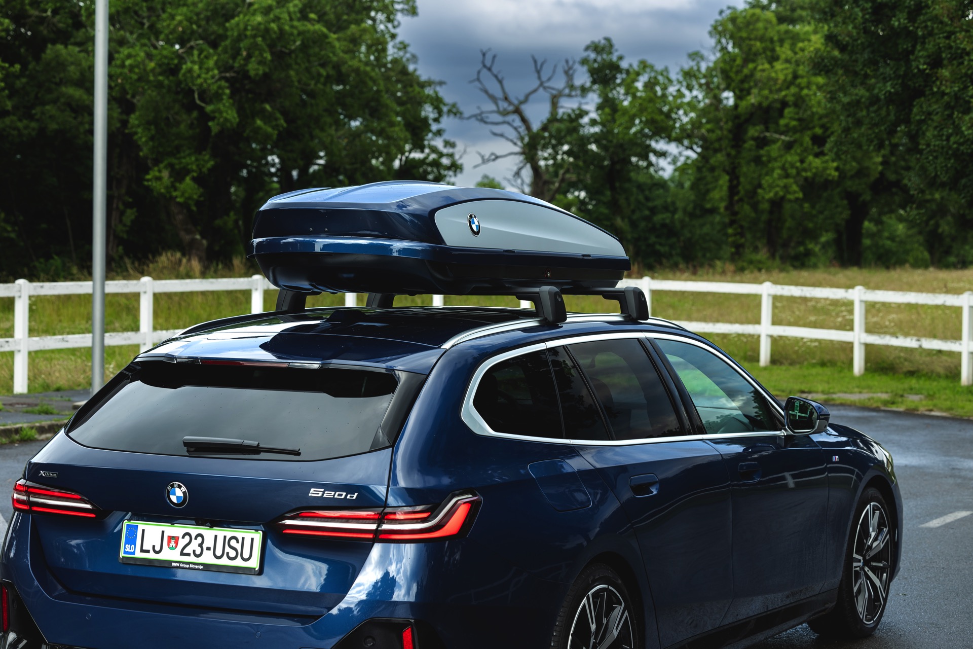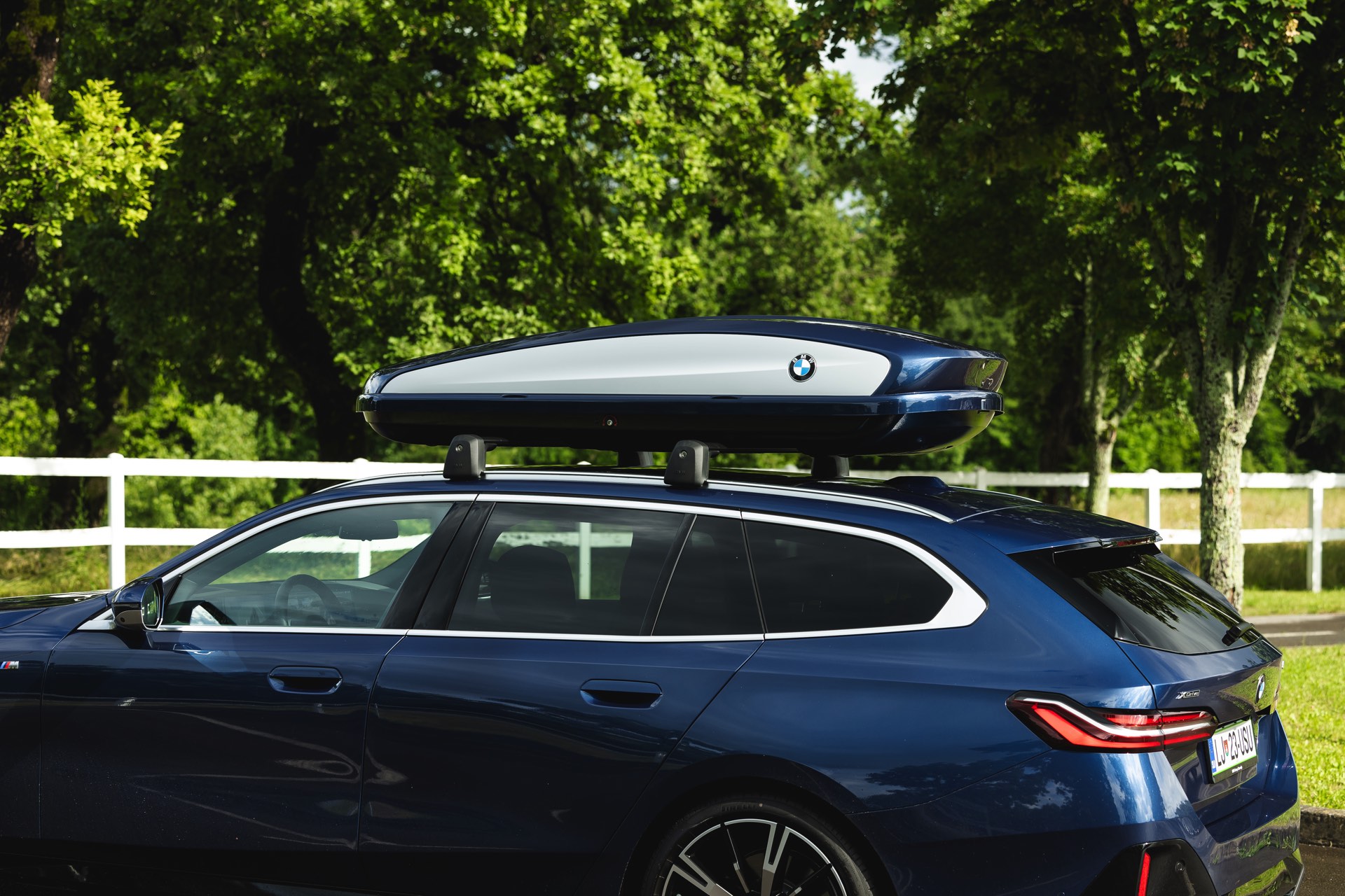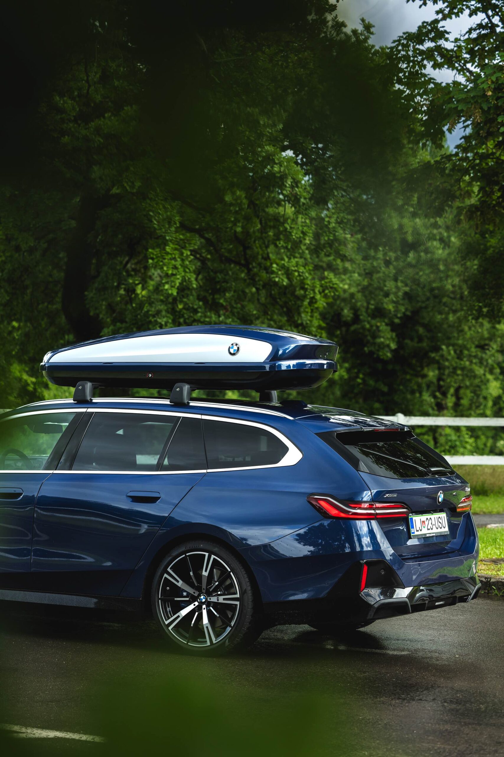 Genau diese Konfiguration sehen wir nun in einem neuen Foto-Set aus Slowenien, denn im Fokus steht der neue BMW 520d Touring mit M Sportpaket, Lackierung in Phytonic Blau und der BMW Dachbox 520, die mit einer Bicolor-Lackierung in Silber und Phytonic Blau glänzt. In der äußerlich 2,35 Meter langen, 94 Zentimeter breiten und 41 Zentimeter hohen Dachbox lassen sich bis zu 8 Paar Ski mit einer Länge von bis zu 220 Zentimetern, aber natürlich auch unzählige andere Dinge unterbringen.