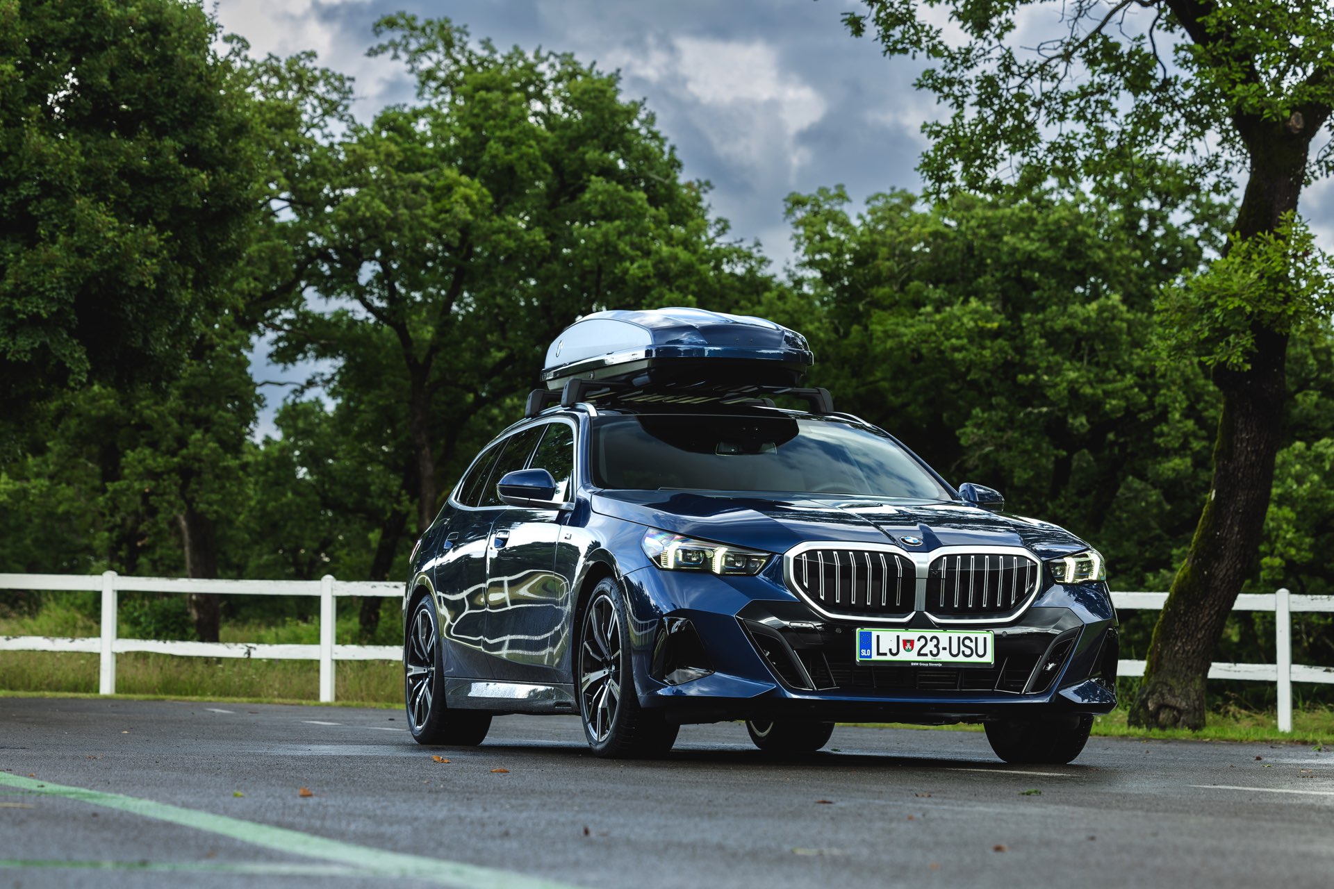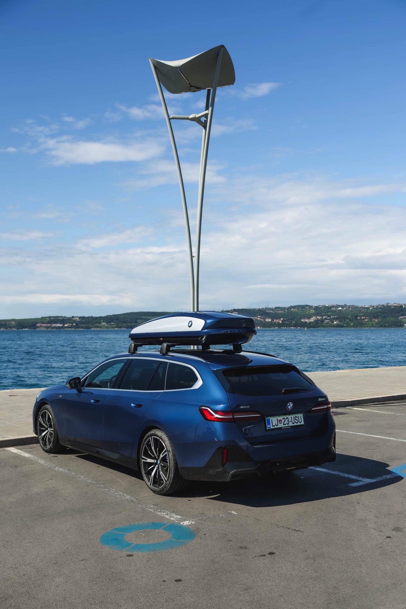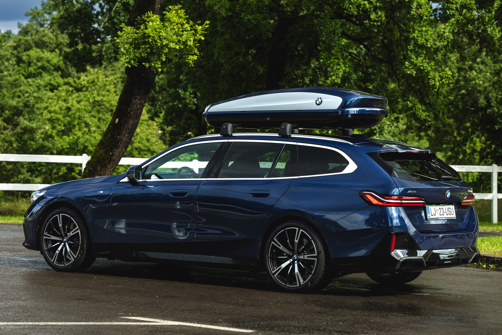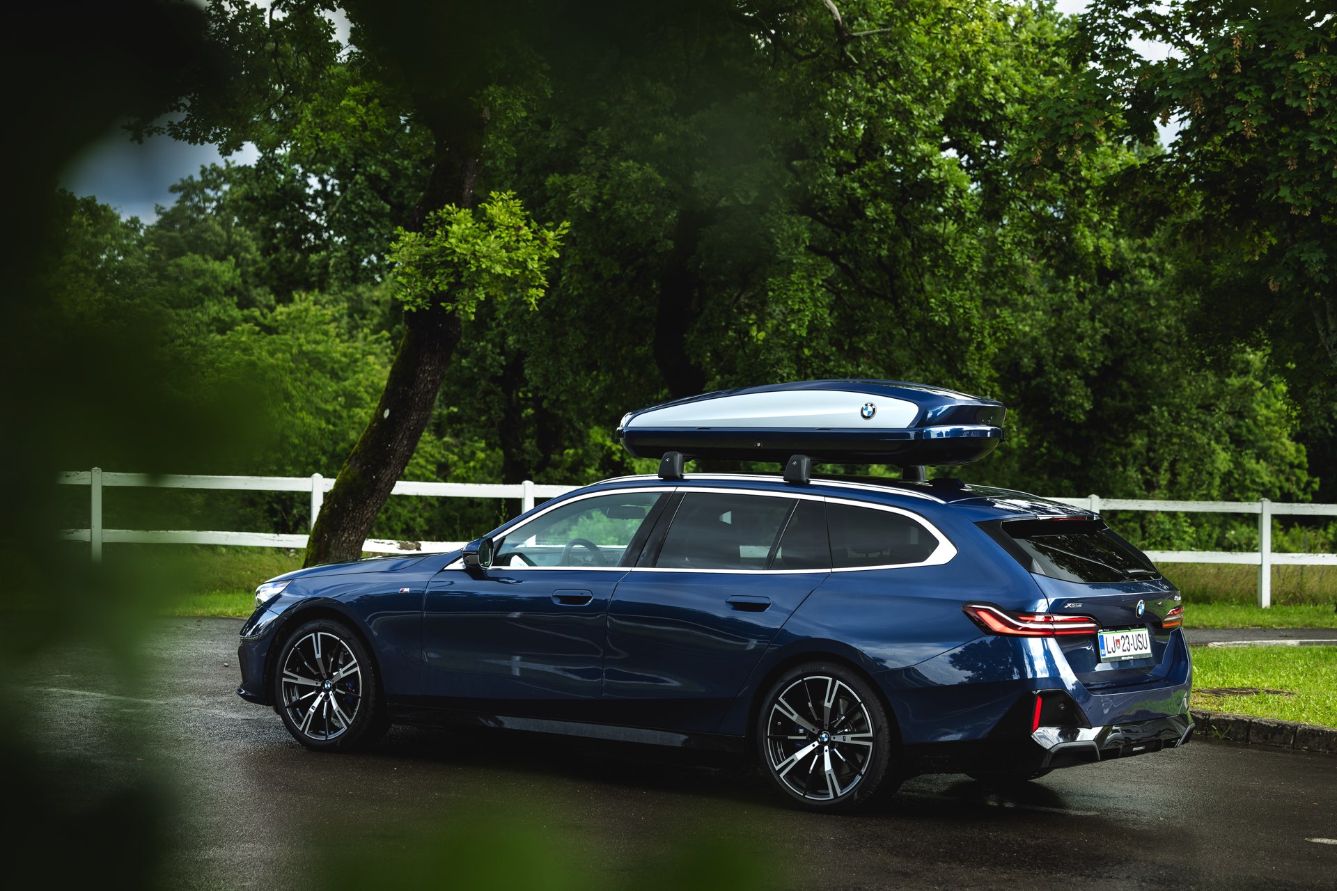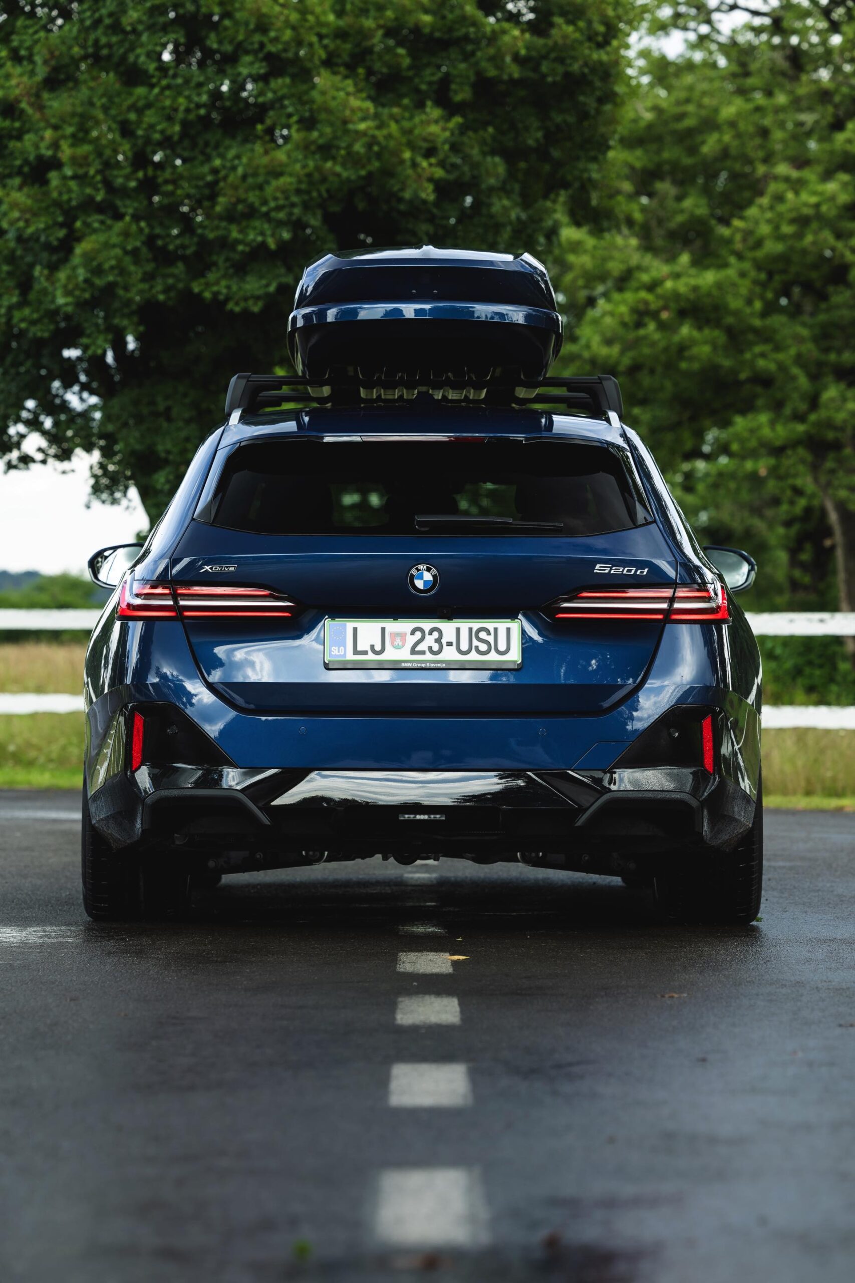 Genau diese Konfiguration sehen wir nun in einem neuen Foto-Set aus Slowenien, denn im Fokus steht der neue BMW 520d Touring mit M Sportpaket, Lackierung in Phytonic Blau und der BMW Dachbox 520, die mit einer Bicolor-Lackierung in Silber und Phytonic Blau glänzt. In der äußerlich 2,35 Meter langen, 94 Zentimeter breiten und 41 Zentimeter hohen Dachbox lassen sich bis zu 8 Paar Ski mit einer Länge von bis zu 220 Zentimetern, aber natürlich auch unzählige andere Dinge unterbringen.