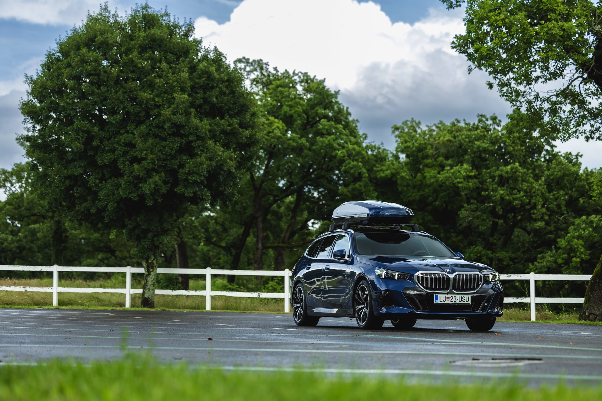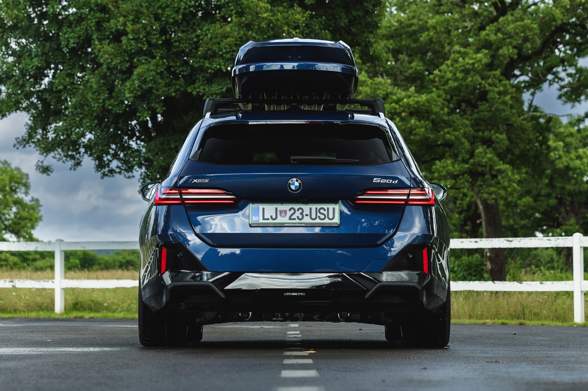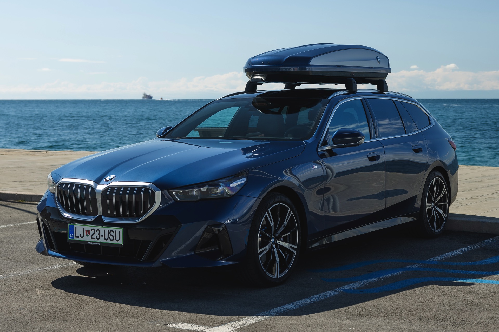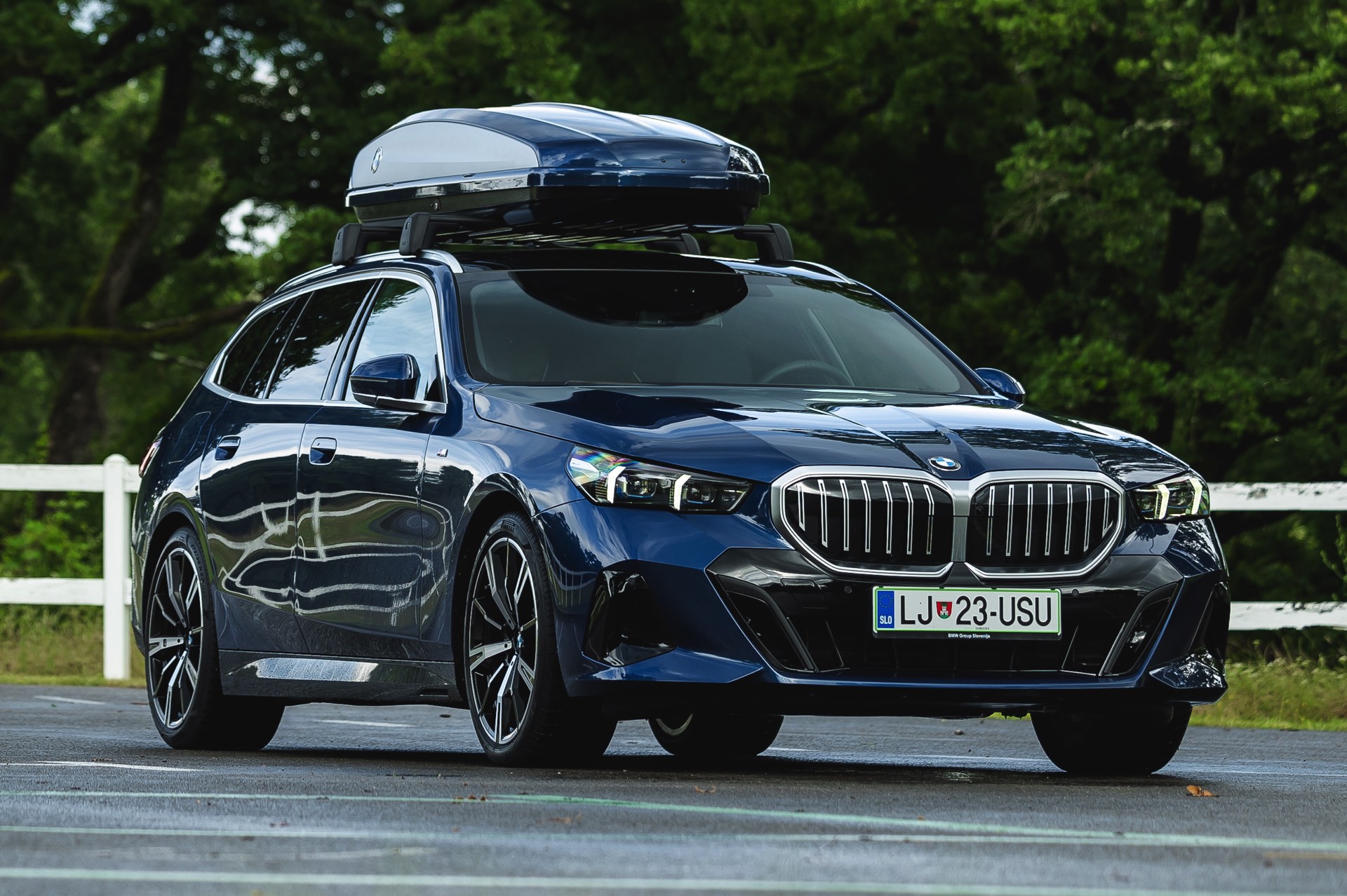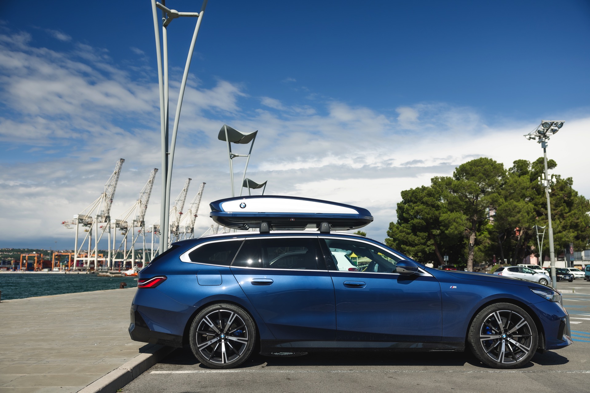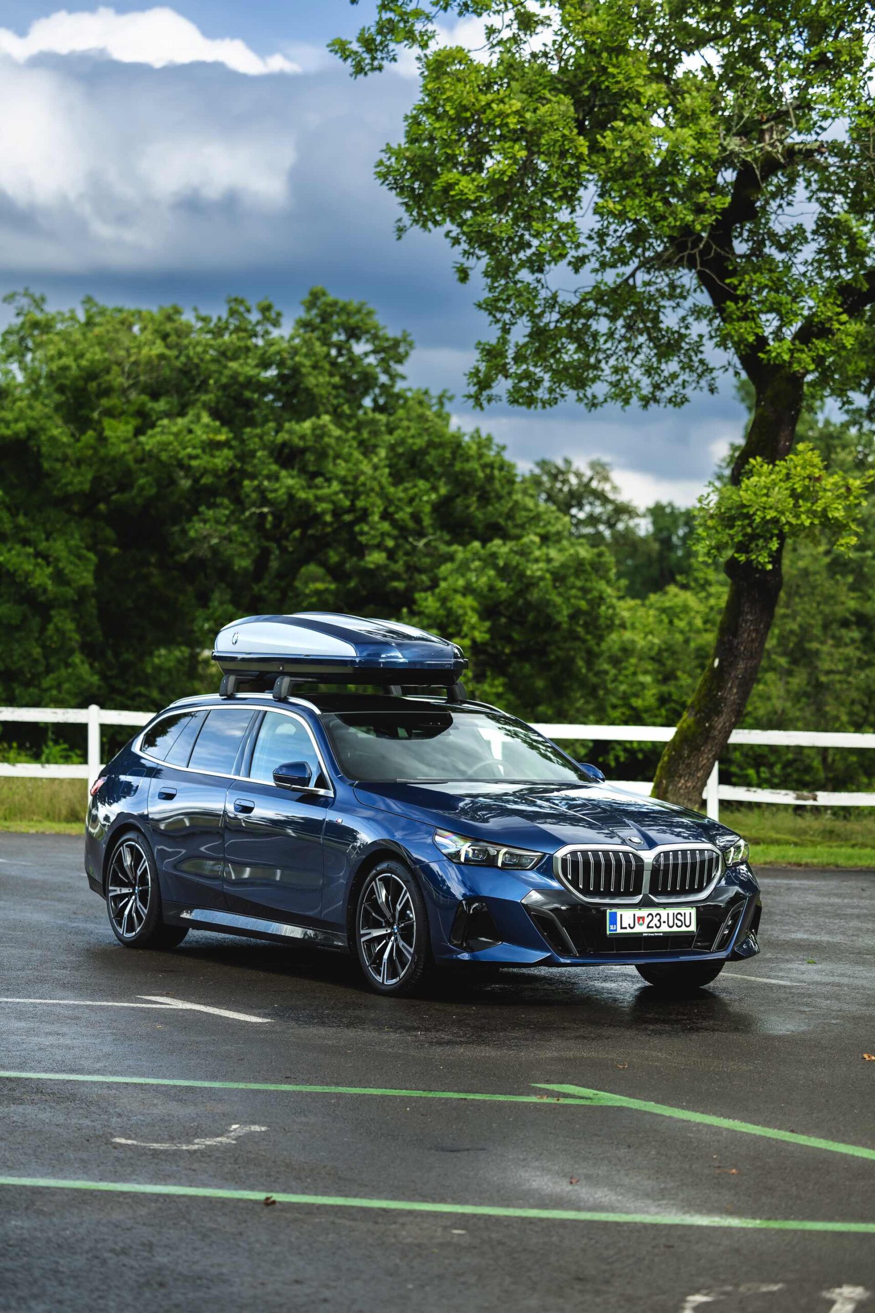 Genau diese Konfiguration sehen wir nun in einem neuen Foto-Set aus Slowenien, denn im Fokus steht der neue BMW 520d Touring mit M Sportpaket, Lackierung in Phytonic Blau und der BMW Dachbox 520, die mit einer Bicolor-Lackierung in Silber und Phytonic Blau glänzt. In der äußerlich 2,35 Meter langen, 94 Zentimeter breiten und 41 Zentimeter hohen Dachbox lassen sich bis zu 8 Paar Ski mit einer Länge von bis zu 220 Zentimetern, aber natürlich auch unzählige andere Dinge unterbringen.