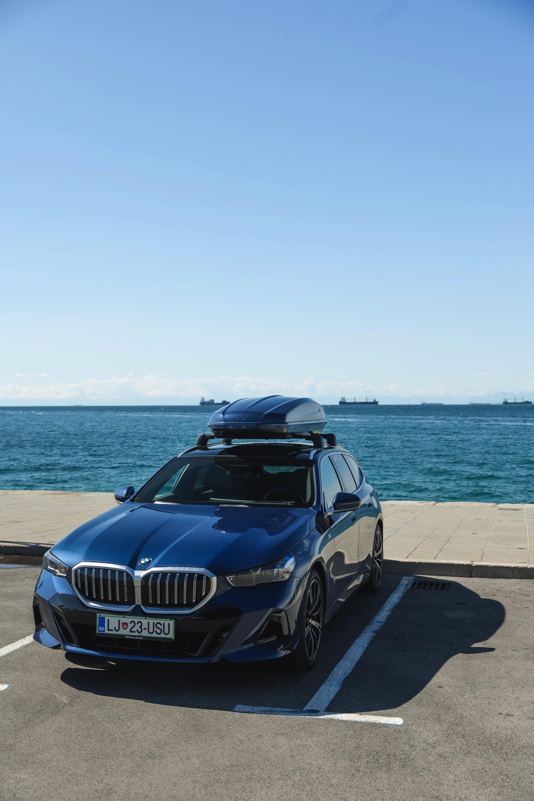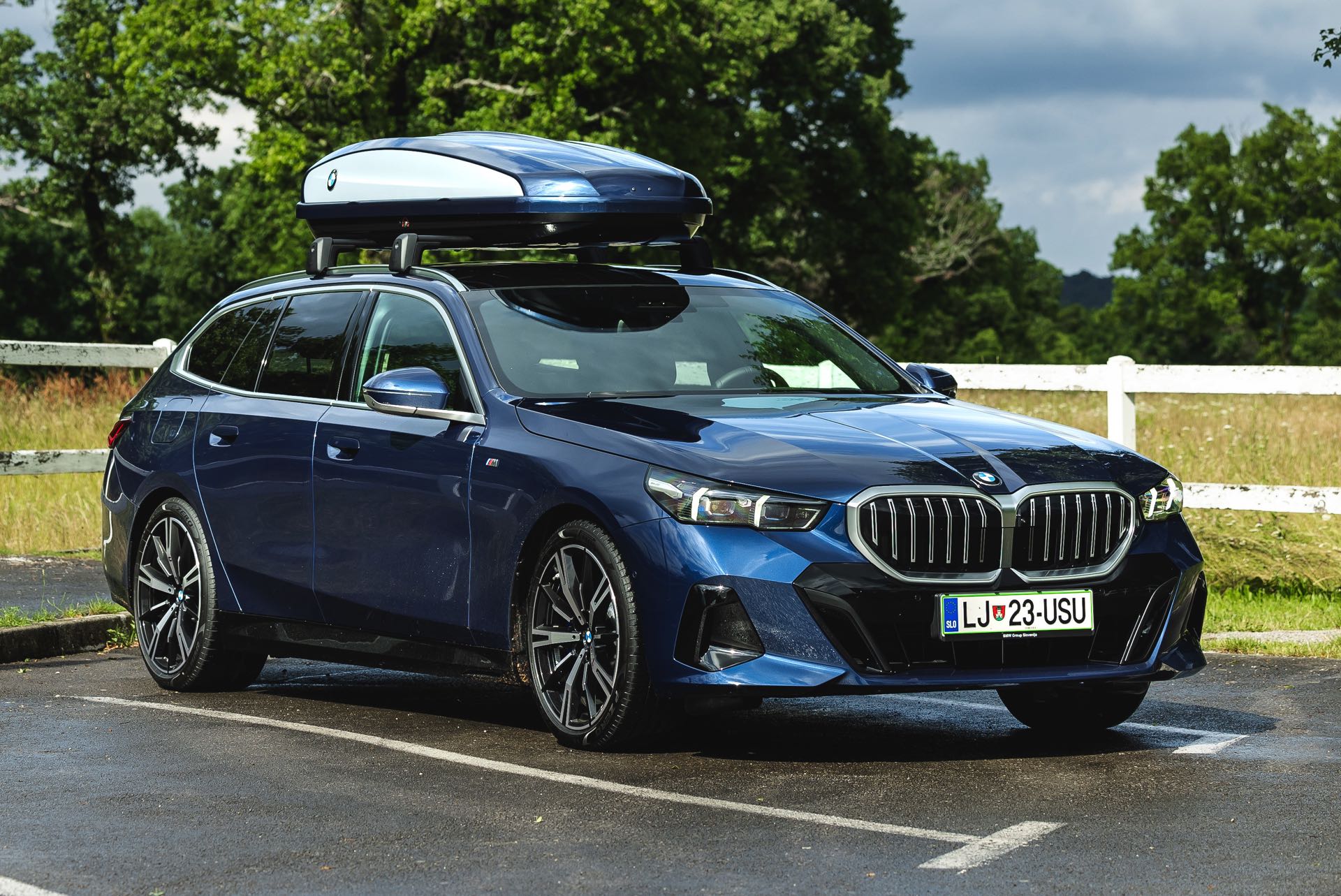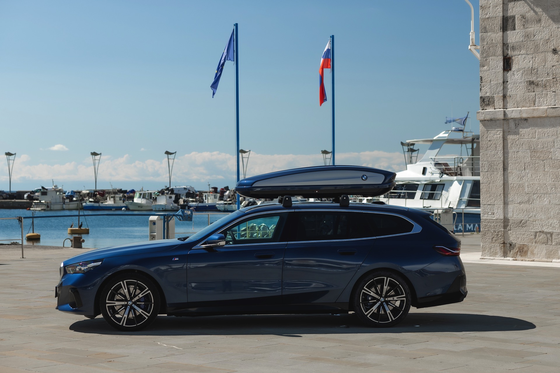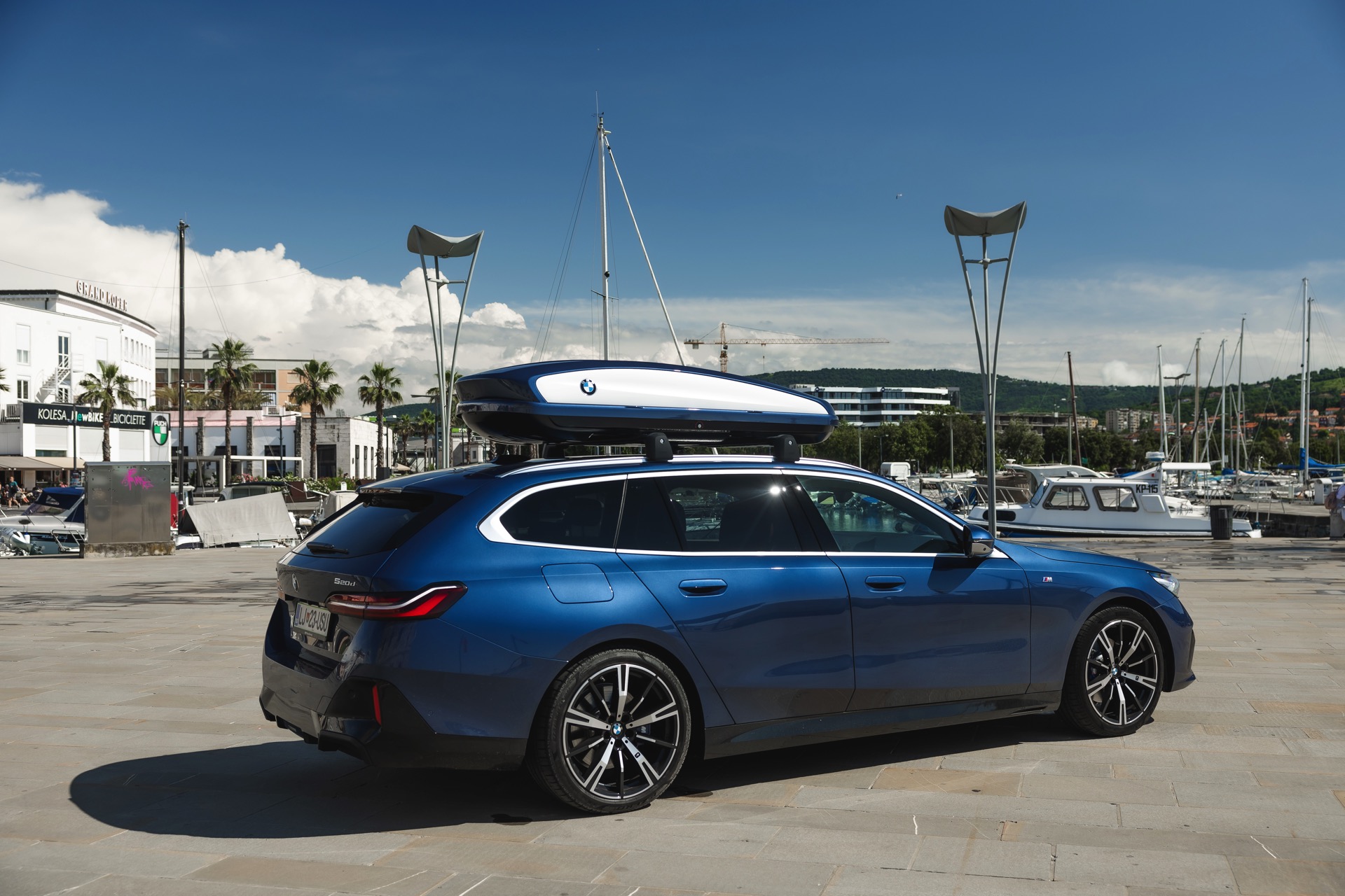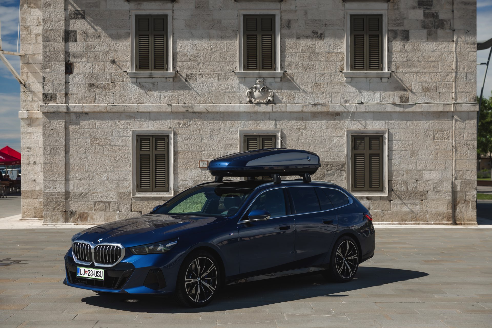 Genau diese Konfiguration sehen wir nun in einem neuen Foto-Set aus Slowenien, denn im Fokus steht der neue BMW 520d Touring mit M Sportpaket, Lackierung in Phytonic Blau und der BMW Dachbox 520, die mit einer Bicolor-Lackierung in Silber und Phytonic Blau glänzt. In der äußerlich 2,35 Meter langen, 94 Zentimeter breiten und 41 Zentimeter hohen Dachbox lassen sich bis zu 8 Paar Ski mit einer Länge von bis zu 220 Zentimetern, aber natürlich auch unzählige andere Dinge unterbringen.