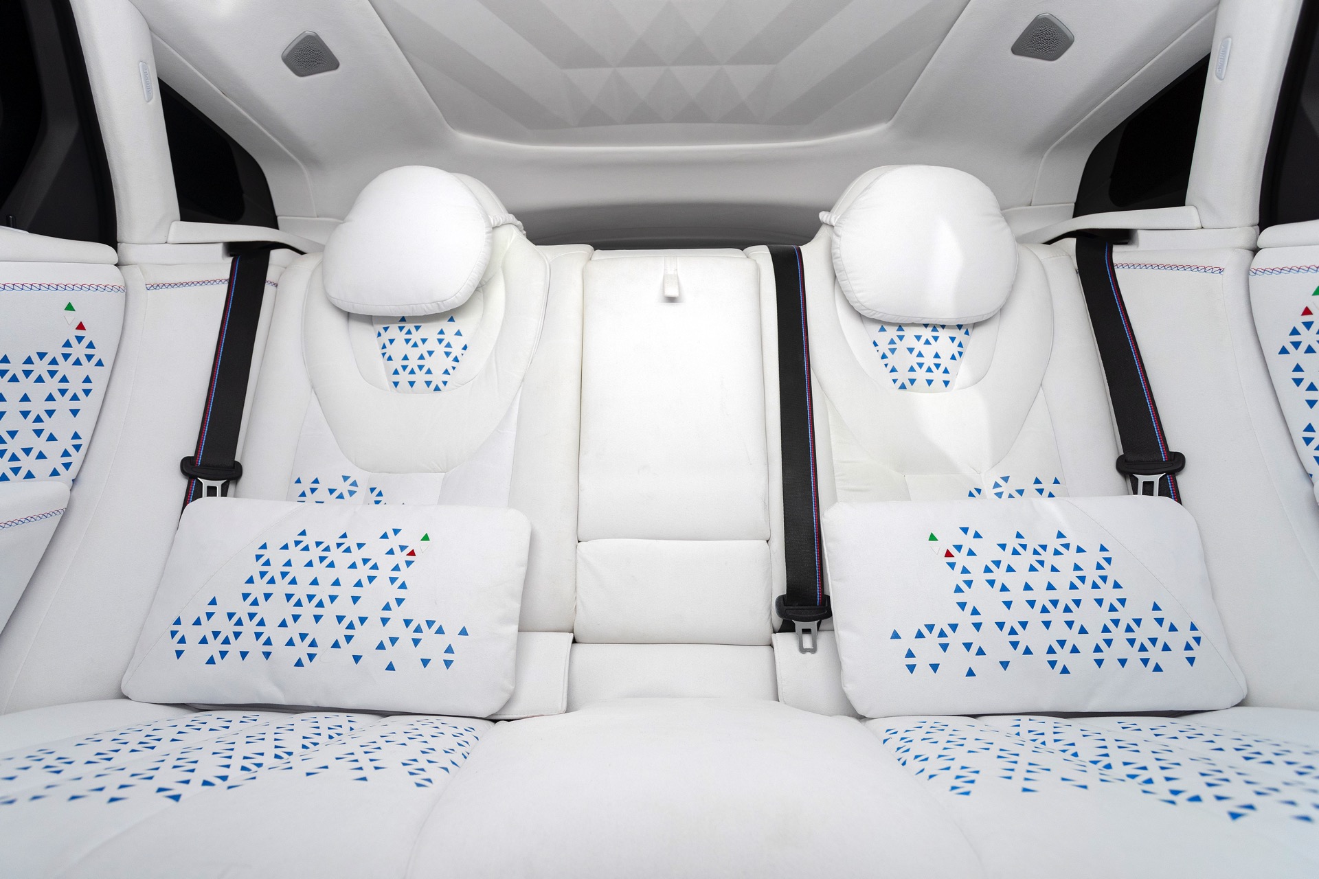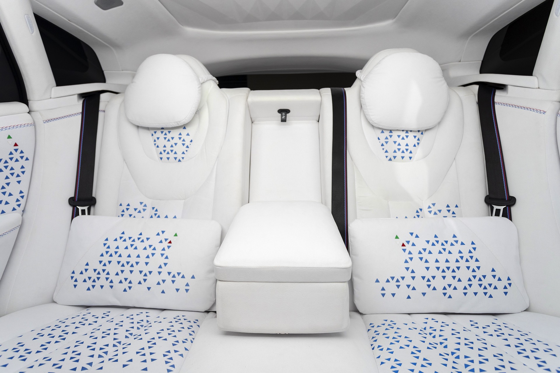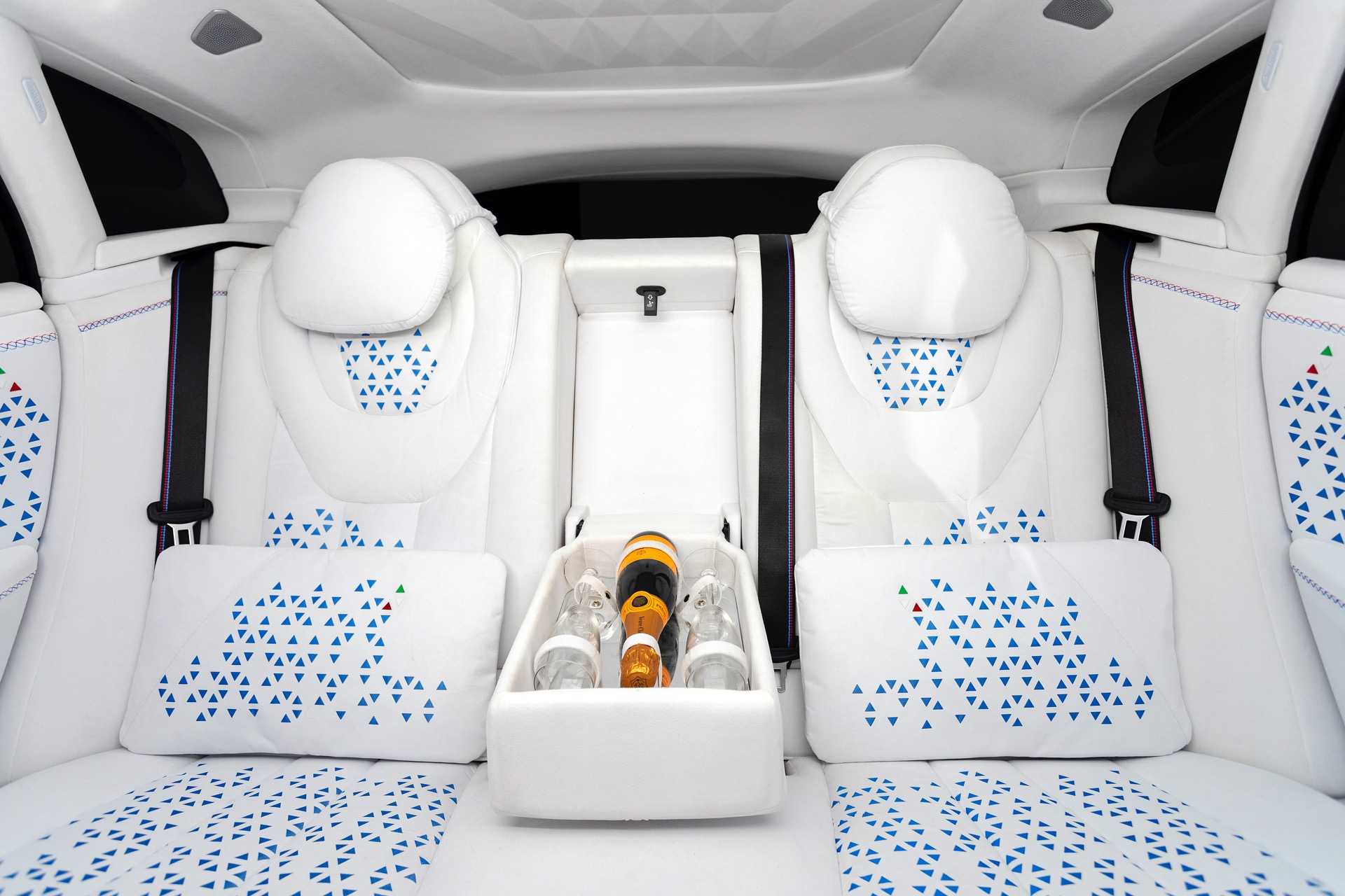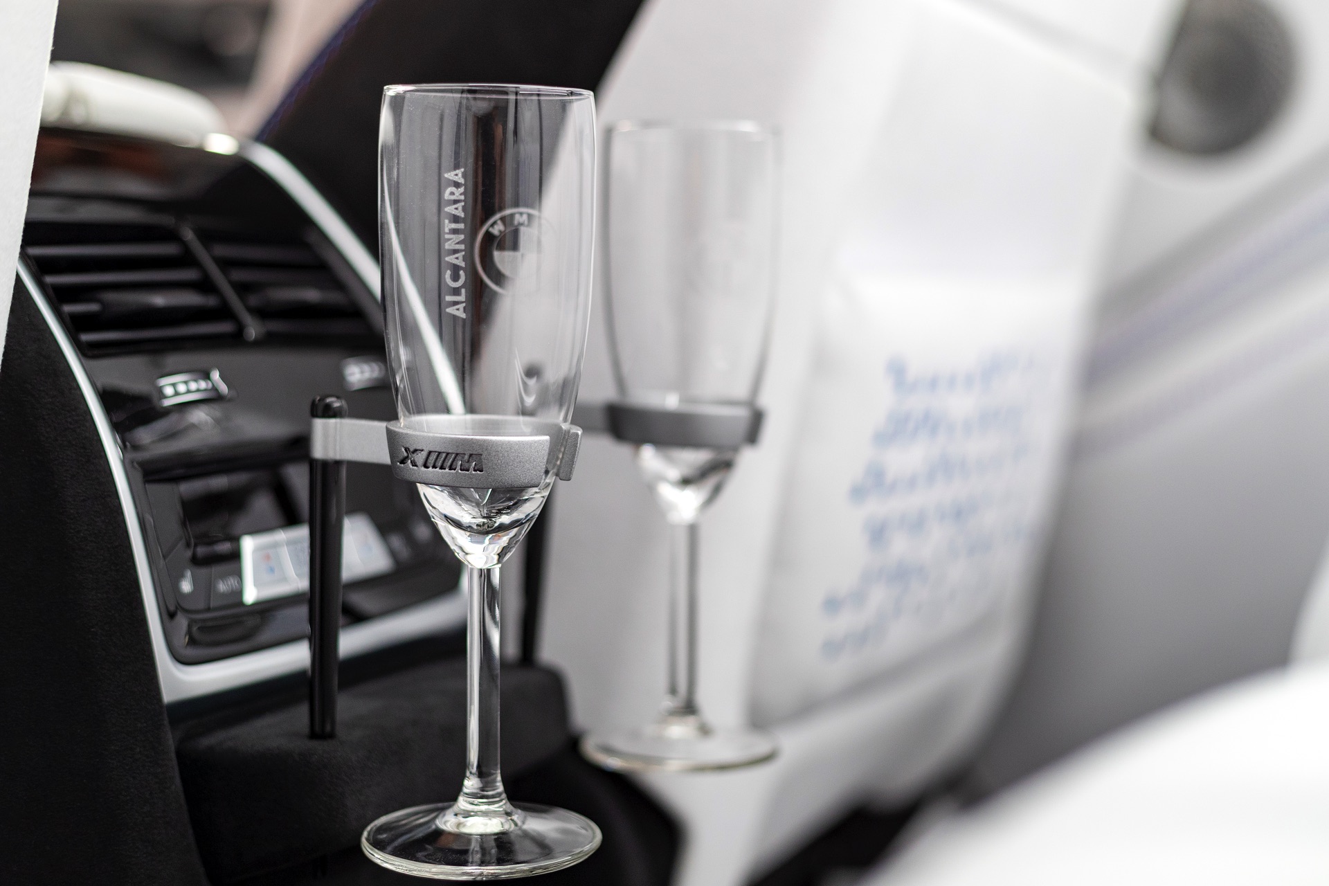 Sowohl der dreidimensional ausgeformte Dachhimmel als auch der Fond mit seinem luxuriösen Lounge-Charakter wirken dank Alcantara in Eisweiß noch luxuriöser, passend dazu bietet die hintere Mittelarmlehne Platz für eine Flasche Sekt oder Champagne sowie die dazugehörigen Gläser. Ein haptisches Highlight für den Fahrer ist das nicht nur am Kranz mit Alcantara bezogene Lenkrad, auch die unteren Lenkradspeichen und der zentrale Pralltopf samt Airbag ist mit dem edlen Mikrofaserstoff überzogen.