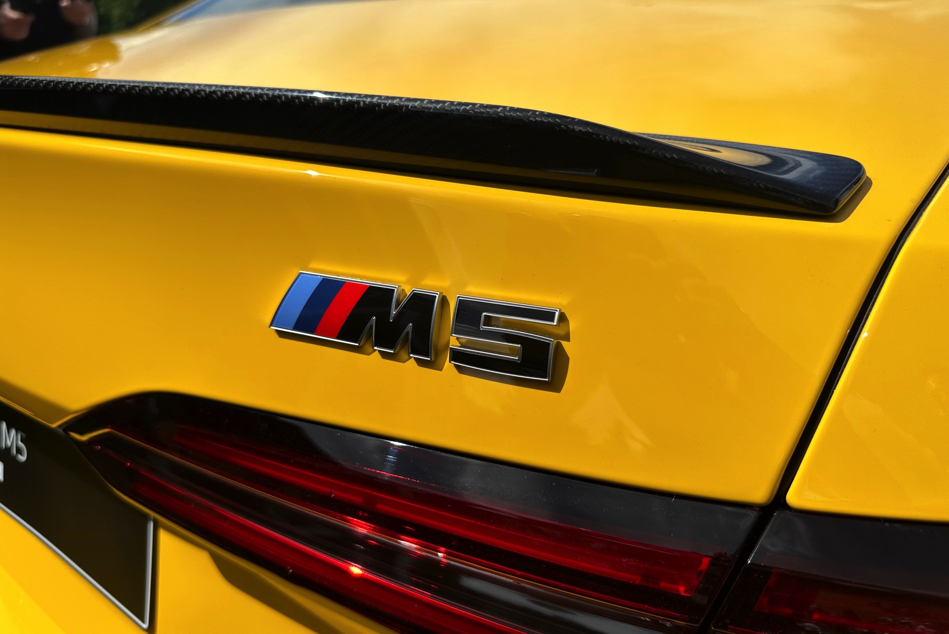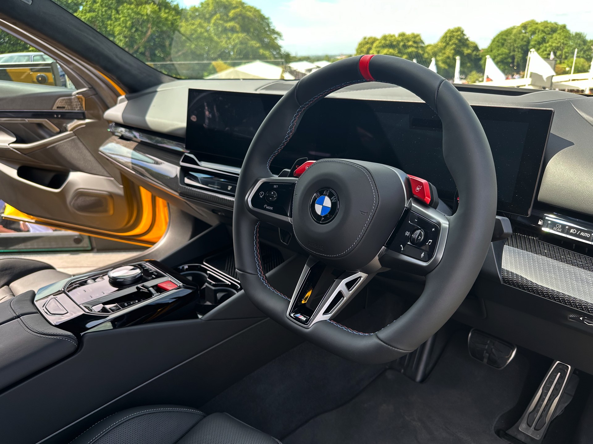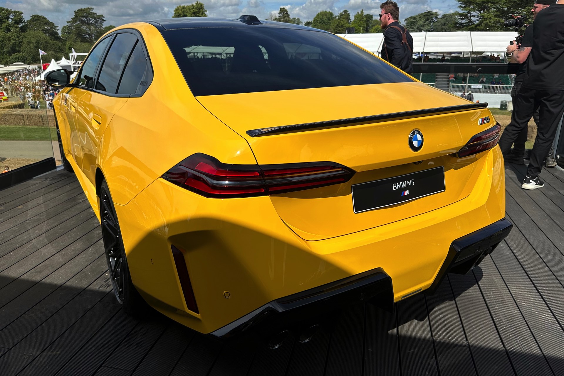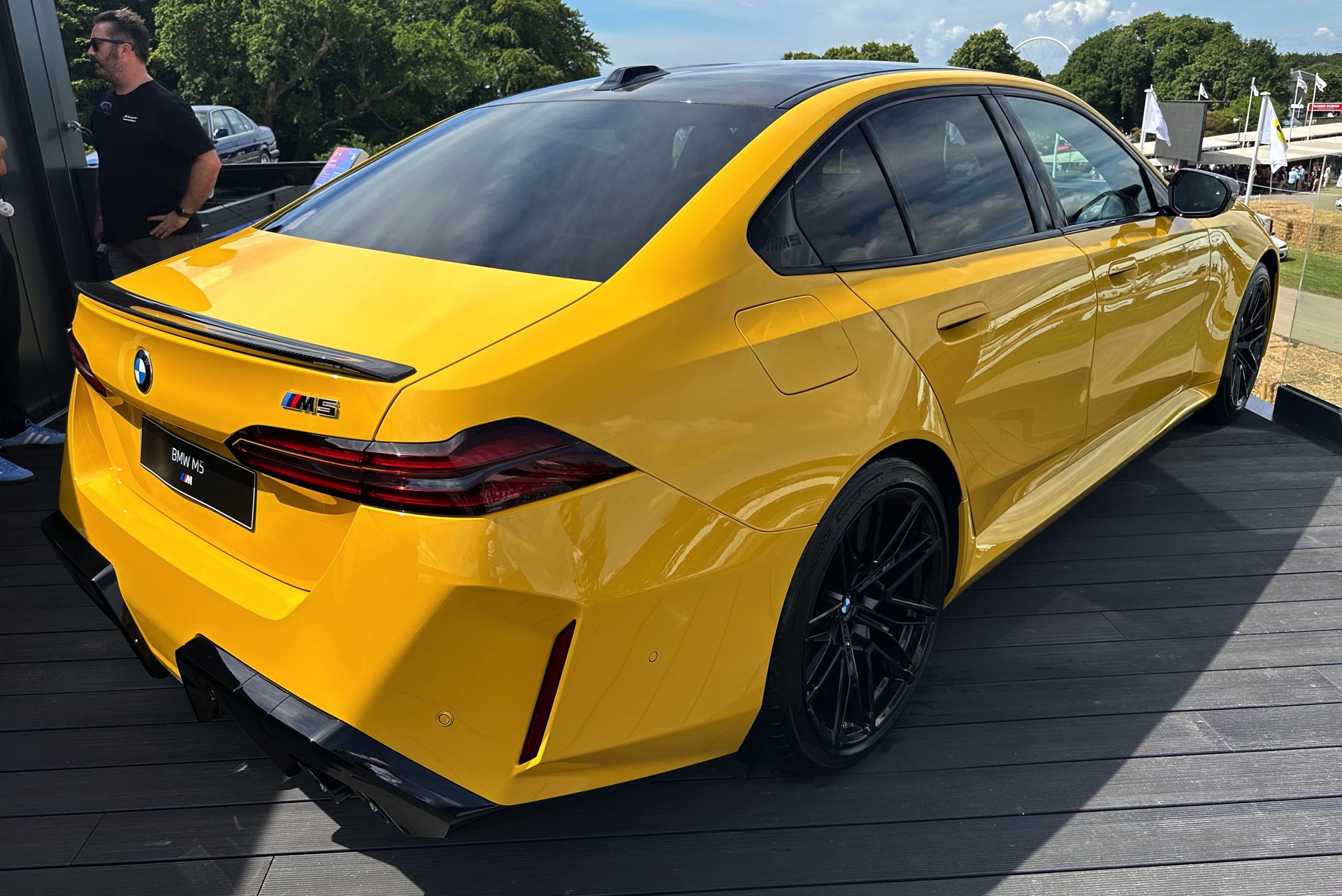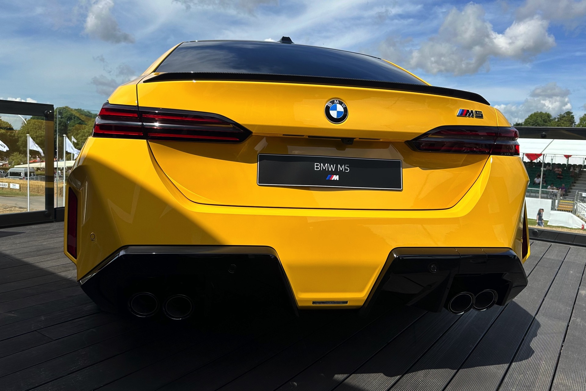 Unsere Live-Fotos aus Goodwood zeigen den neuen BMW M5 in Speed Gelb und deuten an, wie gut die Formen der Power-Limousine mit kräftigen Farben harmoniert. Über BMW Individual stehen insgesamt rund 150 Sonderwunsch-Farben zur Verfügung und wir dürfen davon ausgehen, dass wir in den nächsten Jahren so manche spezielle Variante auf dem G90 zu sehen bekommen. Jede intensive Farben steht dabei in scharfem Kontrast zu einer Vielzahl von dunklen Elementen, die je nach Konfiguration in glänzendem Schwarz oder auch in Sicht-Carbon ausgeführt sind.