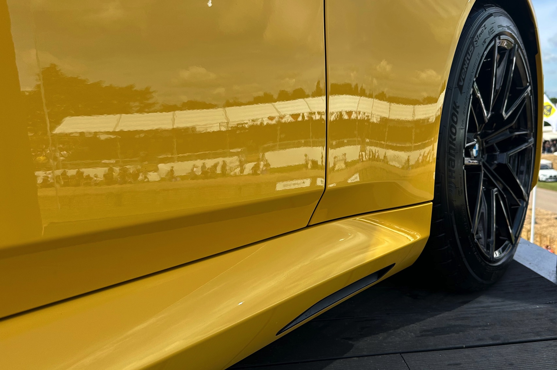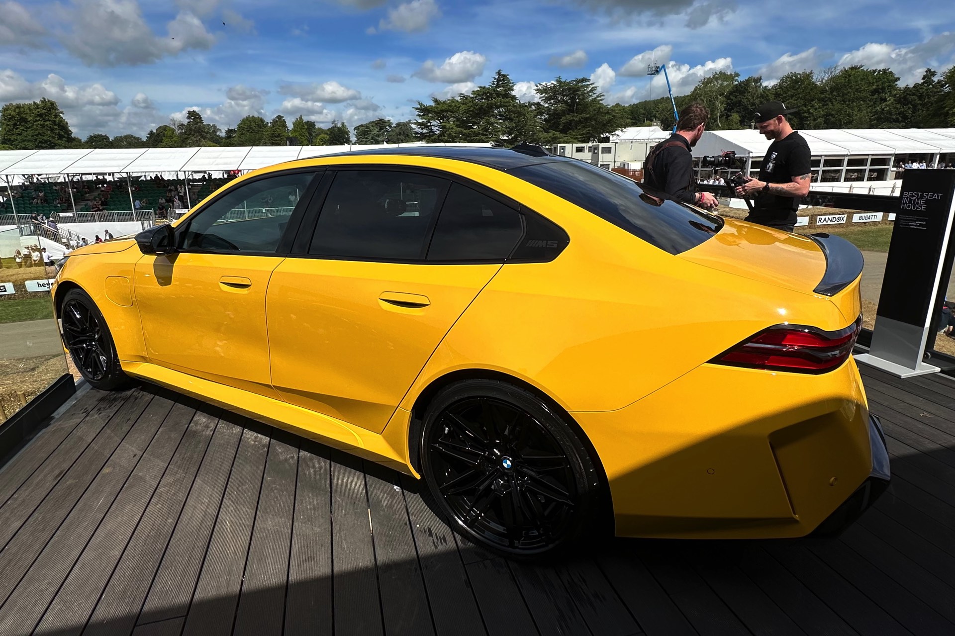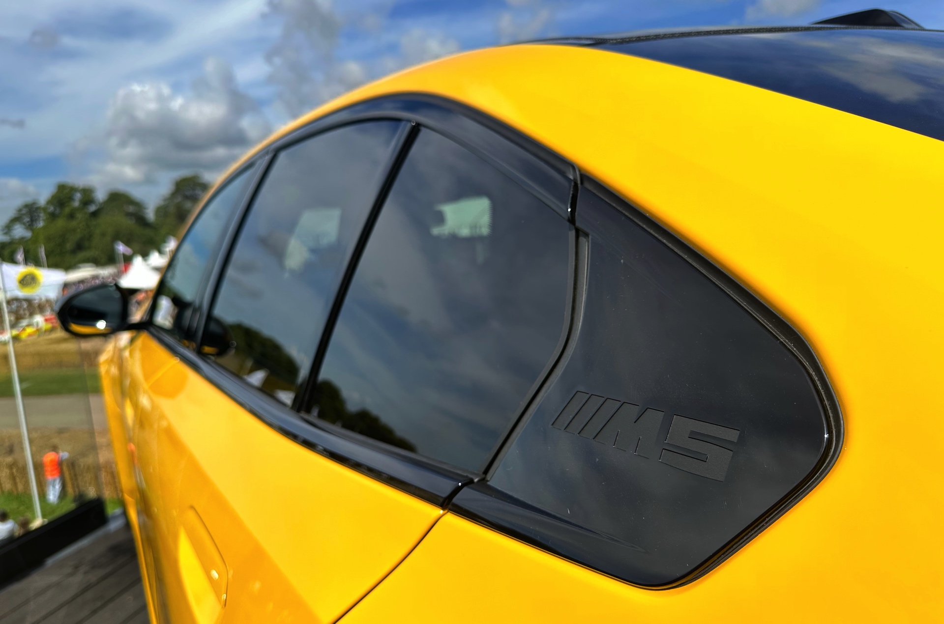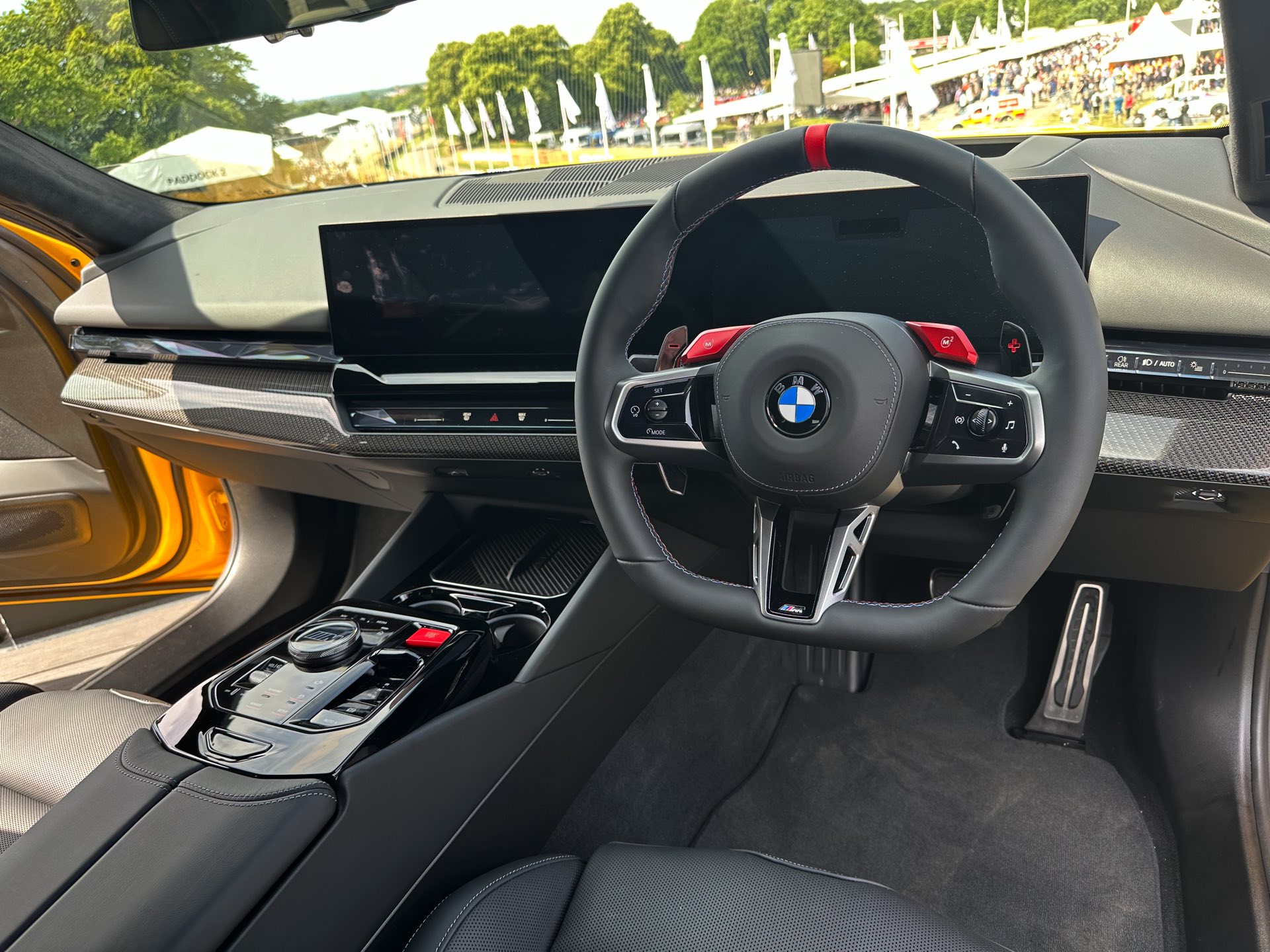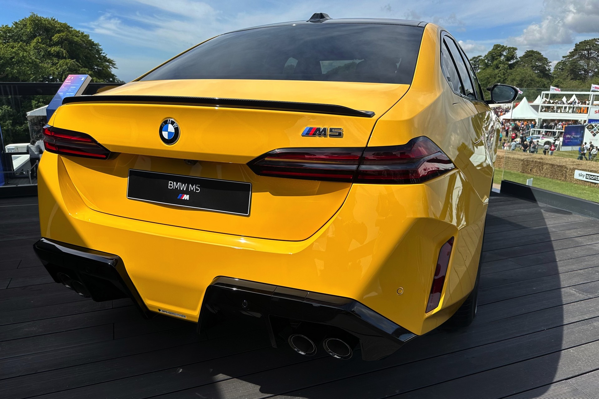 Unsere Live-Fotos aus Goodwood zeigen den neuen BMW M5 in Speed Gelb und deuten an, wie gut die Formen der Power-Limousine mit kräftigen Farben harmoniert. Über BMW Individual stehen insgesamt rund 150 Sonderwunsch-Farben zur Verfügung und wir dürfen davon ausgehen, dass wir in den nächsten Jahren so manche spezielle Variante auf dem G90 zu sehen bekommen. Jede intensive Farben steht dabei in scharfem Kontrast zu einer Vielzahl von dunklen Elementen, die je nach Konfiguration in glänzendem Schwarz oder auch in Sicht-Carbon ausgeführt sind.