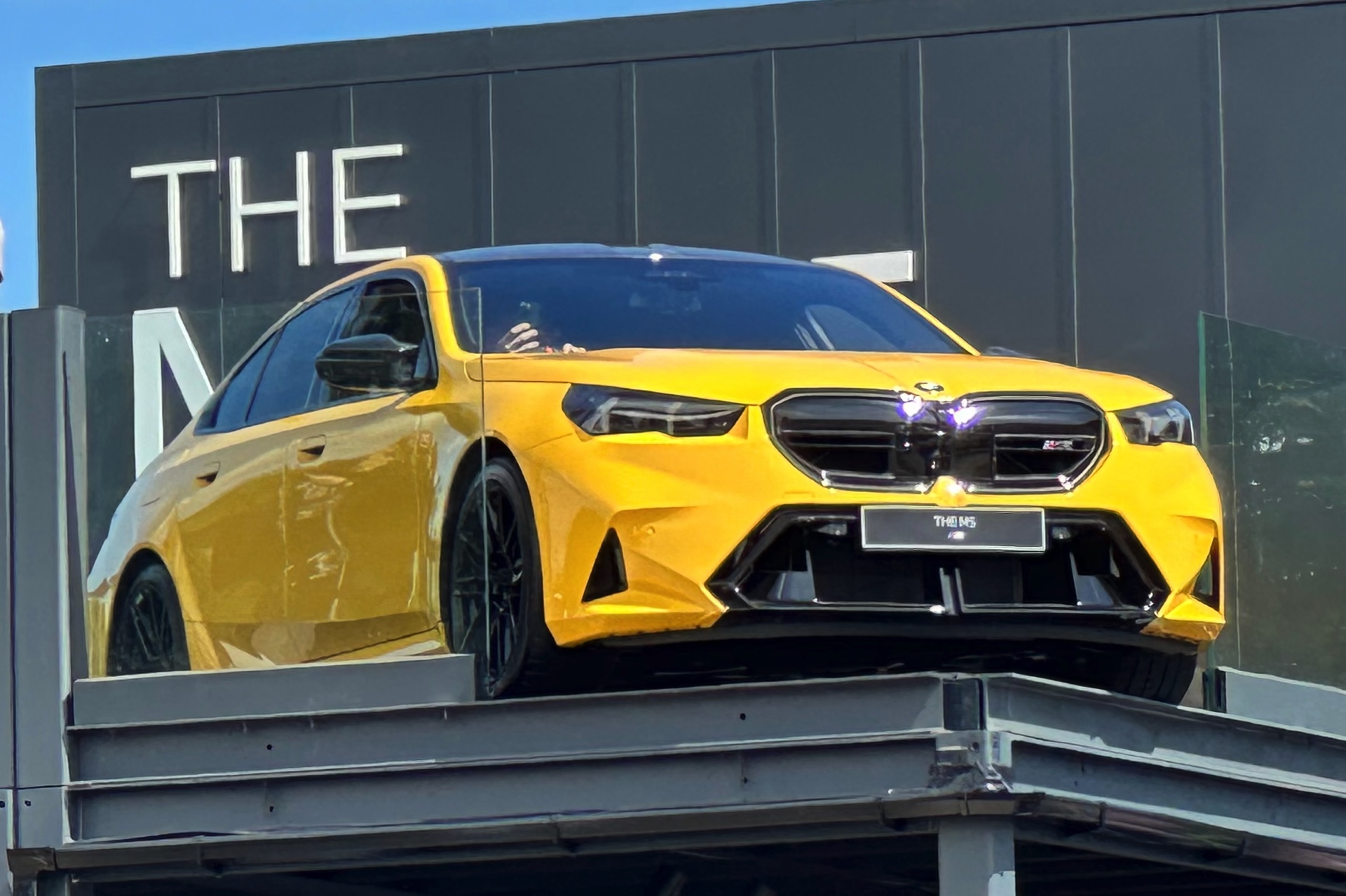 Da die Front des BMW M5 in Speed Gelb aufgrund der Positionierung des Fahrzeugs nicht aus der Nähe zu fotografieren war, empfiehlt sich in dieser Hinsicht unbedingt auch ein Blick auf die Fotos vom Produktions-Auftakt, denn auch dort war der G90 im intensiven Individual-Gelb zu sehen.
