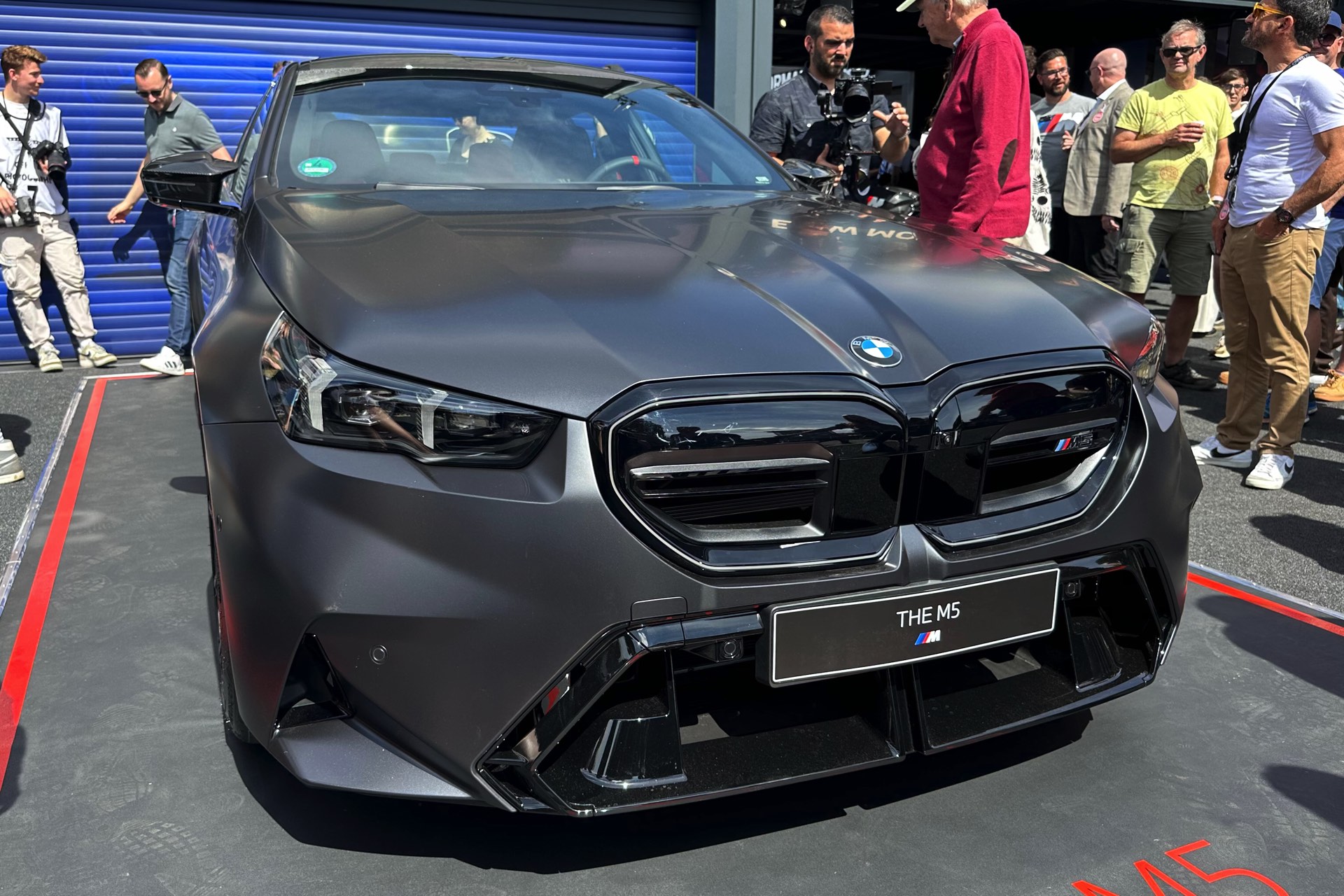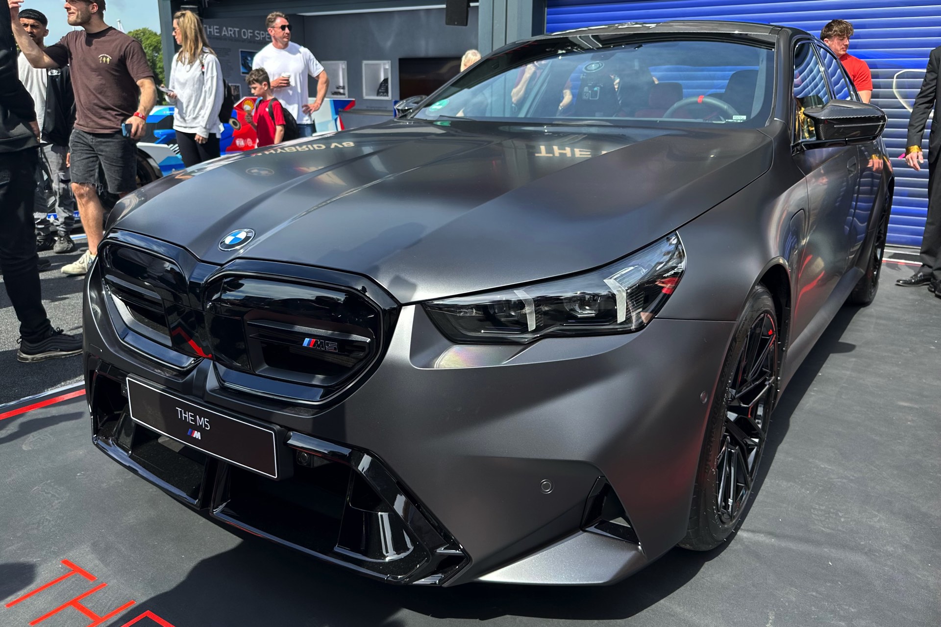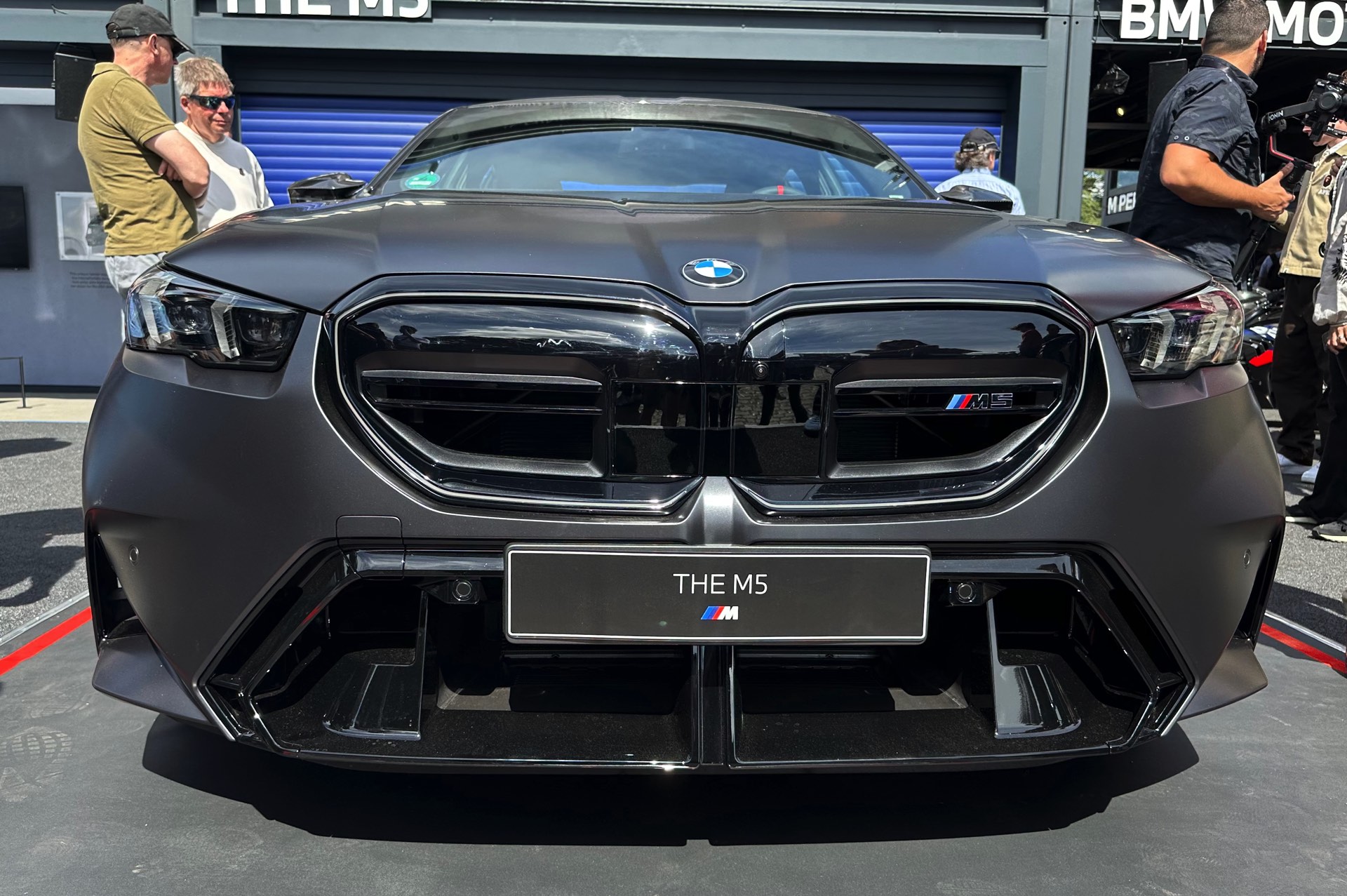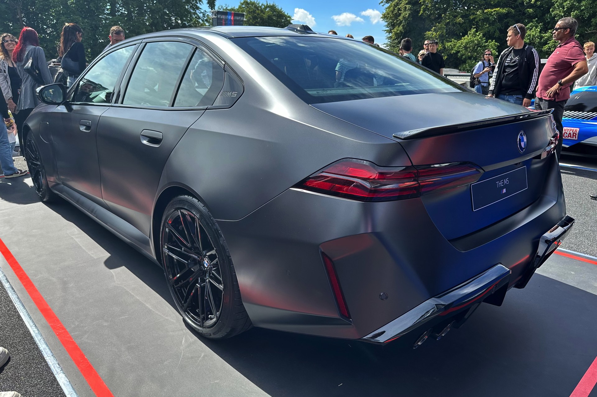 Der neue BMW M5 (G90) zählt zu den Highlights des Goodwood Festival of Speed 2024: Die siebte Generation der Power-Limousine feiert in Goodwood ihre offizielle Weltpremiere und zeigt sich erstmals einem größeren Publikum. Für das Debüt haben die Verantwortlichen die matte Individual-Lackierung Frozen Deep Grey gewählt, die den Auftritt des BMW M5 noch markanter macht: Die großen Lufteinlässe an der Front treten ebenso wie die vorne und erstmals auch hinten um mehrere Zentimeter verbreiterten Kotflügel noch deutlicher in Erscheinung, außerdem ergeben sich spannende Kontraste zu einigen M5-Details mit glänzenden Oberflächen.