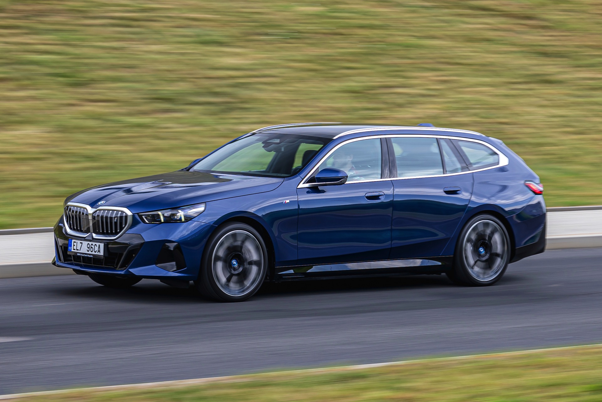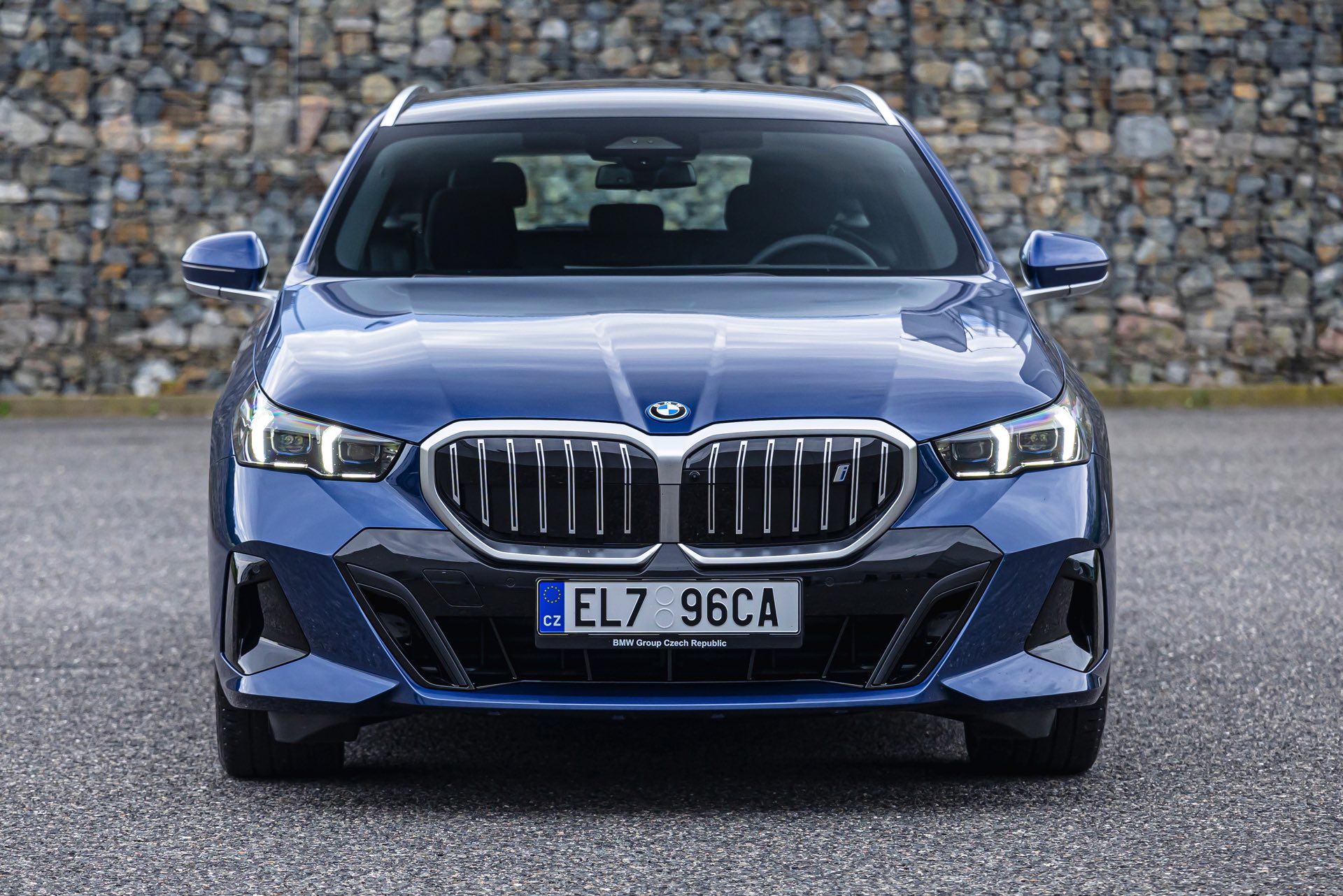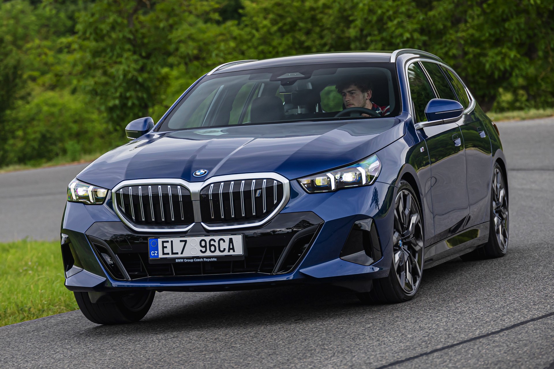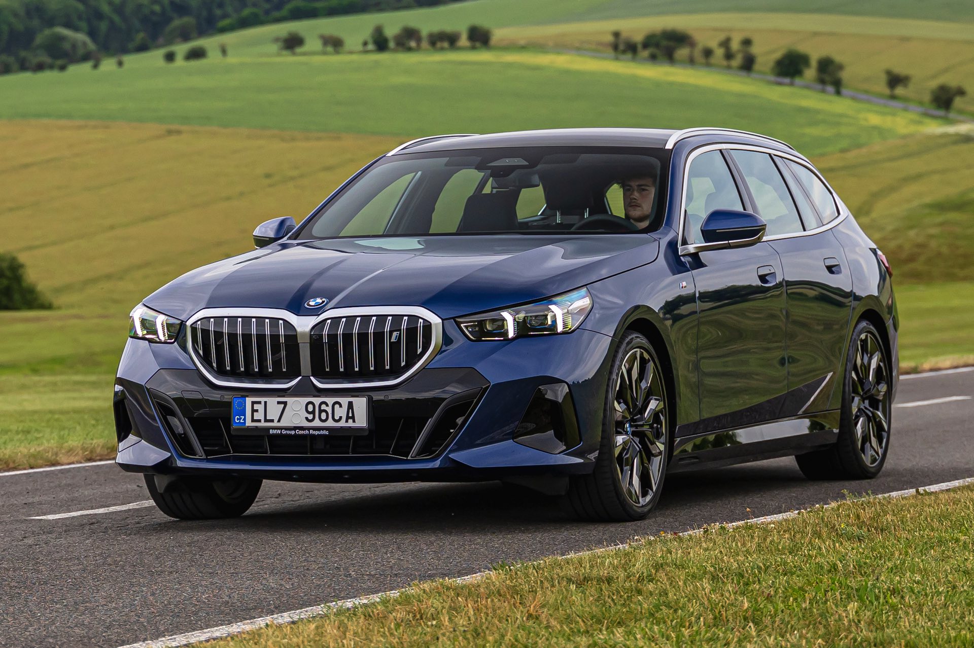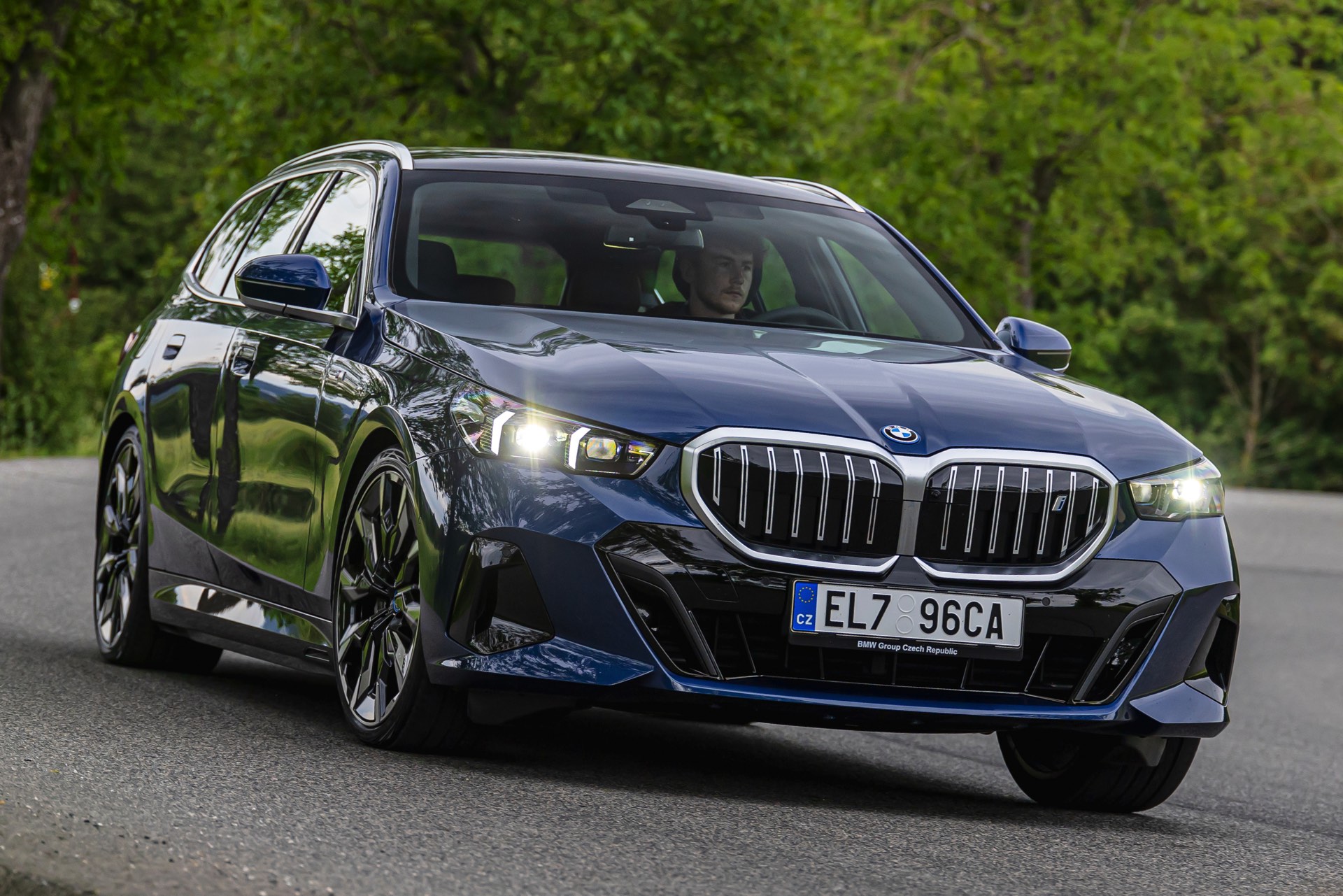 In einer klassisch-sportlichen Konfiguration sehen wir den neuen BMW i5 Touring (G61) auf neuen Fotos aus der Tschechischen Republik. Der Business-Kombi trägt dabei das reguläre M Sportpaket, weshalb die Niere noch metallisch glänzen darf und nicht in Schwarz lackiert ist, sowie eine Karosserie-Lackierung in Phytonic Blue Metallic. Auch die silbern abgesetzten Streben auf der vollständig geschlossenen Niere tragen dazu bei, dass der gezeigte i5 mit manchen Details an die klassischen BMW 5er Touring früherer Zeiten erinnert.