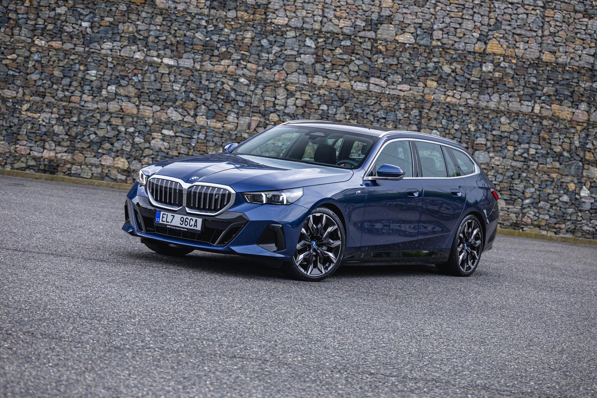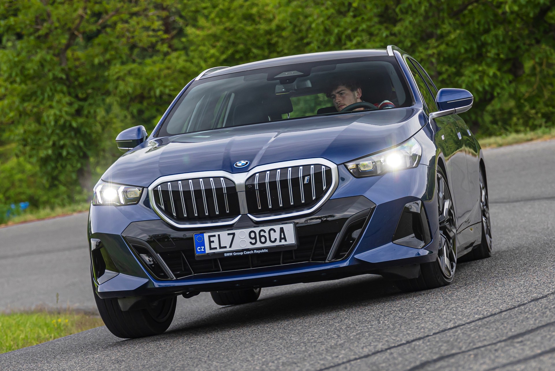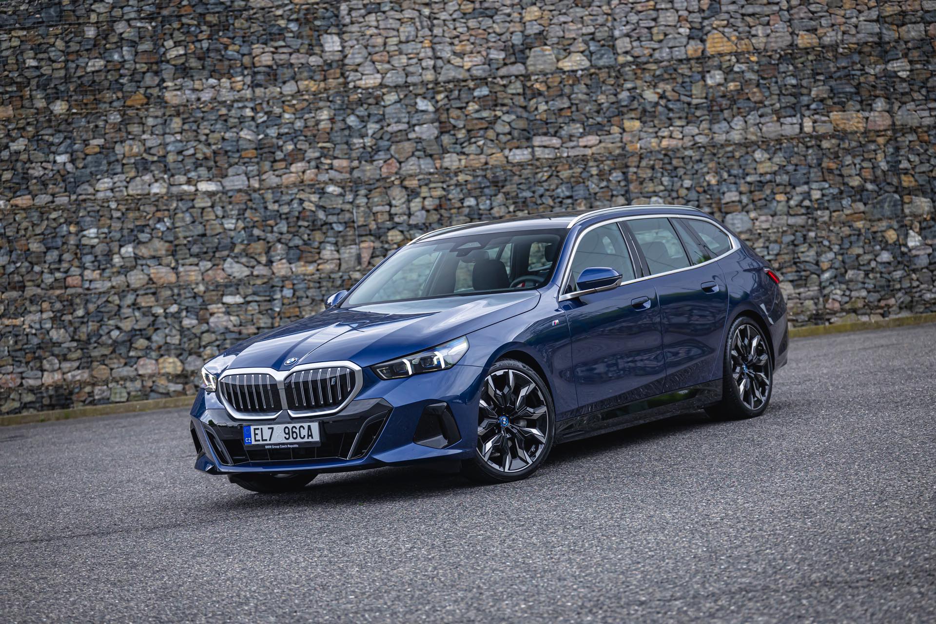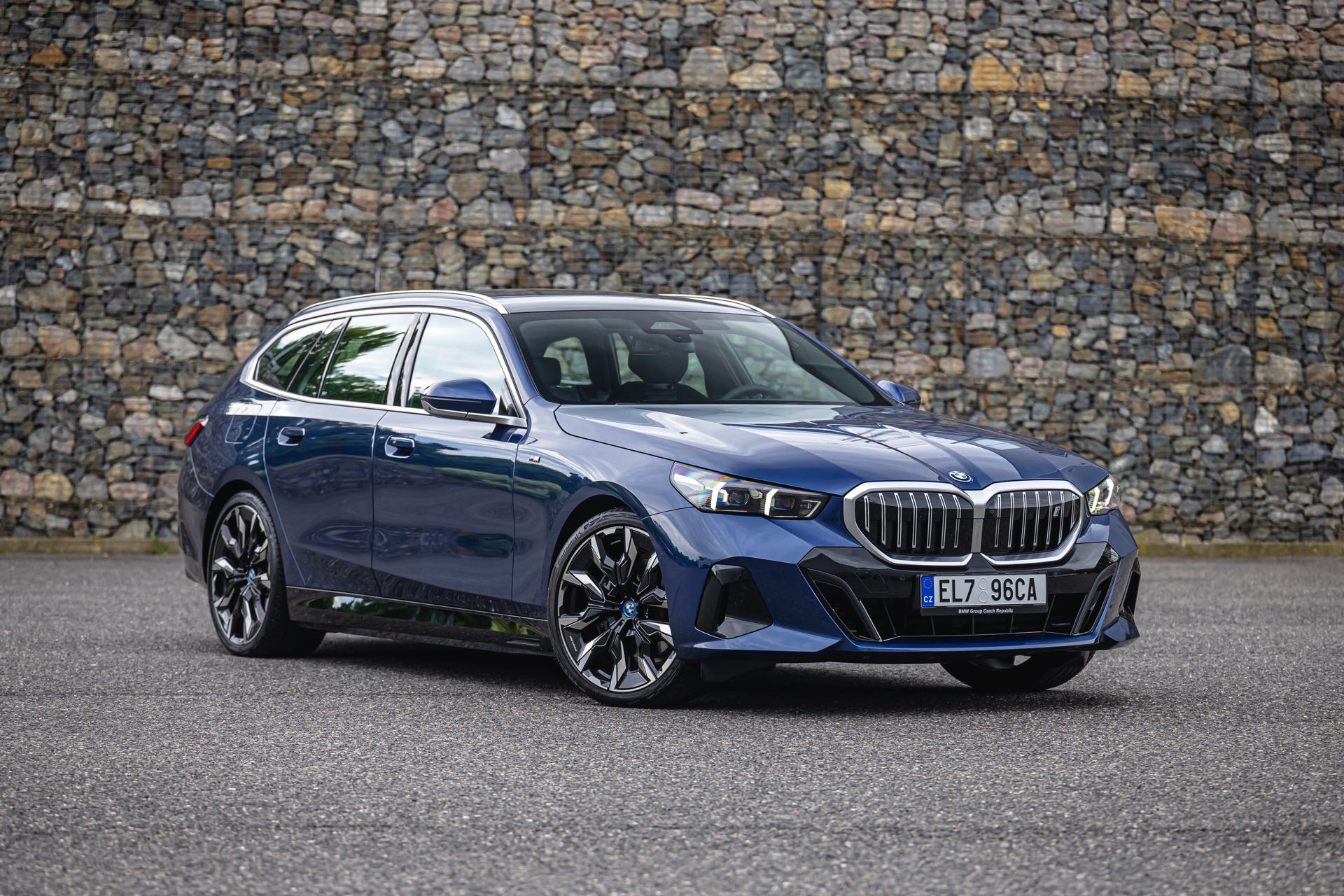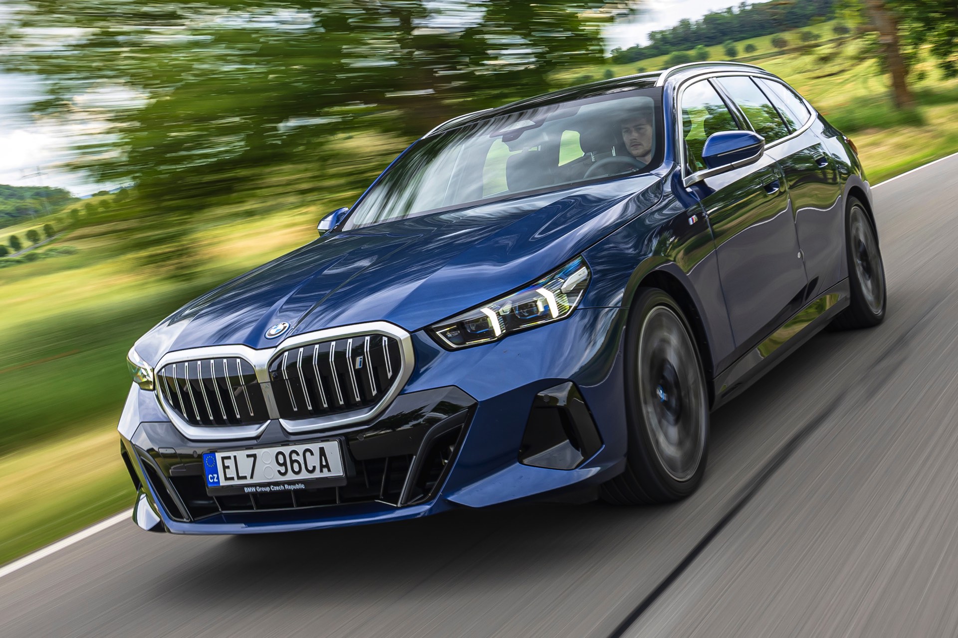 In einer klassisch-sportlichen Konfiguration sehen wir den neuen BMW i5 Touring (G61) auf neuen Fotos aus der Tschechischen Republik. Der Business-Kombi trägt dabei das reguläre M Sportpaket, weshalb die Niere noch metallisch glänzen darf und nicht in Schwarz lackiert ist, sowie eine Karosserie-Lackierung in Phytonic Blue Metallic. Auch die silbern abgesetzten Streben auf der vollständig geschlossenen Niere tragen dazu bei, dass der gezeigte i5 mit manchen Details an die klassischen BMW 5er Touring früherer Zeiten erinnert.