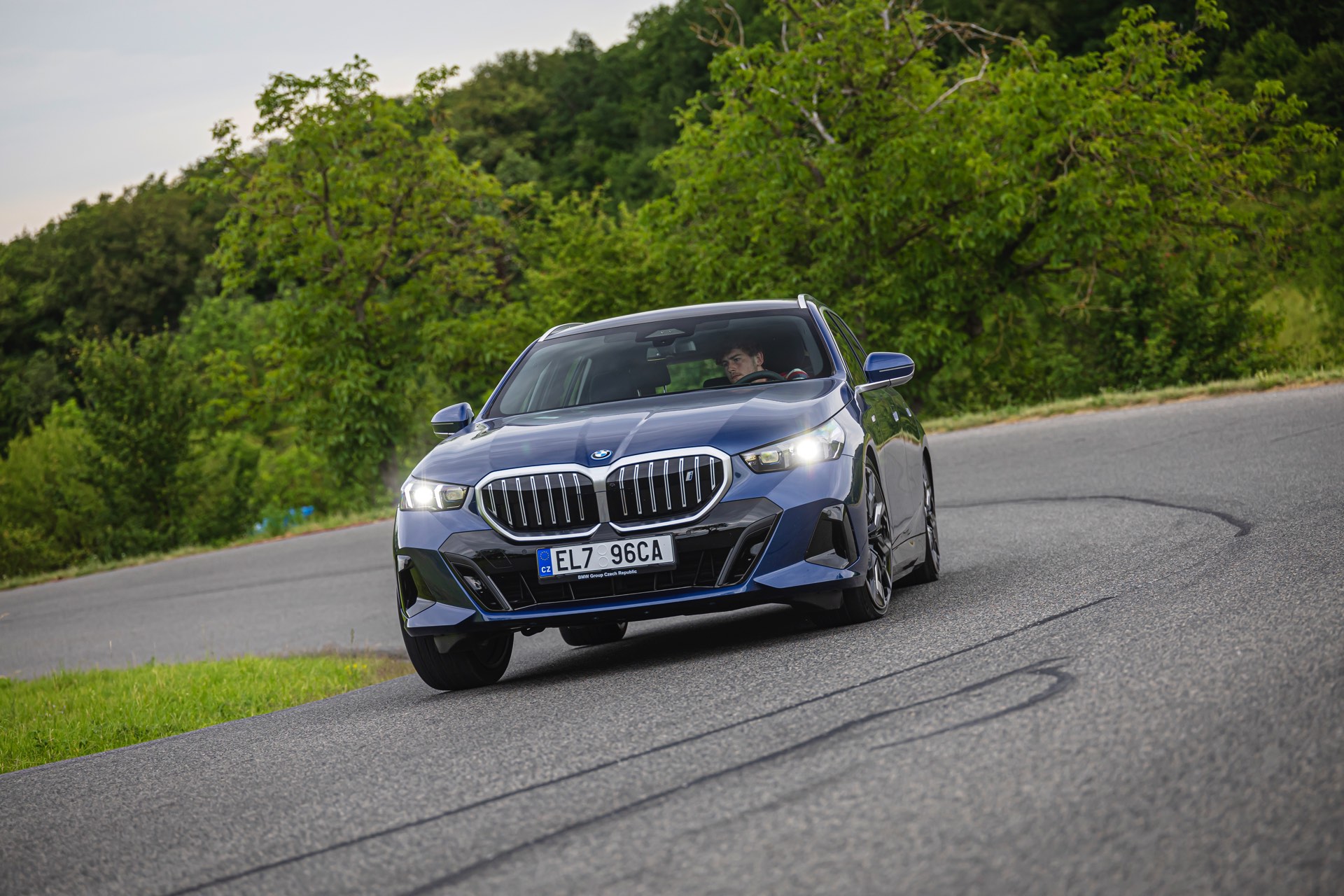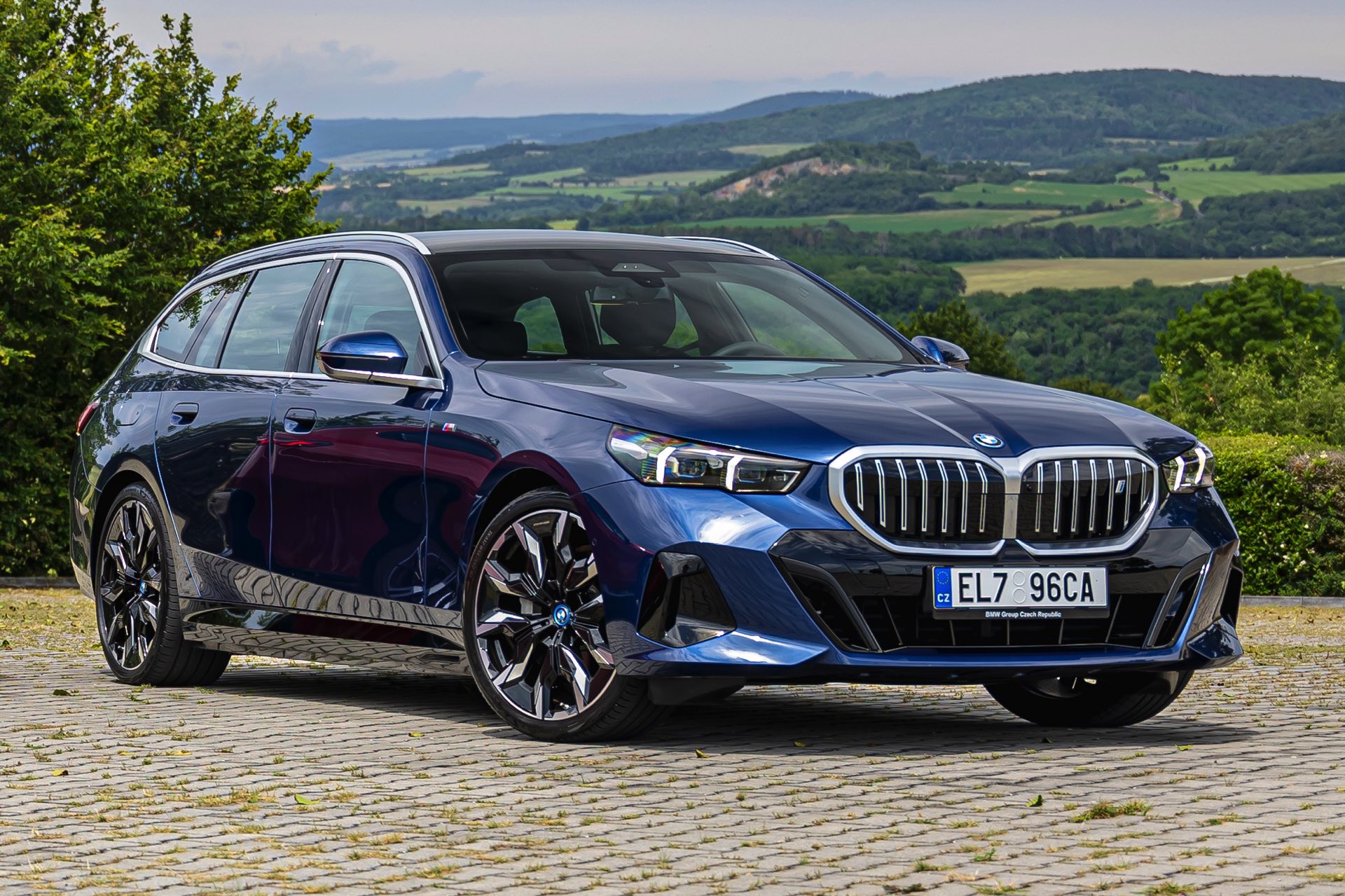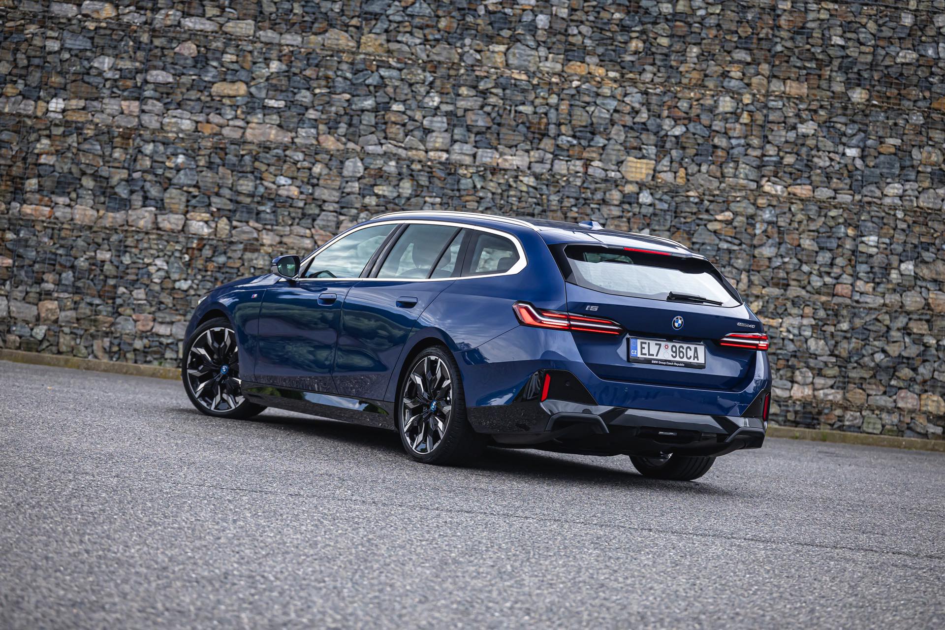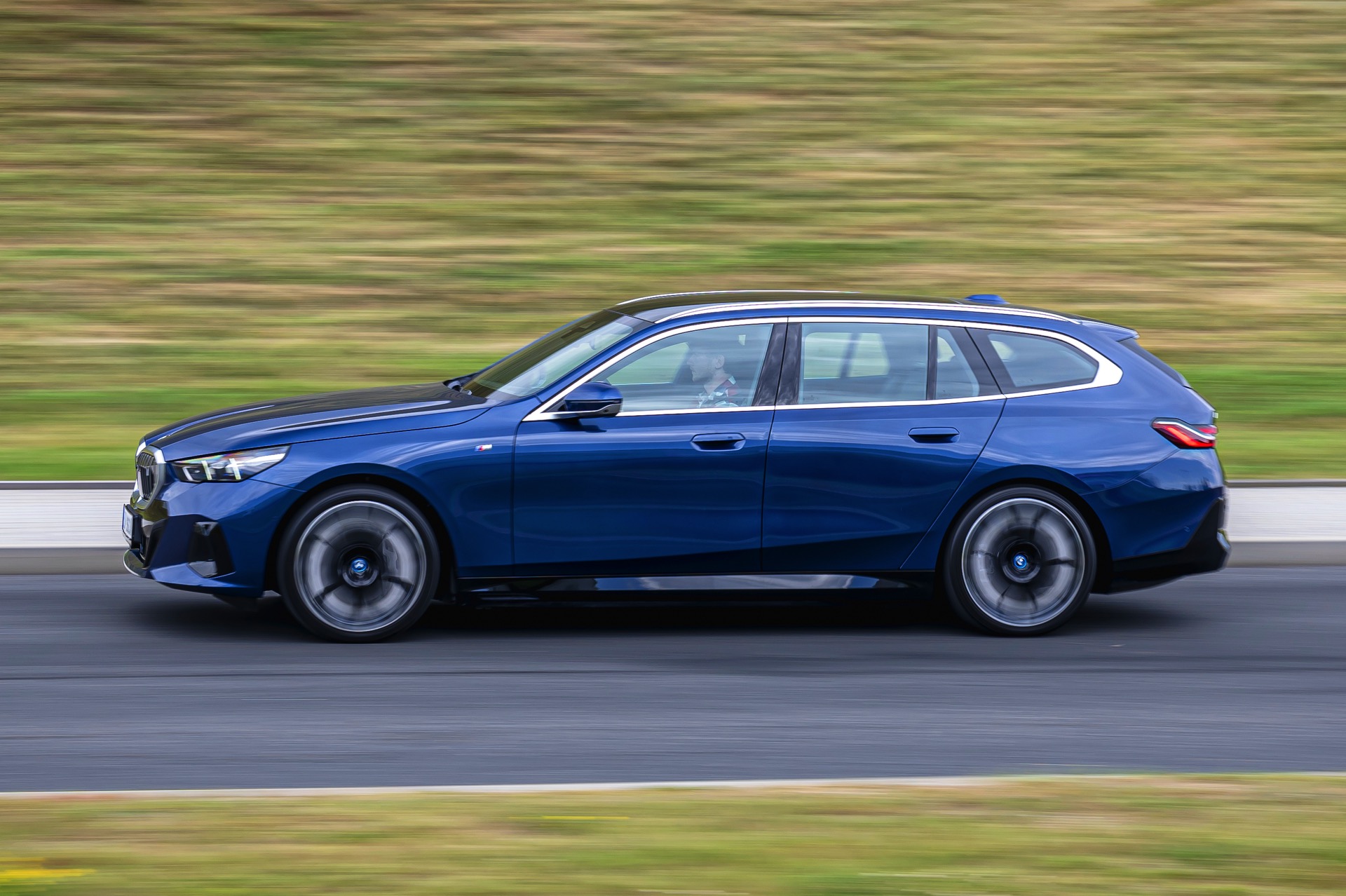 In einer klassisch-sportlichen Konfiguration sehen wir den neuen BMW i5 Touring (G61) auf neuen Fotos aus der Tschechischen Republik. Der Business-Kombi trägt dabei das reguläre M Sportpaket, weshalb die Niere noch metallisch glänzen darf und nicht in Schwarz lackiert ist, sowie eine Karosserie-Lackierung in Phytonic Blue Metallic. Auch die silbern abgesetzten Streben auf der vollständig geschlossenen Niere tragen dazu bei, dass der gezeigte i5 mit manchen Details an die klassischen BMW 5er Touring früherer Zeiten erinnert.