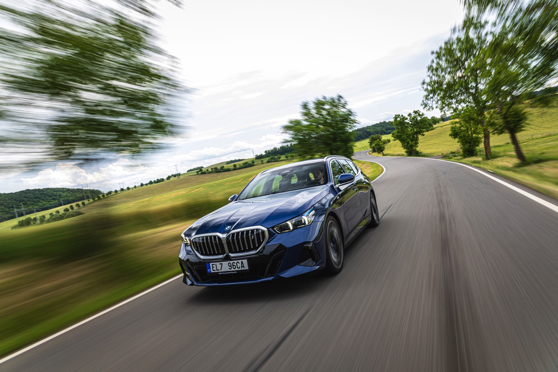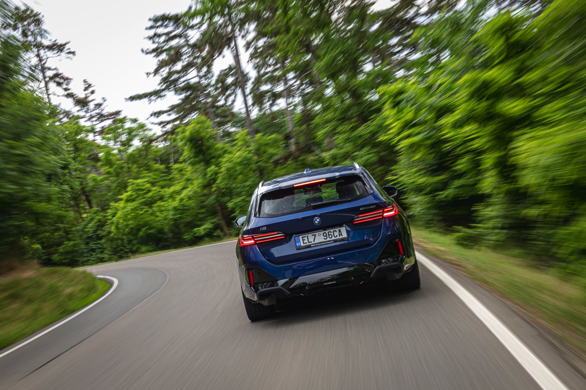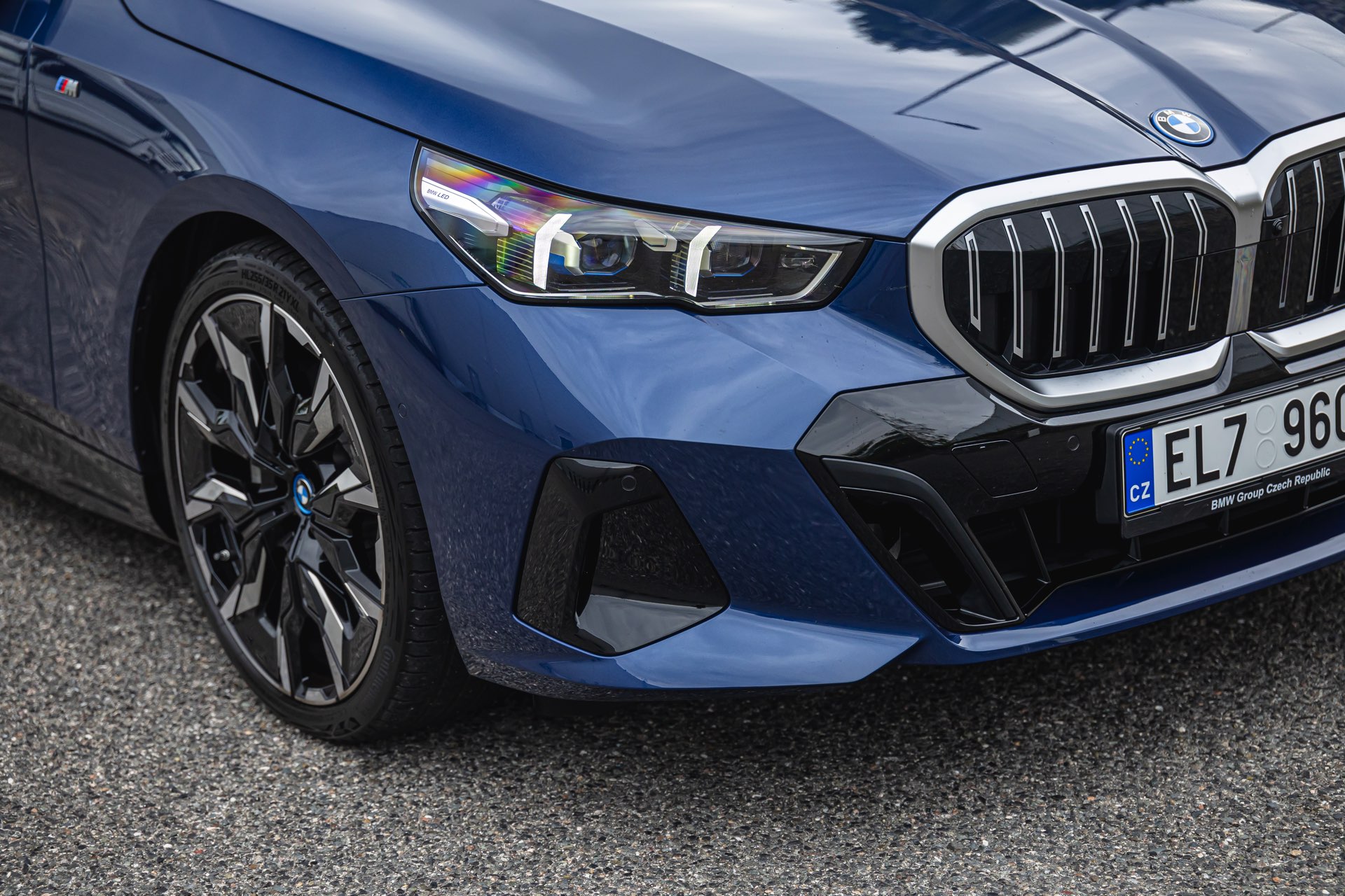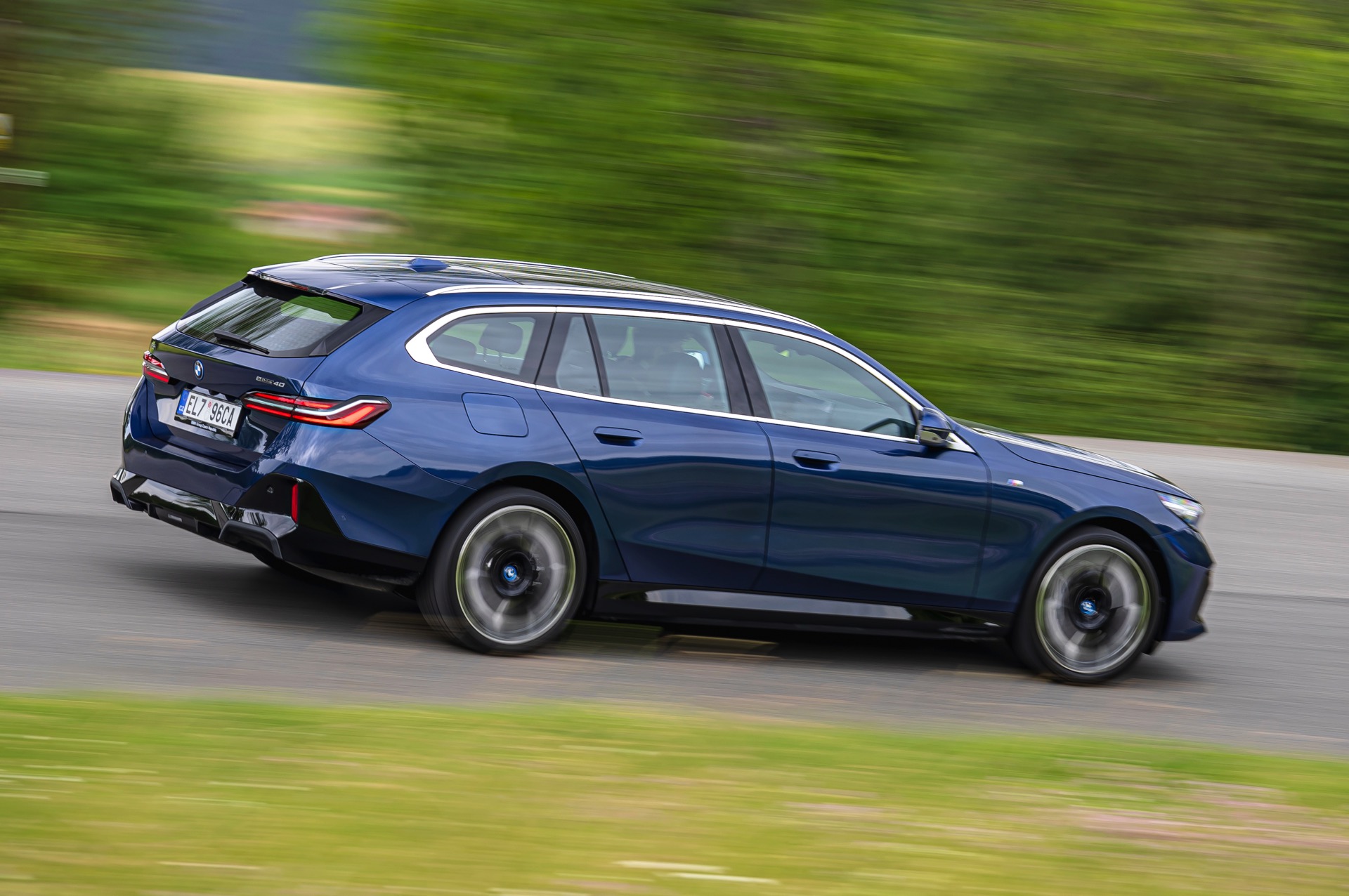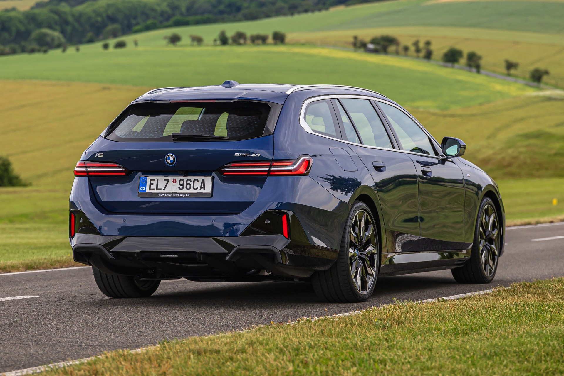 In einer klassisch-sportlichen Konfiguration sehen wir den neuen BMW i5 Touring (G61) auf neuen Fotos aus der Tschechischen Republik. Der Business-Kombi trägt dabei das reguläre M Sportpaket, weshalb die Niere noch metallisch glänzen darf und nicht in Schwarz lackiert ist, sowie eine Karosserie-Lackierung in Phytonic Blue Metallic. Auch die silbern abgesetzten Streben auf der vollständig geschlossenen Niere tragen dazu bei, dass der gezeigte i5 mit manchen Details an die klassischen BMW 5er Touring früherer Zeiten erinnert.