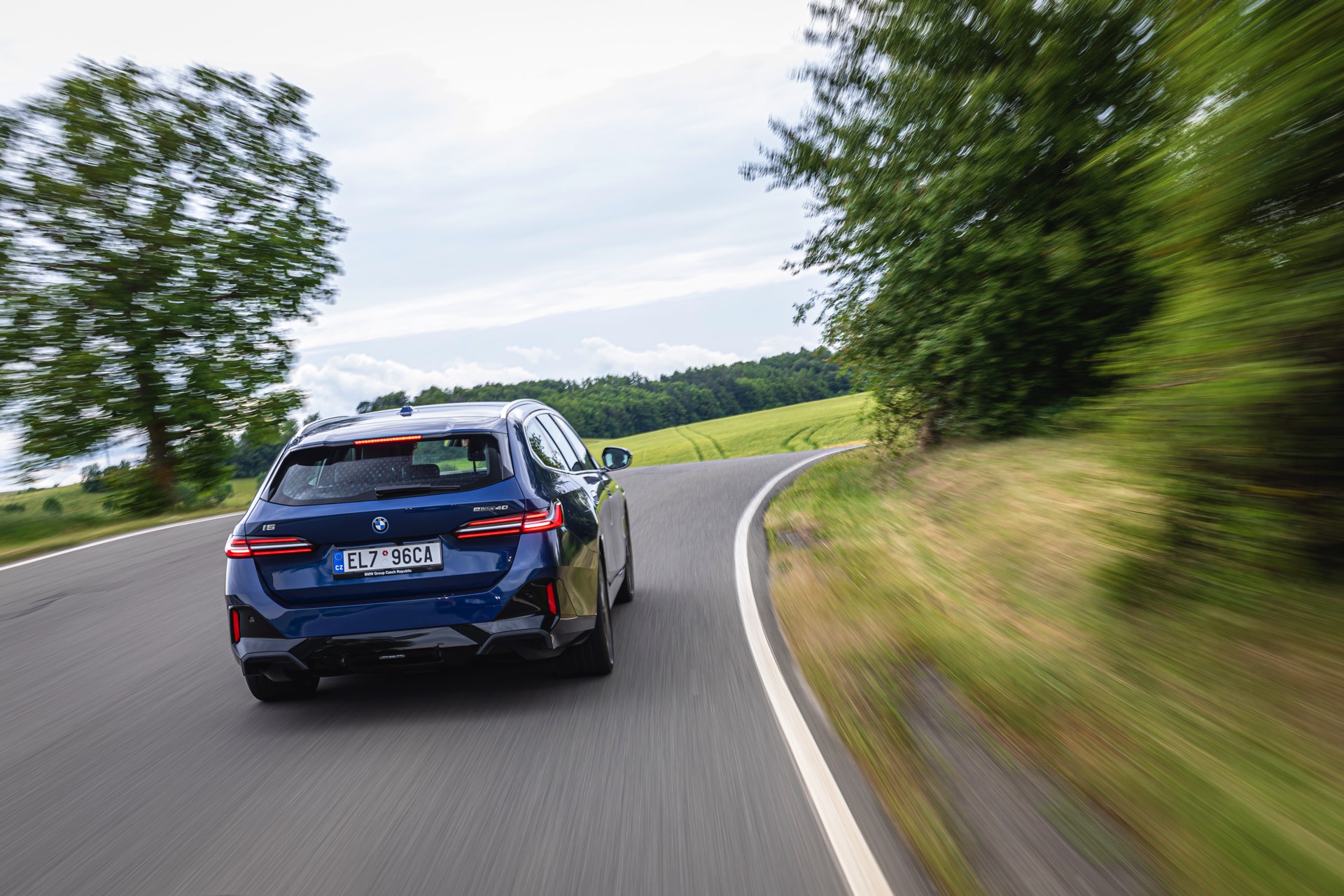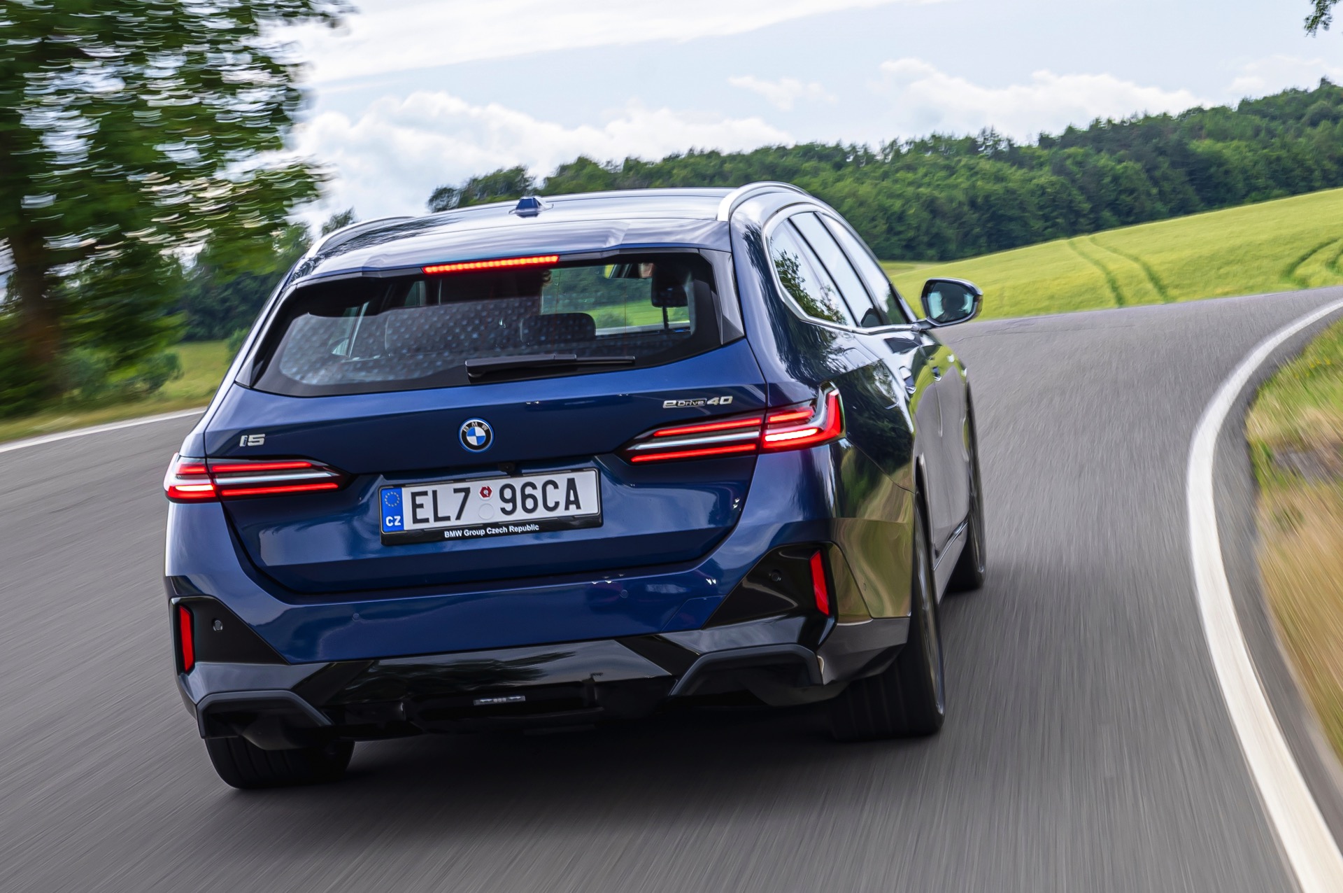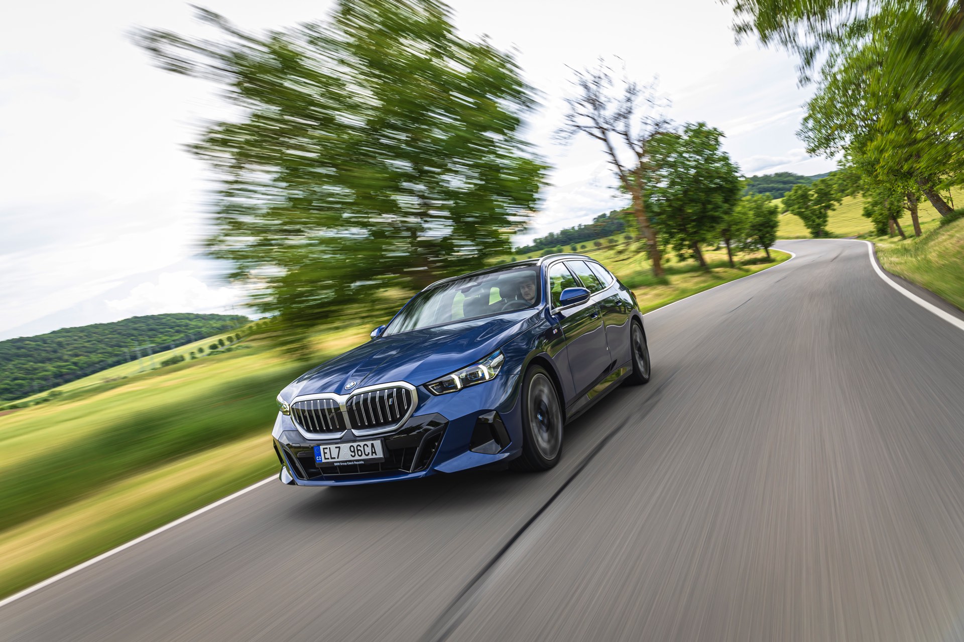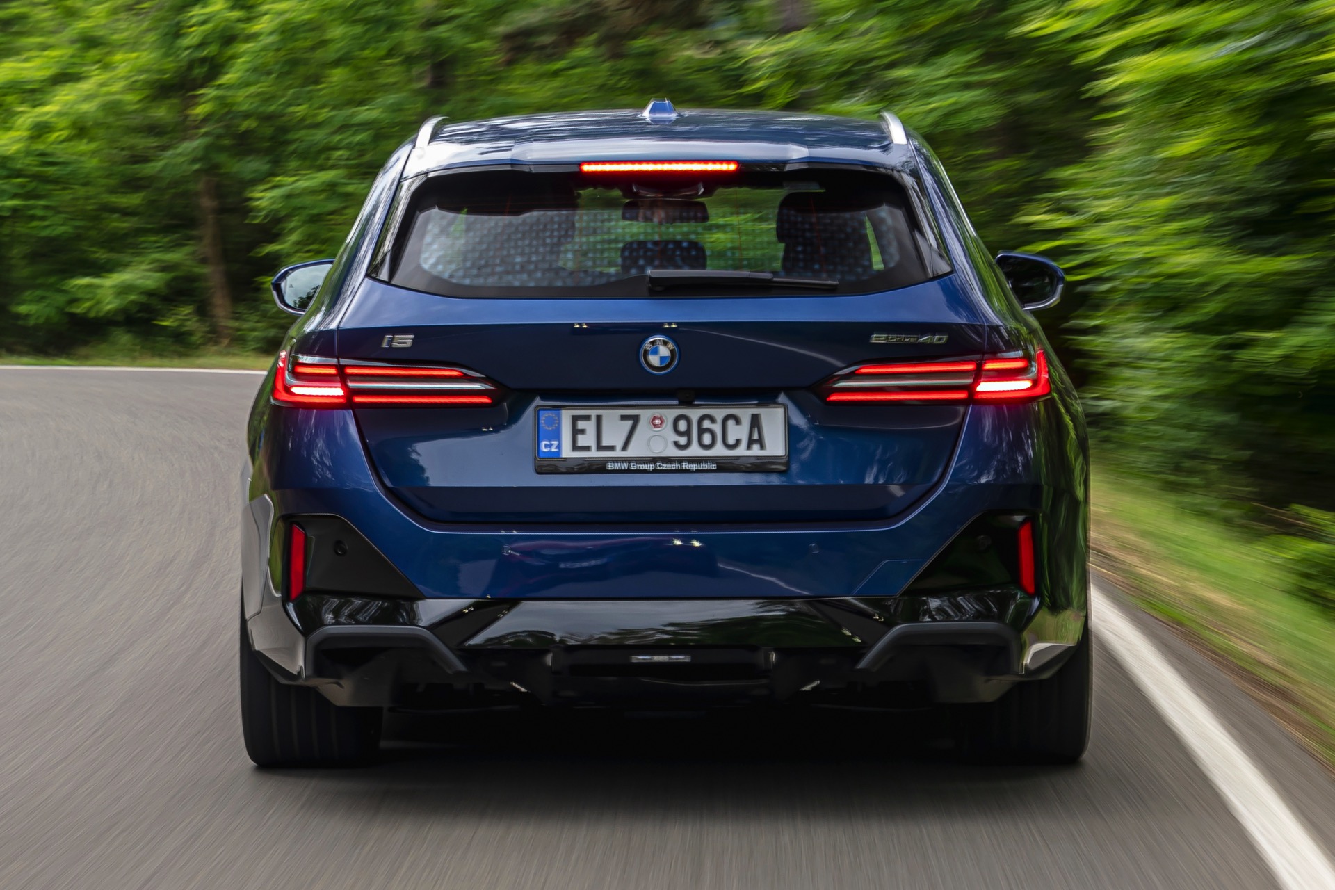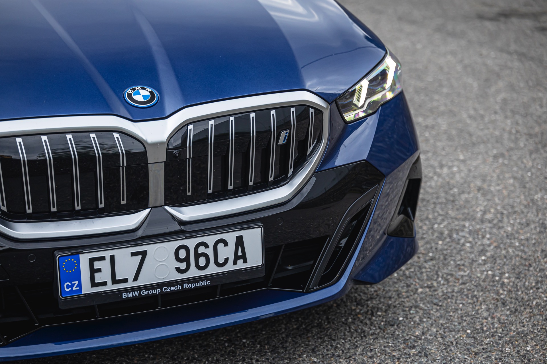 In einer klassisch-sportlichen Konfiguration sehen wir den neuen BMW i5 Touring (G61) auf neuen Fotos aus der Tschechischen Republik. Der Business-Kombi trägt dabei das reguläre M Sportpaket, weshalb die Niere noch metallisch glänzen darf und nicht in Schwarz lackiert ist, sowie eine Karosserie-Lackierung in Phytonic Blue Metallic. Auch die silbern abgesetzten Streben auf der vollständig geschlossenen Niere tragen dazu bei, dass der gezeigte i5 mit manchen Details an die klassischen BMW 5er Touring früherer Zeiten erinnert.