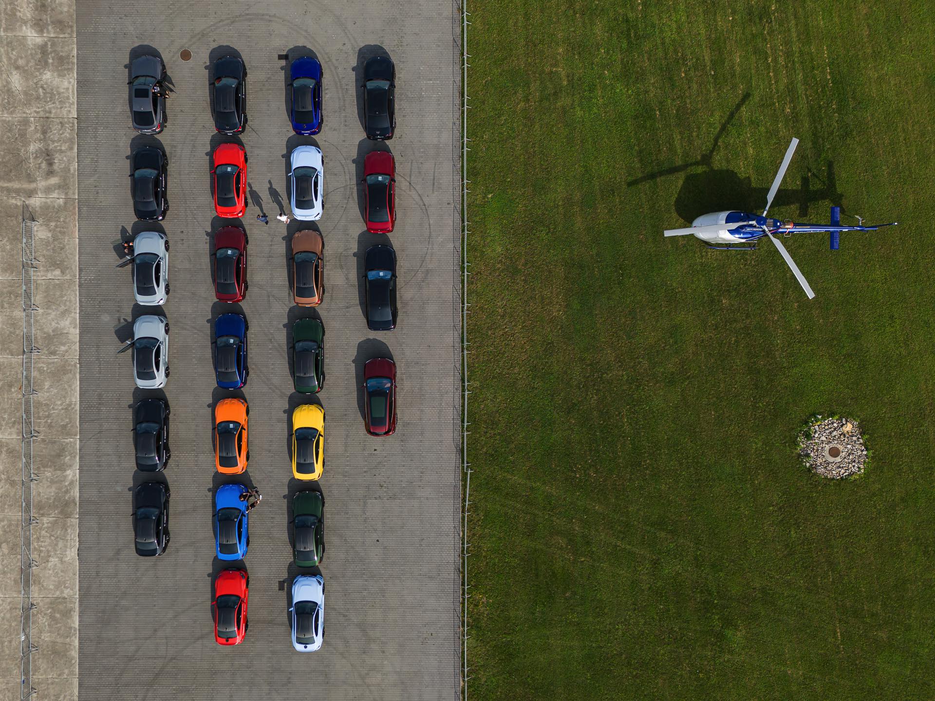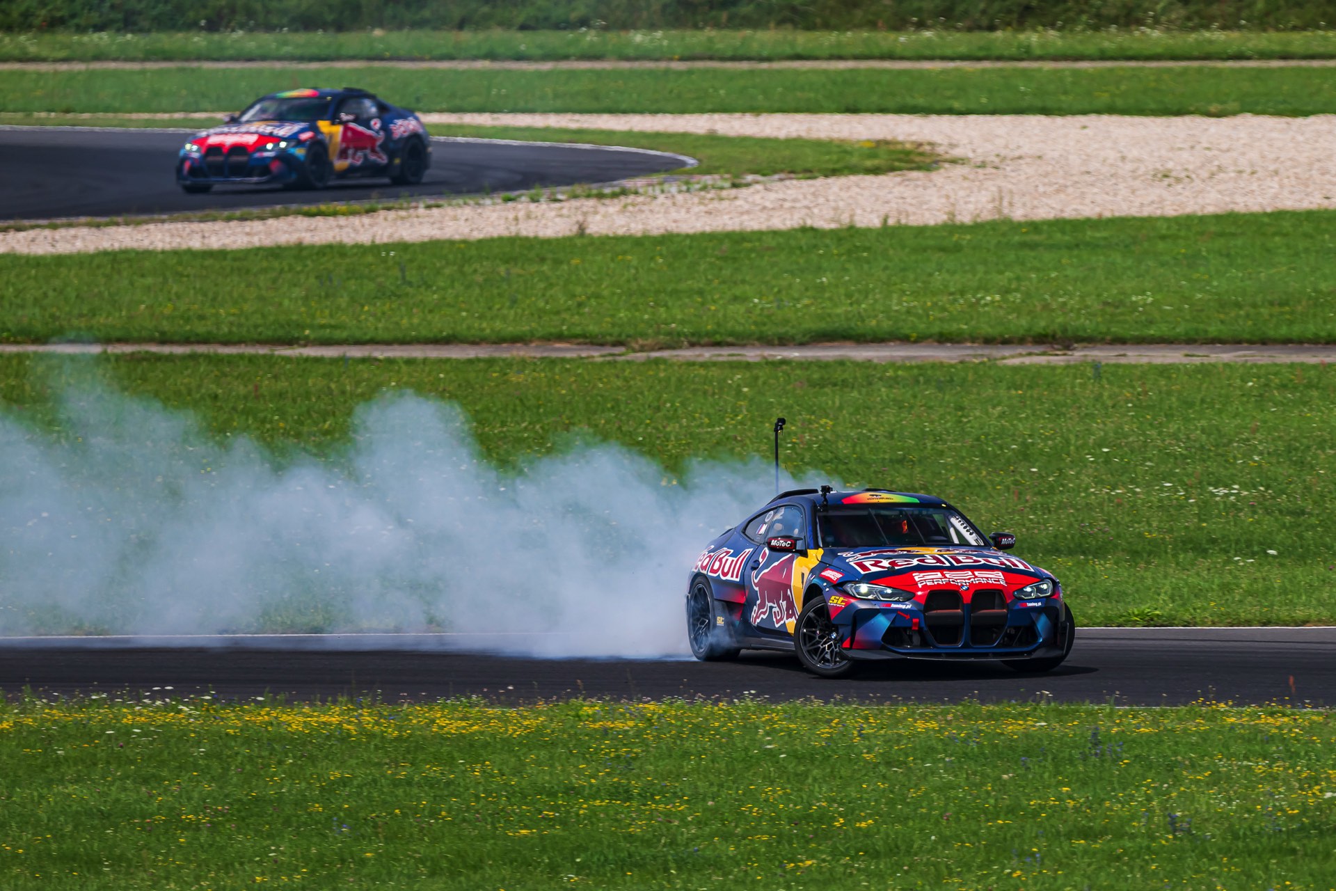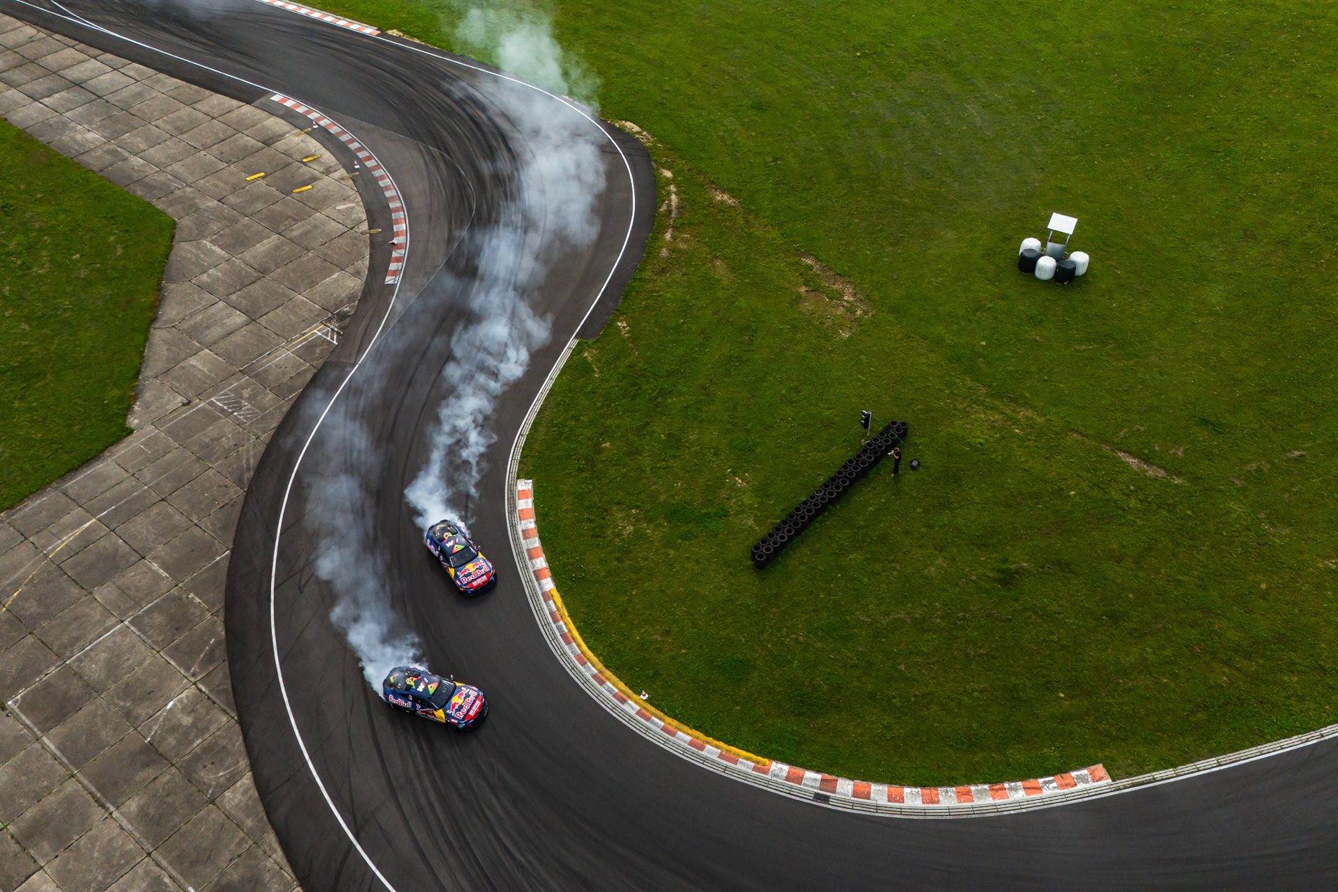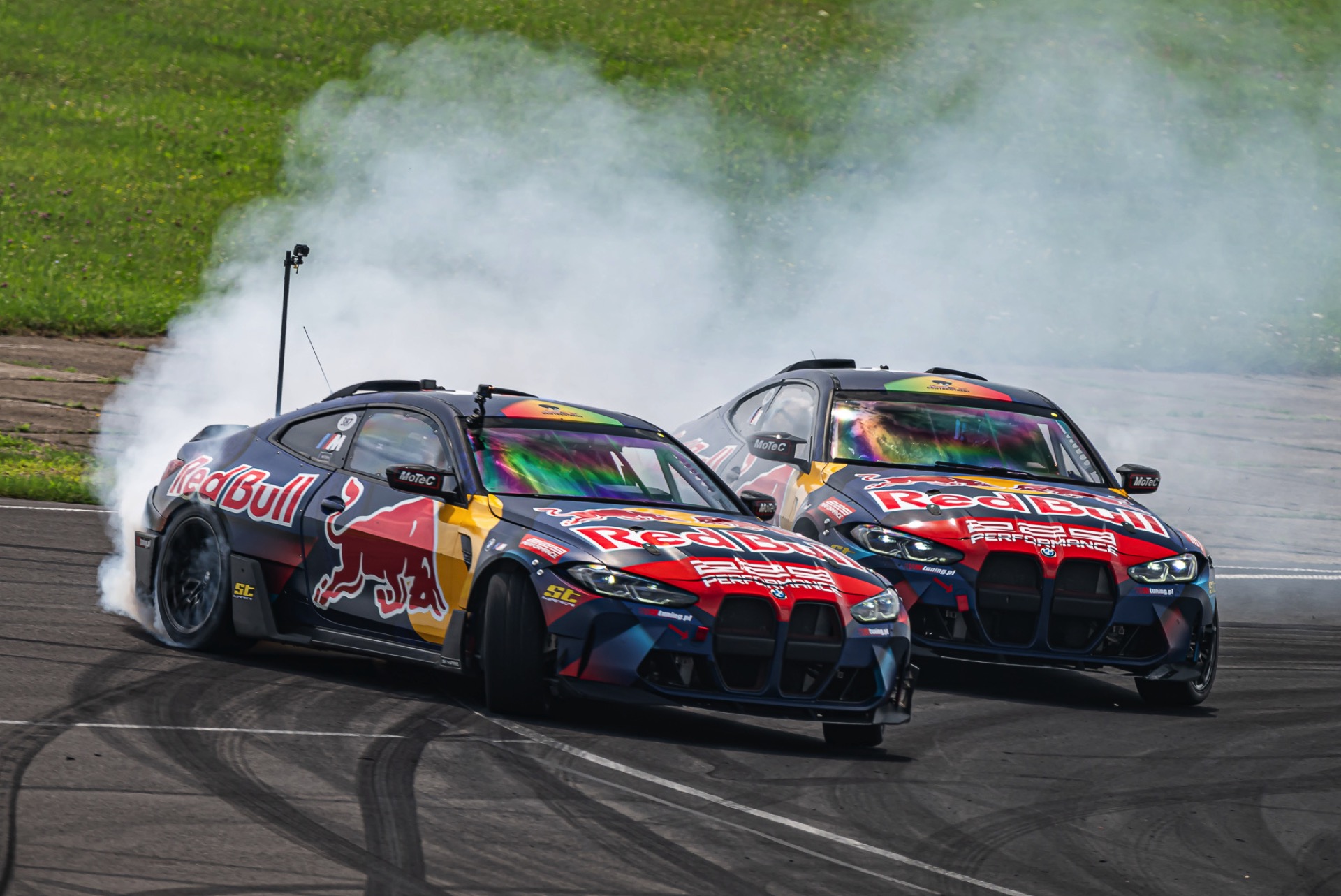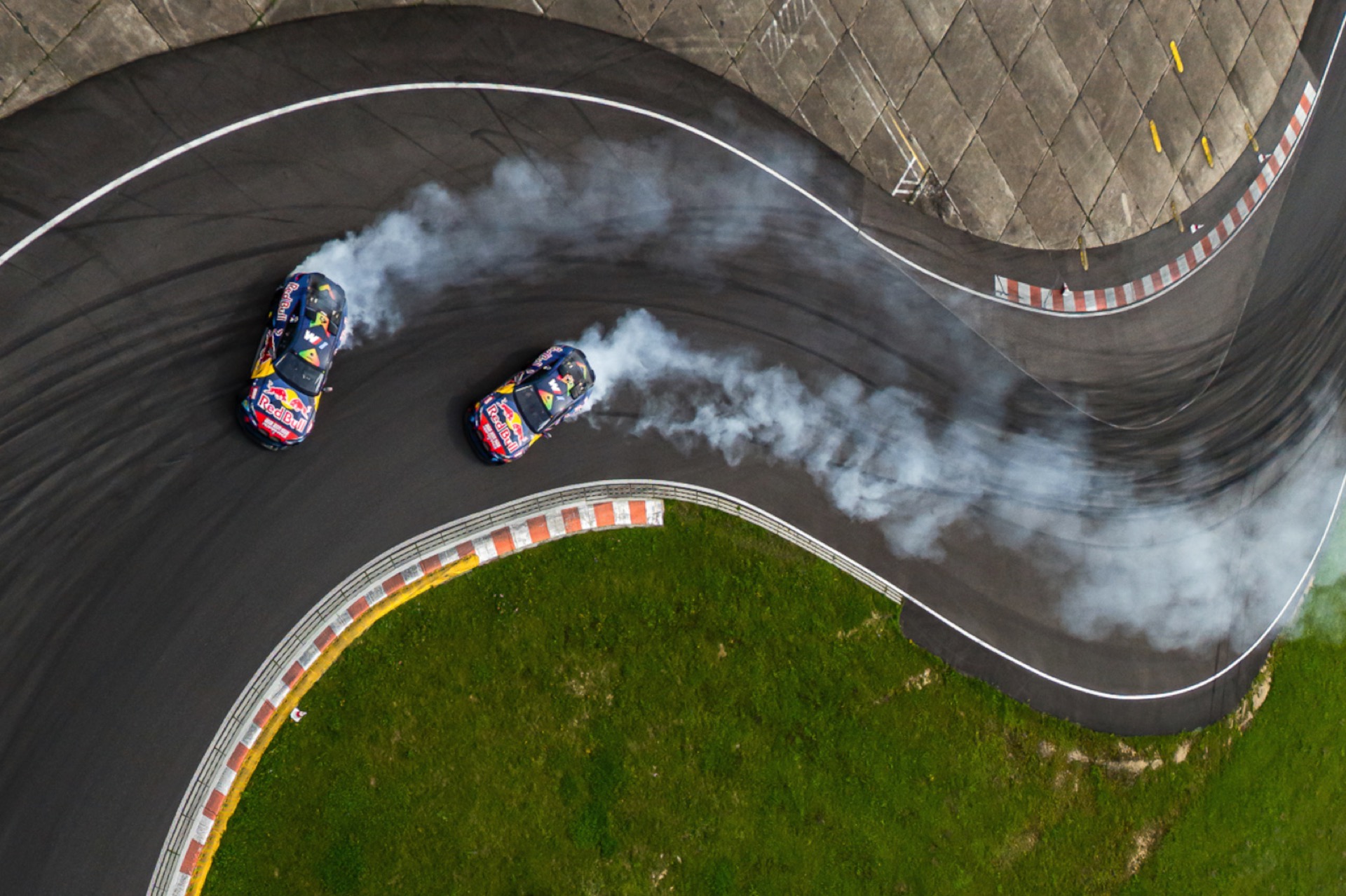 Fortgesetzt wurde die Red Bull Air-Show auf dem Asphalt, denn hier waren die Red Bull Driftbrothers unterwegs und lieferten eine spektakuläre Drift-Show. Von den Stunts der Red Bull Driftbrothers gibt es einige sehenswerte Fotos, die die hohe Kunst des kontrollierten Übersteuerns sichtbar machen. Wie üblich lösen sich die mit über 1.000 PS und offiziell rund 1.300 Newtonmeter Drehmoment angetriebenen Hinterräder dabei sehenswert in Rauch auf, was auch aus der Drohnen-Perspektive für spektakuläre Bilder sorgt.