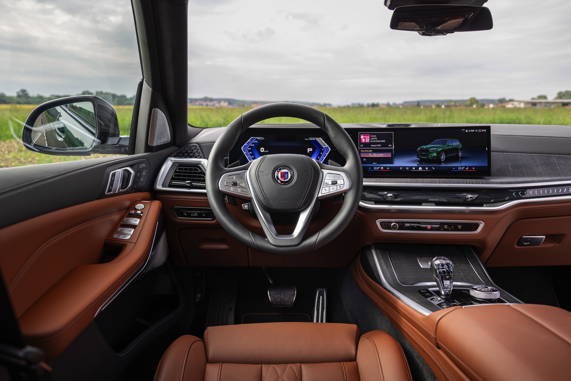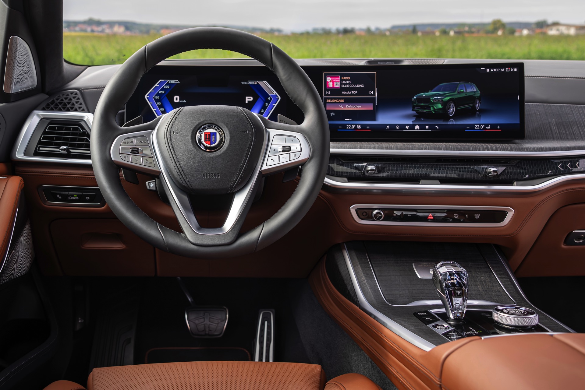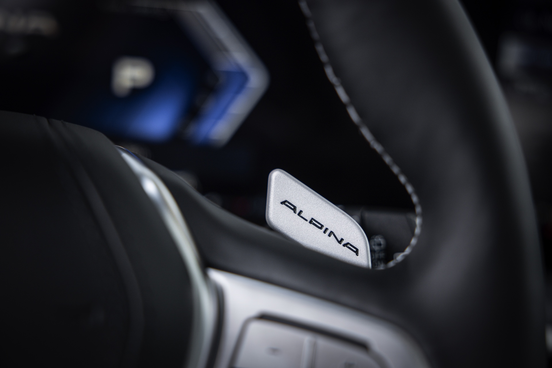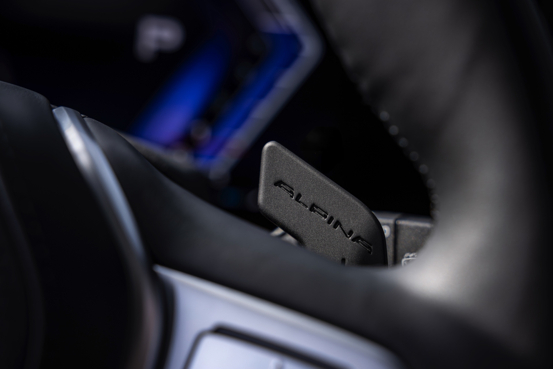 Im Innenraum kommt der BMW Alpina XB7 Manufaktur, dessen durchnummerierte Plaketten wieder mit der 001 beginnen, mit erweiterten Lederumfängen: Sowohl die Lenksäule als auch die Sitzblenden vorne und hinten sind immer beledert, hinzu kommen eine XB7-Prägung in den Kopfstützen und passen zur gewählten Exterieur-Line gefärbte Switchtronic-Schaltwippen am Lenkrad.