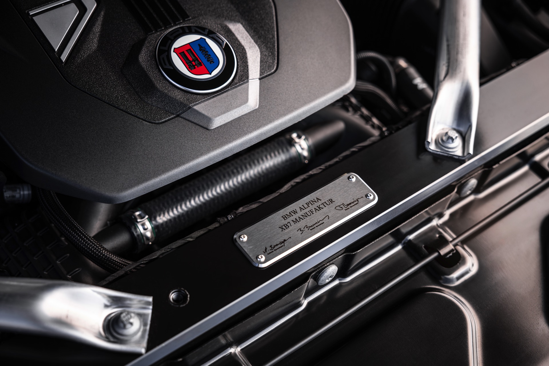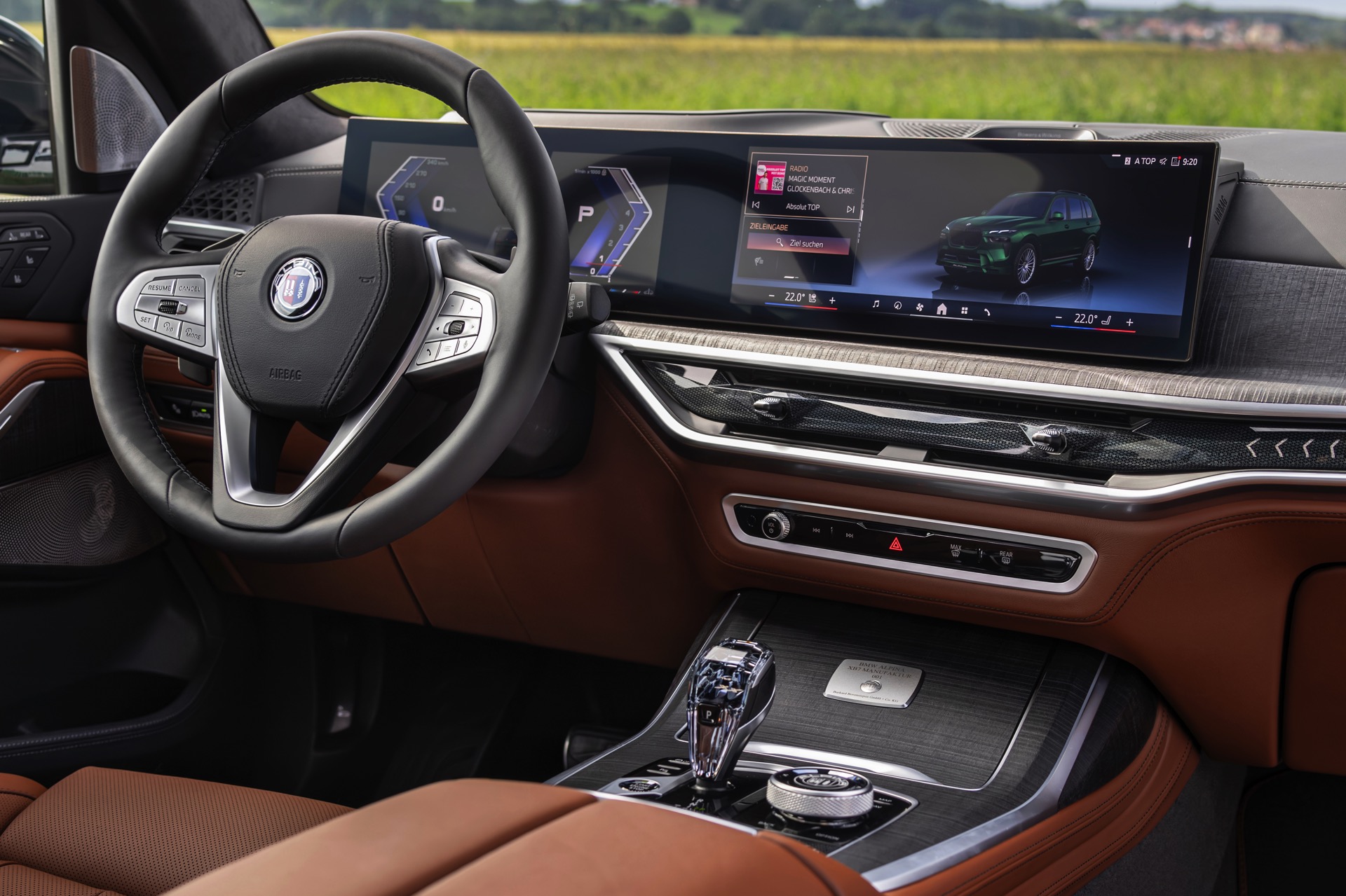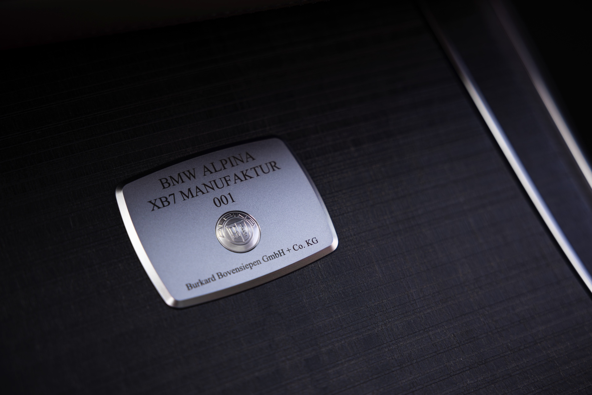 Im Innenraum kommt der BMW Alpina XB7 Manufaktur, dessen durchnummerierte Plaketten wieder mit der 001 beginnen, mit erweiterten Lederumfängen: Sowohl die Lenksäule als auch die Sitzblenden vorne und hinten sind immer beledert, hinzu kommen eine XB7-Prägung in den Kopfstützen und passen zur gewählten Exterieur-Line gefärbte Switchtronic-Schaltwippen am Lenkrad.