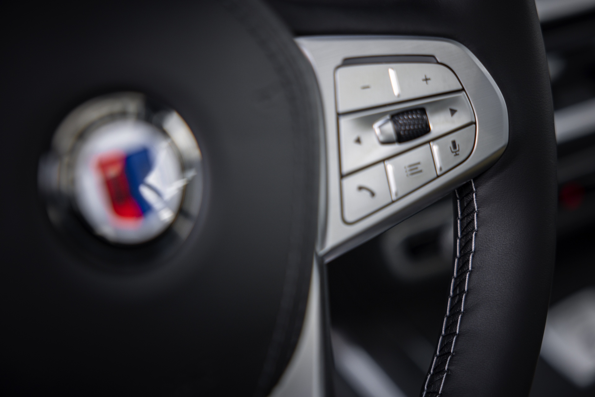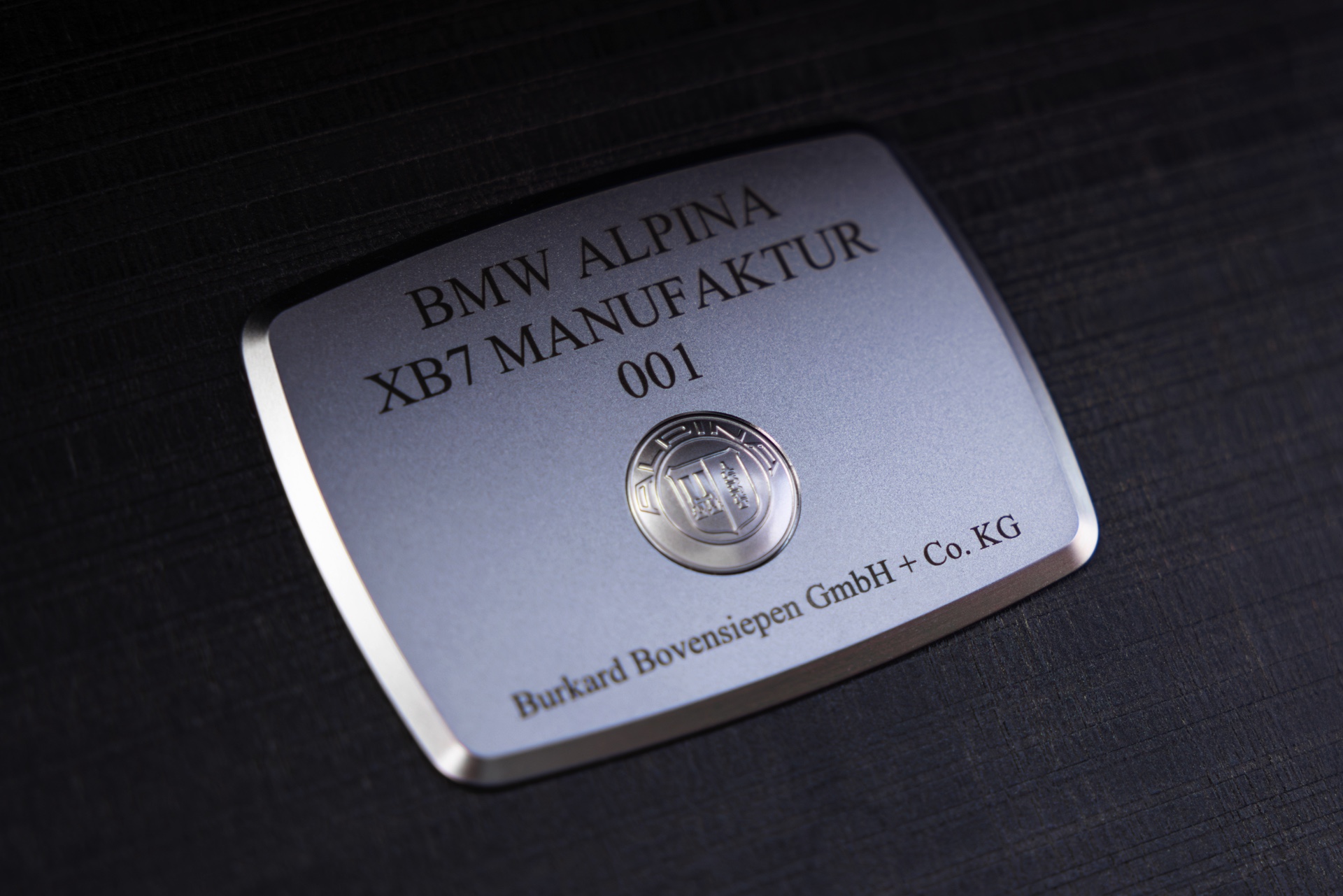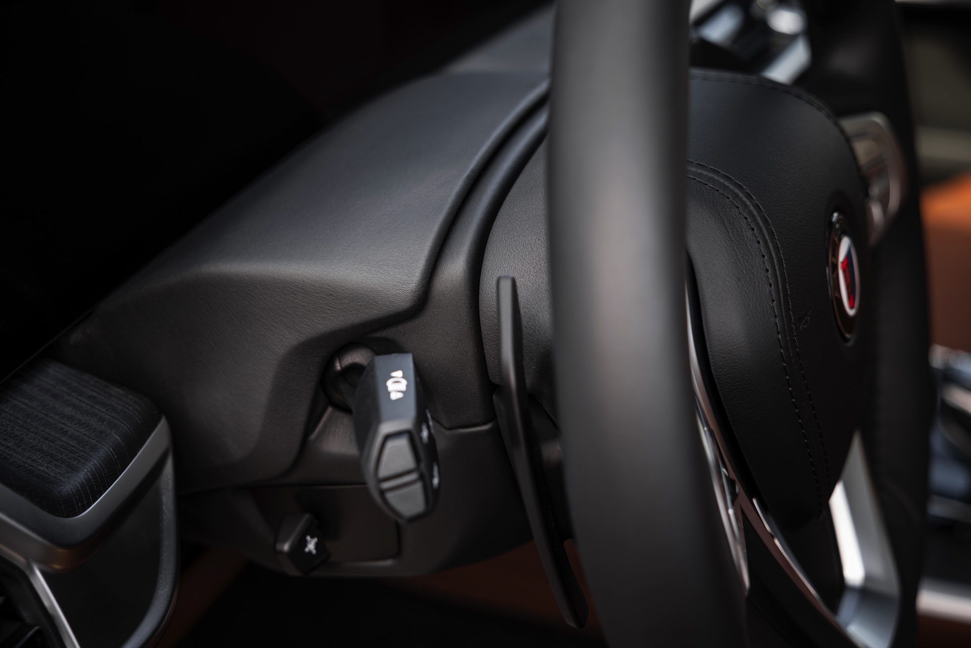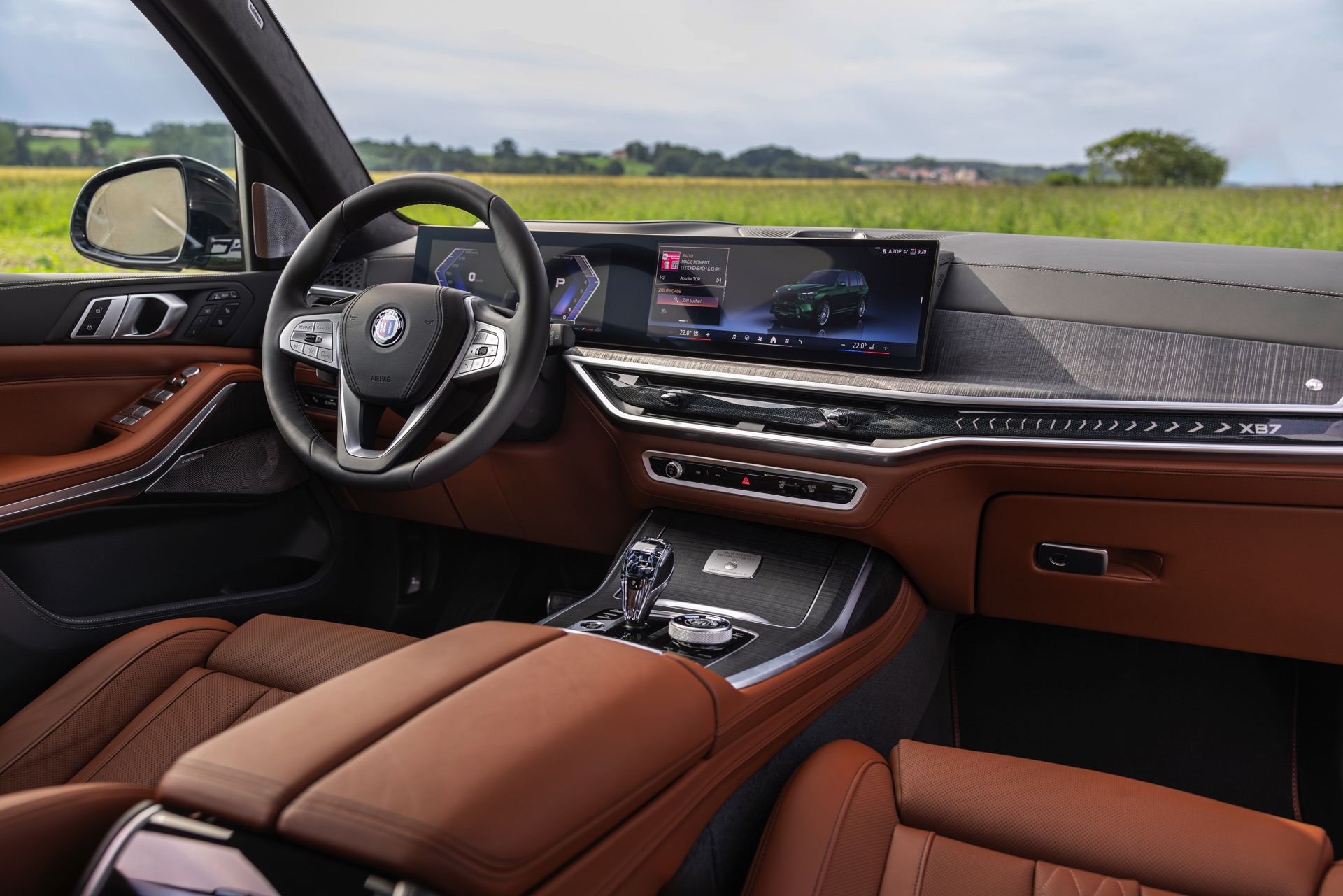 Im Innenraum kommt der BMW Alpina XB7 Manufaktur, dessen durchnummerierte Plaketten wieder mit der 001 beginnen, mit erweiterten Lederumfängen: Sowohl die Lenksäule als auch die Sitzblenden vorne und hinten sind immer beledert, hinzu kommen eine XB7-Prägung in den Kopfstützen und passen zur gewählten Exterieur-Line gefärbte Switchtronic-Schaltwippen am Lenkrad.