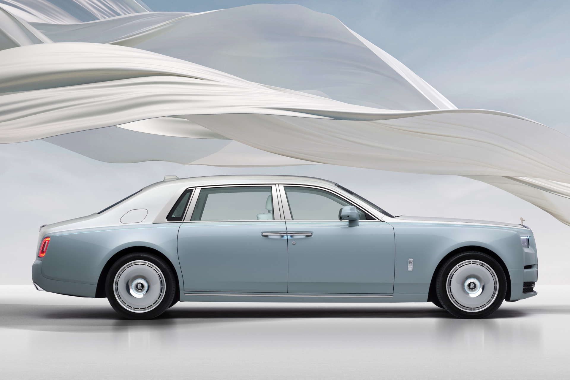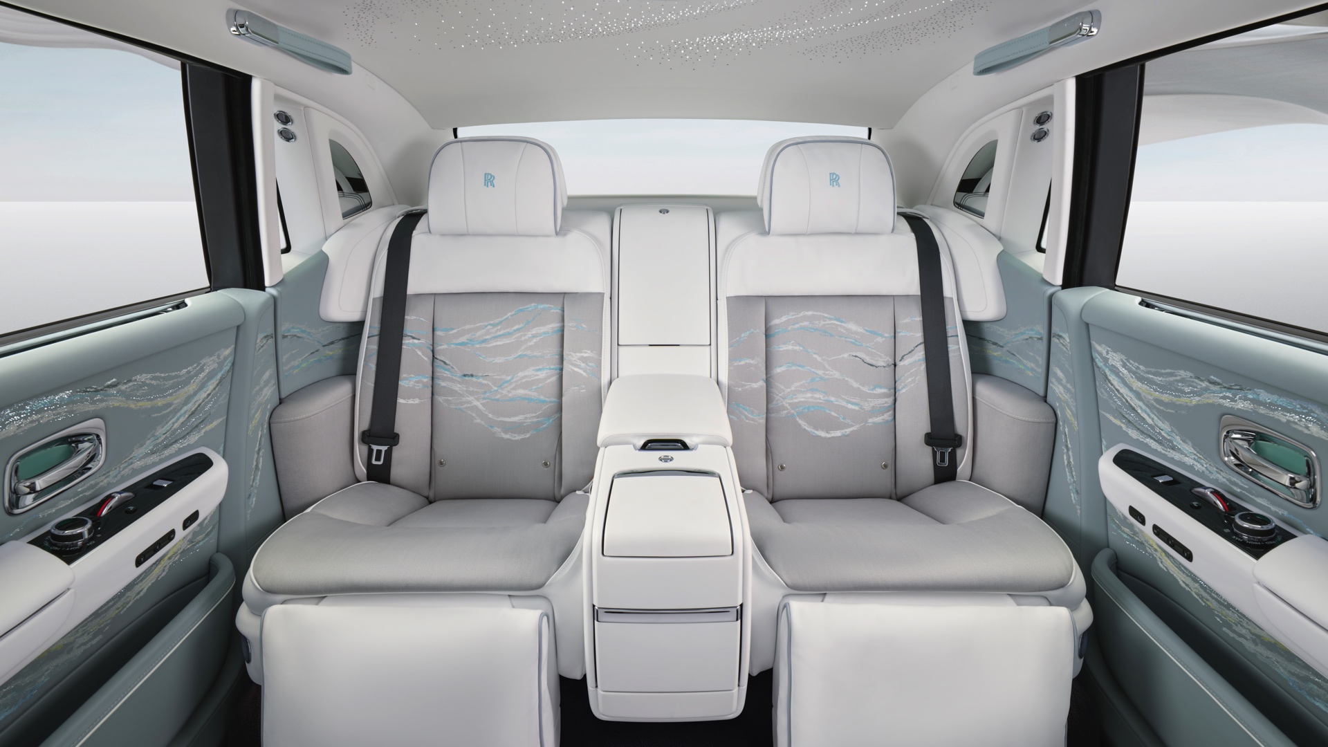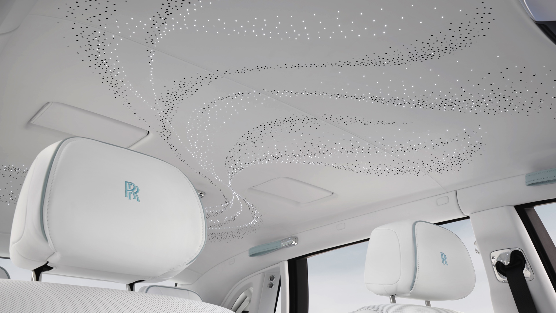 Die sanften Farben des Exterieurs und die Formen der Spirit of Ecstasy werden auch im Innenraum aufgegriffen und sorgen für eine beruhigende Atmosphäre: Mit Blue Grey, Arctic White, Spirit Blue, Powder Blue und Pastel Yellow kommen gleich fünf verschiedene Farben zum Einsatz und erinnern an die Eleganz eines im Wind wehenden Tuchs. Der charakteristische Look wird dabei erstreckt sich von den Interieurleisten über die Türen und Sitze bis hin zum Dachhimmel, dessen 1.500 Starlight-LEDs das Muster ebenfalls aufgreifen und gerade bei Nacht noch zusätzlich betonen.