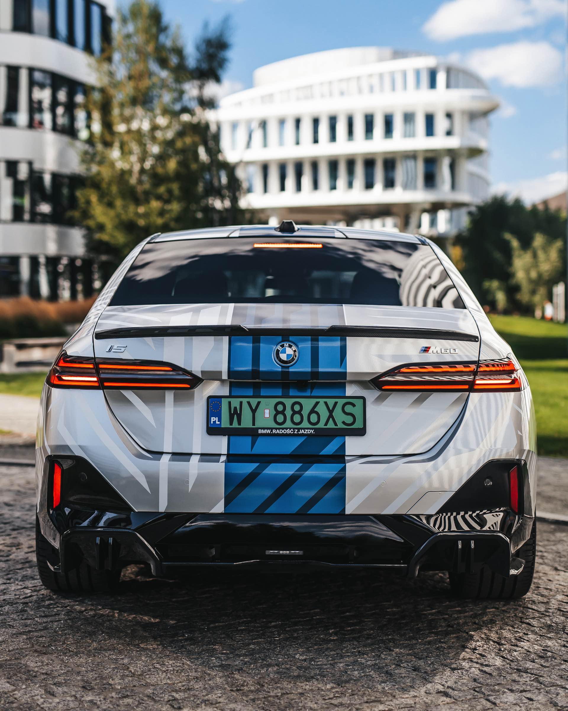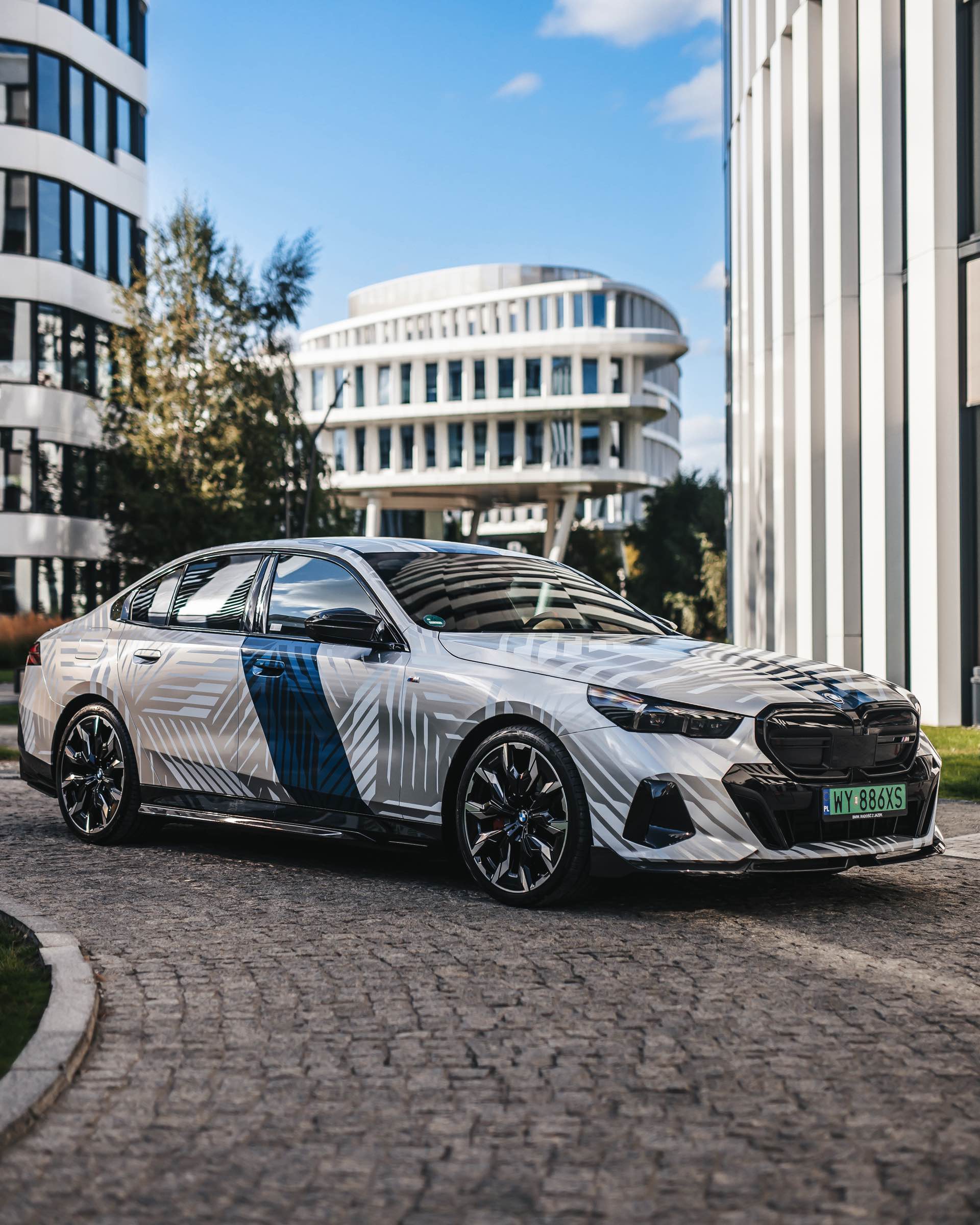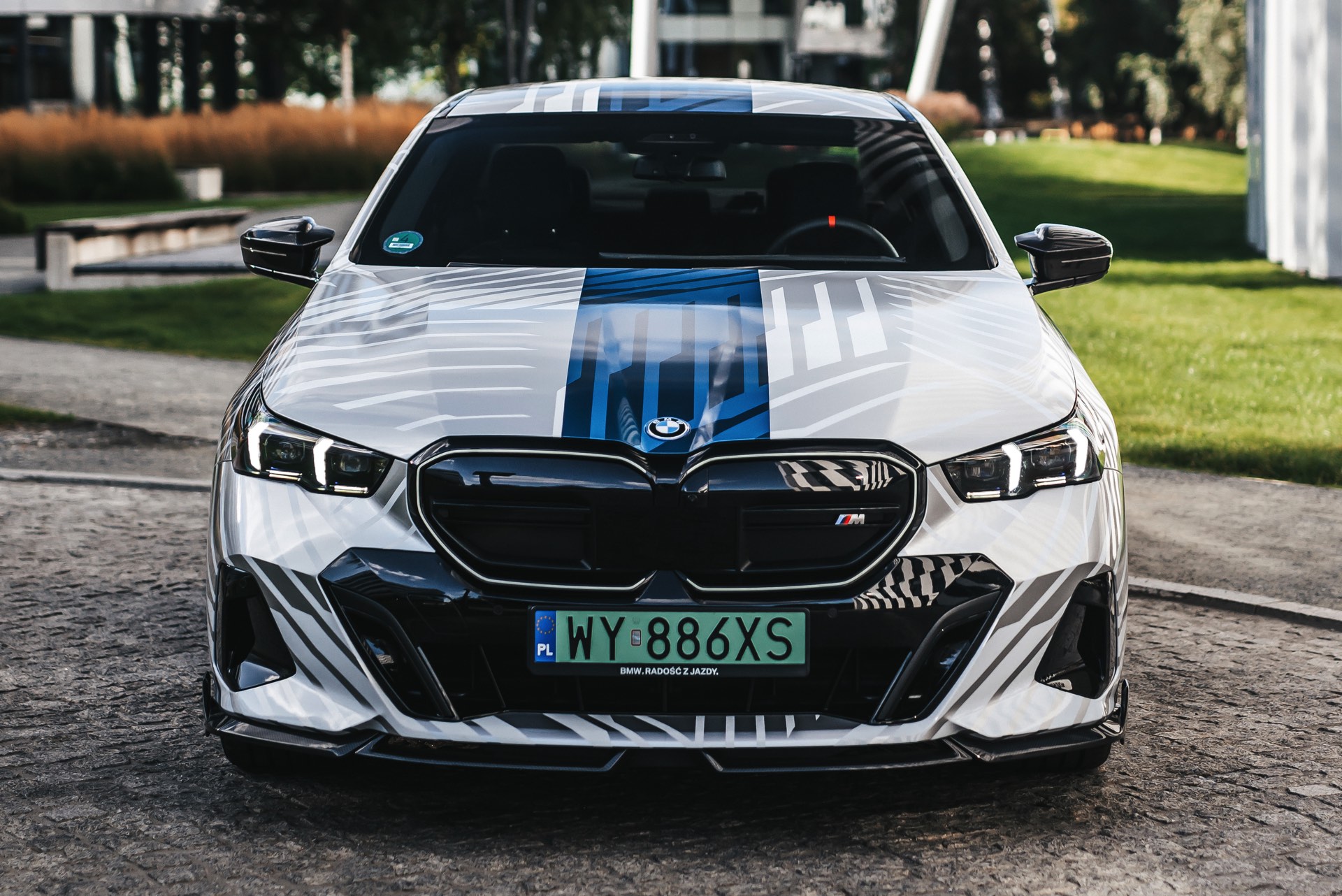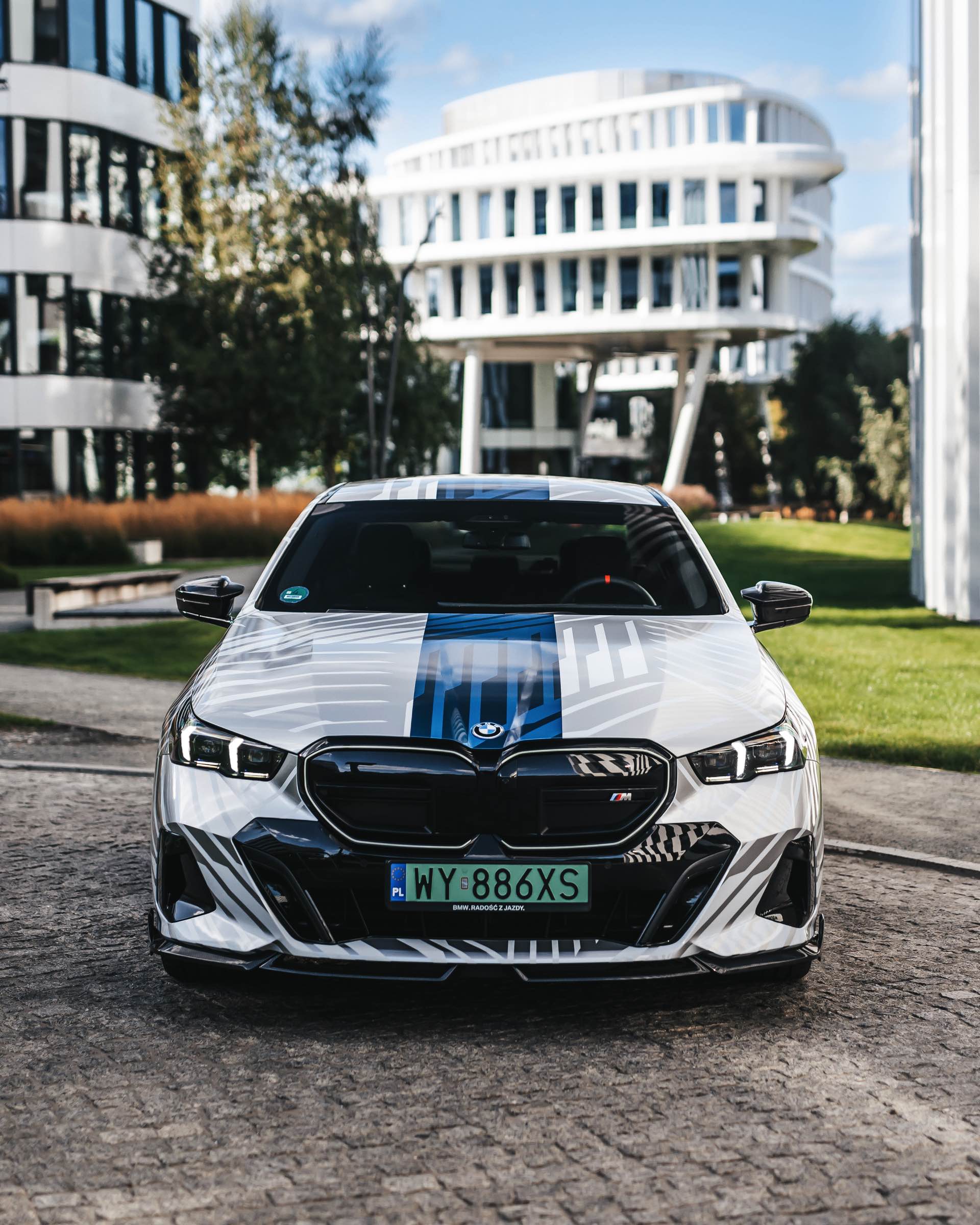 Wie stark sich der Look des neuen BMW 5er (G60) verändern und damit auch individualisieren lässt, zeigt ein spannendes Showcar aus Polen. Auf Basis des BMW i5 M60 haben unsere Nachbarn ein Fahrzeug aufgebaut, das nicht nur mit seiner auffälligen Folierung punktet: Der Elektro-5er trägt auch zahlreiche Tuning-Teile aus dem Programm von BMW M Performance und zeigt, welches Carbon-Zubehör für das Exterieur erhältlich ist. Hingucker Nummer 1 ist aber ohne Frage die Folierung, die Auge und Hirn mit silbernen Streifen und mehreren blauen Streifen auf weißem Grund vor Herausforderungen stellt – gerade in wechselhaftem Licht scheint bei keiner Linie so ganz klar, ob sie nun Teil der Folierung oder doch nur ein Ergebnis von Schatten und Reflektionen ist.