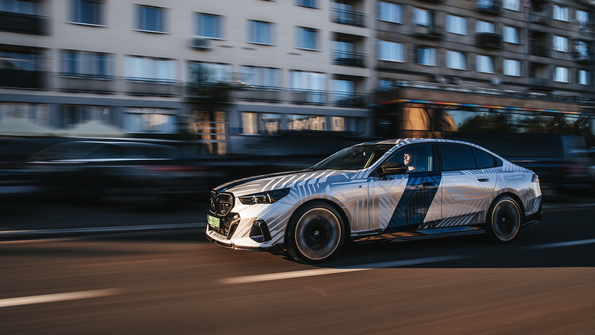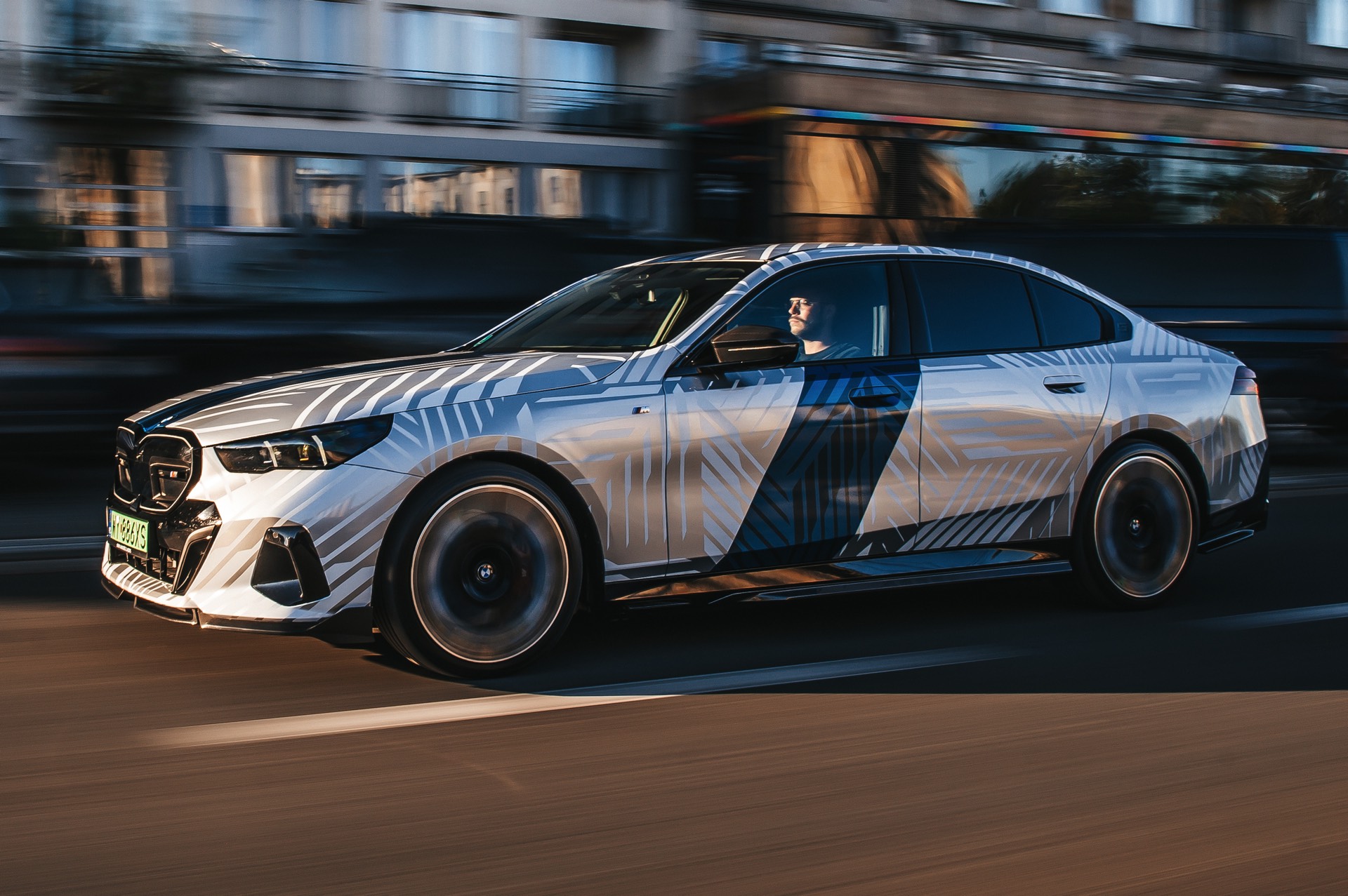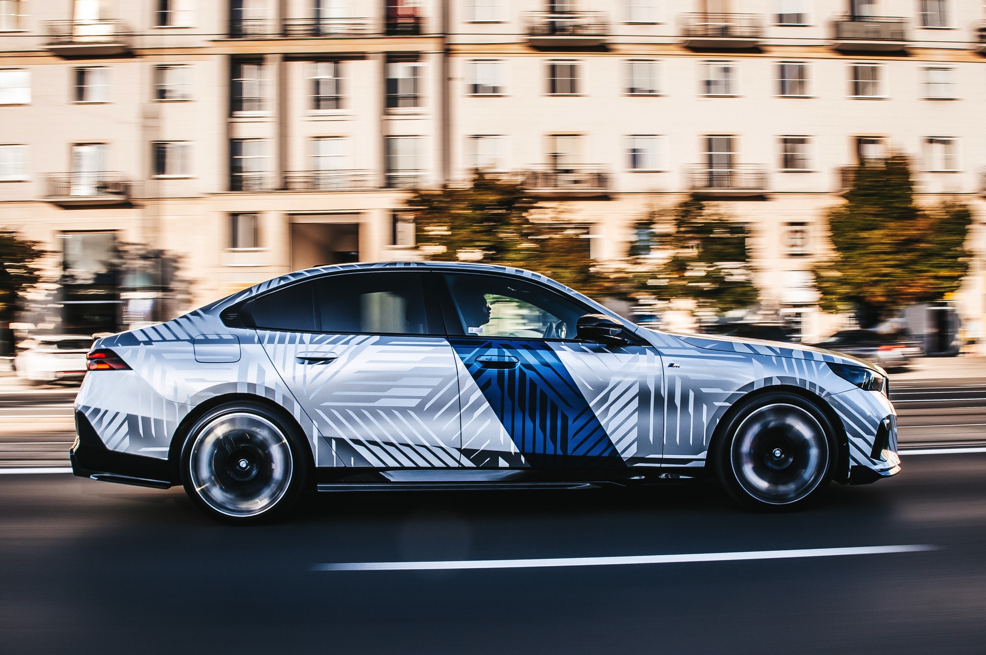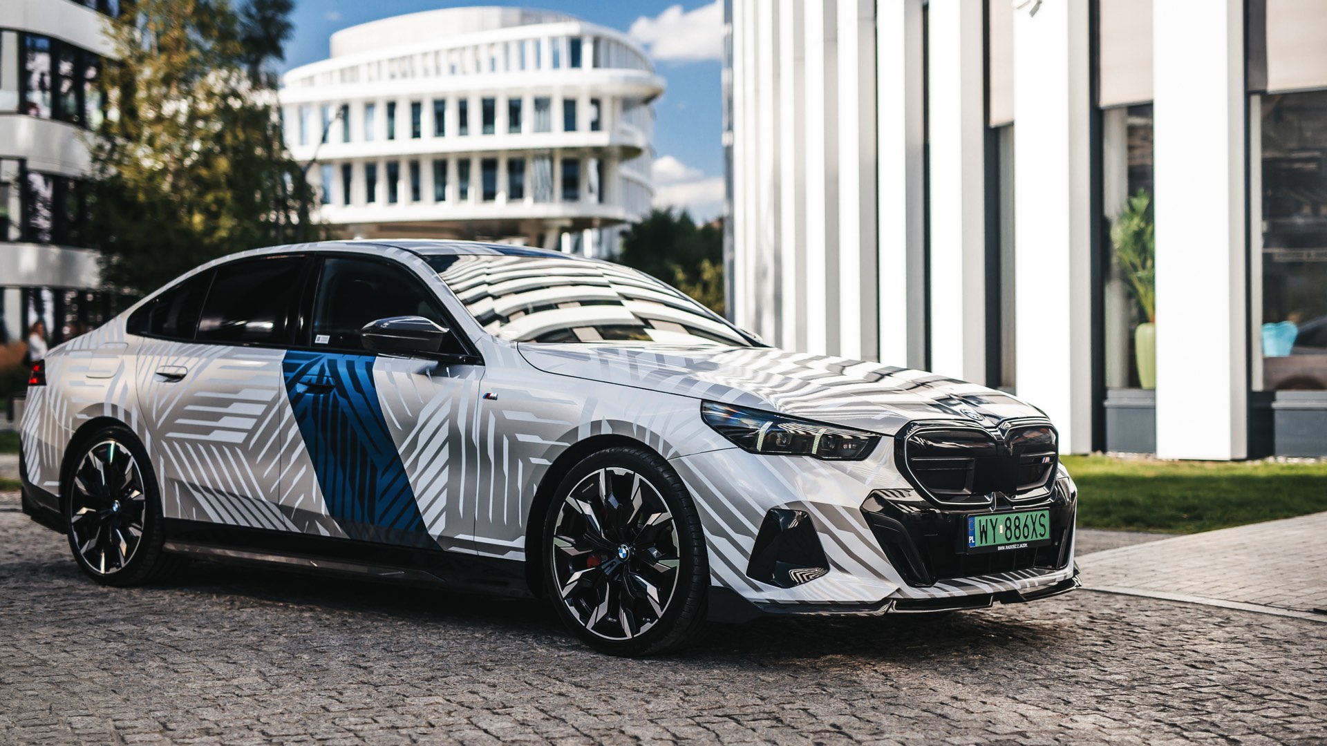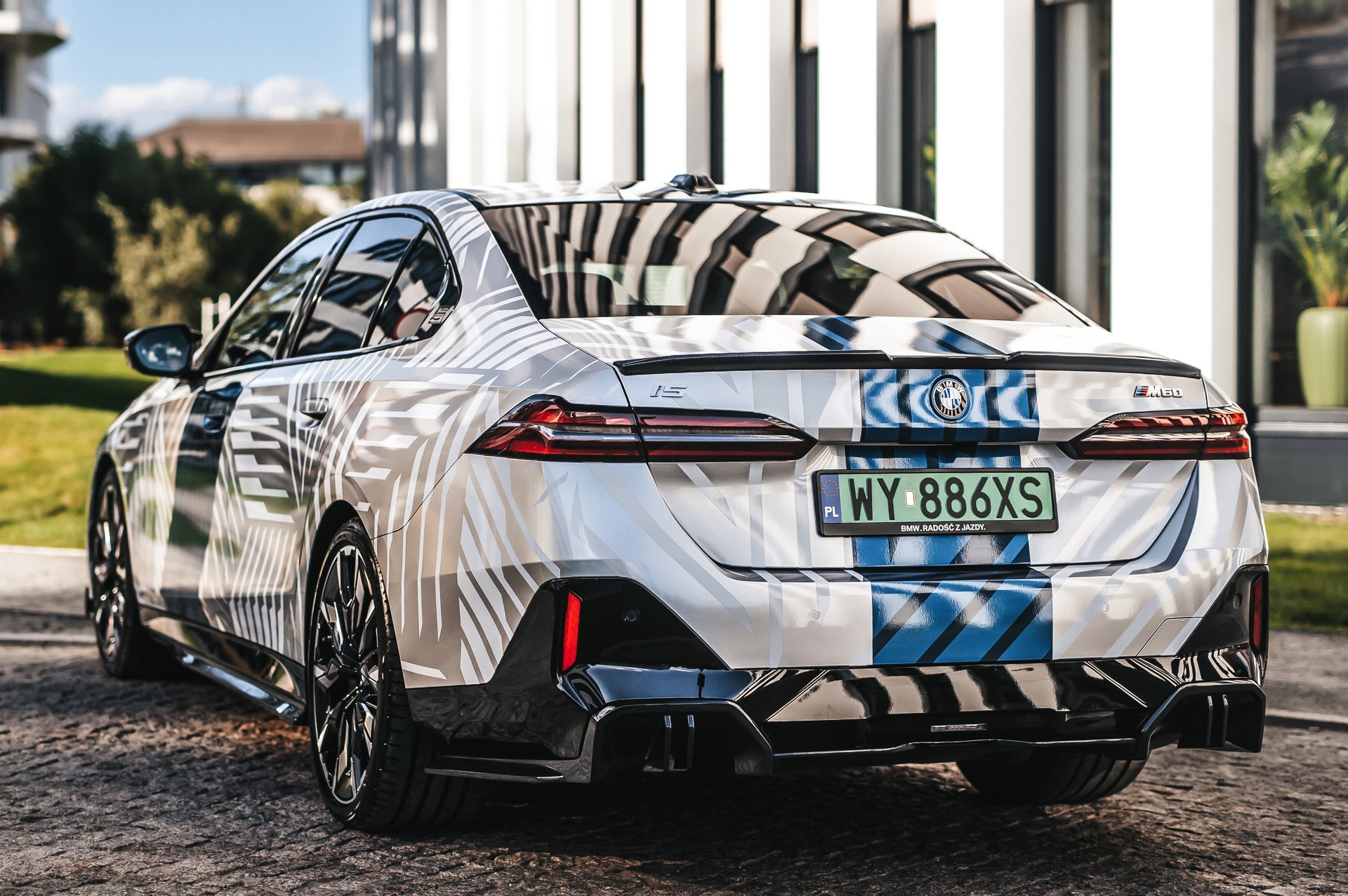 Wie stark sich der Look des neuen BMW 5er (G60) verändern und damit auch individualisieren lässt, zeigt ein spannendes Showcar aus Polen. Auf Basis des BMW i5 M60 haben unsere Nachbarn ein Fahrzeug aufgebaut, das nicht nur mit seiner auffälligen Folierung punktet: Der Elektro-5er trägt auch zahlreiche Tuning-Teile aus dem Programm von BMW M Performance und zeigt, welches Carbon-Zubehör für das Exterieur erhältlich ist. Hingucker Nummer 1 ist aber ohne Frage die Folierung, die Auge und Hirn mit silbernen Streifen und mehreren blauen Streifen auf weißem Grund vor Herausforderungen stellt – gerade in wechselhaftem Licht scheint bei keiner Linie so ganz klar, ob sie nun Teil der Folierung oder doch nur ein Ergebnis von Schatten und Reflektionen ist.
