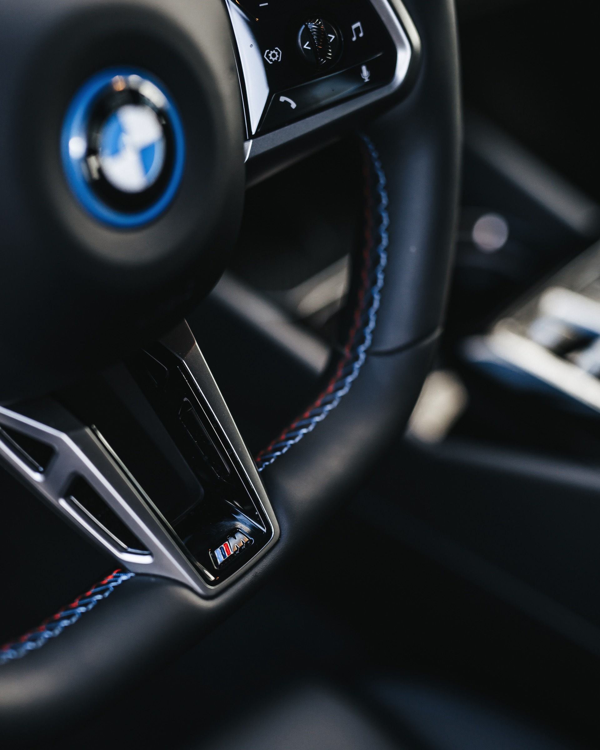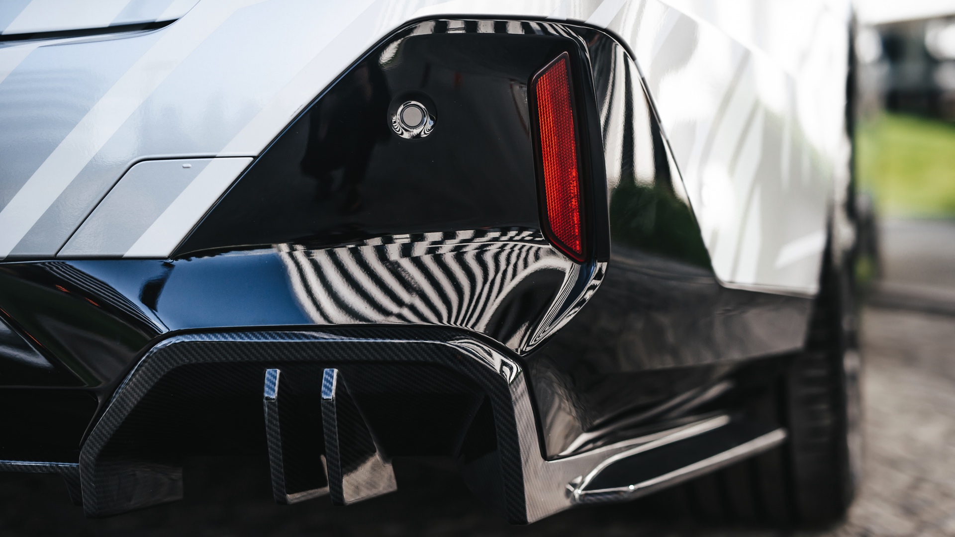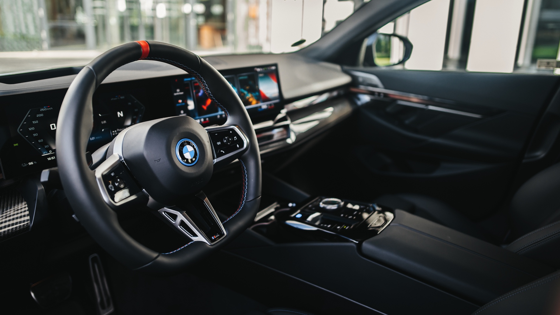 Zu den M Performance Parts in Sicht-Carbon zählen der Frontsplitter-Aufsatz, die Seitenschweller und die Diffusor-Aufsätze für die Heckschürze – letztere betonen die Position der Endrohre und weisen so noch deutlicher darauf hin, dass der über 600 PS starke Elektro-5er keinen Verbrenner an Bord hat und keine Abgase ausstößt. In gewisser Weise zwischen den Serien- und Tuning-Teilen rangieren die Carbon-Außenspiegel und die Carbon-Spoilerlippe auf der Heckklappe, denn diese sind als Bestandteil des M Carbon Exterieurpakets ebenfalls ab Werk erhältlich.