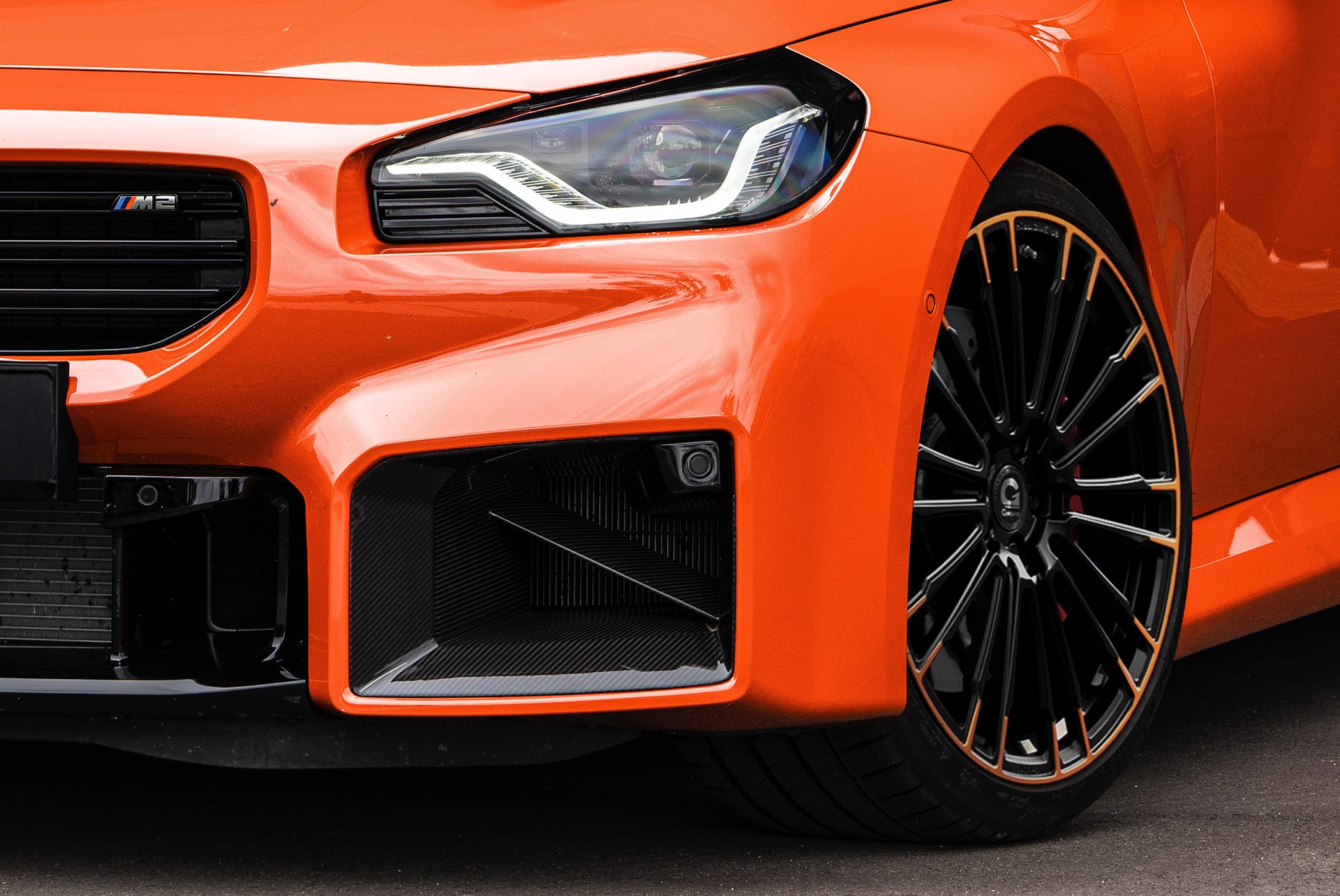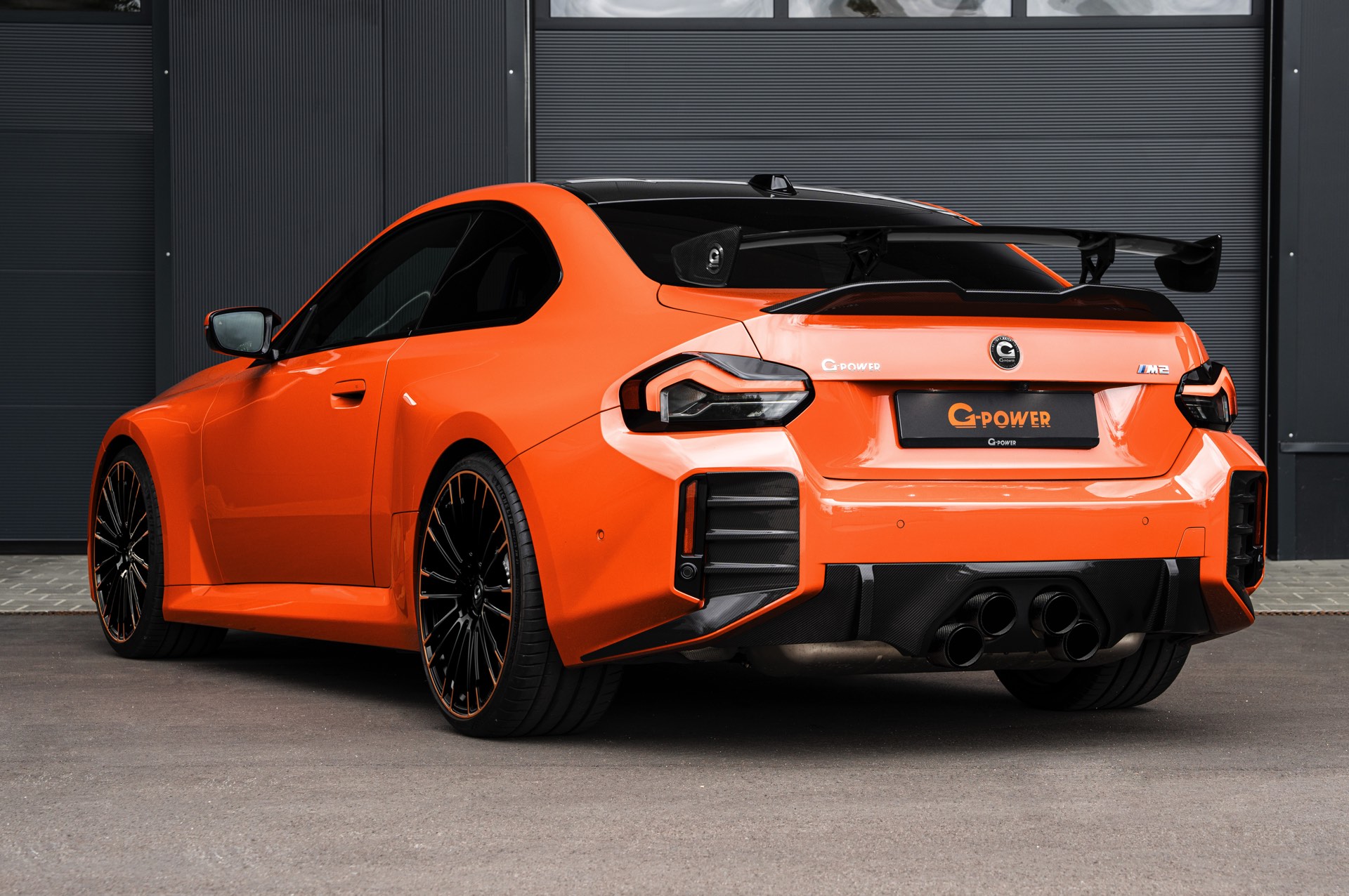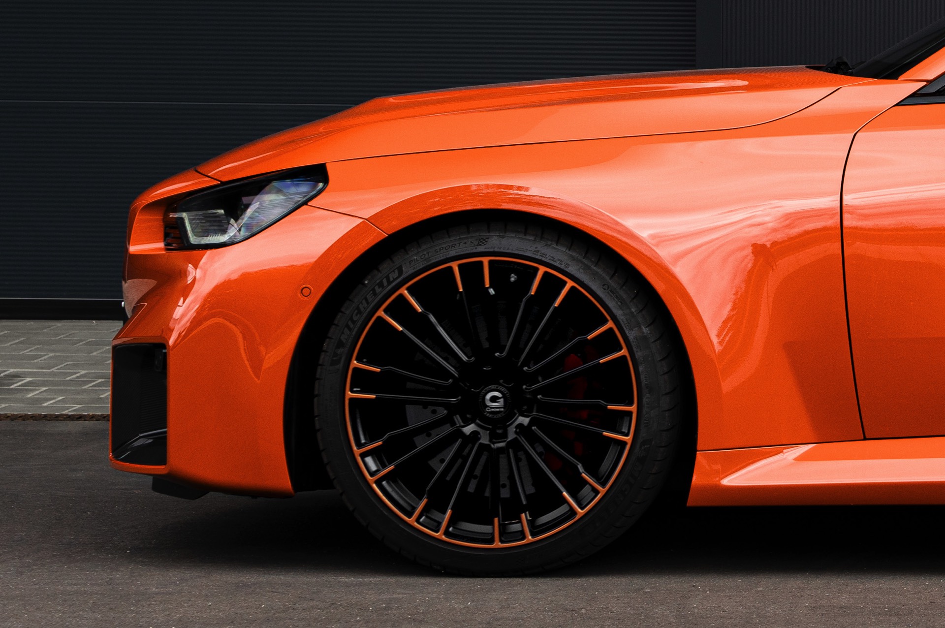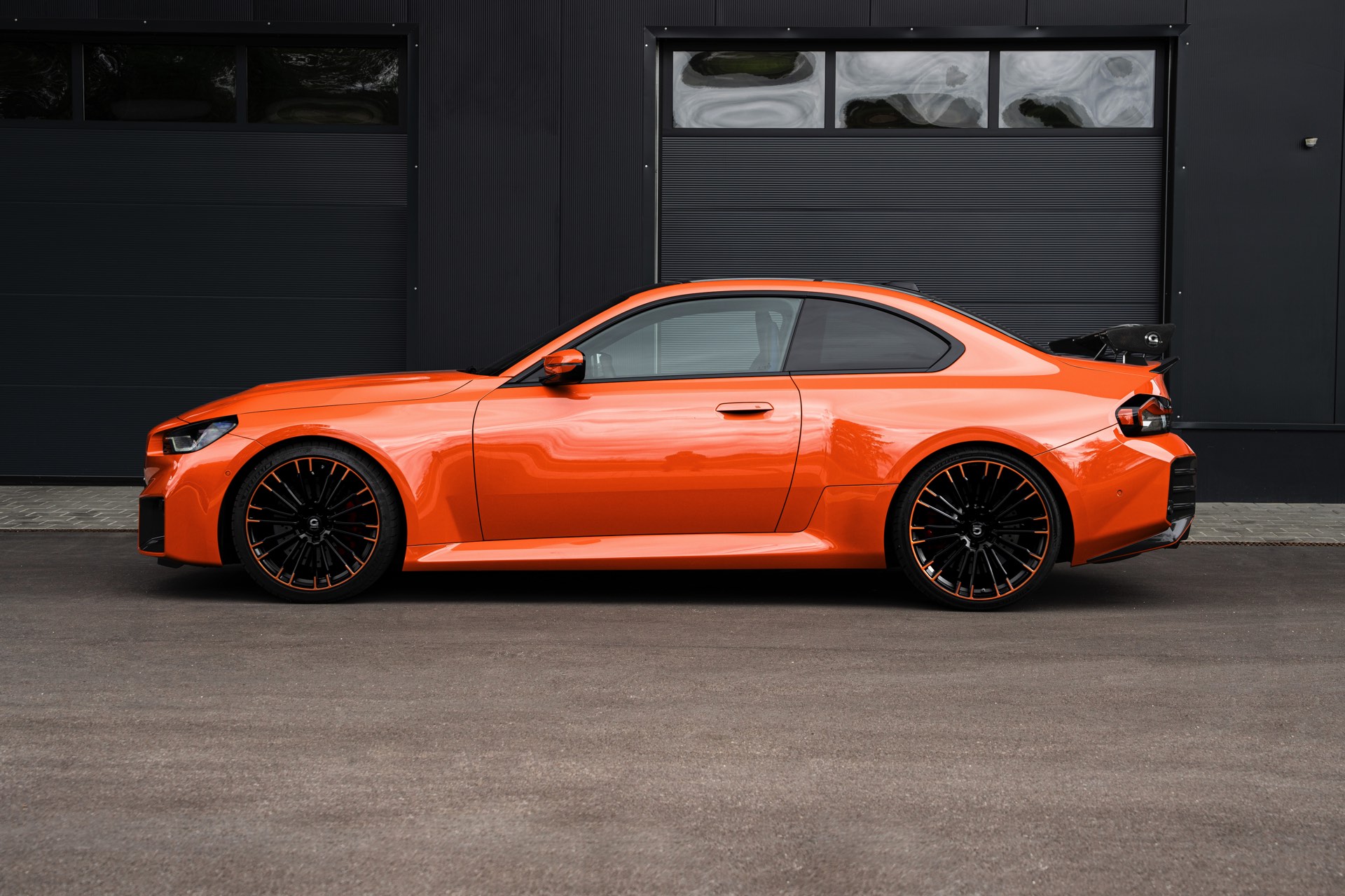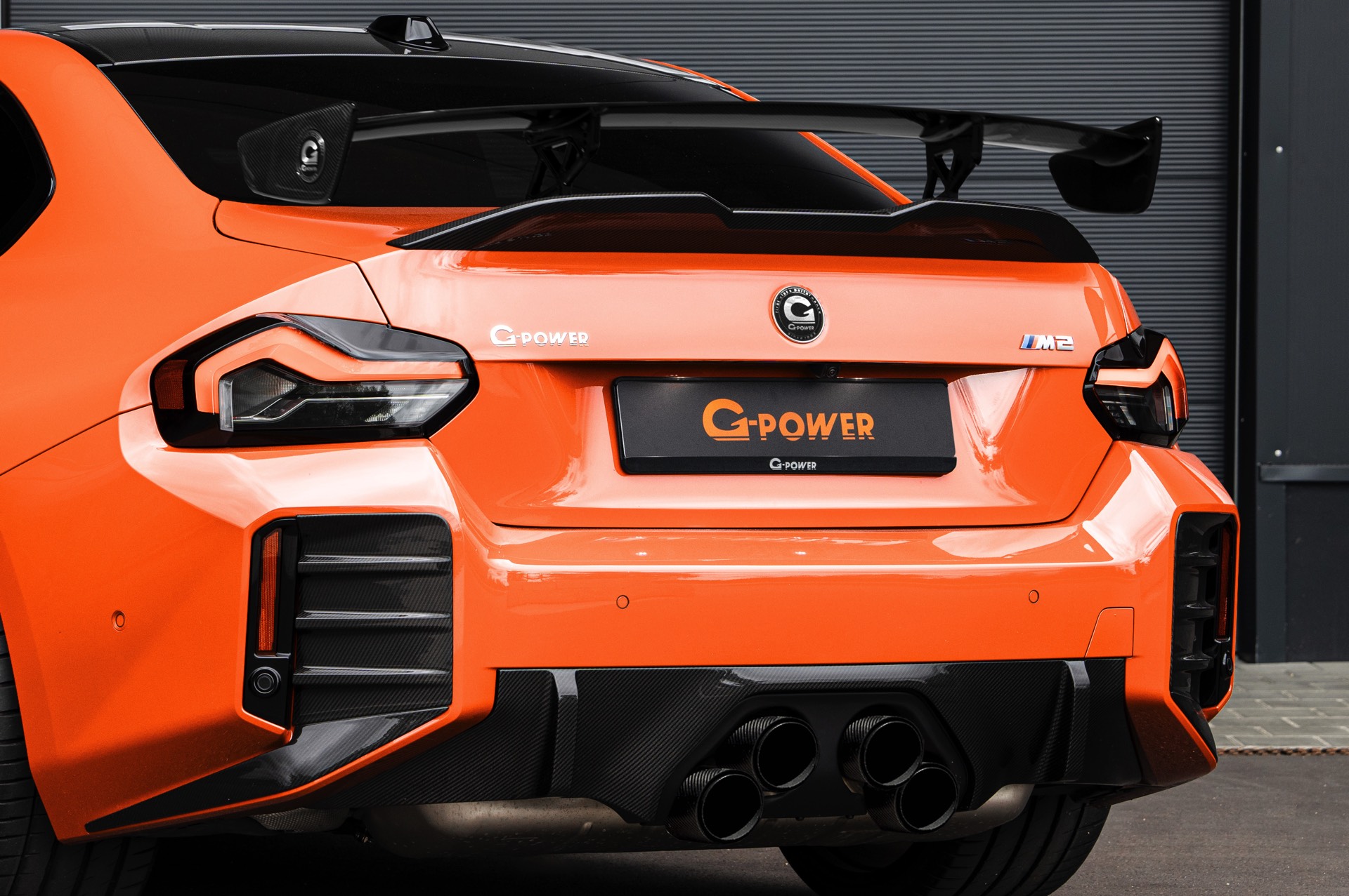Nicht nur in der Seitenansicht fallen außerdem die vorne 20 und hinten 21 Zoll großen Schmiedefelgen im Hurricane-Design ins Auge – und das auch, weil sie neben ihrer schwarzen Lackierung auch dezent die orange Karosseriefarbe aufgreifen. Demnächst will G-Power auch eine Carbon-Motorhaube für den BMW M2 (G87) anbieten und dabei an den Look der hauseigenen Venturi-Hauben für M3 und M4 anknüpfen.