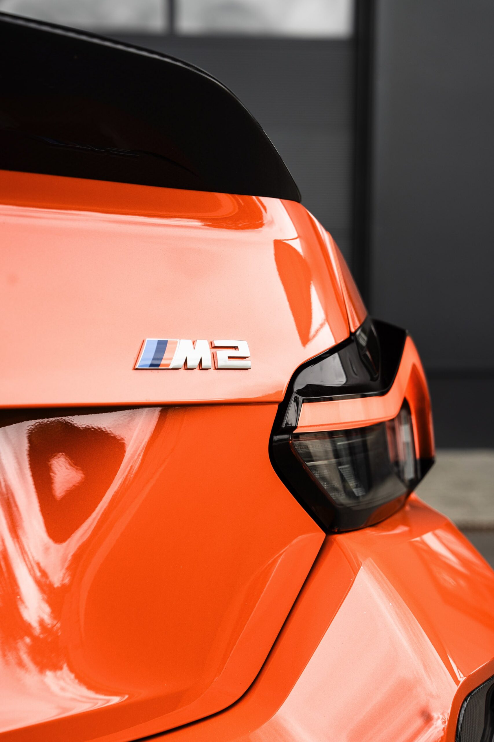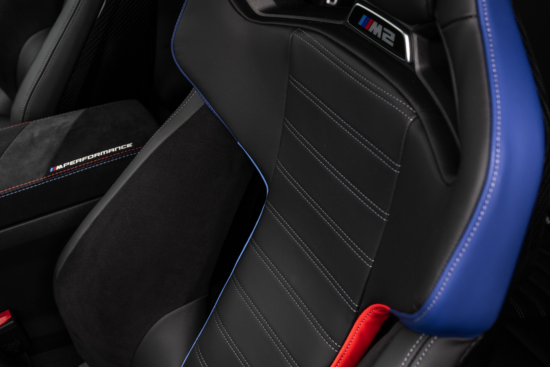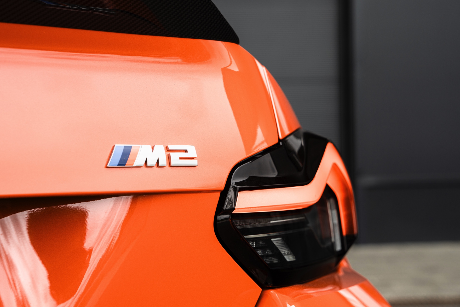 Neben der intensiven Farbe trägt der gezeigte BMW M2 nicht nur das ab Werk erhältliche Carbon-Dach, sondern auch einen großen Carbon-Heckflügel und eine markante Spoiler-Lippe. Weitere dunkle Akzente setzen die schwarzen Blenden an den vorderen Lufteinlässen und in der Heckschürze sowie die tief getönten Scheiben der Sonnenschutzverglasung. Ein weiterer Hingucker am Heck ist die M Performance Abgasanlage mit ihren vier trapezförmig angeordneten Endrohren, die auch Jahre nach ihrem Debüt immer wieder für Gesprächsstoff sorgt. "