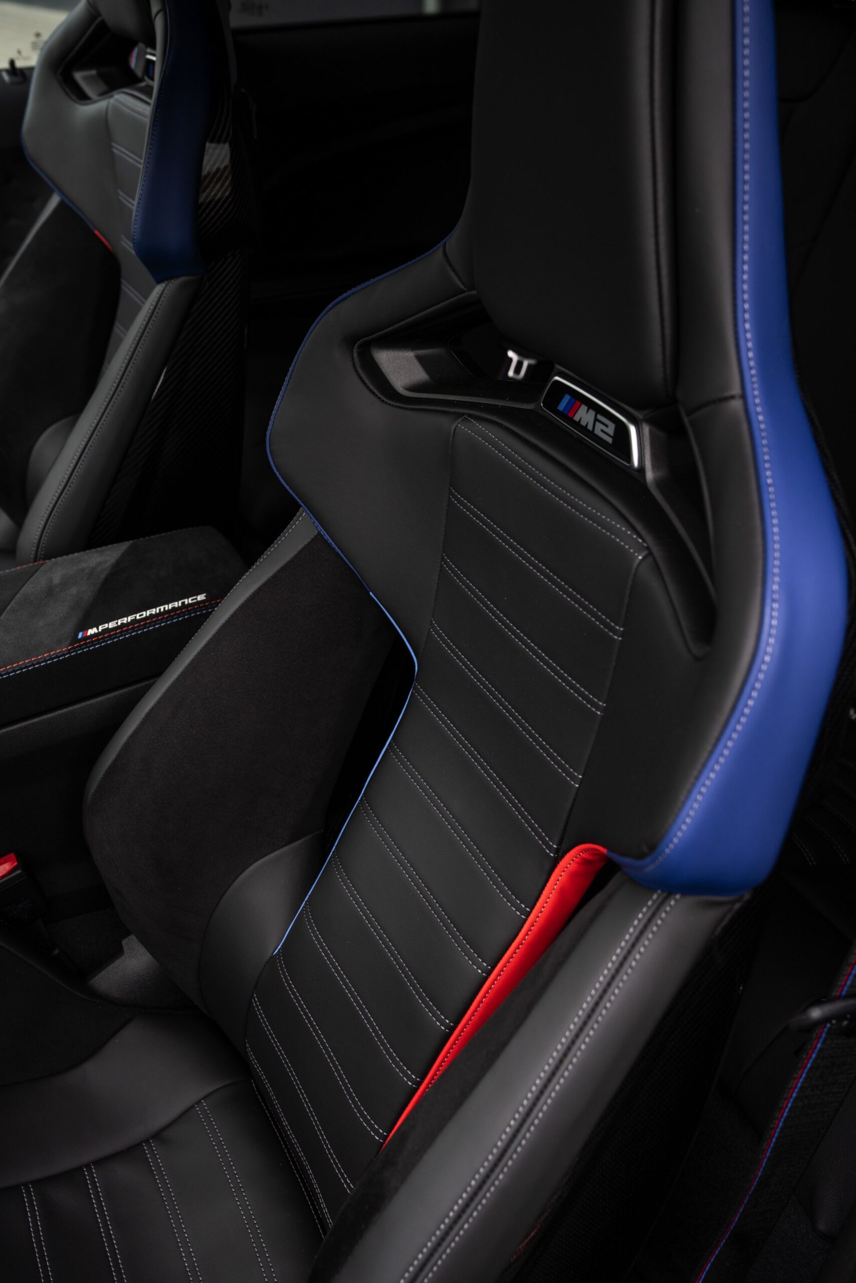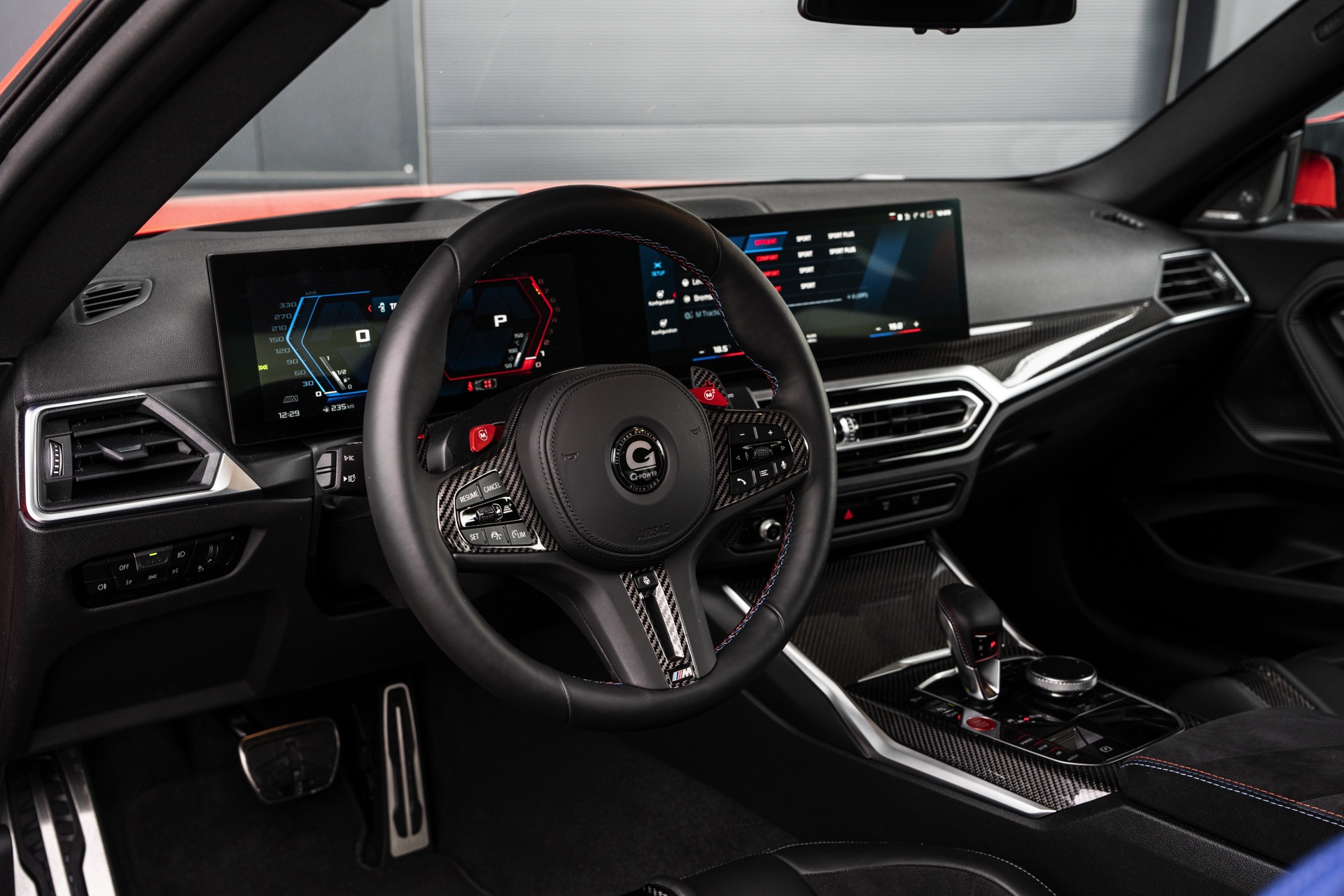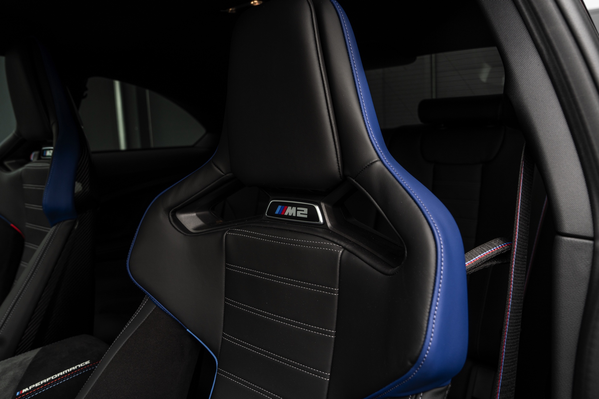 Neben der intensiven Farbe trägt der gezeigte BMW M2 nicht nur das ab Werk erhältliche Carbon-Dach, sondern auch einen großen Carbon-Heckflügel und eine markante Spoiler-Lippe. Weitere dunkle Akzente setzen die schwarzen Blenden an den vorderen Lufteinlässen und in der Heckschürze sowie die tief getönten Scheiben der Sonnenschutzverglasung. Ein weiterer Hingucker am Heck ist die M Performance Abgasanlage mit ihren vier trapezförmig angeordneten Endrohren, die auch Jahre nach ihrem Debüt immer wieder für Gesprächsstoff sorgt. "