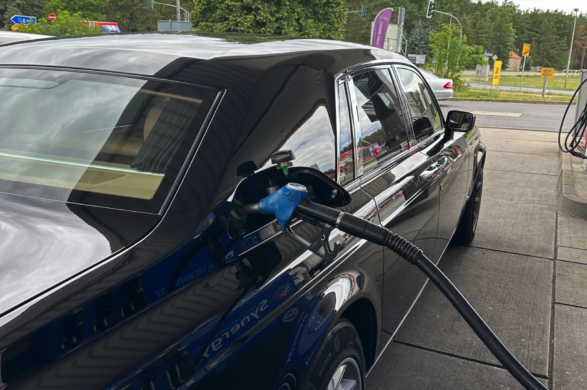 Die Fahrt mit Startpunkt im Münchner Norden ist wenig anheimelnd. Es regnet Bindfäden und so nimmt der 460 PS starke, 6,75 Liter große V12 die ersten Kilometer in der City und dann nördlich auf der A9 mit eifrig arbeitenden Scheibenwischern auf. Das Platzangebot ist gigantisch, die belederten Komfortsessel (aus 18 makellosen Tierhäuten entstanden) zeigen einem bereits lange vor Nürnberg, dass man diese Tour auch an einem Stück fahren könnte, während der Zwölfzylinder so dezent im Hintergrund schnurrt, dass man meint, im einem Elektroauto zu sitzen. Eine Dreiviertelstunde vor Berlin der erste, etwas vorauseilende Tankstopp. Der Verbrauch ist von 22,5 auf knapp über 17 Liter pro 100 Kilometer geschrumpft – trotz flotten Galopps. Da kann man angesichts von Fahrzeugdimensionen, bewegter 2,6 Tonnen Masse und Rahmenbedingungen kaum meckern.