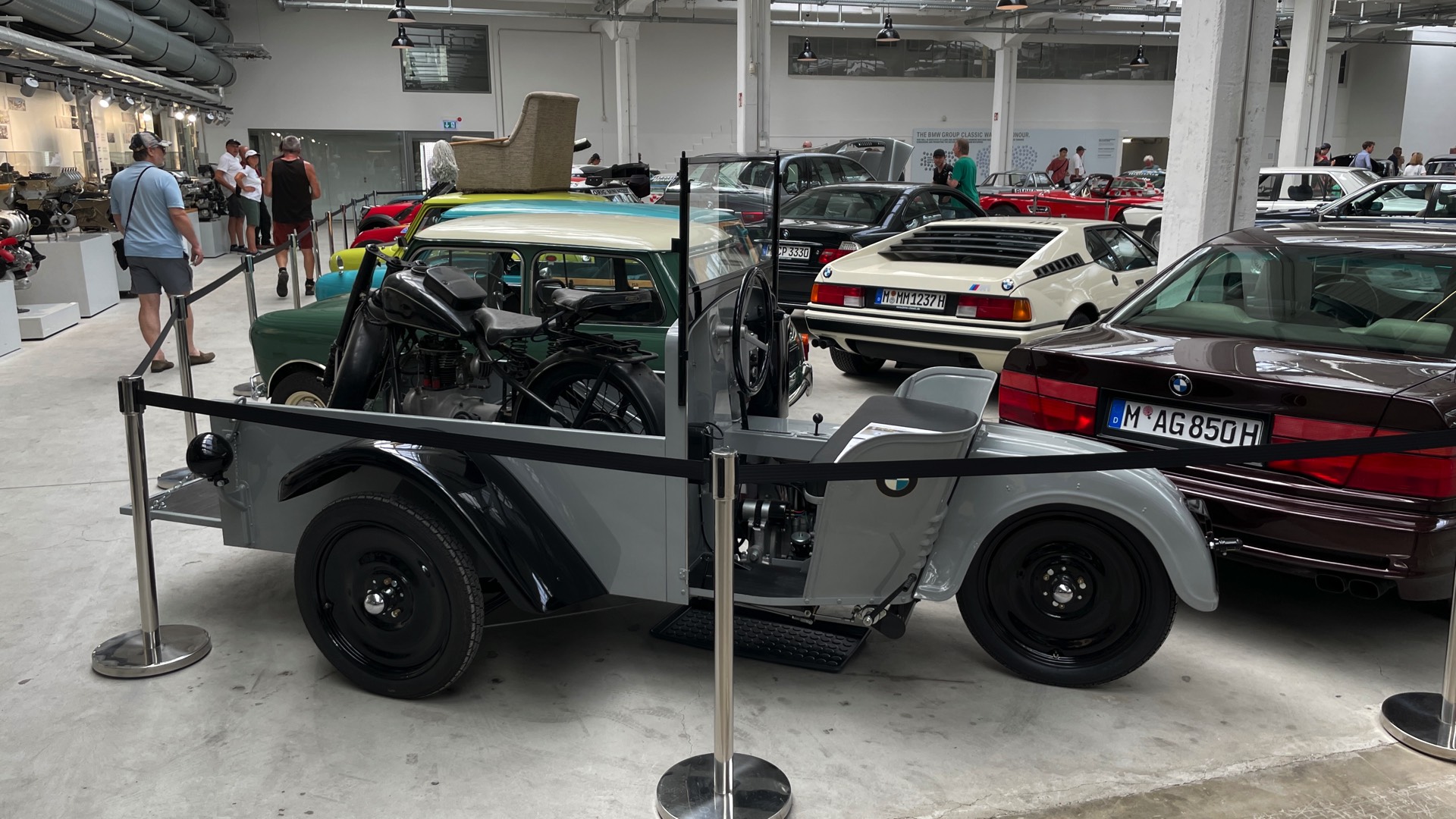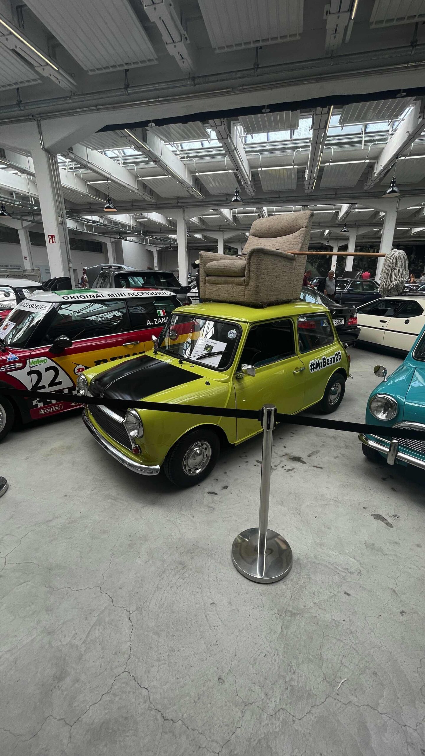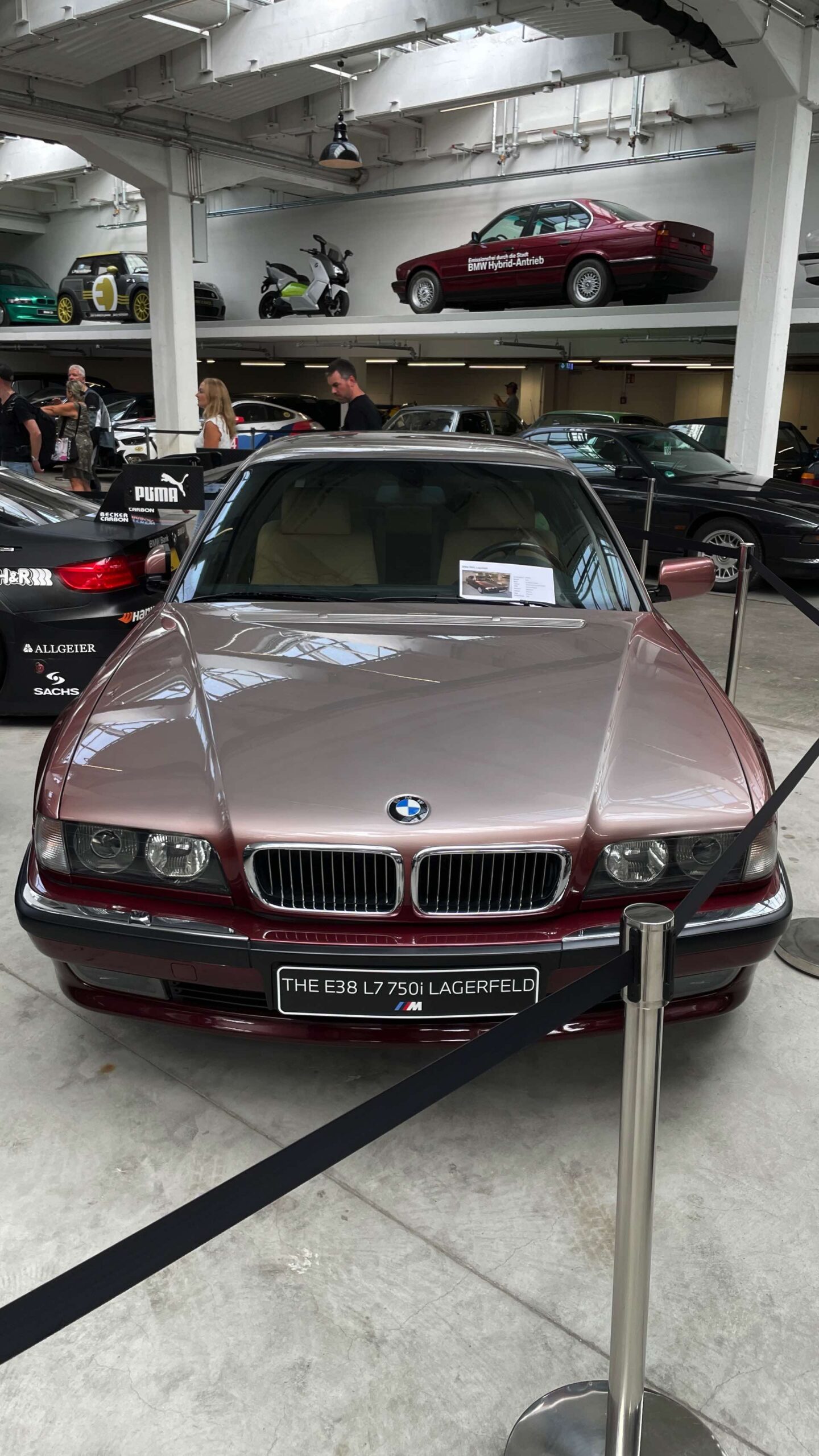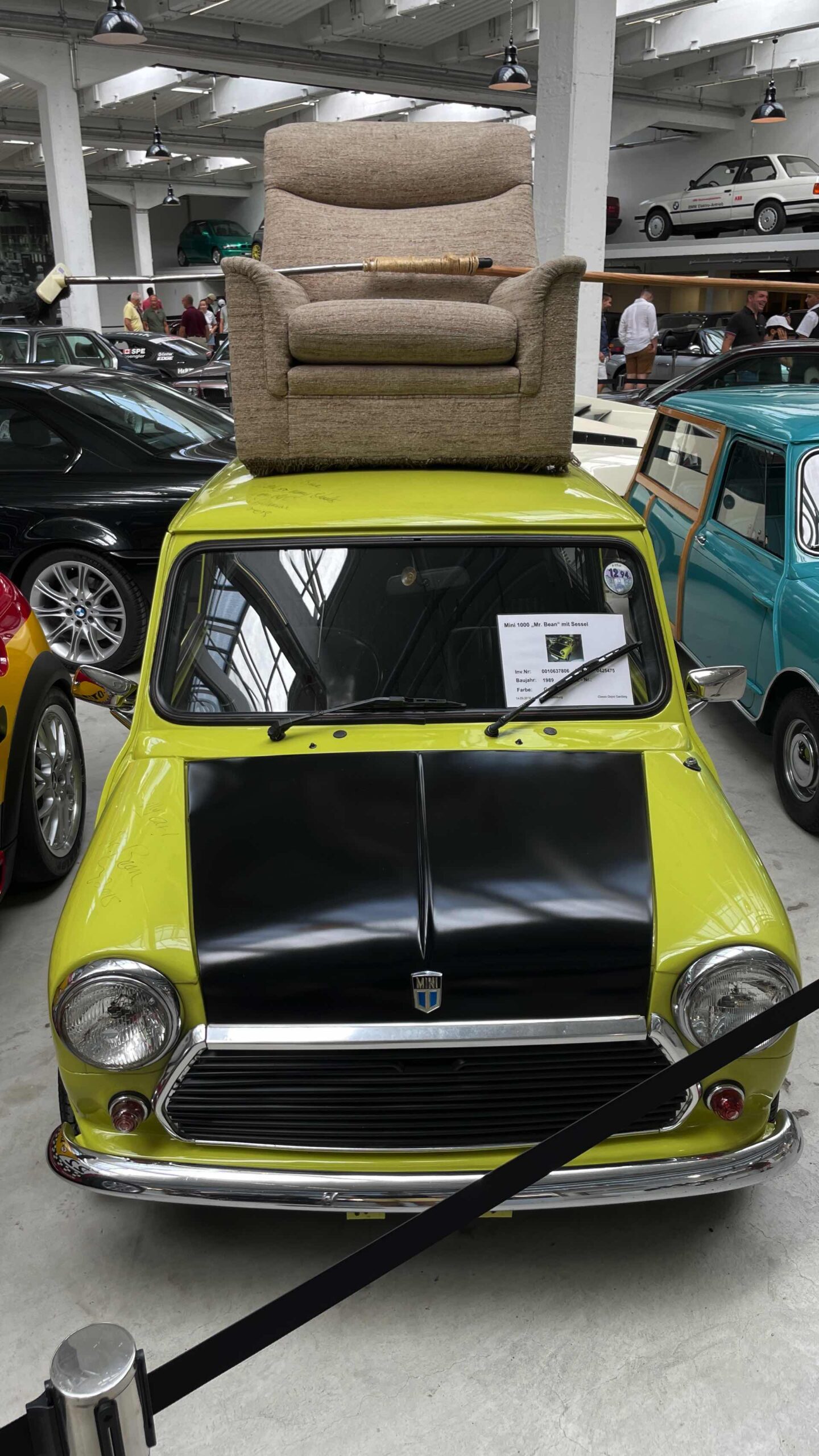 Auch Fahrzeuge aus Film- und Fernsehen gehören zu dieser Sammlung, darunter der BMW 501 „Barockengel“ aus der Fernsehserie „Funkstreife Isar 12“ oder der grüne Mini Cooper von Mr. Bean mit Sessel auf dem Dach. Ein absolutes Highlight ist natürlich auch der BMW 750iL von Karl Lagerfeld, der seiner Zeit als extralange Variante des 7er E38 mit Two-Tone-Lackierung voraus war.