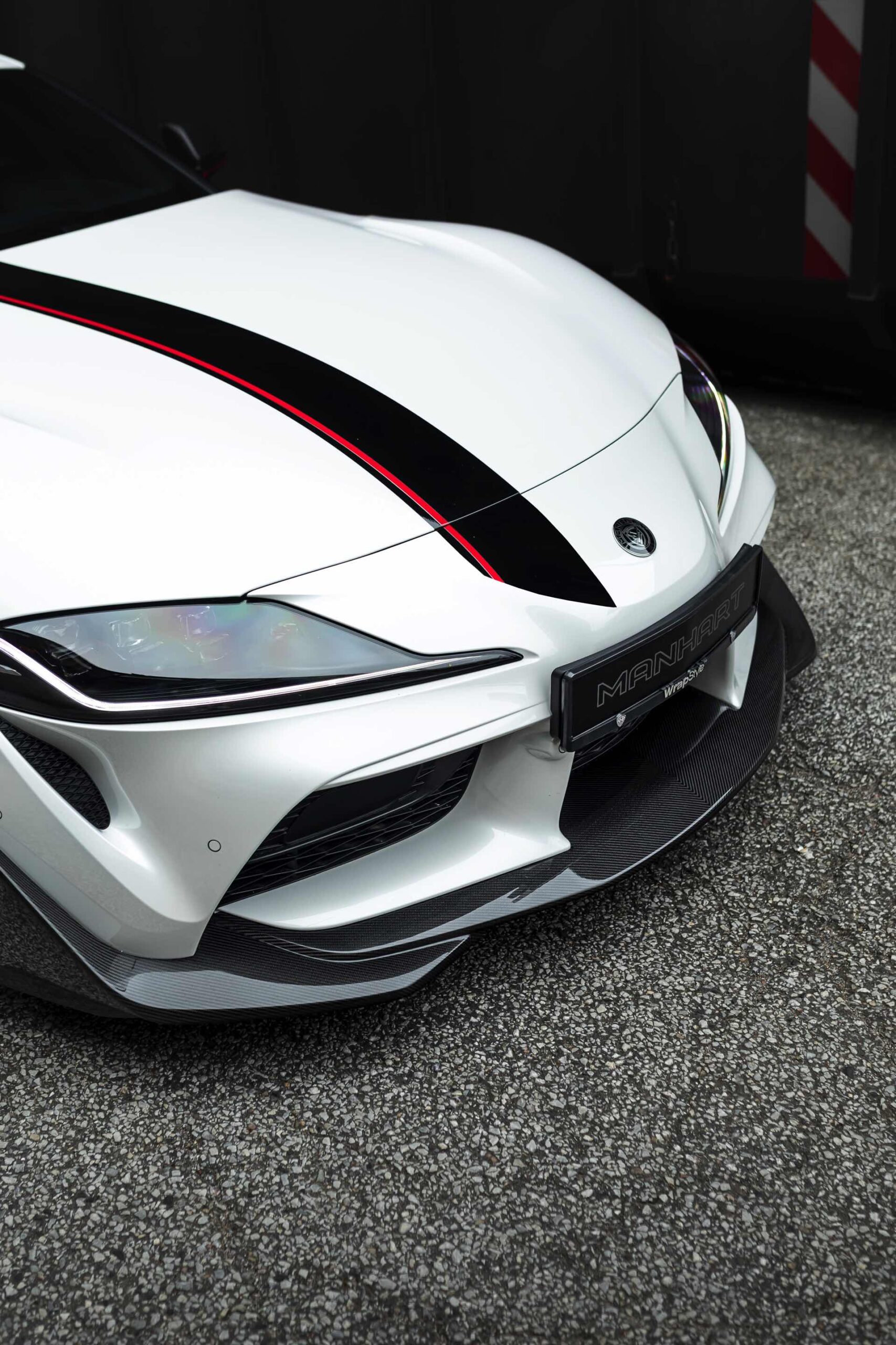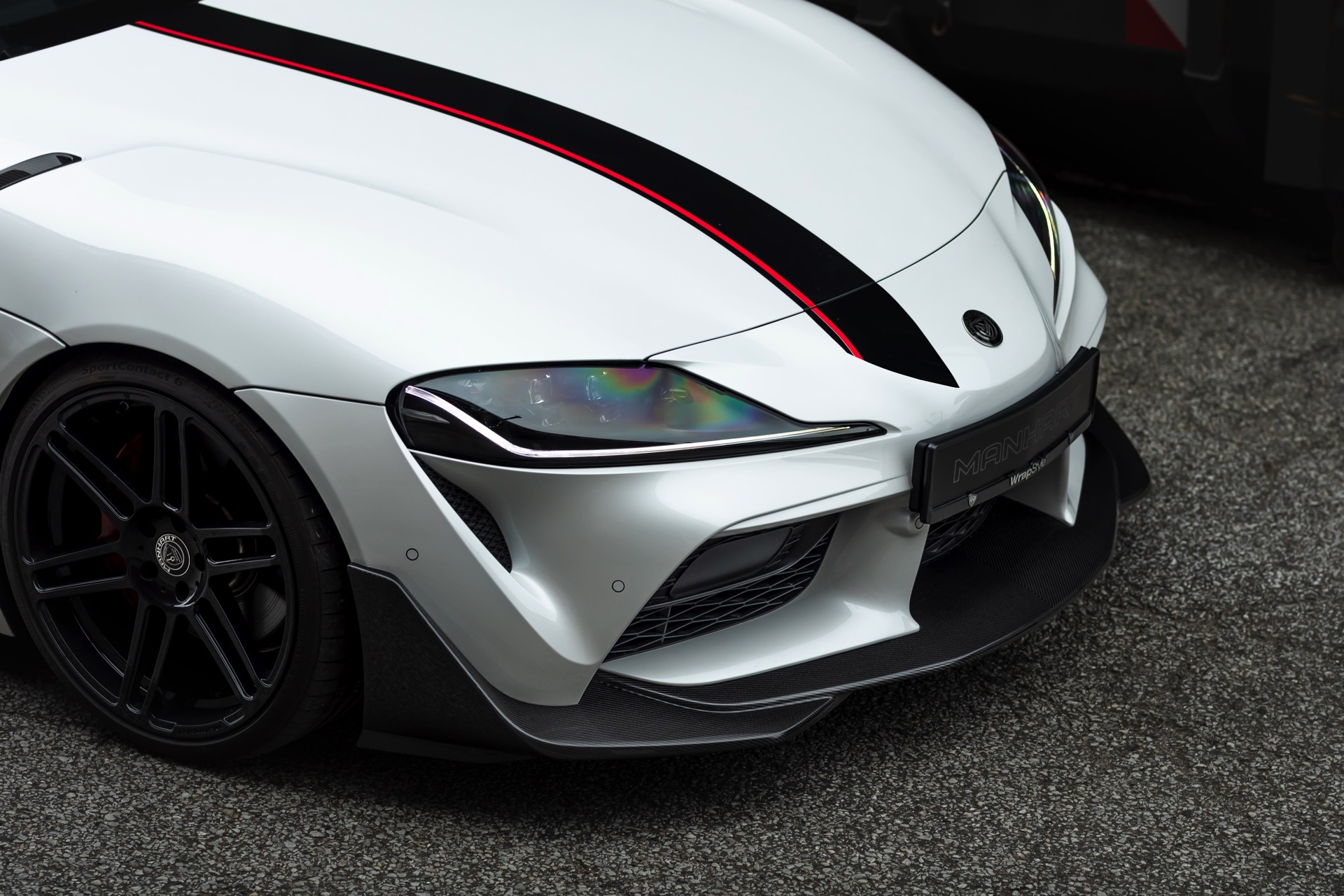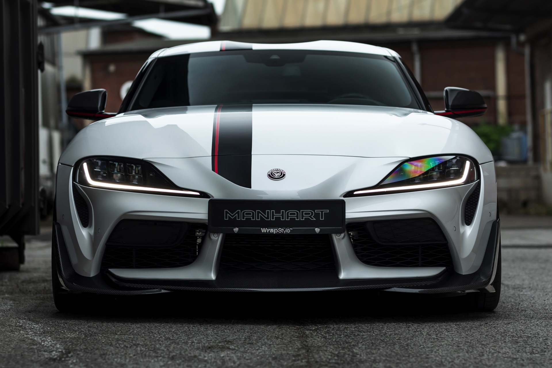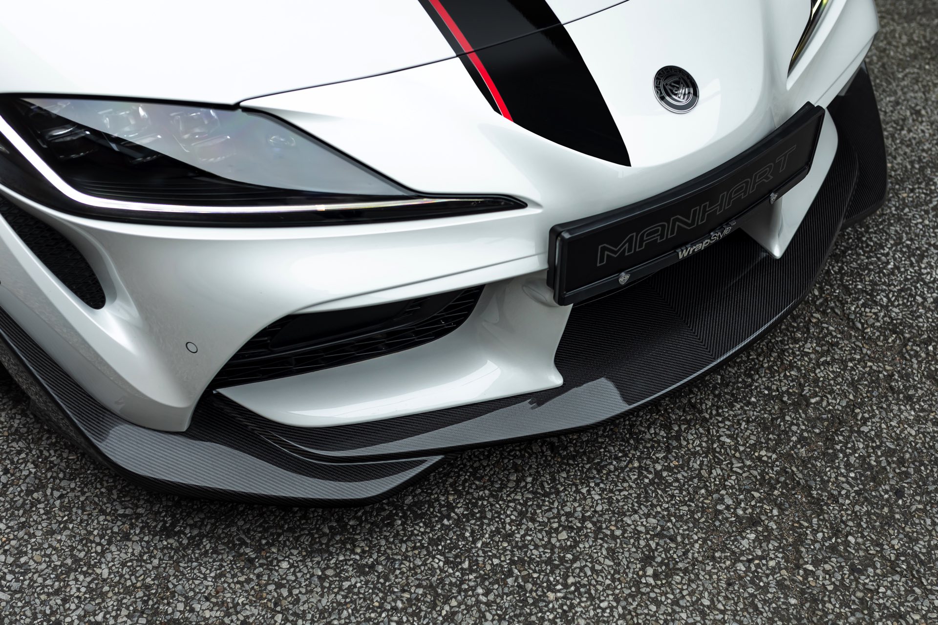 Die ohnehin außergewöhnliche Optik des Supra kann dem Coupé mit einem Manhart Carbon-Bodykit unter die Arme greifen: Frontspoiler, Motorhauben-Einsätze, Seitenschweller, Spiegelkappen und Diffusor stehen dabei klar im Schatten des Heckflügels, der schon von weitem für eine klare Abgrenzung von der Serie sorgt.